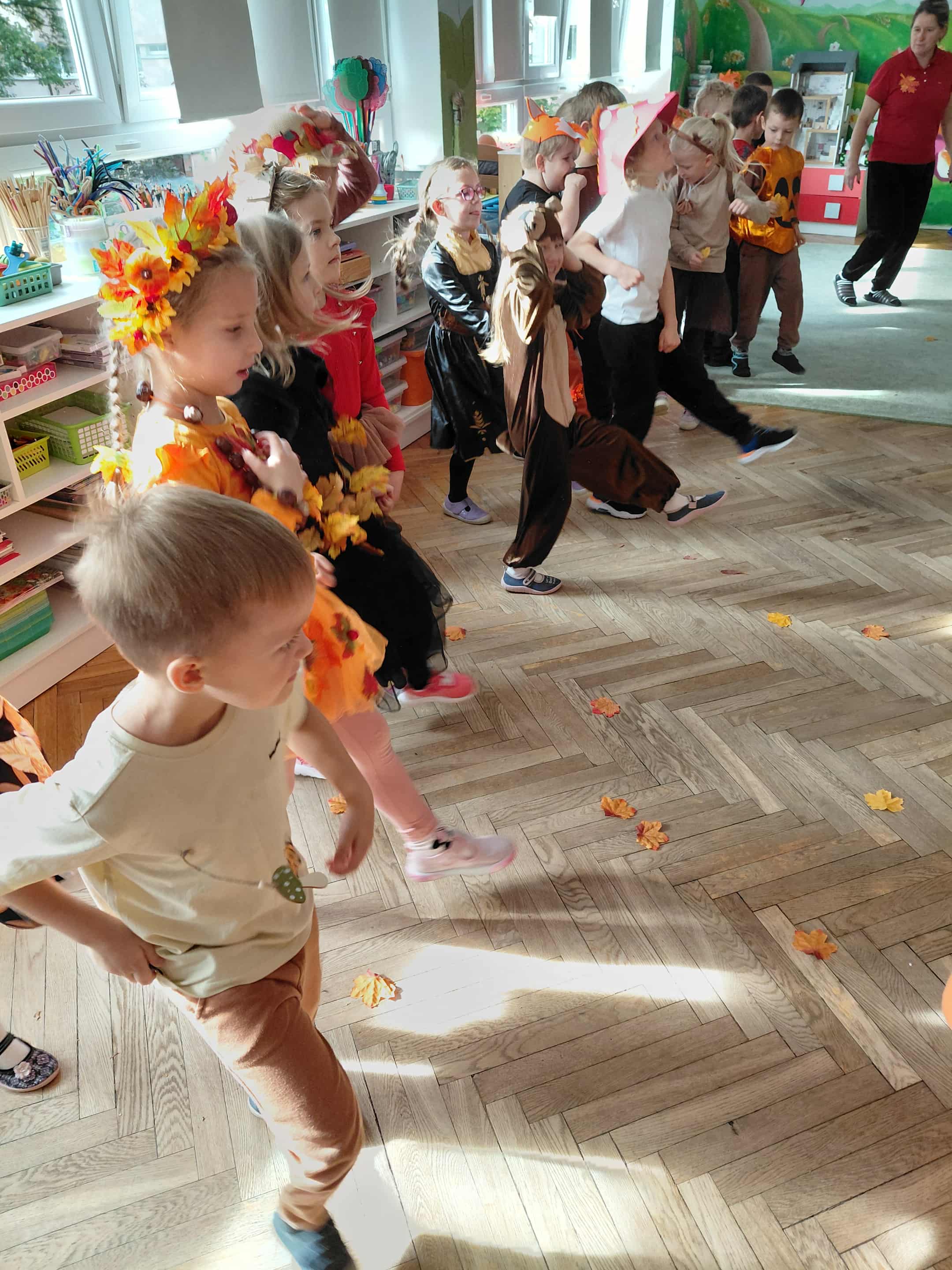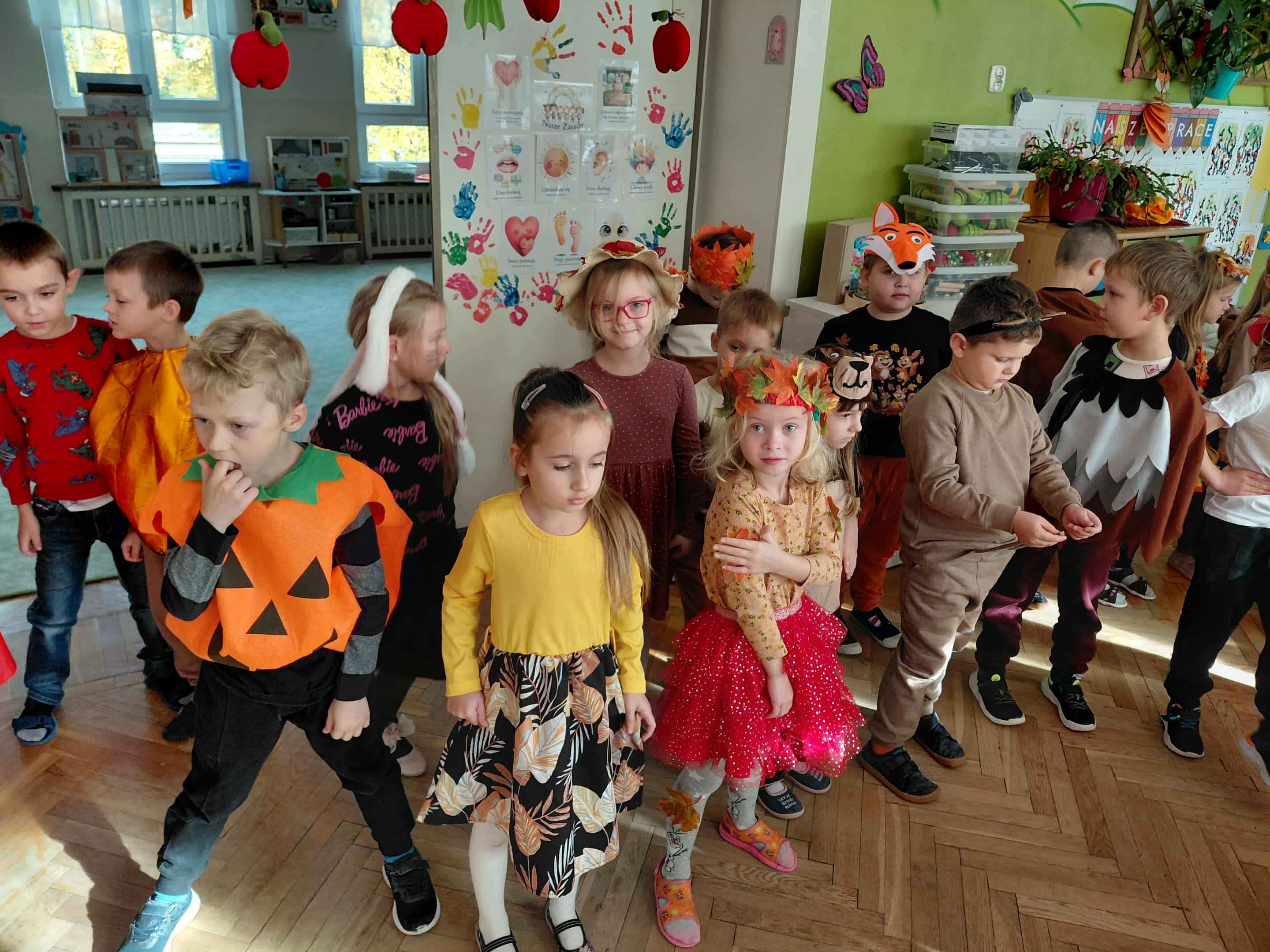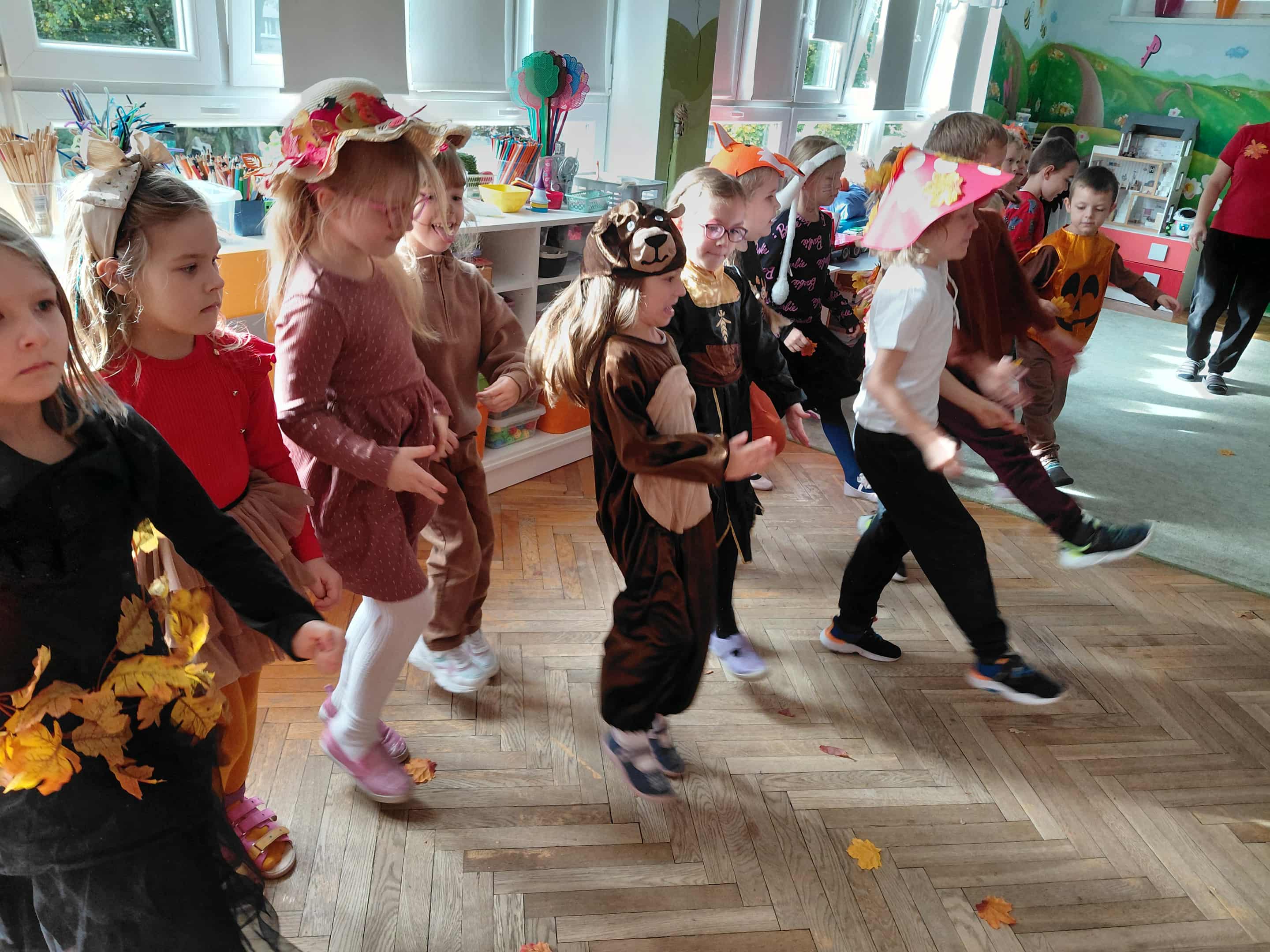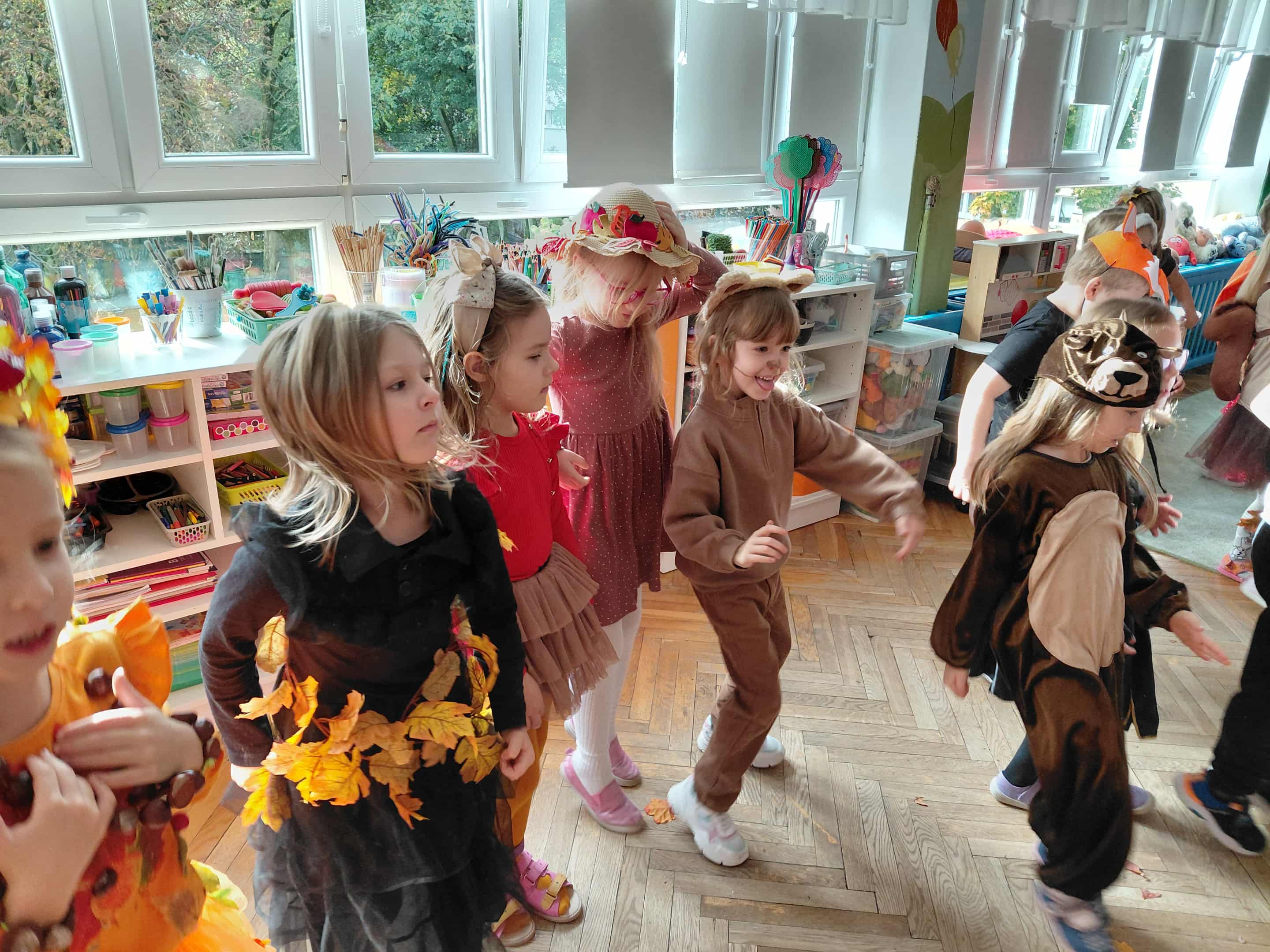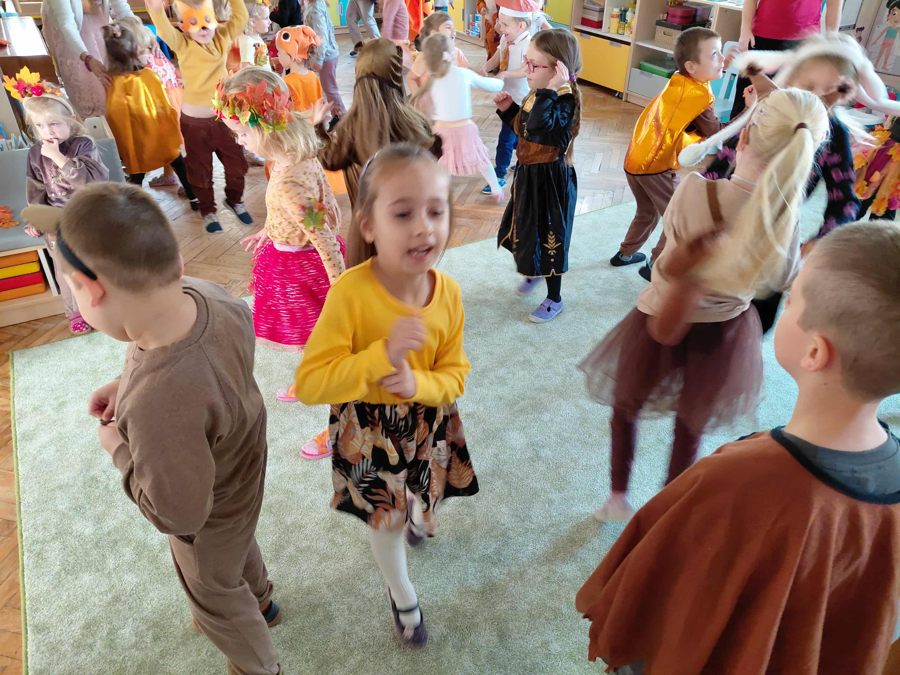 W naszym przedszkolu odbył się bal jesieni. Dzieci ze wszystkich grup brały udział w bardzo ciekawych jesiennych konkursach i zabawach, były również swobodne tańce i zabawy z chusta animacyjną. Dzieci przyszły na bal w przepięknych jesiennych strojach. Mamy bardzo roztańczone przedszkole.