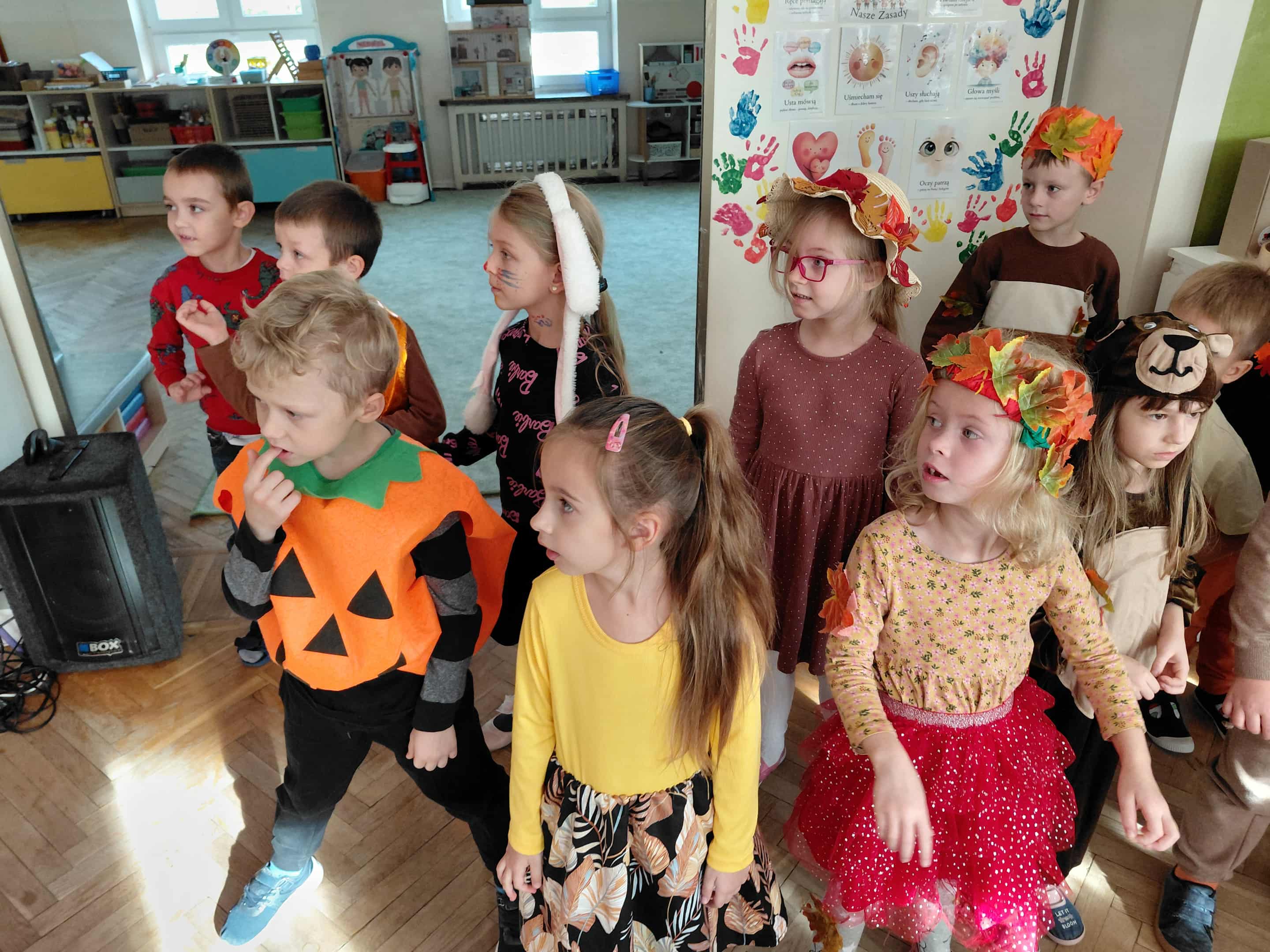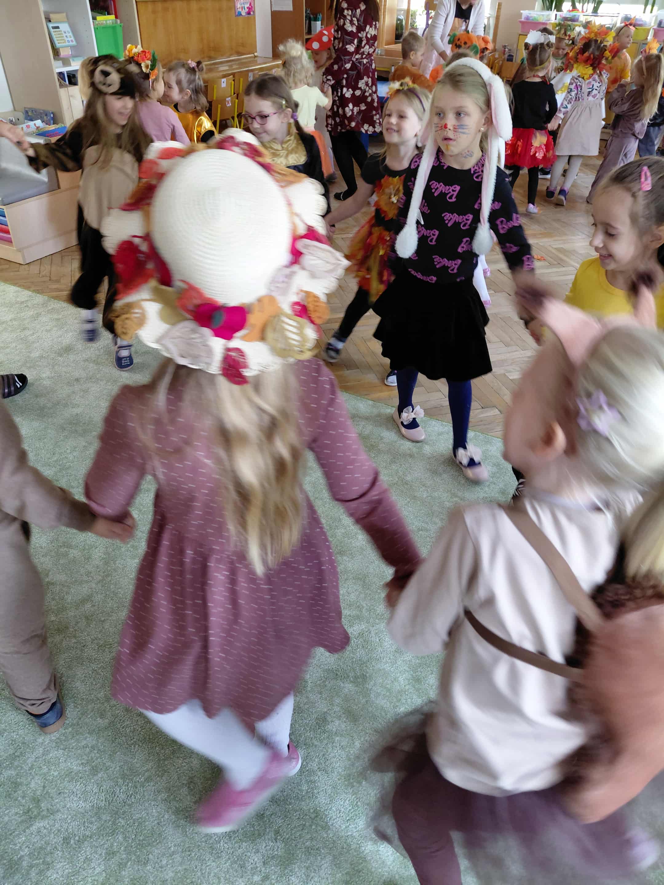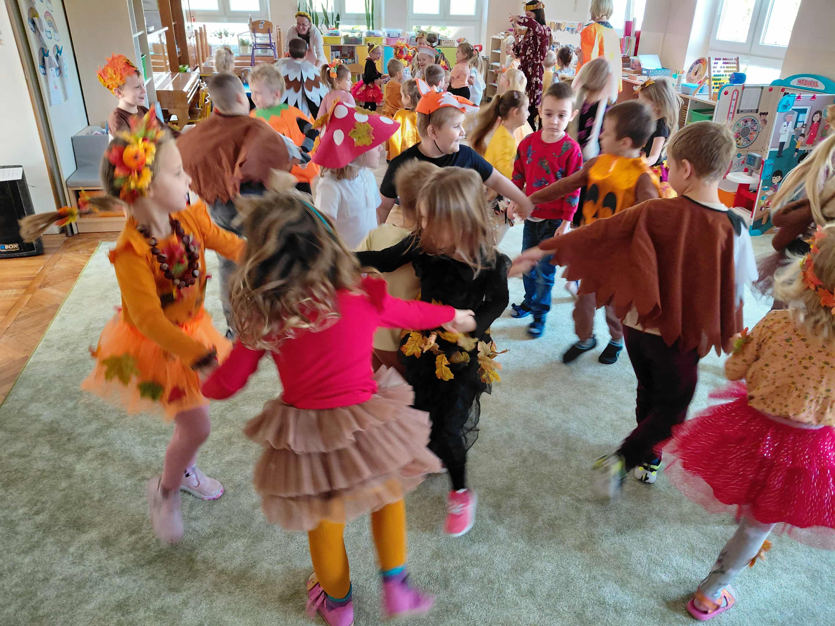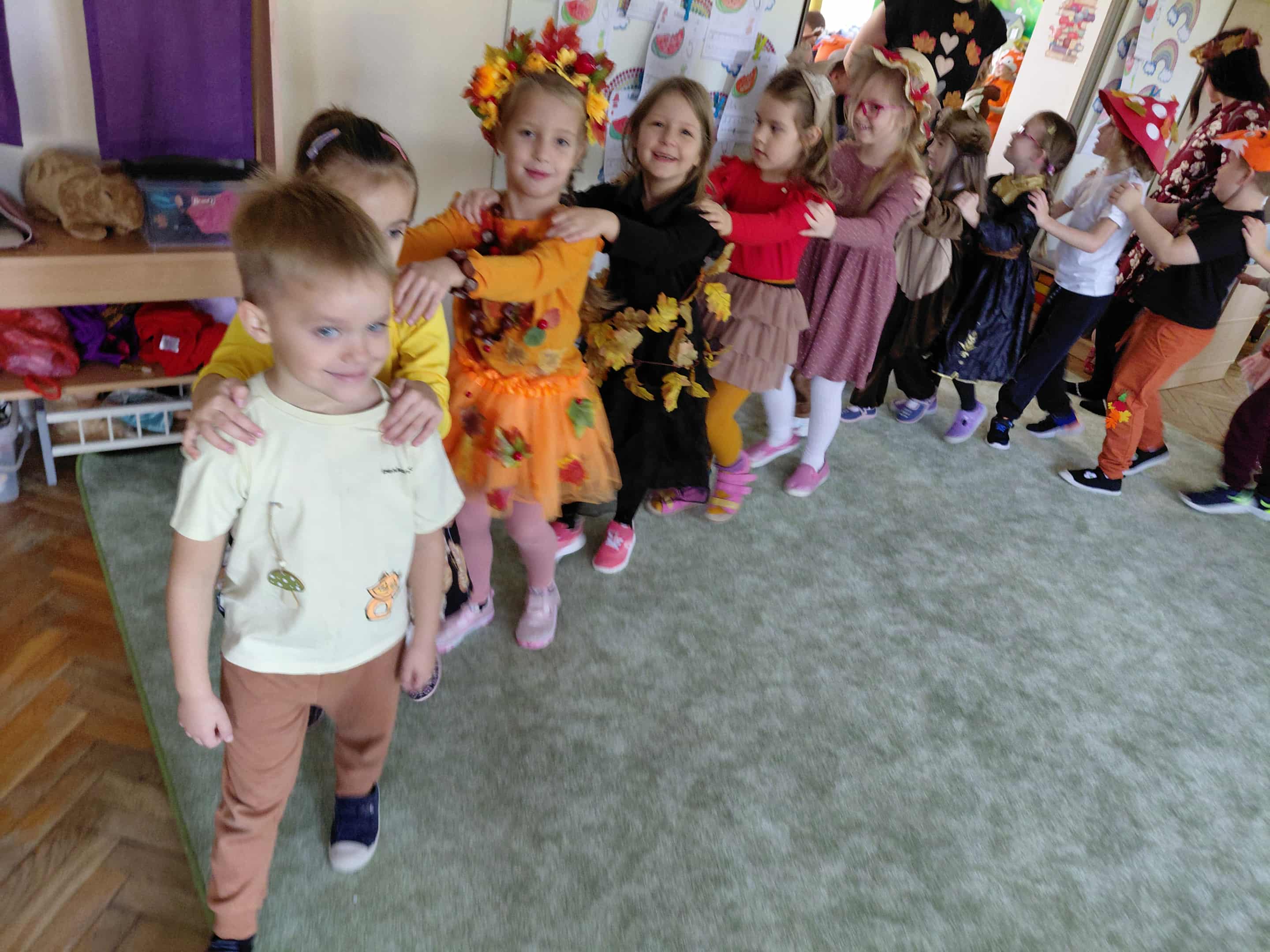 W naszym przedszkolu odbył się bal jesieni. Dzieci ze wszystkich grup brały udział w bardzo ciekawych jesiennych konkursach i zabawach, były również swobodne tańce i zabawy z chusta animacyjną. Dzieci przyszły na bal w przepięknych jesiennych strojach. Mamy bardzo roztańczone przedszkole.