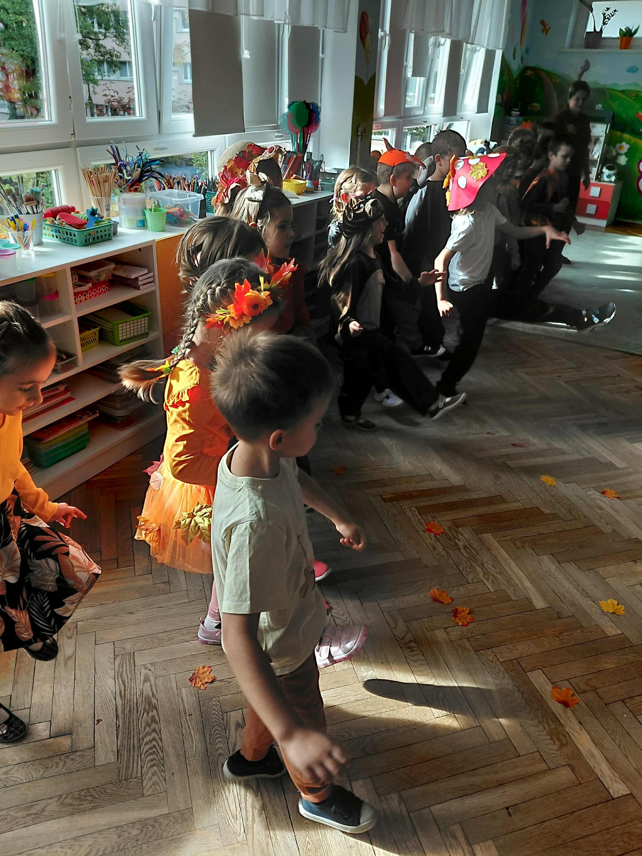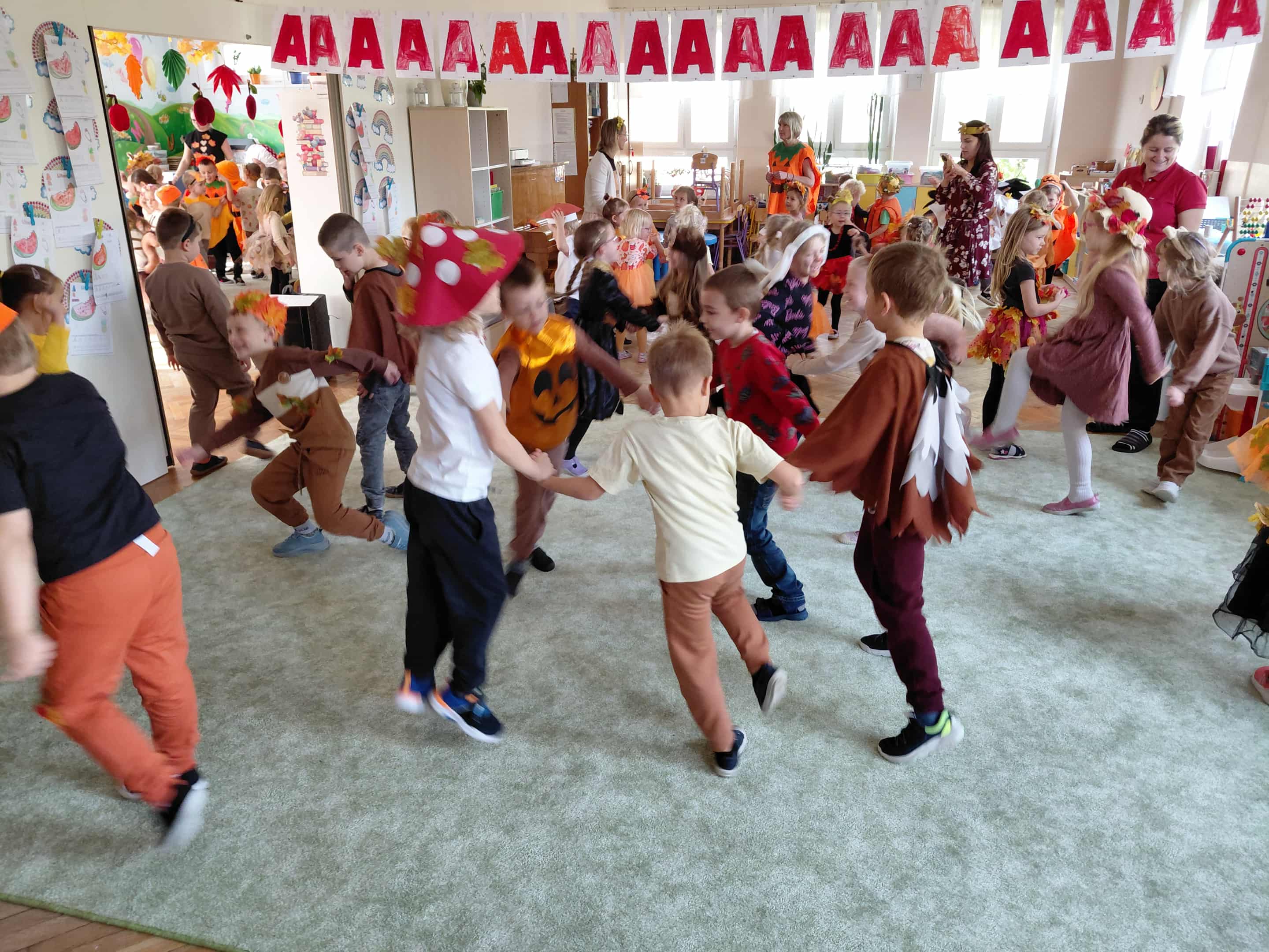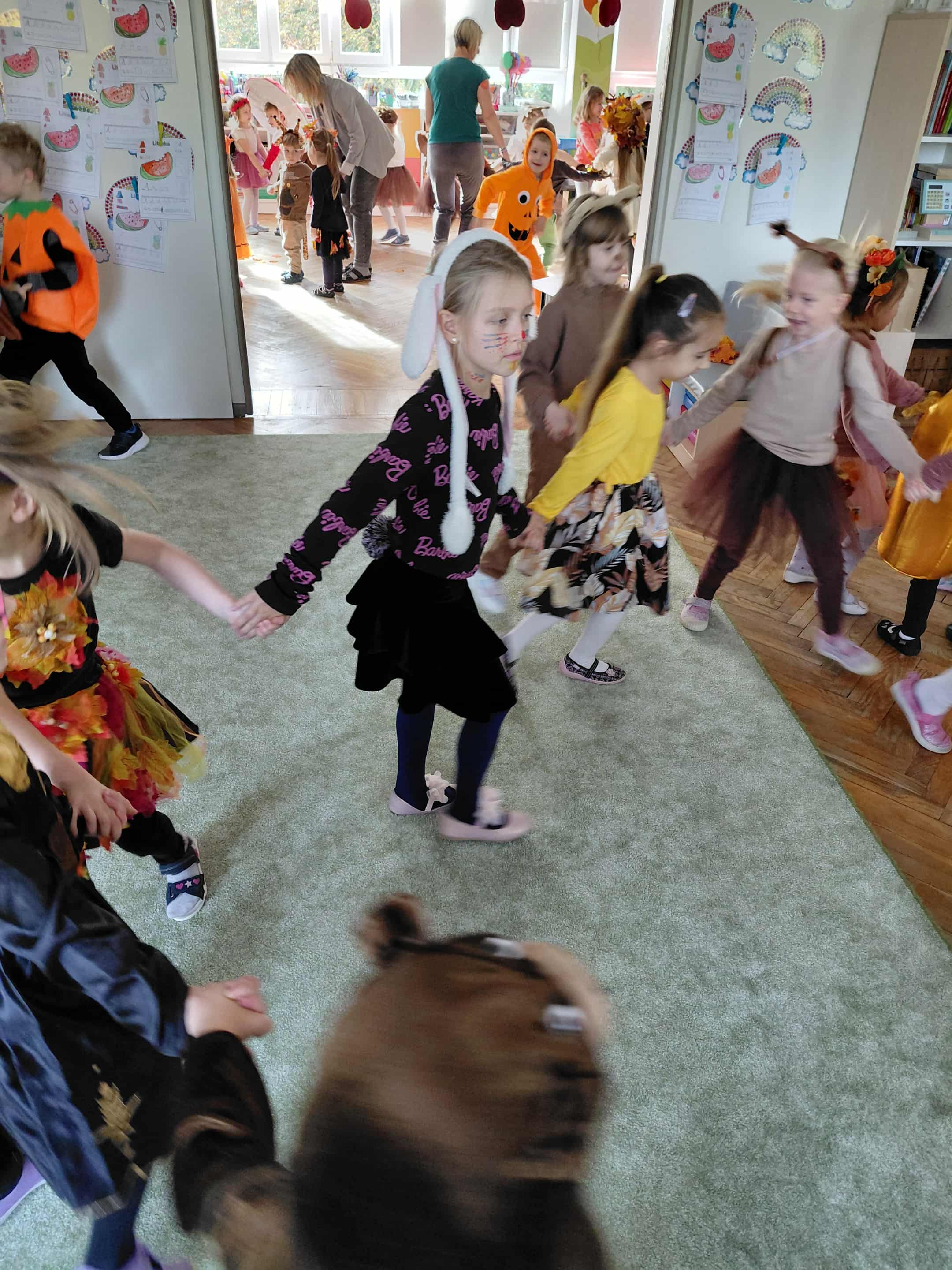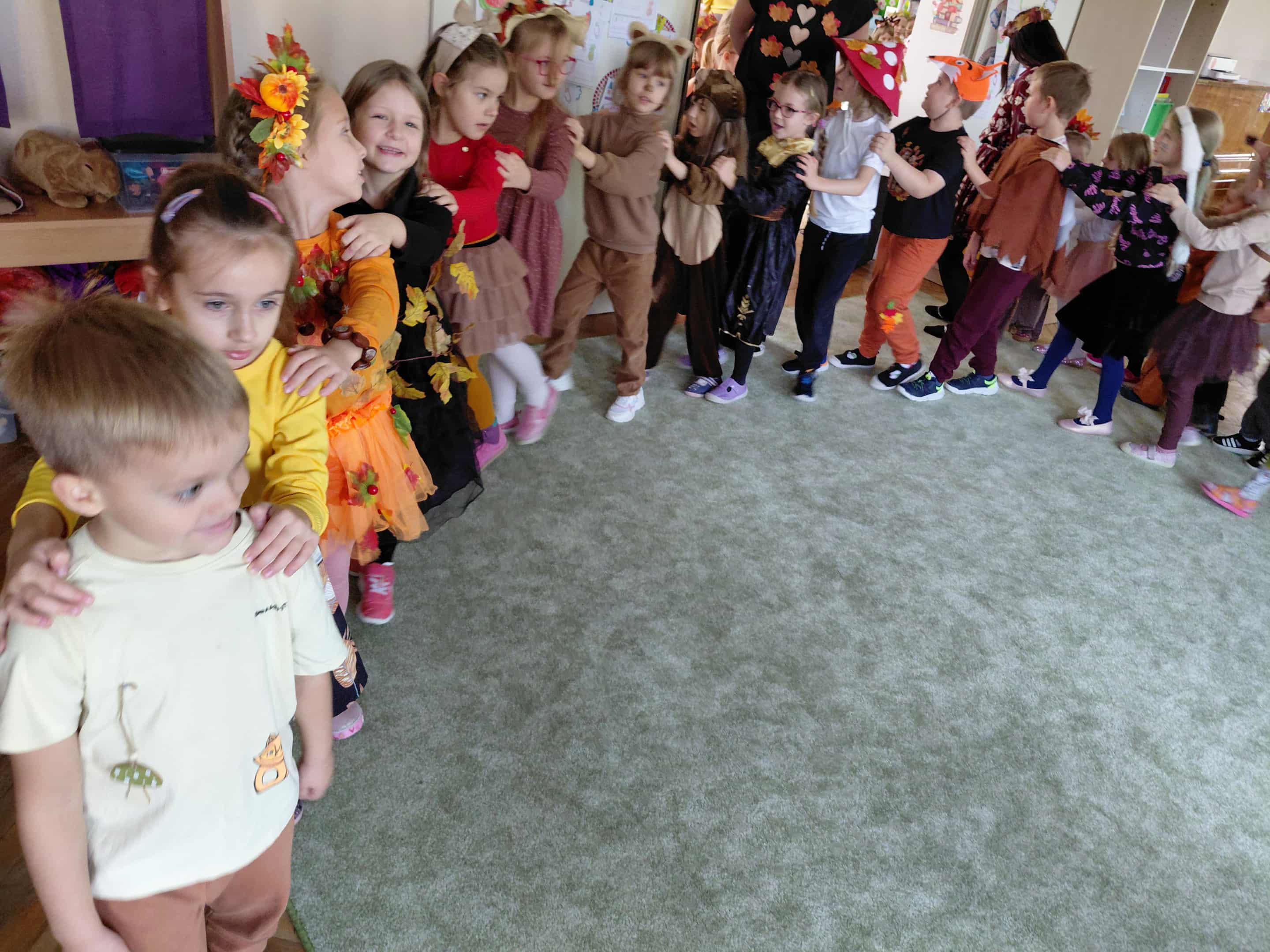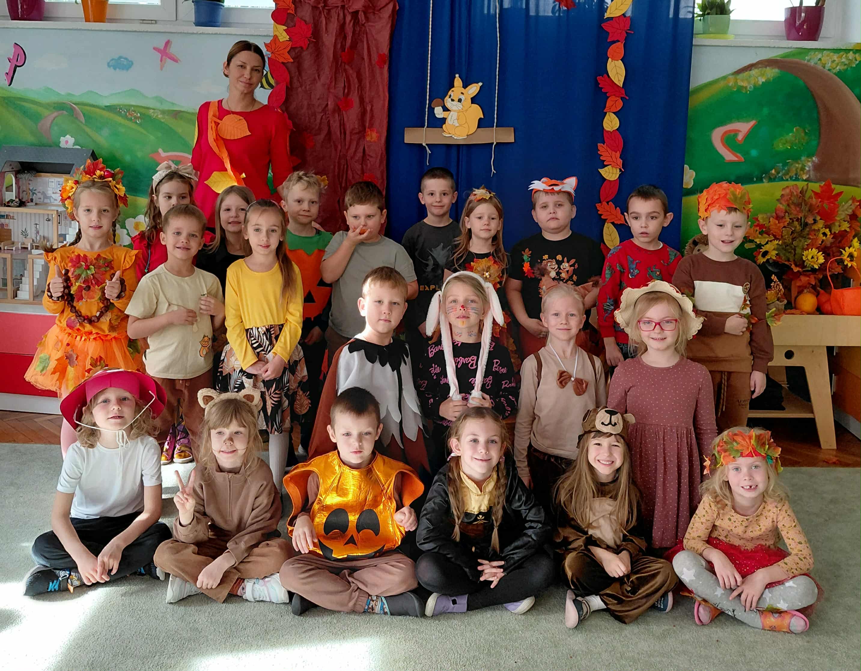 W naszym przedszkolu odbył się bal jesieni. Dzieci ze wszystkich grup brały udział w bardzo ciekawych jesiennych konkursach i zabawach, były również swobodne tańce i zabawy z chusta animacyjną. Dzieci przyszły na bal w przepięknych jesiennych strojach. Mamy bardzo roztańczone przedszkole.