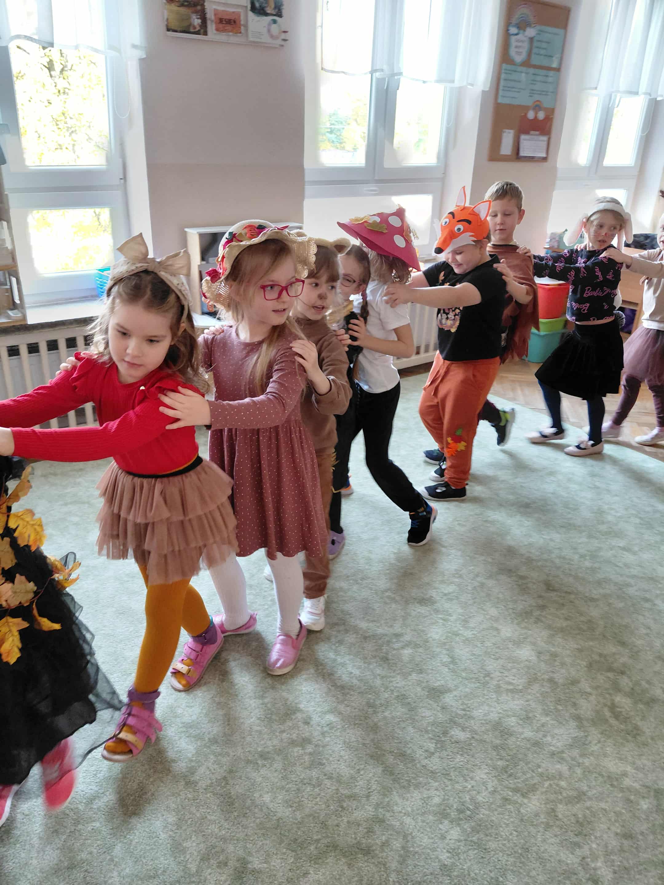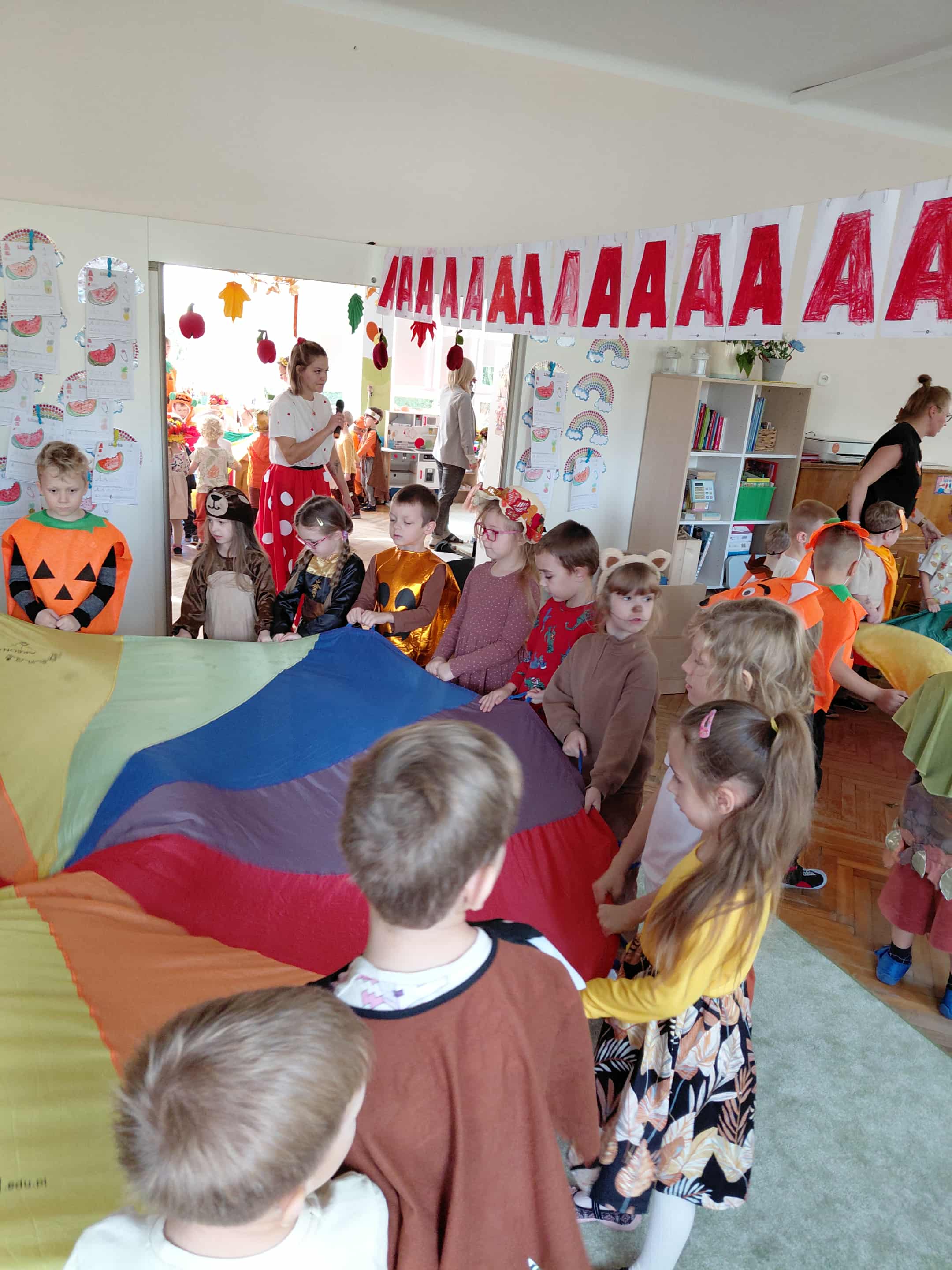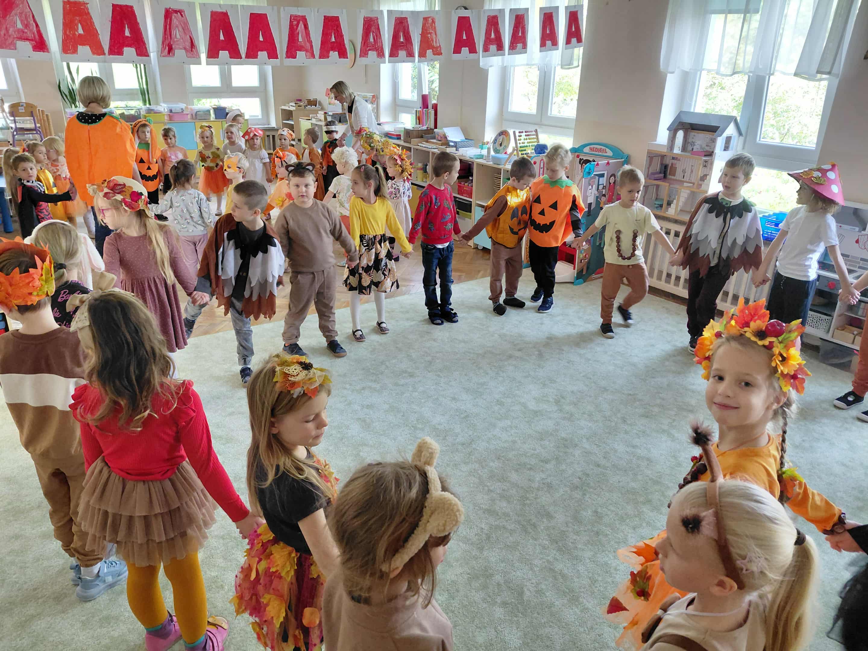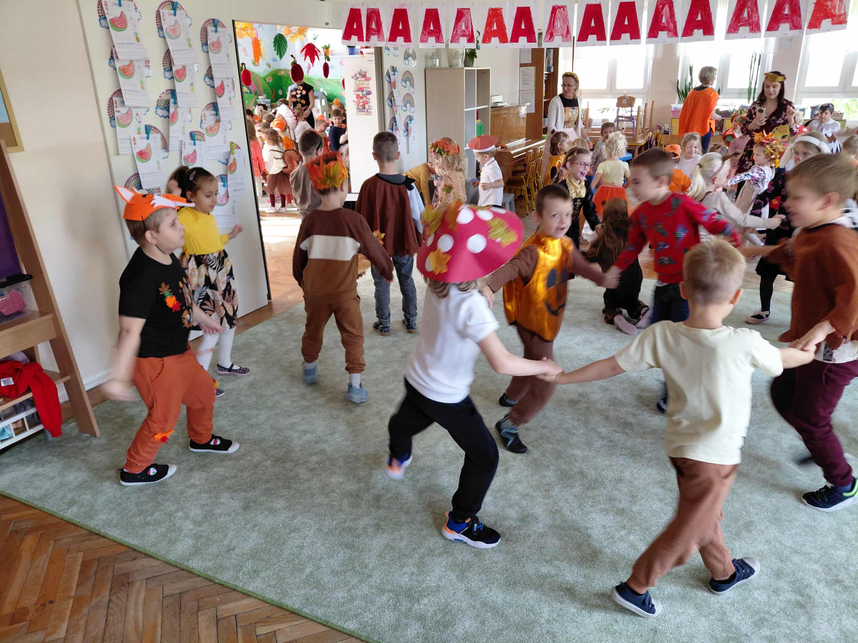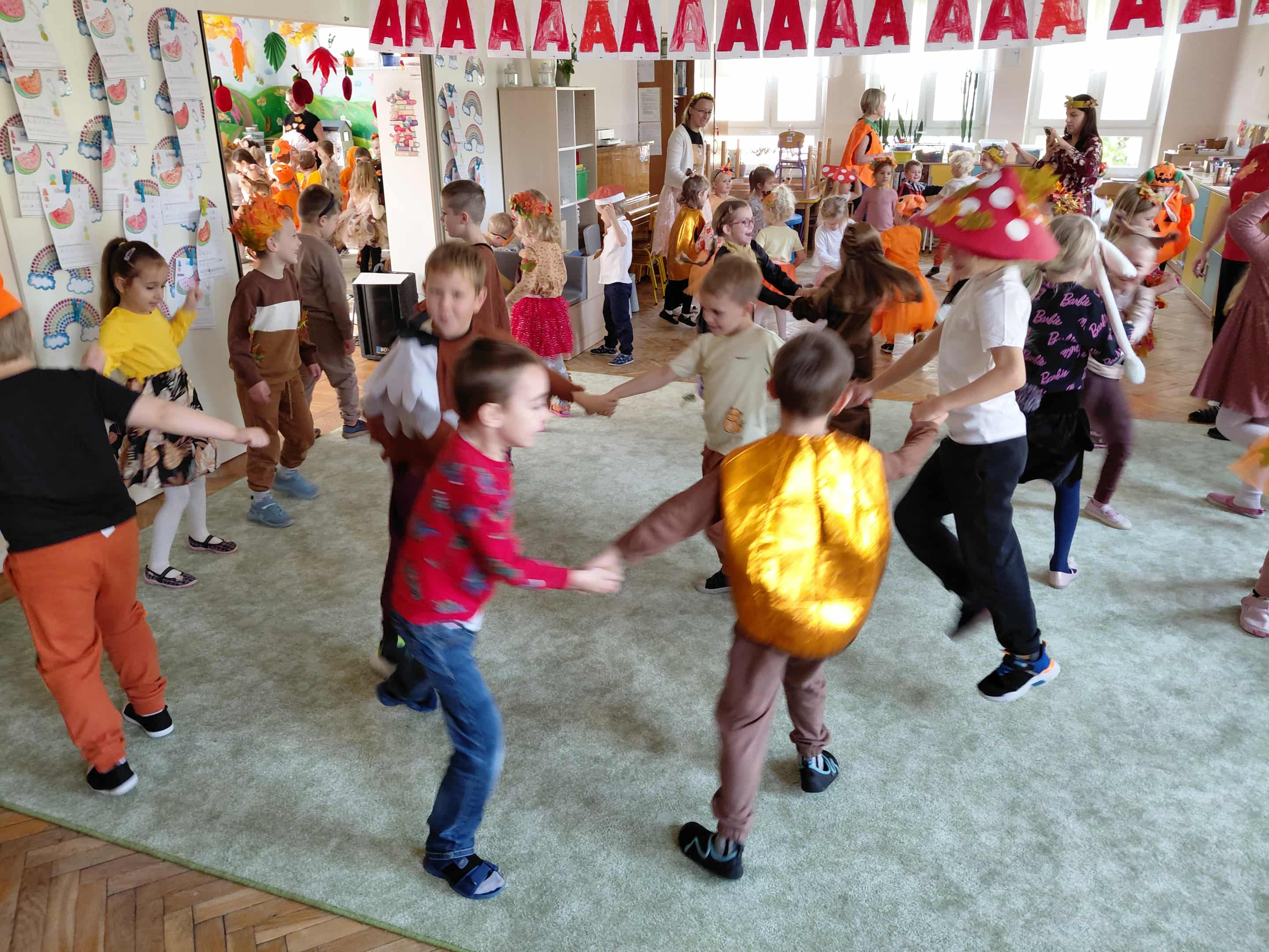 W naszym przedszkolu odbył się bal jesieni. Dzieci ze wszystkich grup brały udział w bardzo ciekawych jesiennych konkursach i zabawach, były również swobodne tańce i zabawy z chusta animacyjną. Dzieci przyszły na bal w przepięknych jesiennych strojach. Mamy bardzo roztańczone przedszkole.