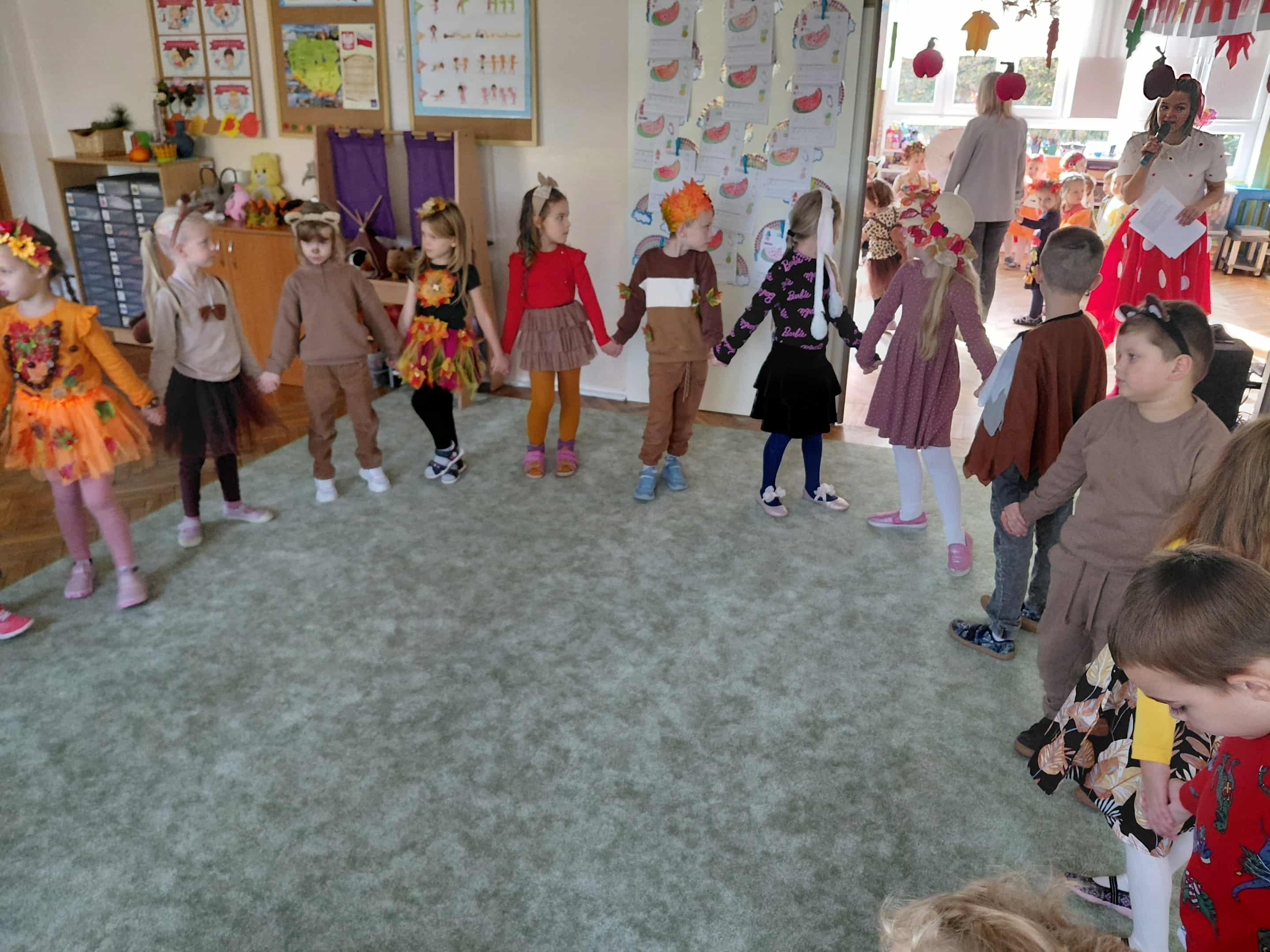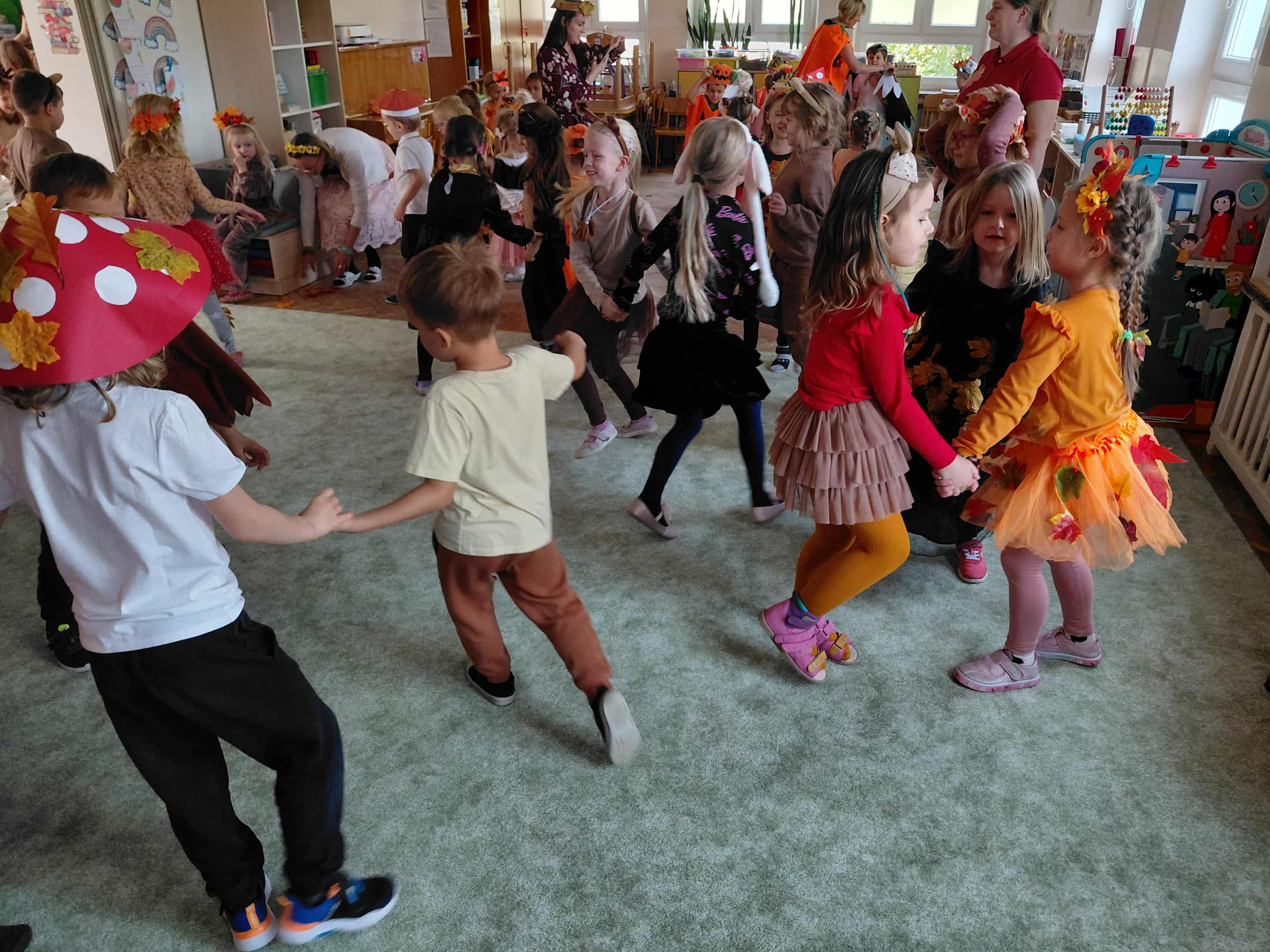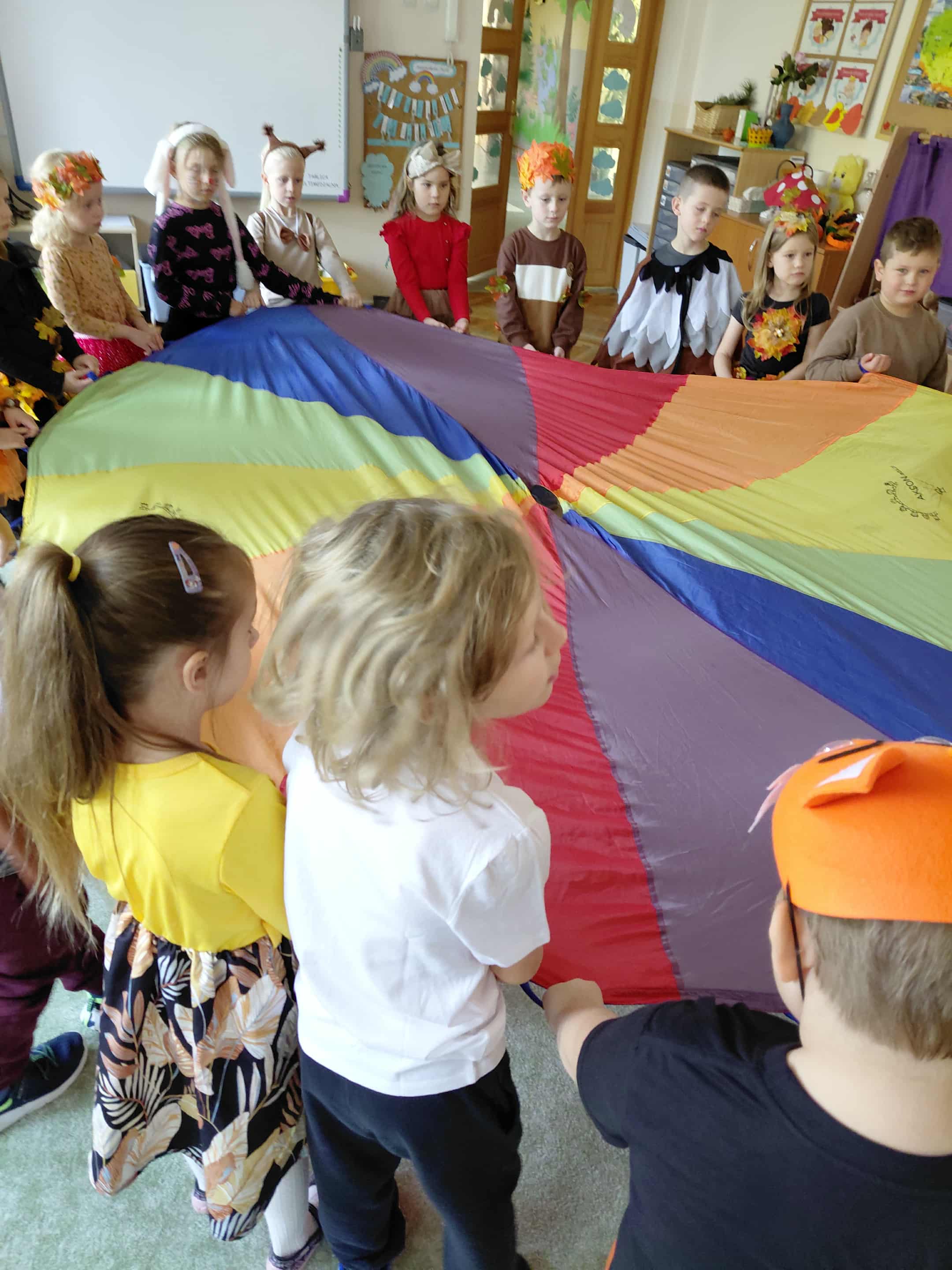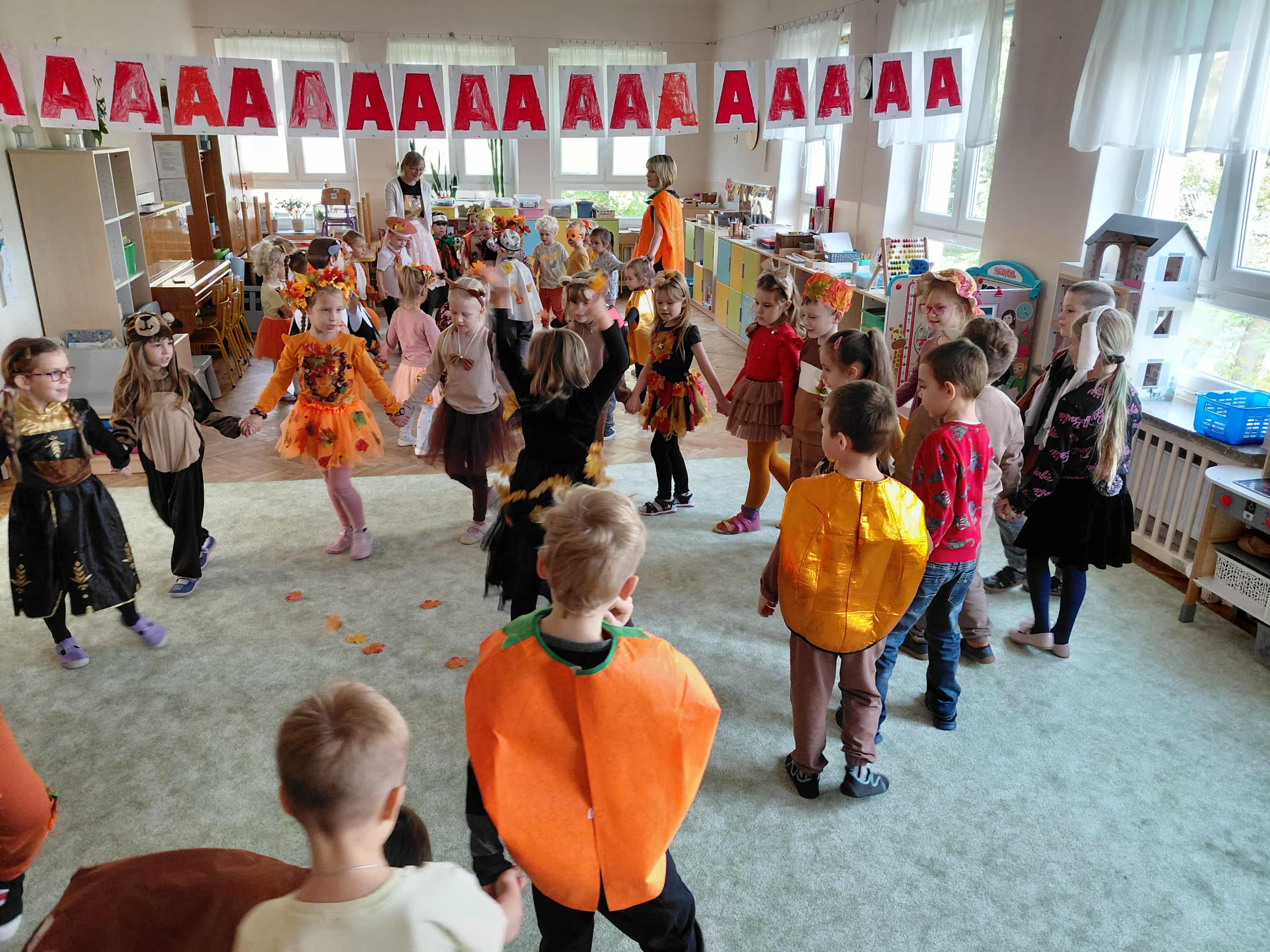 W naszym przedszkolu odbył się bal jesieni. Dzieci ze wszystkich grup brały udział w bardzo ciekawych jesiennych konkursach i zabawach, były również swobodne tańce i zabawy z chusta animacyjną. Dzieci przyszły na bal w przepięknych jesiennych strojach. Mamy bardzo roztańczone przedszkole.