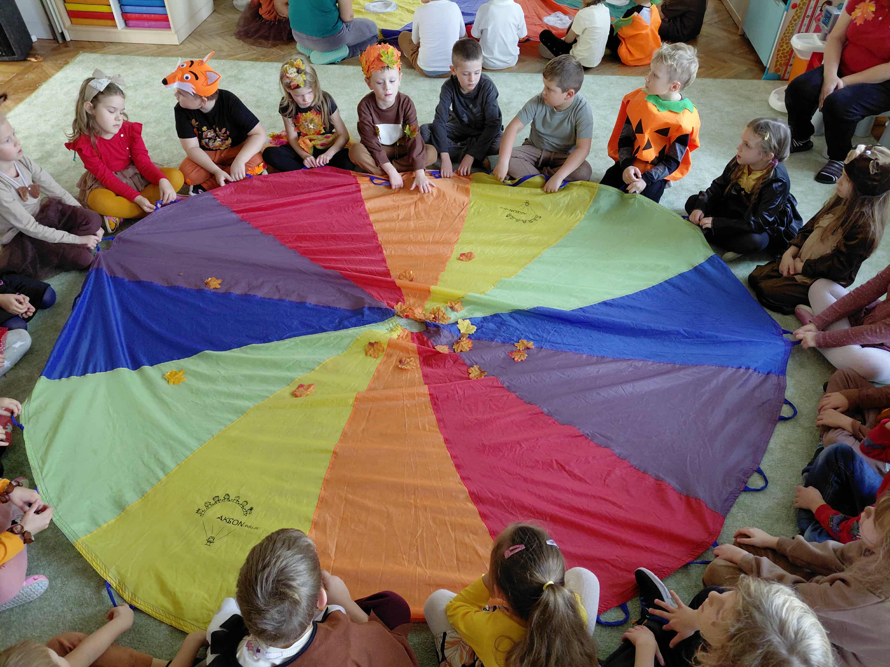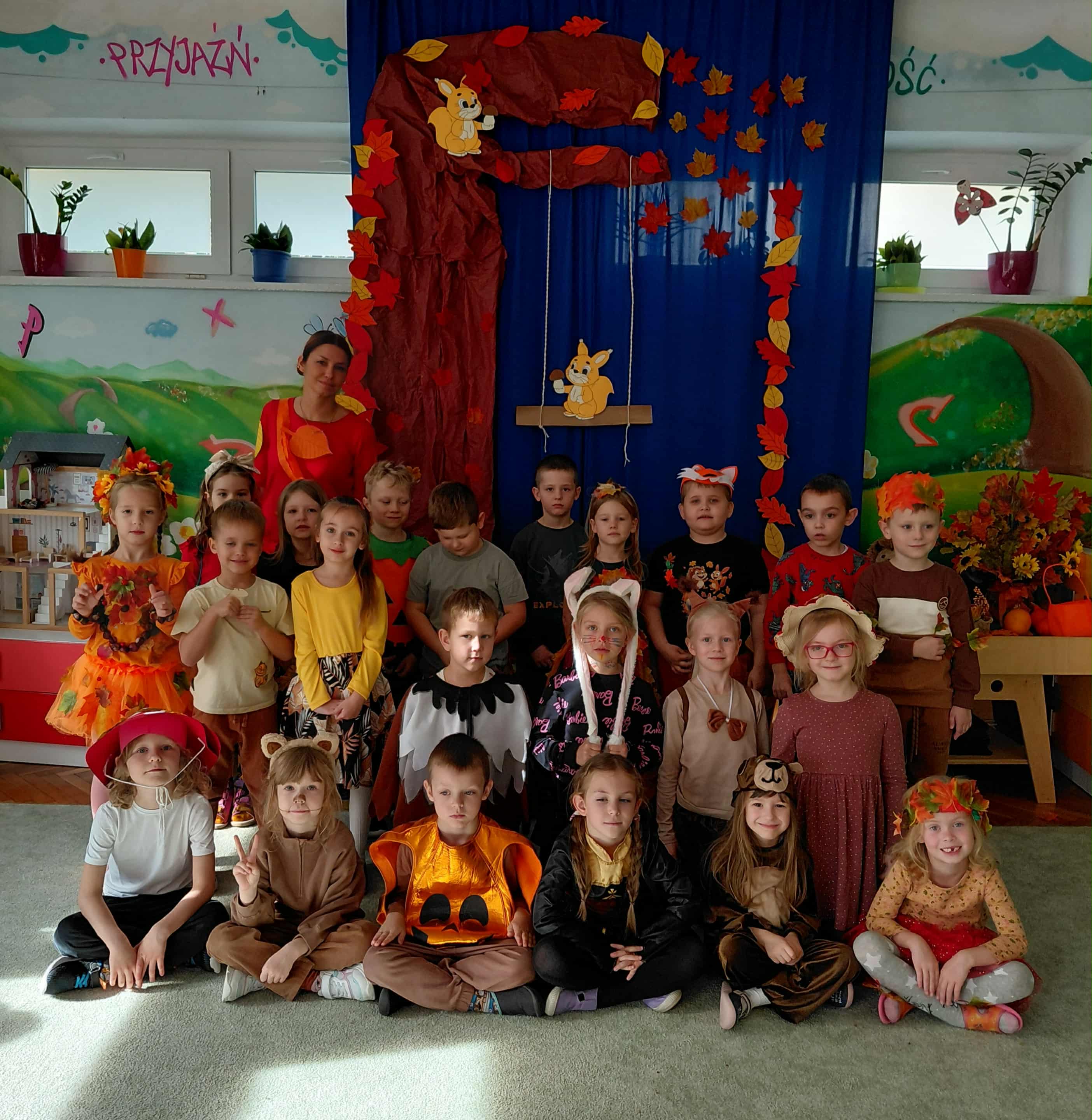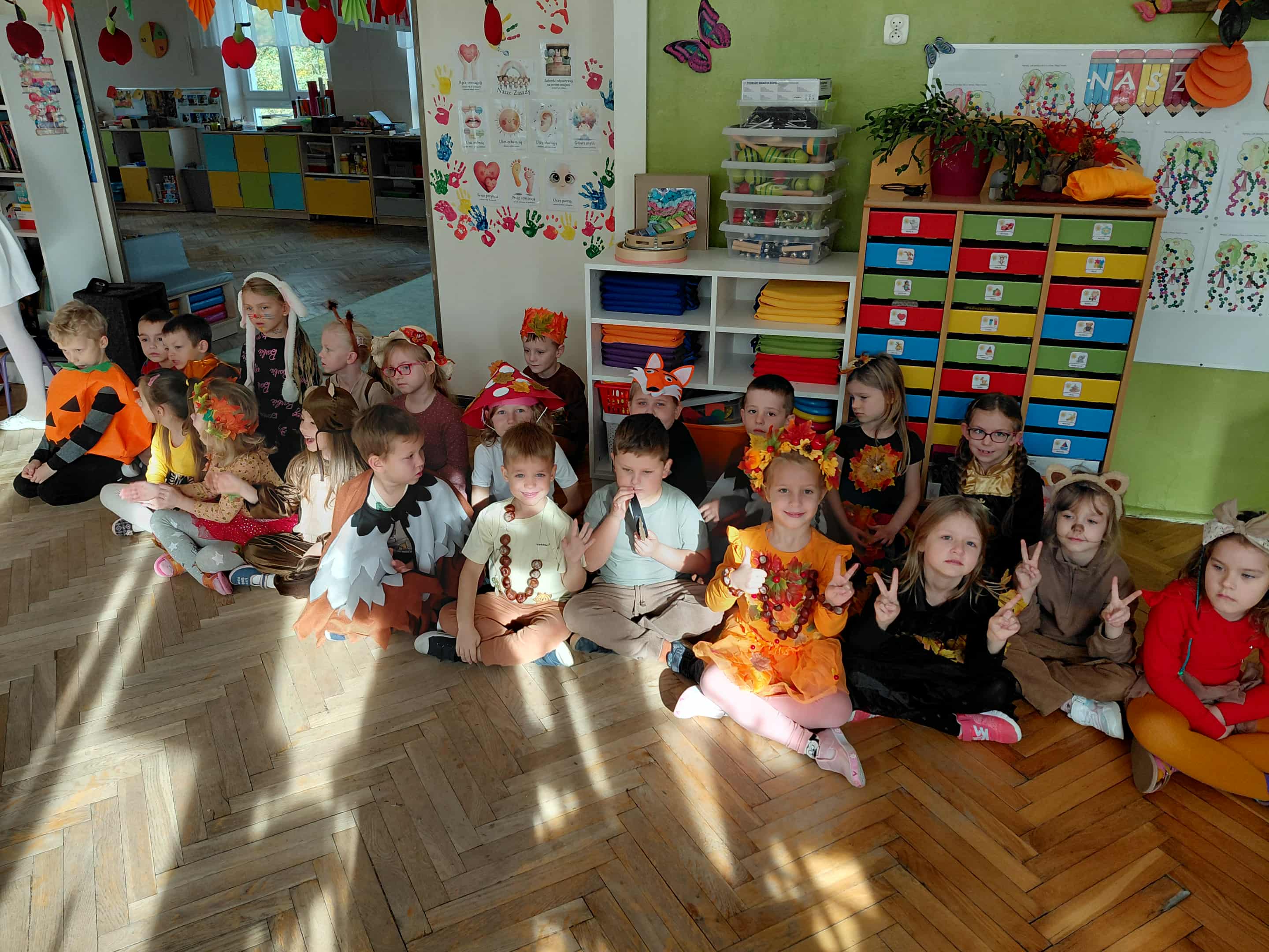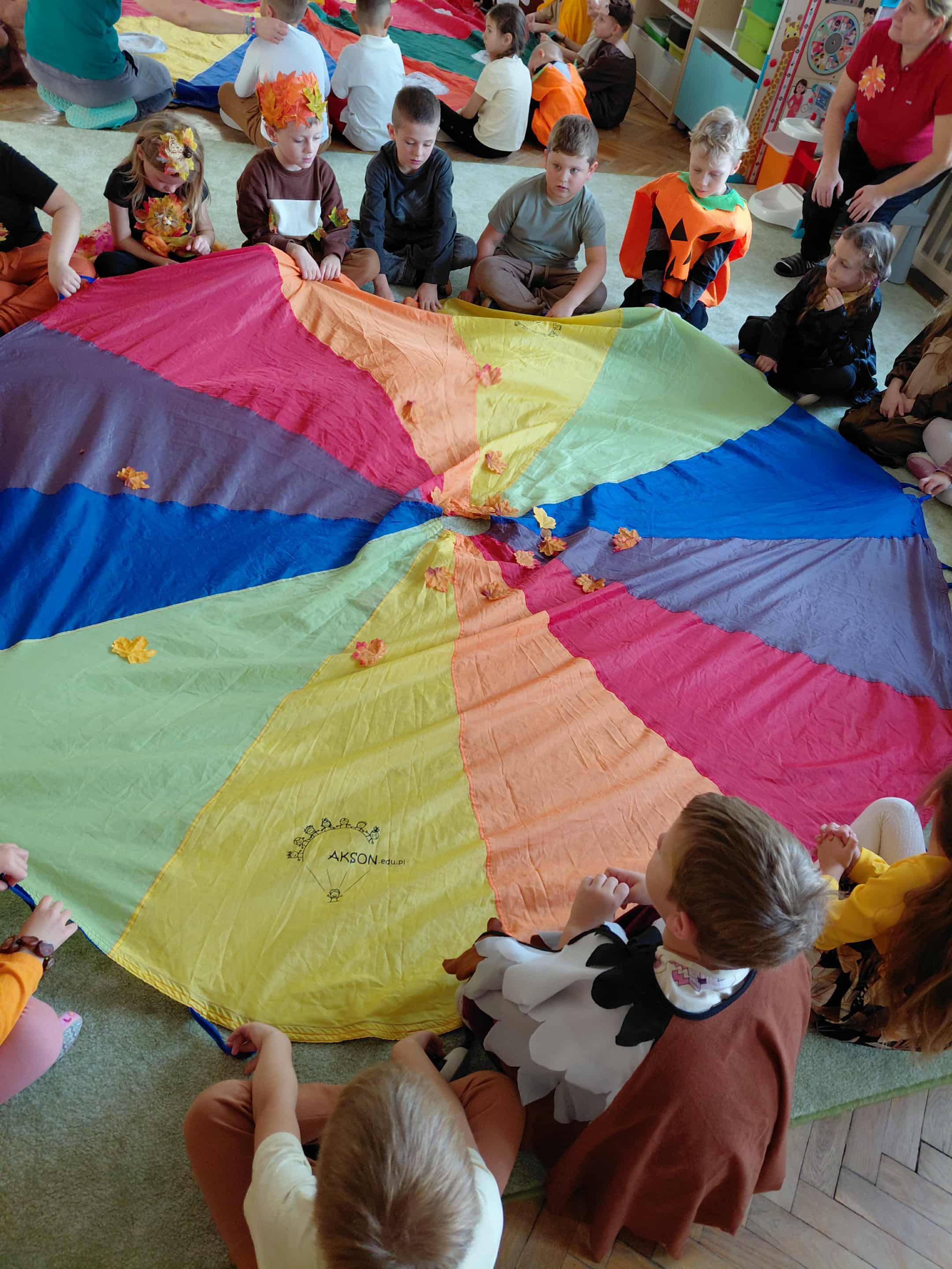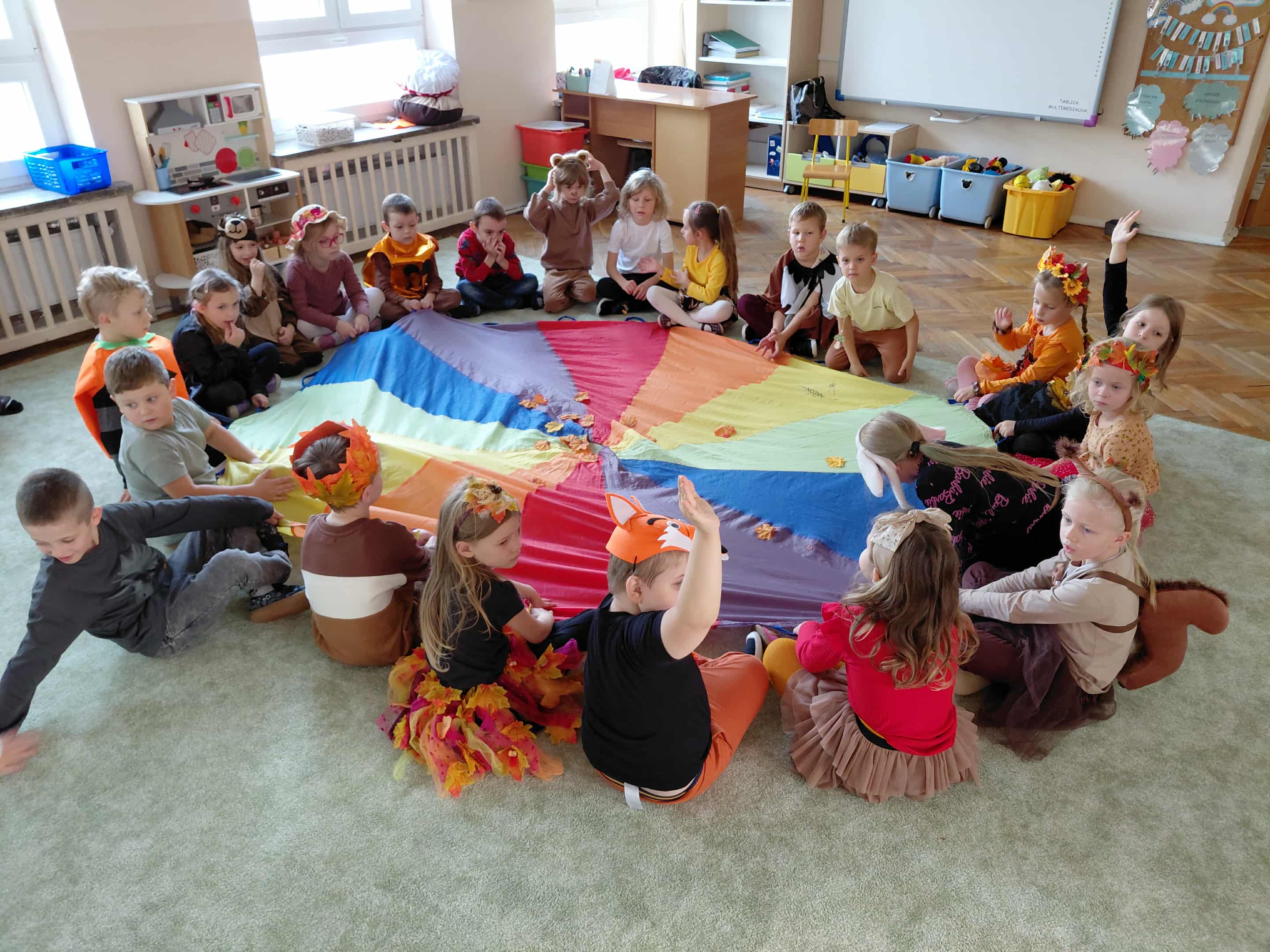 W naszym przedszkolu odbył się bal jesieni. Dzieci ze wszystkich grup brały udział w bardzo ciekawych jesiennych konkursach i zabawach, były również swobodne tańce i zabawy z chusta animacyjną. Dzieci przyszły na bal w przepięknych jesiennych strojach. Mamy bardzo roztańczone przedszkole.