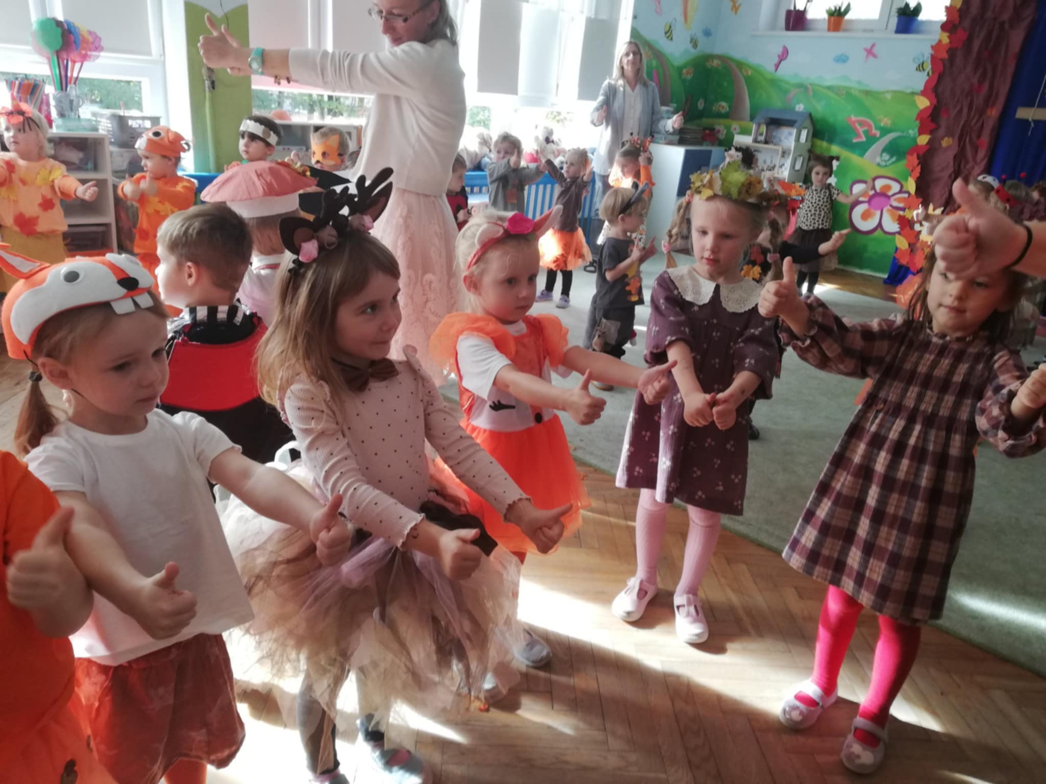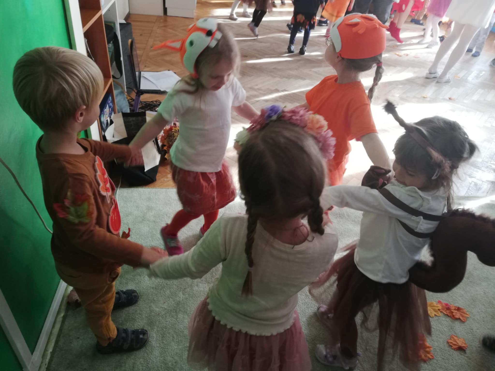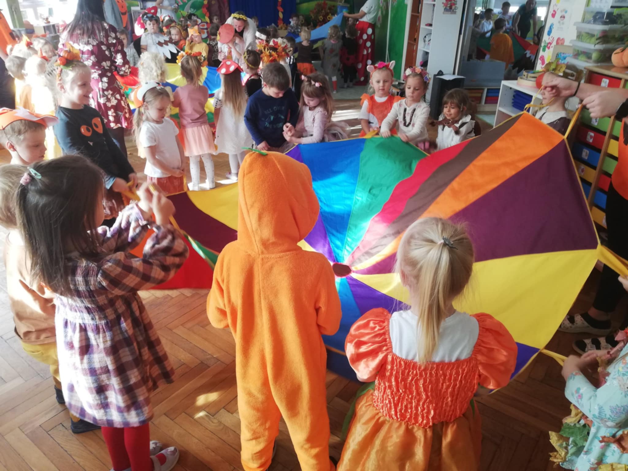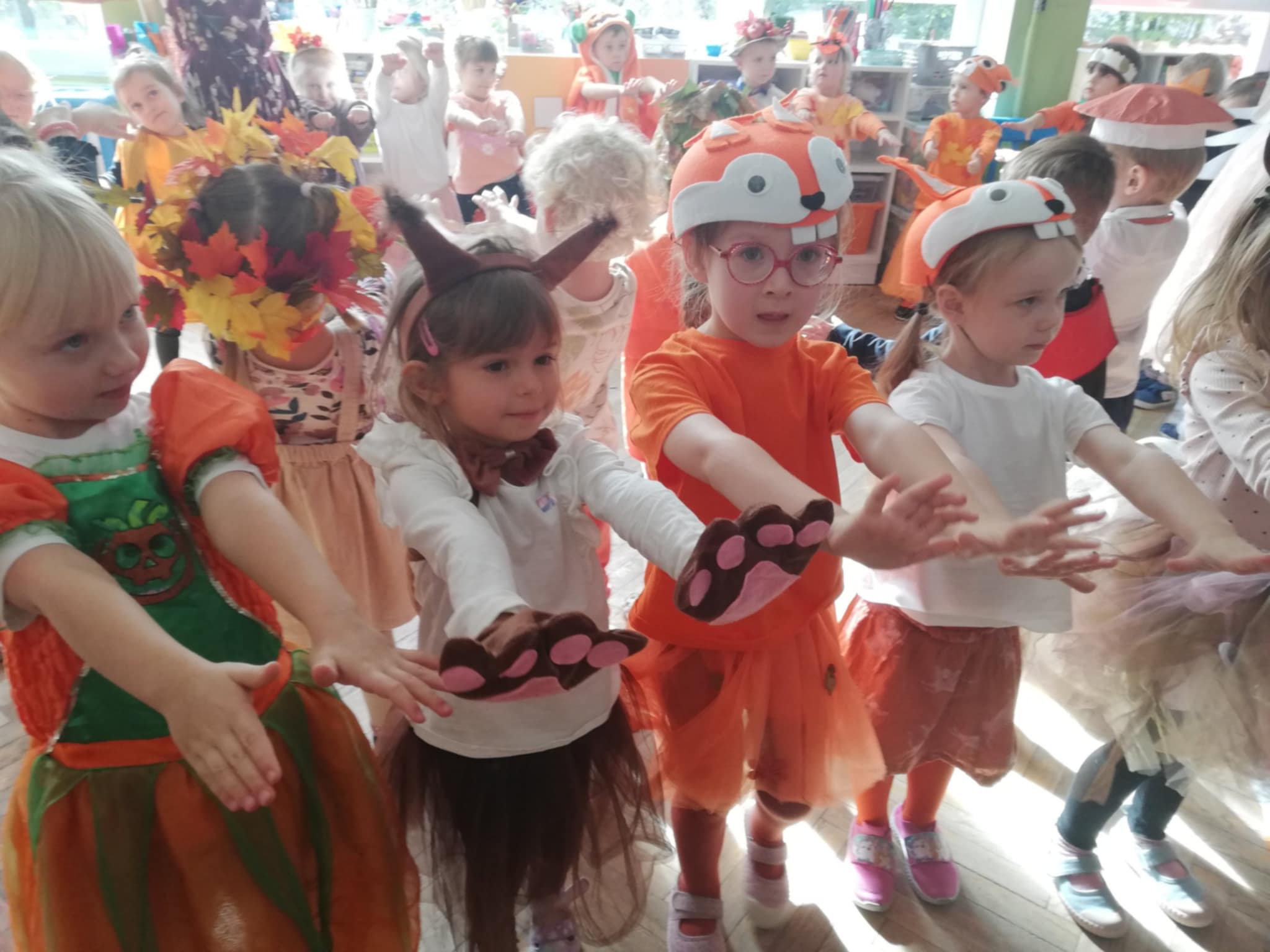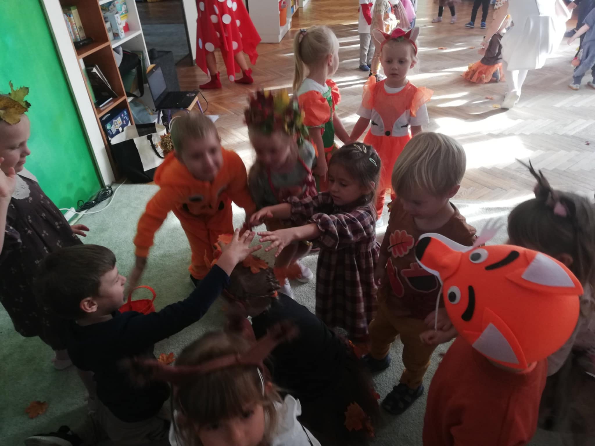 Bal Jesieni to jeden z tych dni, na który wszyscy czekają. Piękna pora roku zachęca do zabaw nie tylko na zewnątrz. Na balu bawiliśmy się z kolegami i koleżankami wszystkich grup przedszkolnych. Braliśmy udział w jesiennych konkursach i zabawach. Były również swobodne tańce i zabawy z chusta animacyjną, w których misie, jeżyki, wilczki, muchomorki, panie Jesień..., doskonale się odnalazły. Nawet zajęcia rytmiczne, były w klimacie balu jesiennego.