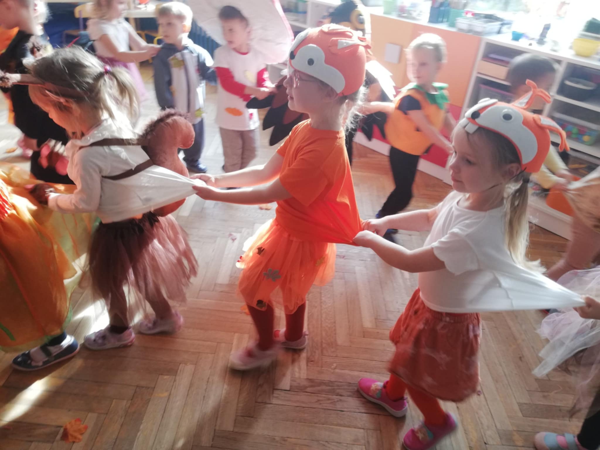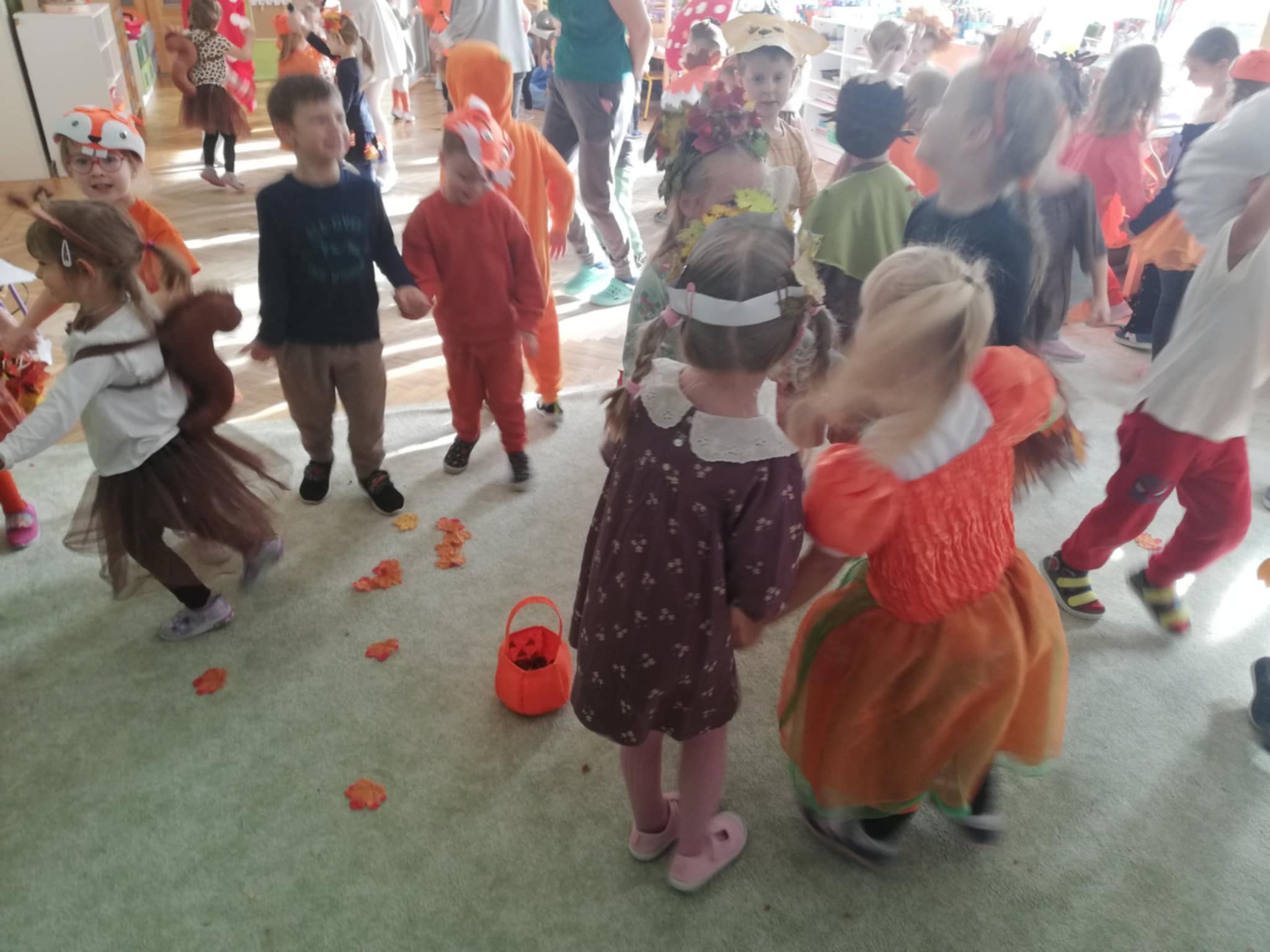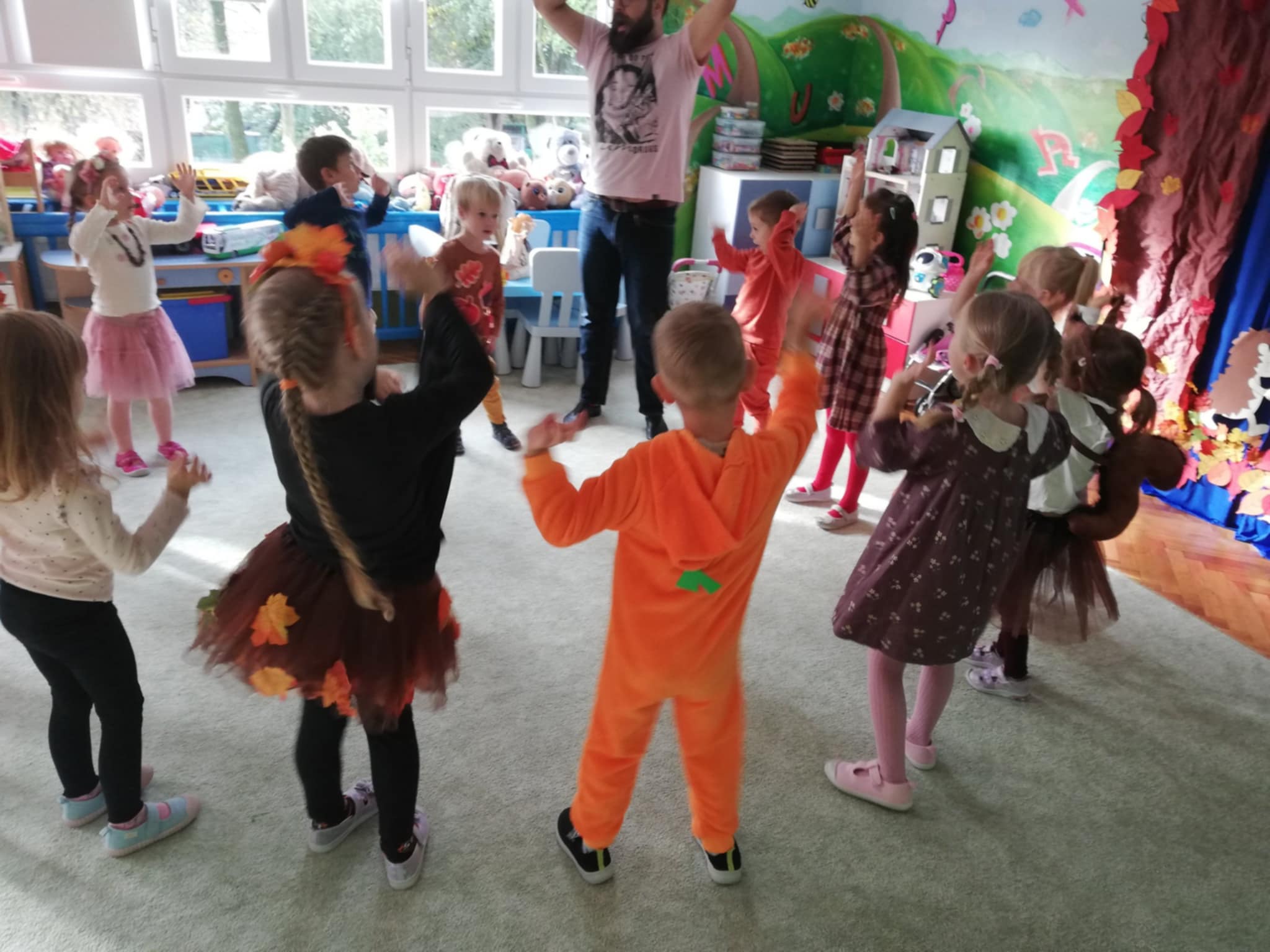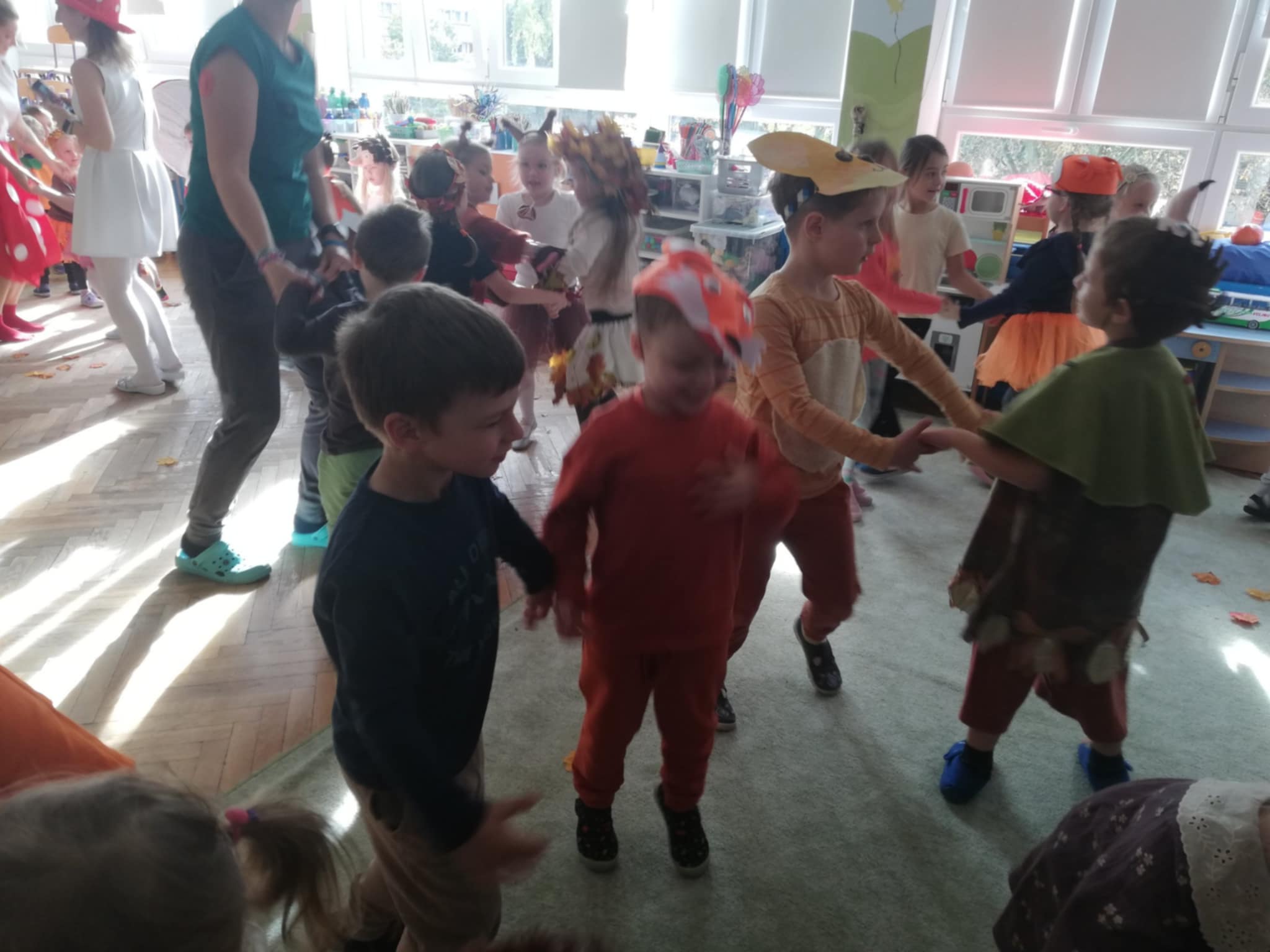 Bal Jesieni to jeden z tych dni, na który wszyscy czekają. Piękna pora roku zachęca do zabaw nie tylko na zewnątrz. Na balu bawiliśmy się z kolegami i koleżankami wszystkich grup przedszkolnych. Braliśmy udział w jesiennych konkursach i zabawach. Były również swobodne tańce i zabawy z chusta animacyjną, w których misie, jeżyki, wilczki, muchomorki, panie Jesień..., doskonale się odnalazły. Nawet zajęcia rytmiczne, były w klimacie balu jesiennego.