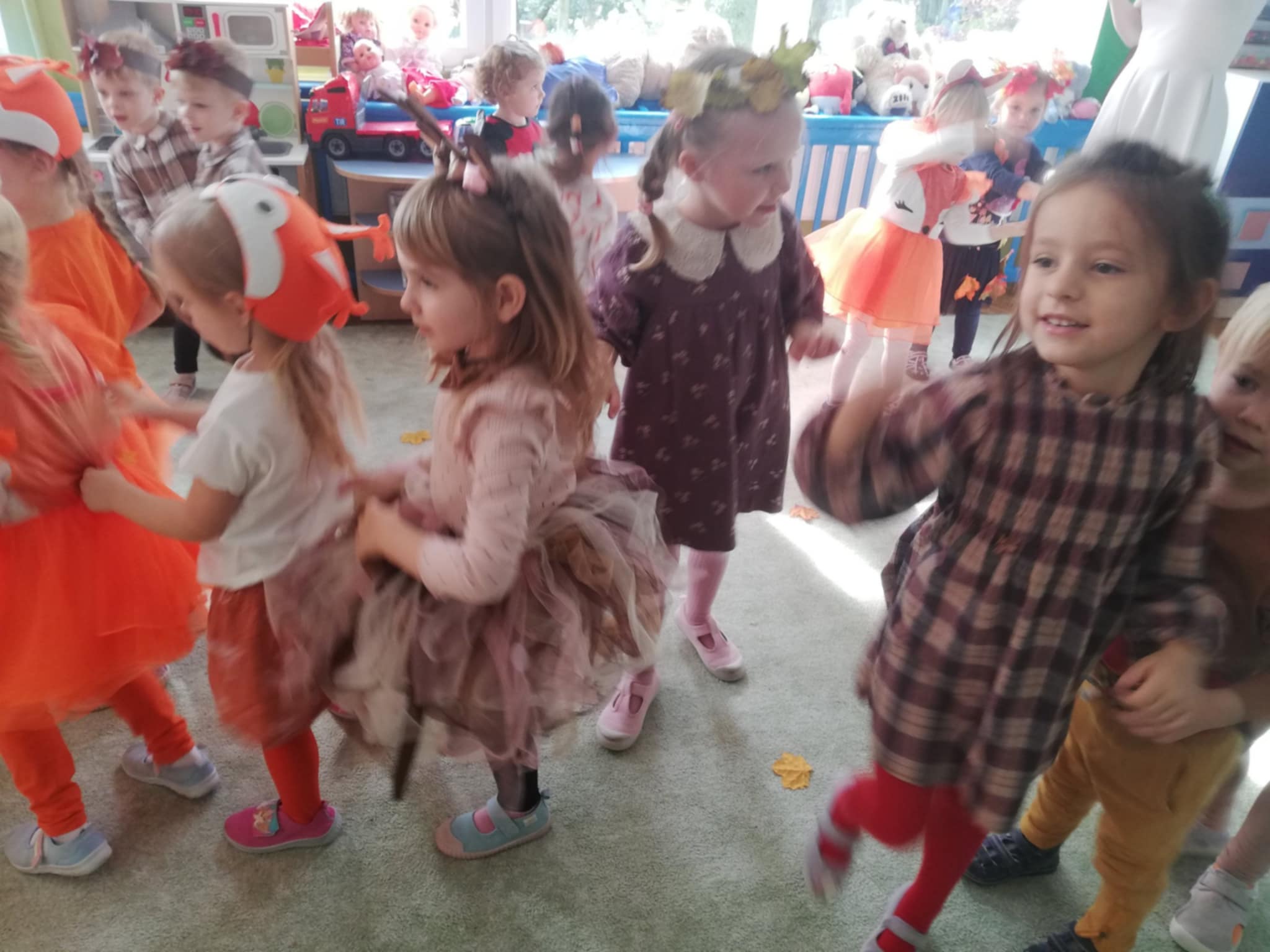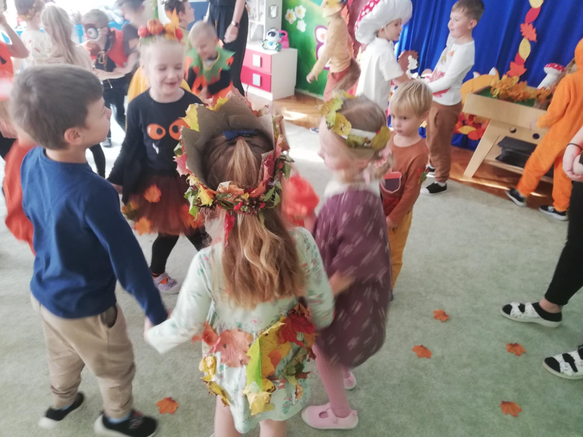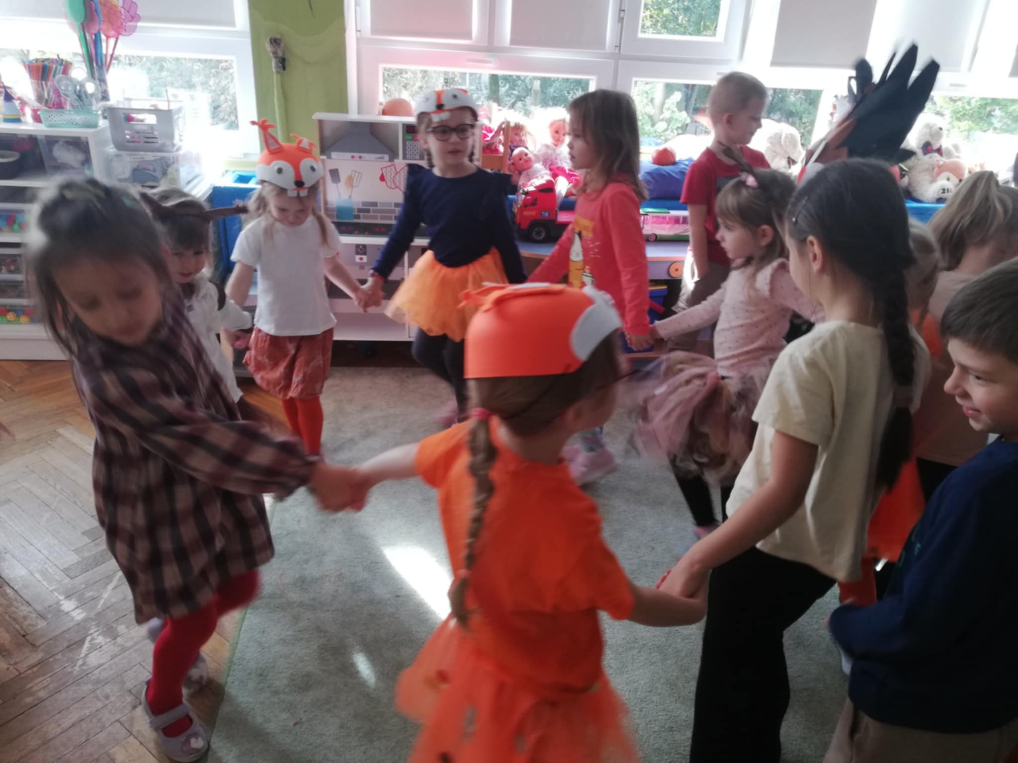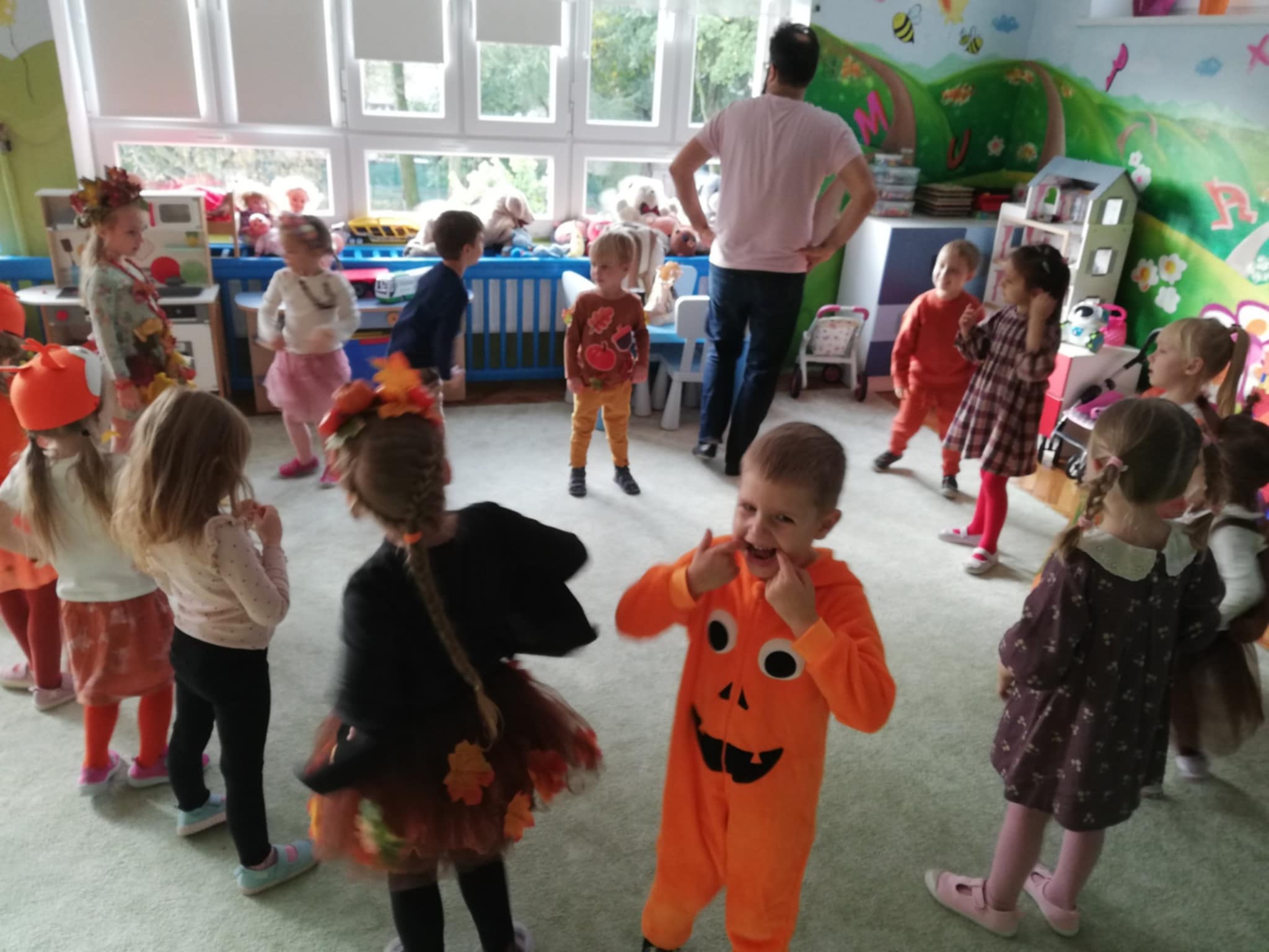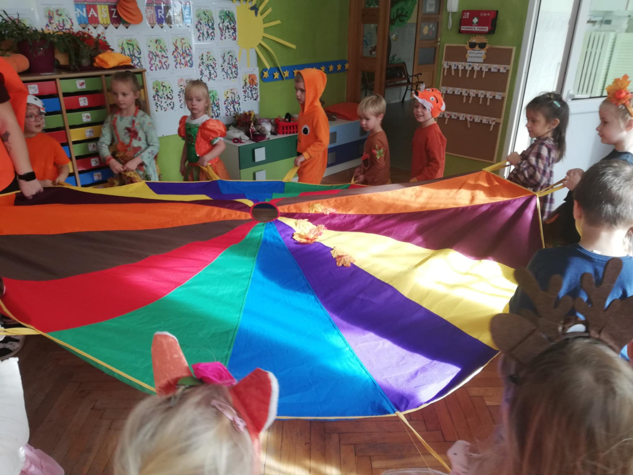 Bal Jesieni to jeden z tych dni, na który wszyscy czekają. Piękna pora roku zachęca do zabaw nie tylko na zewnątrz. Na balu bawiliśmy się z kolegami i koleżankami wszystkich grup przedszkolnych. Braliśmy udział w jesiennych konkursach i zabawach. Były również swobodne tańce i zabawy z chusta animacyjną, w których misie, jeżyki, wilczki, muchomorki, panie Jesień..., doskonale się odnalazły. Nawet zajęcia rytmiczne, były w klimacie balu jesiennego.