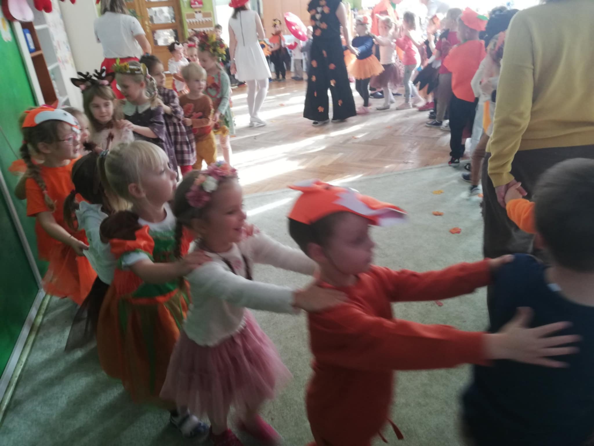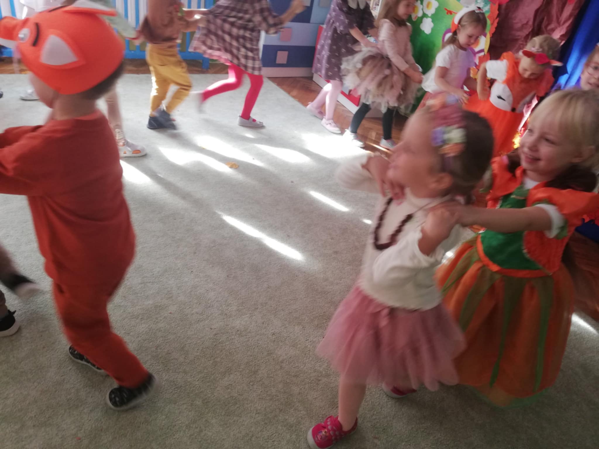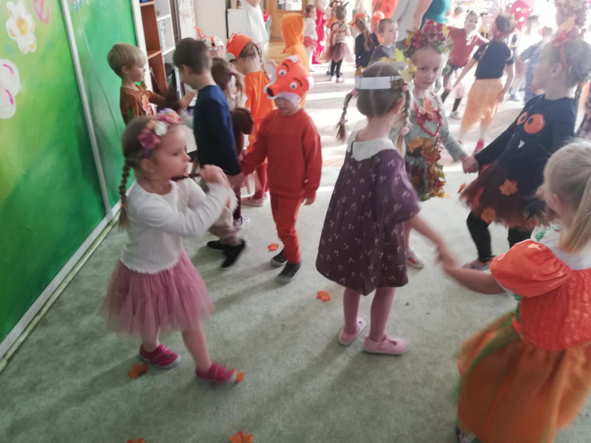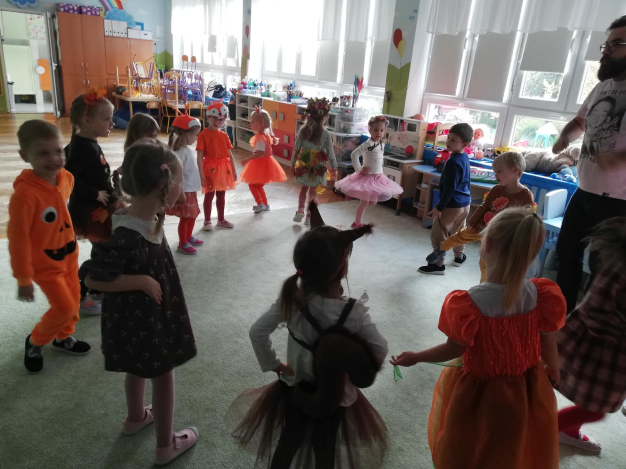 Bal Jesieni to jeden z tych dni, na który wszyscy czekają. Piękna pora roku zachęca do zabaw nie tylko na zewnątrz. Na balu bawiliśmy się z kolegami i koleżankami wszystkich grup przedszkolnych. Braliśmy udział w jesiennych konkursach i zabawach. Były również swobodne tańce i zabawy z chusta animacyjną, w których misie, jeżyki, wilczki, muchomorki, panie Jesień..., doskonale się odnalazły. Nawet zajęcia rytmiczne, były w klimacie balu jesiennego.
