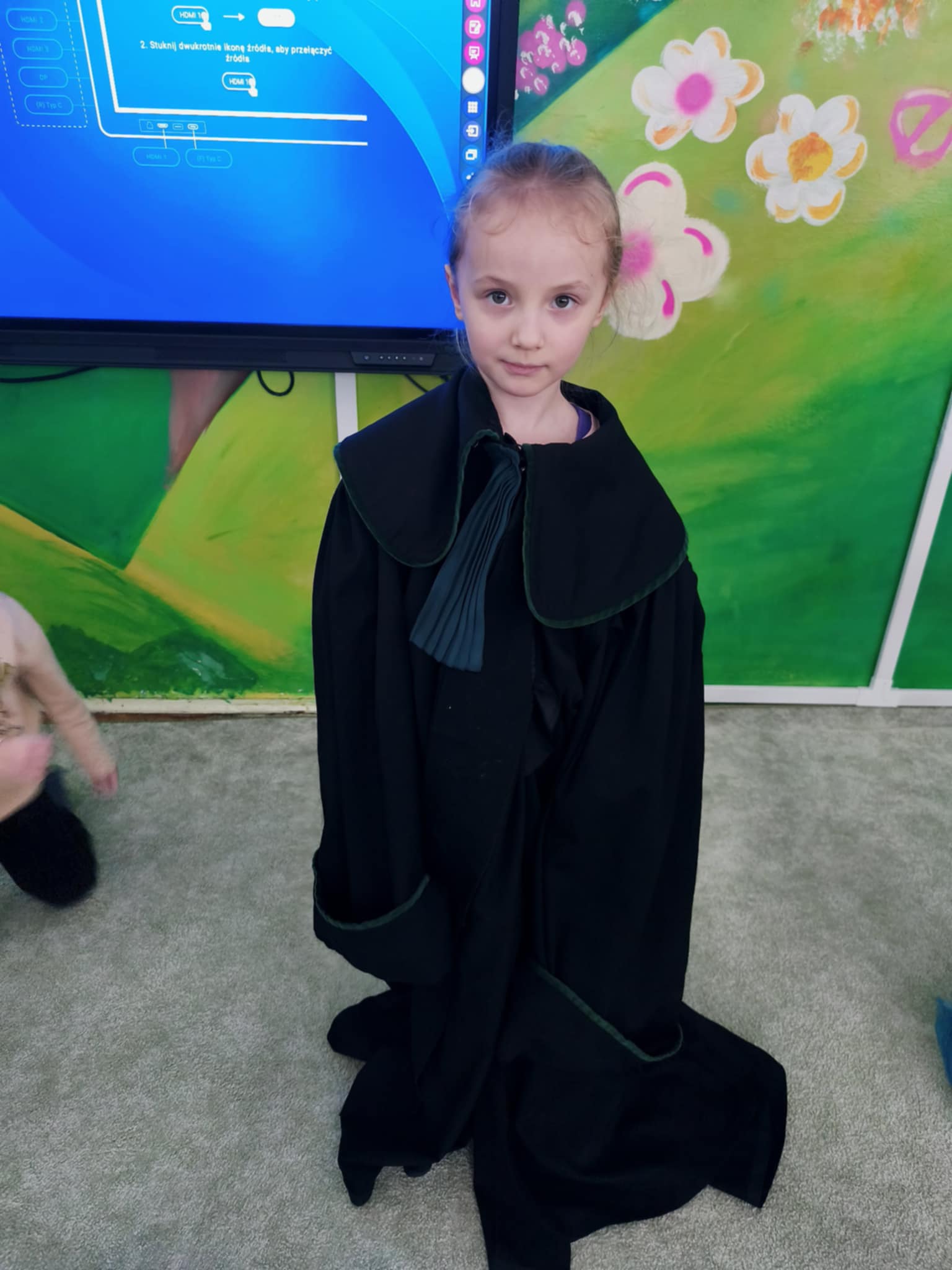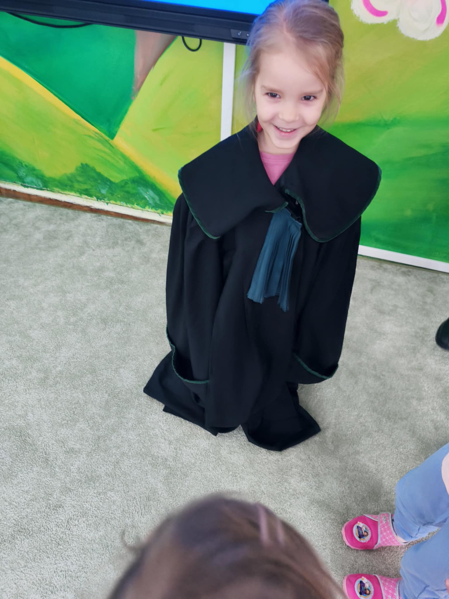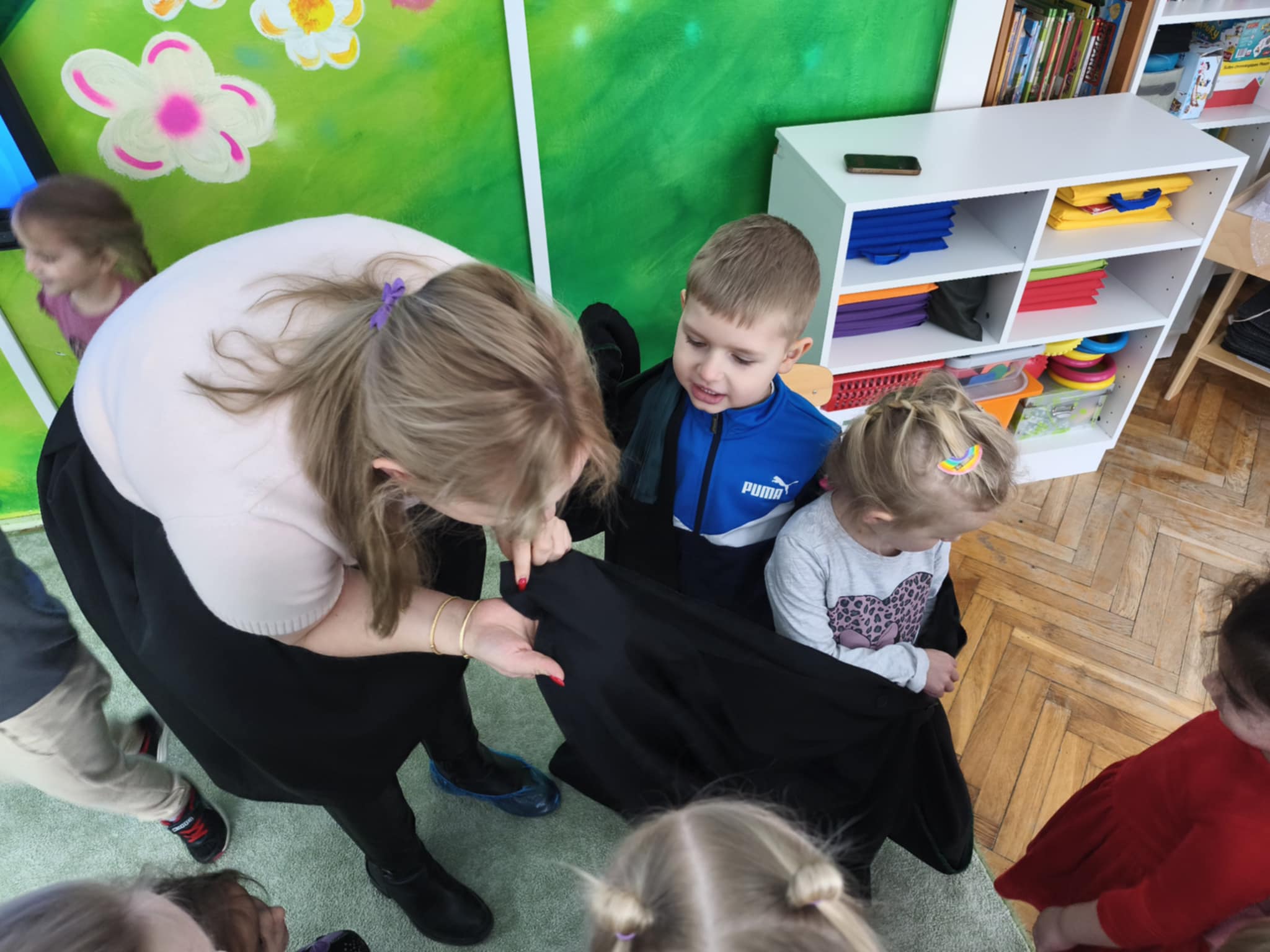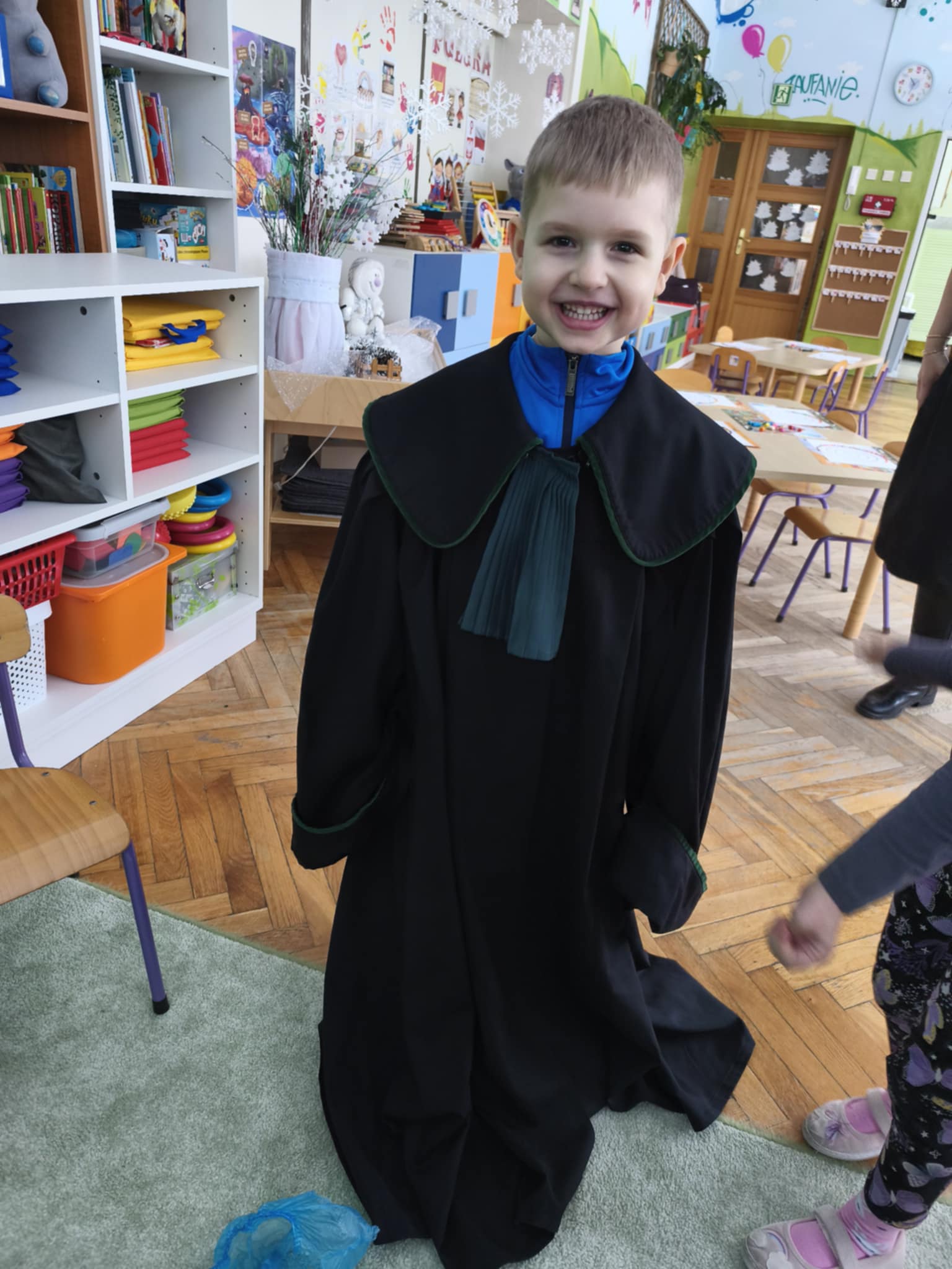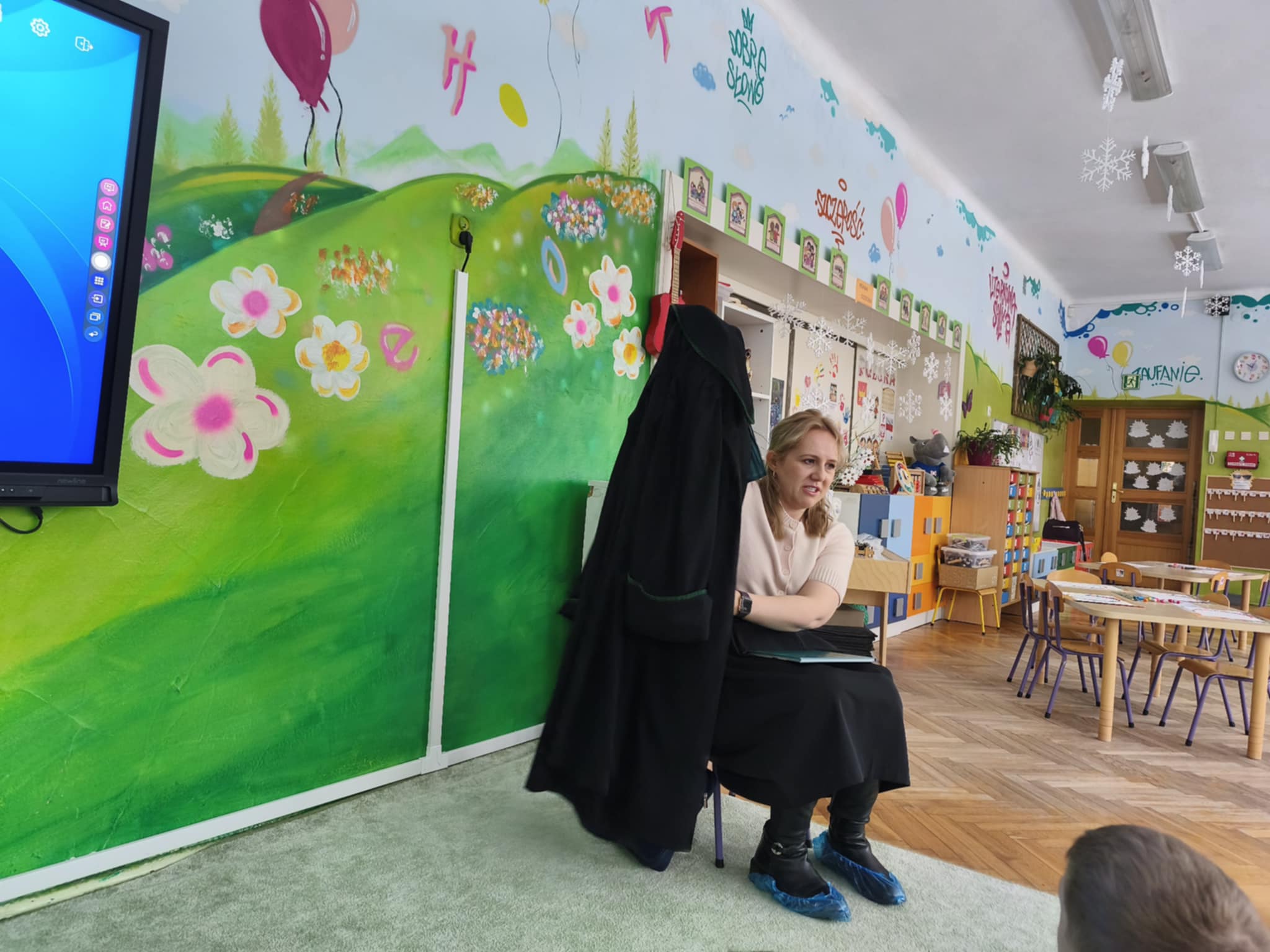 Dzisiaj znalazła dla nas czas Mama Julii. W ramach akcji "Cała Polska Czyta Dzieciom", Pani Agnieszka przeczytała nam książeczkę "Leśne przygody Misia Adwokata". Tym samym Przybliżyła nam swój zawód. Mama Julii jest adwokatem. Mieliśmy możliwość zobaczenia i przymierzenia specjalnego ubioru, który zakłada Pani mecenas na sprawę sądową. Śmiesznie wyglądaliśmy:) Na zakończenie każdy z nas otrzymał kolorowankę dedykowaną przeczytanej książeczce. Bardzo dziękujemy za poświęcony czas.