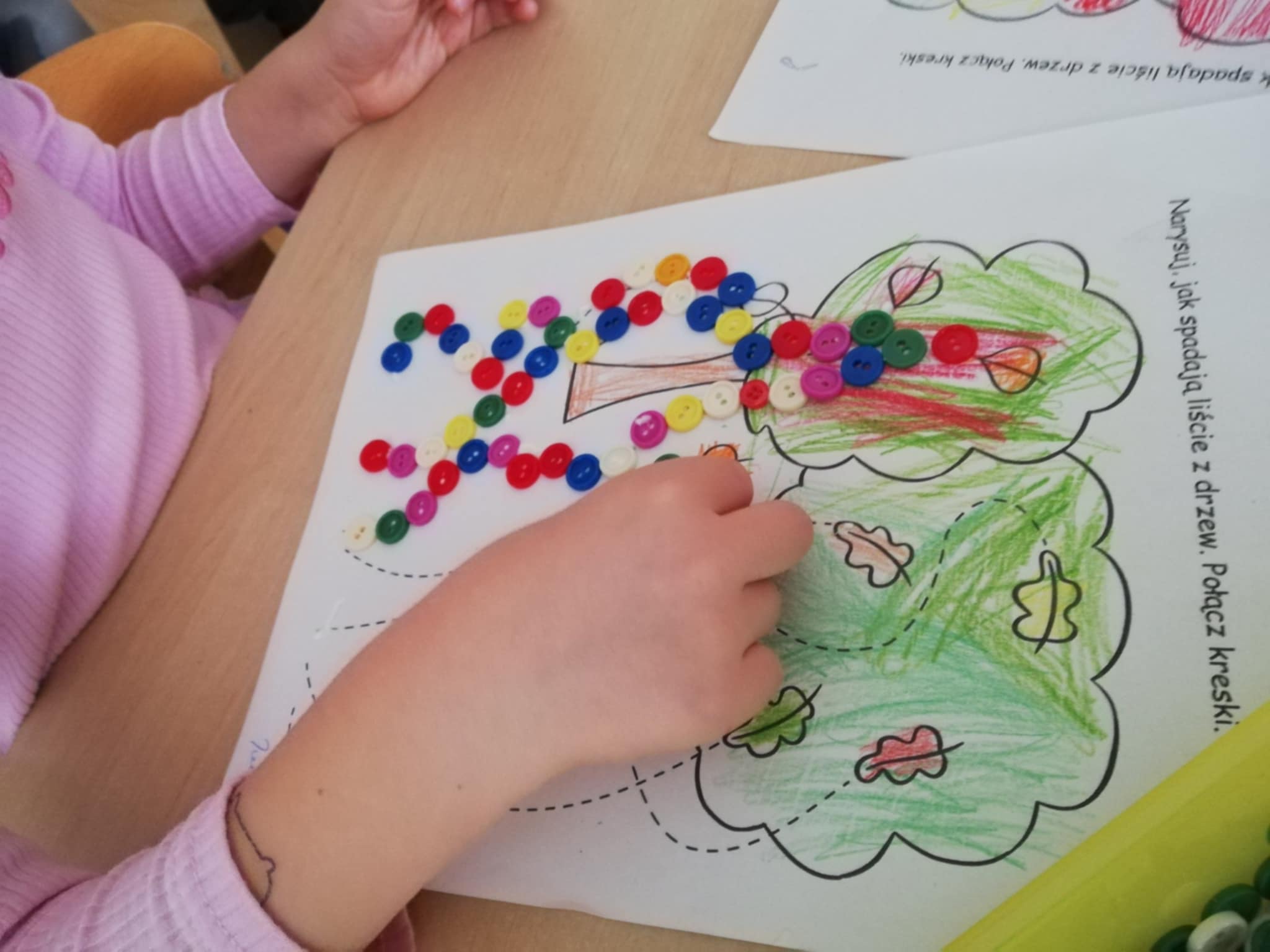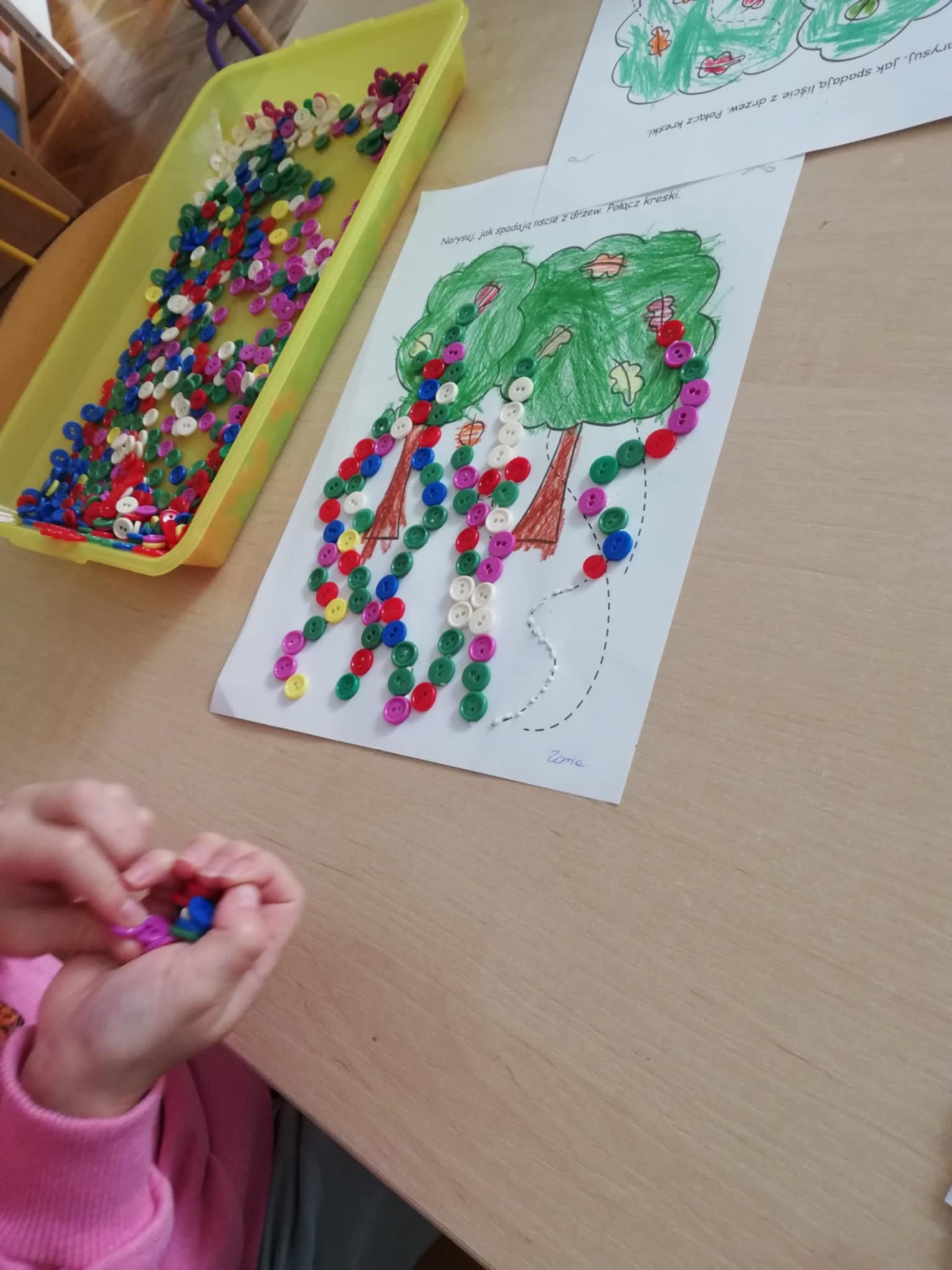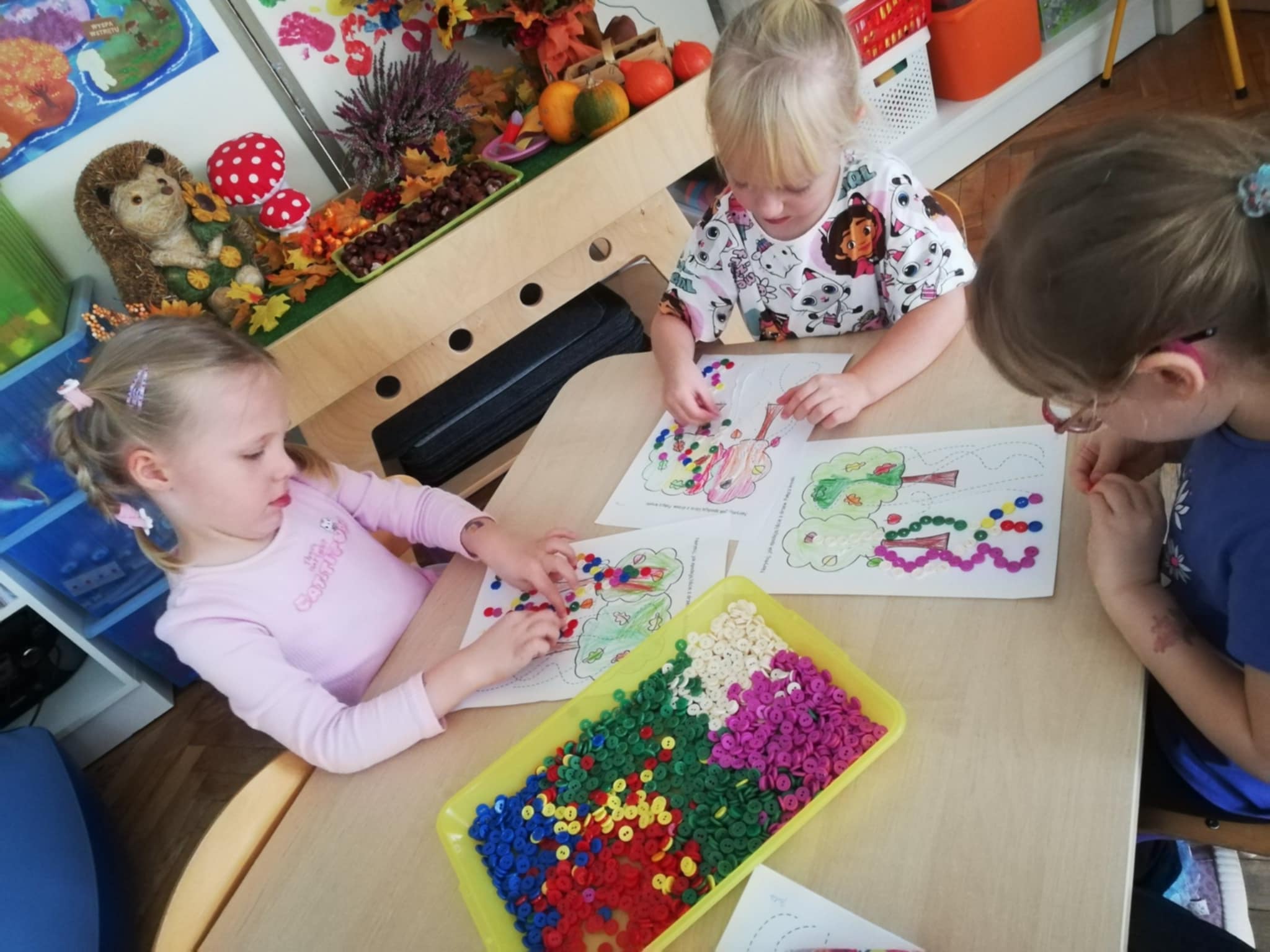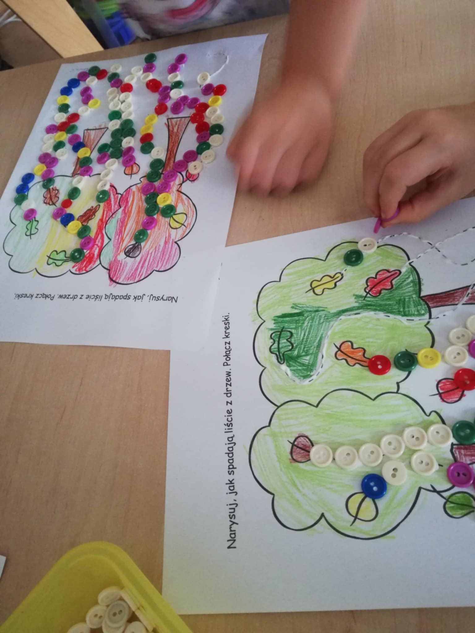 Nasze ostatnie jesienne arcydzieła:) Dary jesieni w mandalach, spadające guziczkowe liście i sprzątanie liści pędzlem.