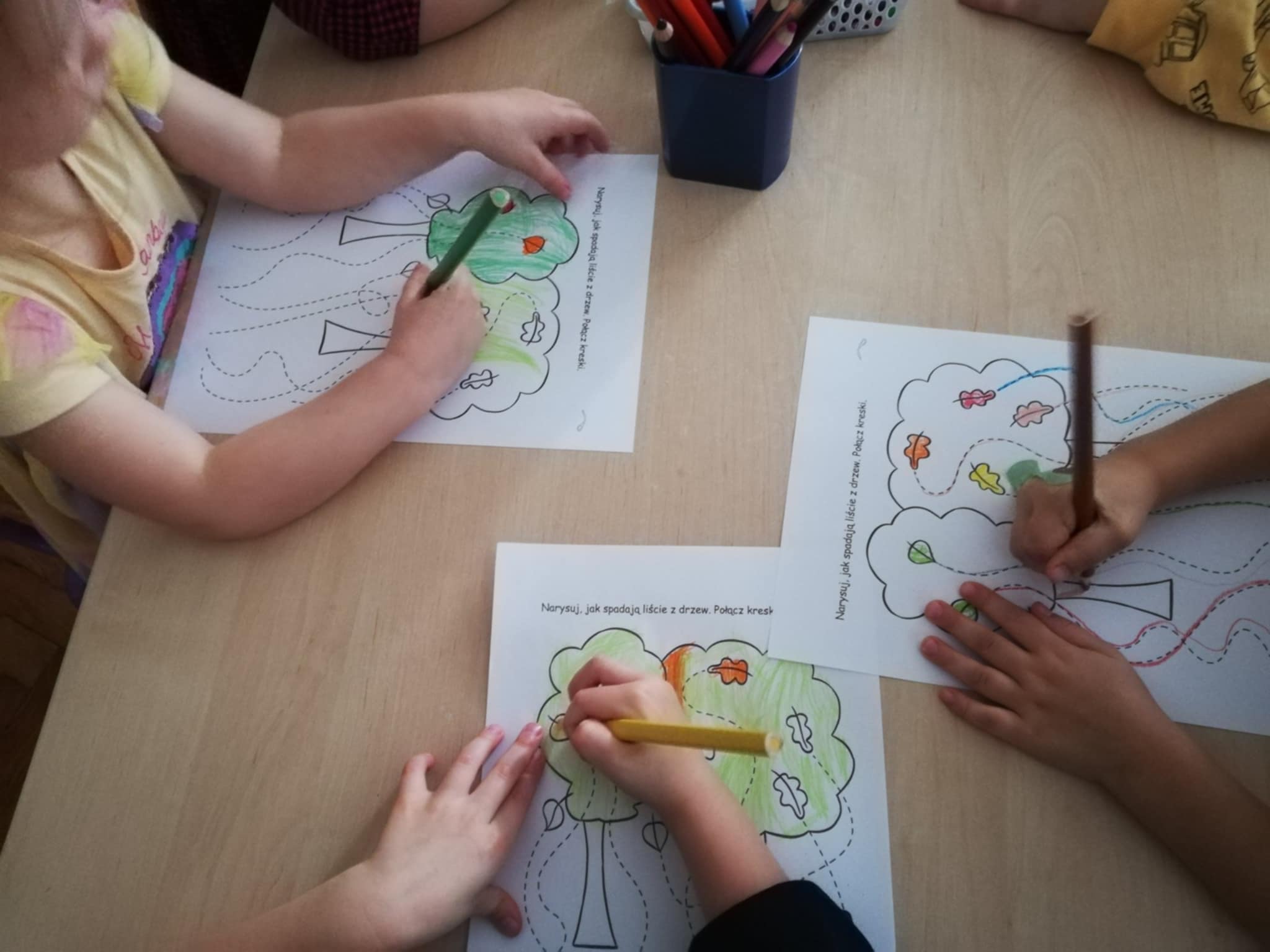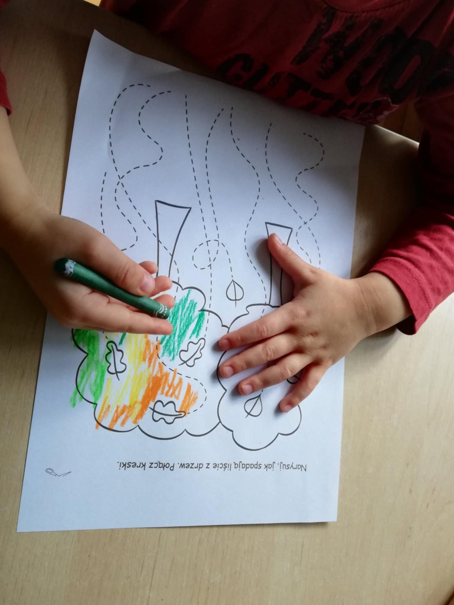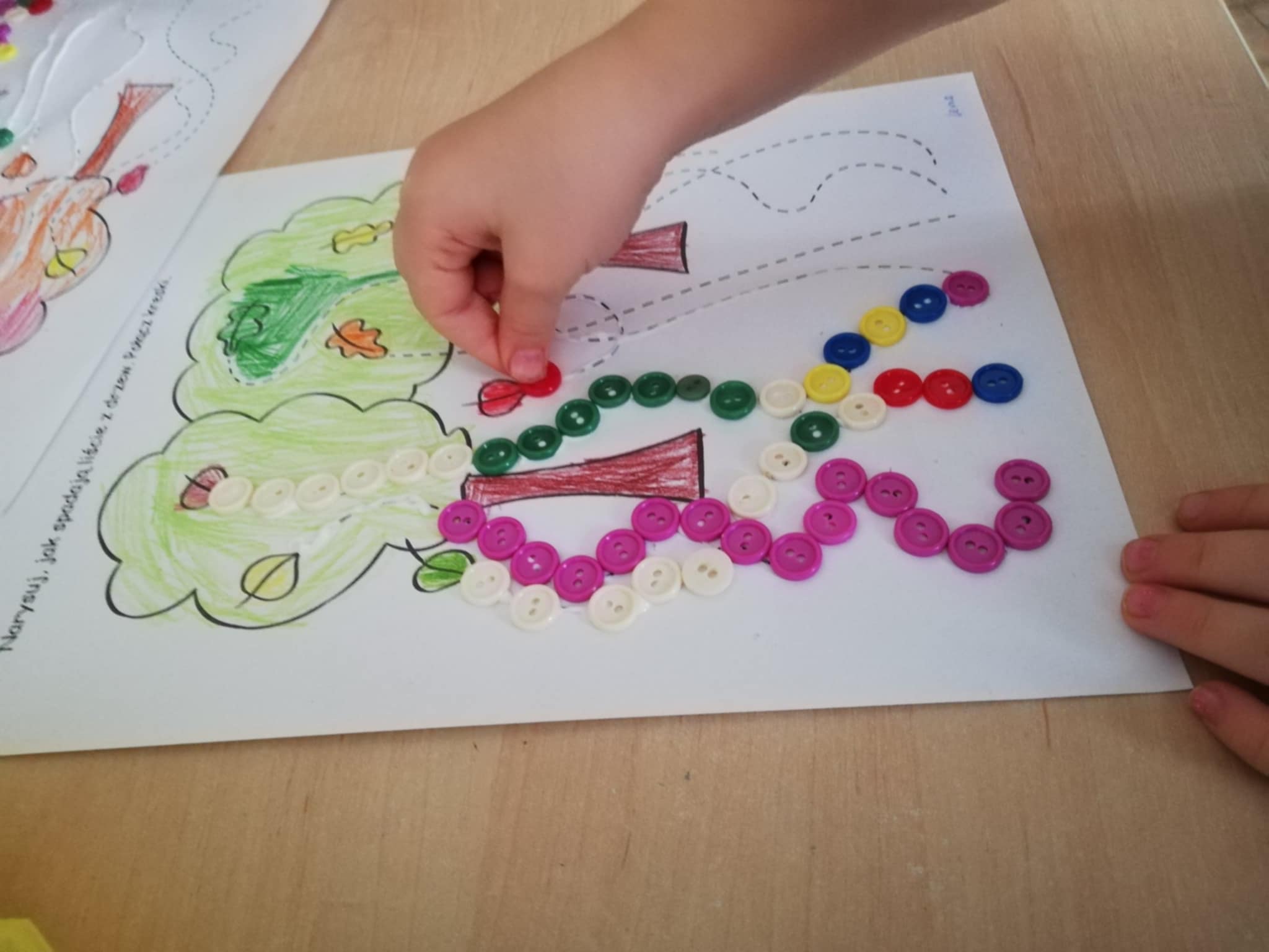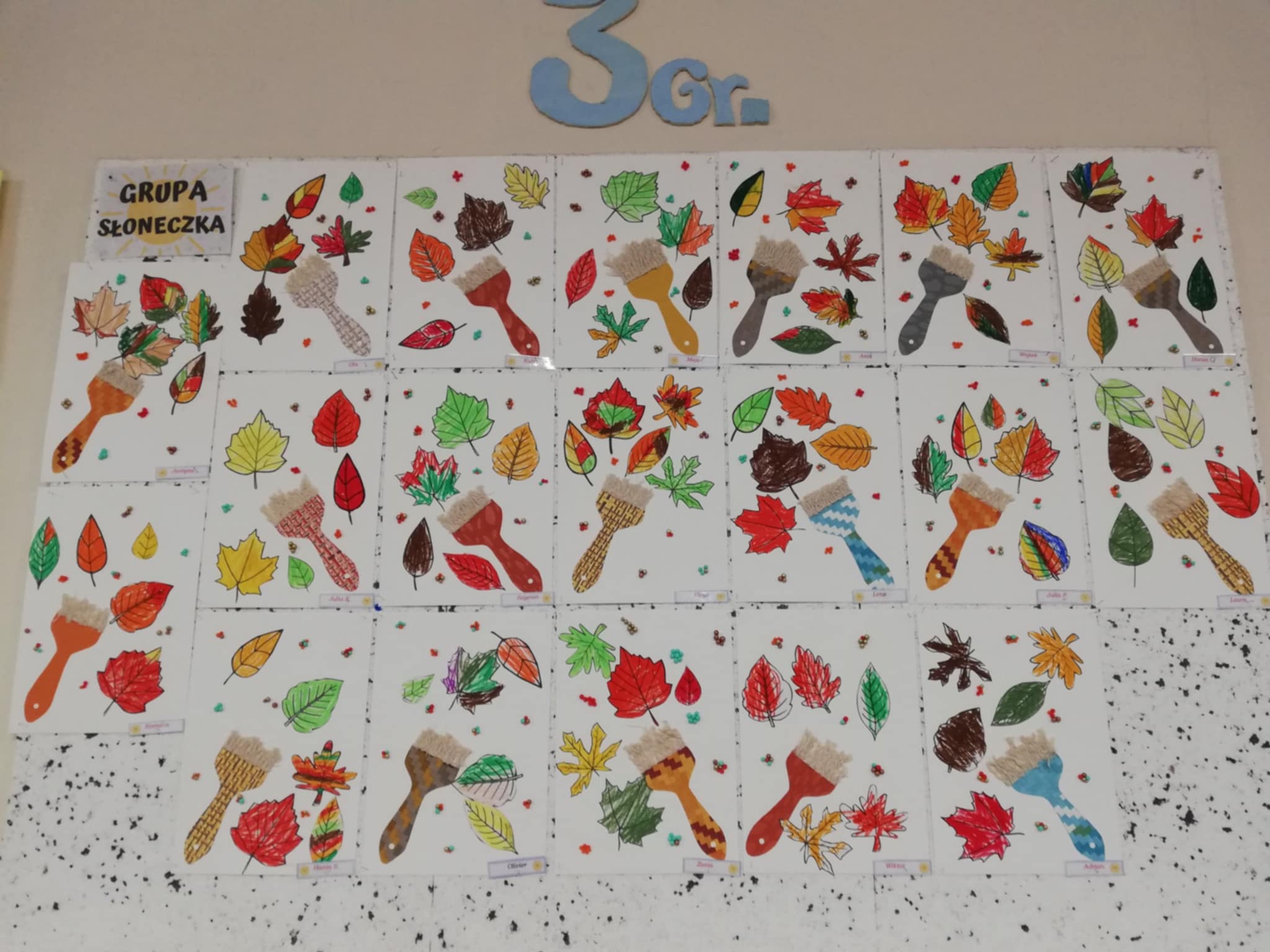 Nasze ostatnie jesienne arcydzieła:) Dary jesieni w mandalach, spadające guziczkowe liście i sprzątanie liści pędzlem.