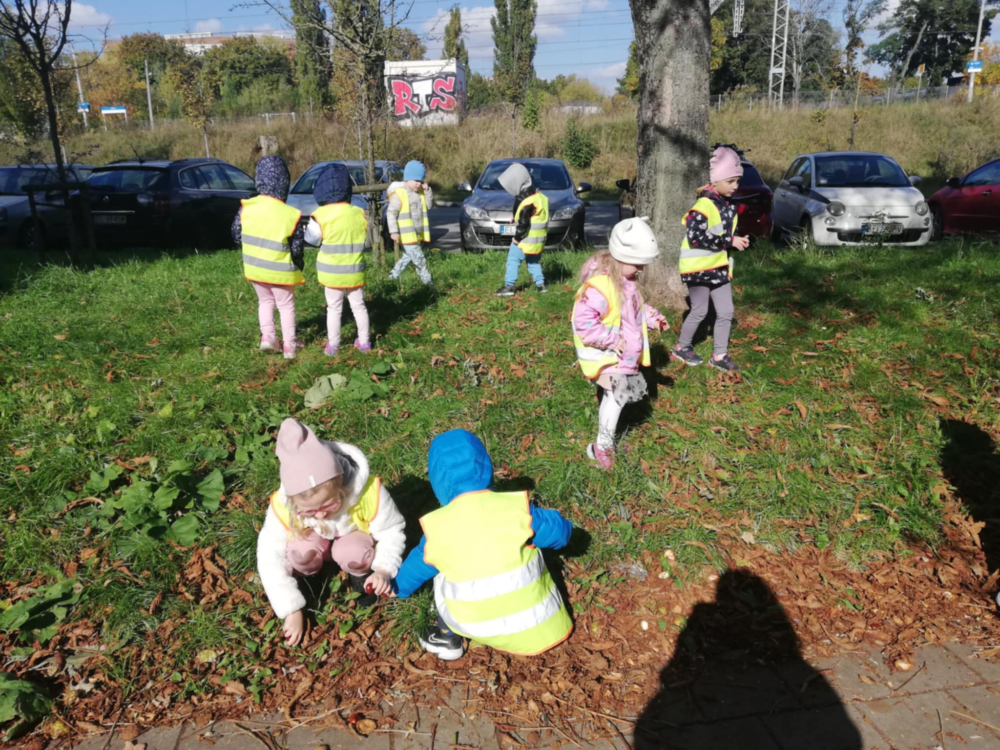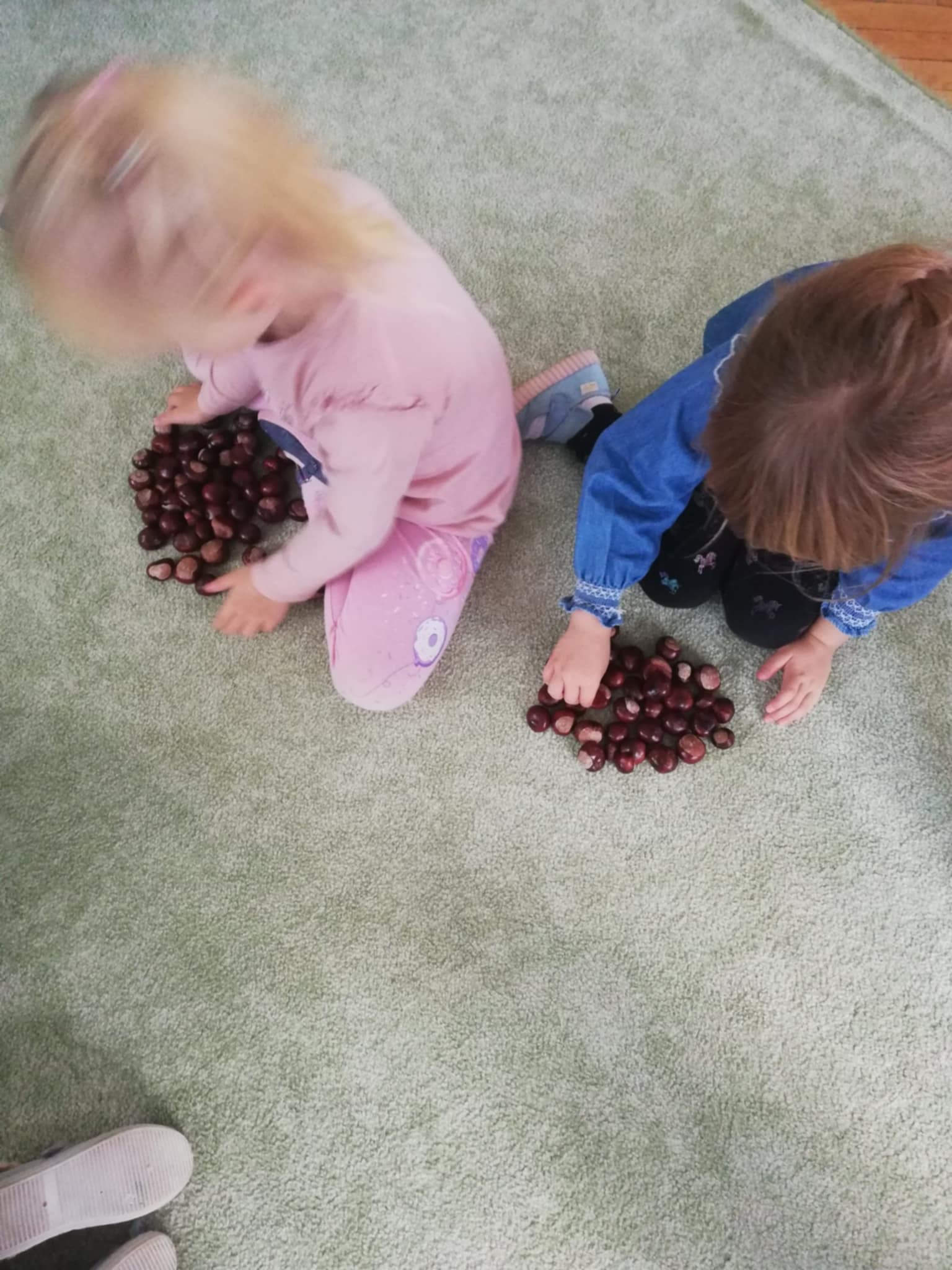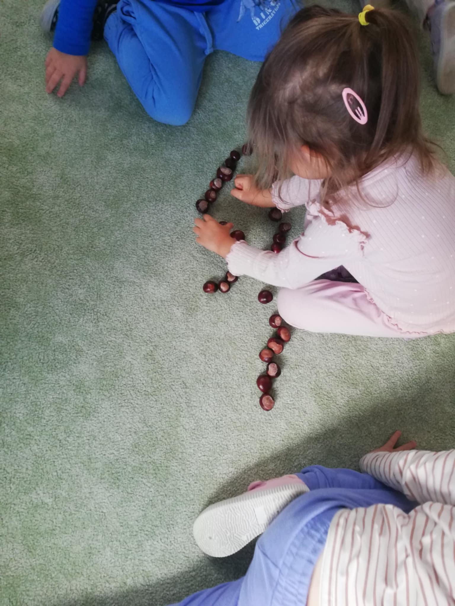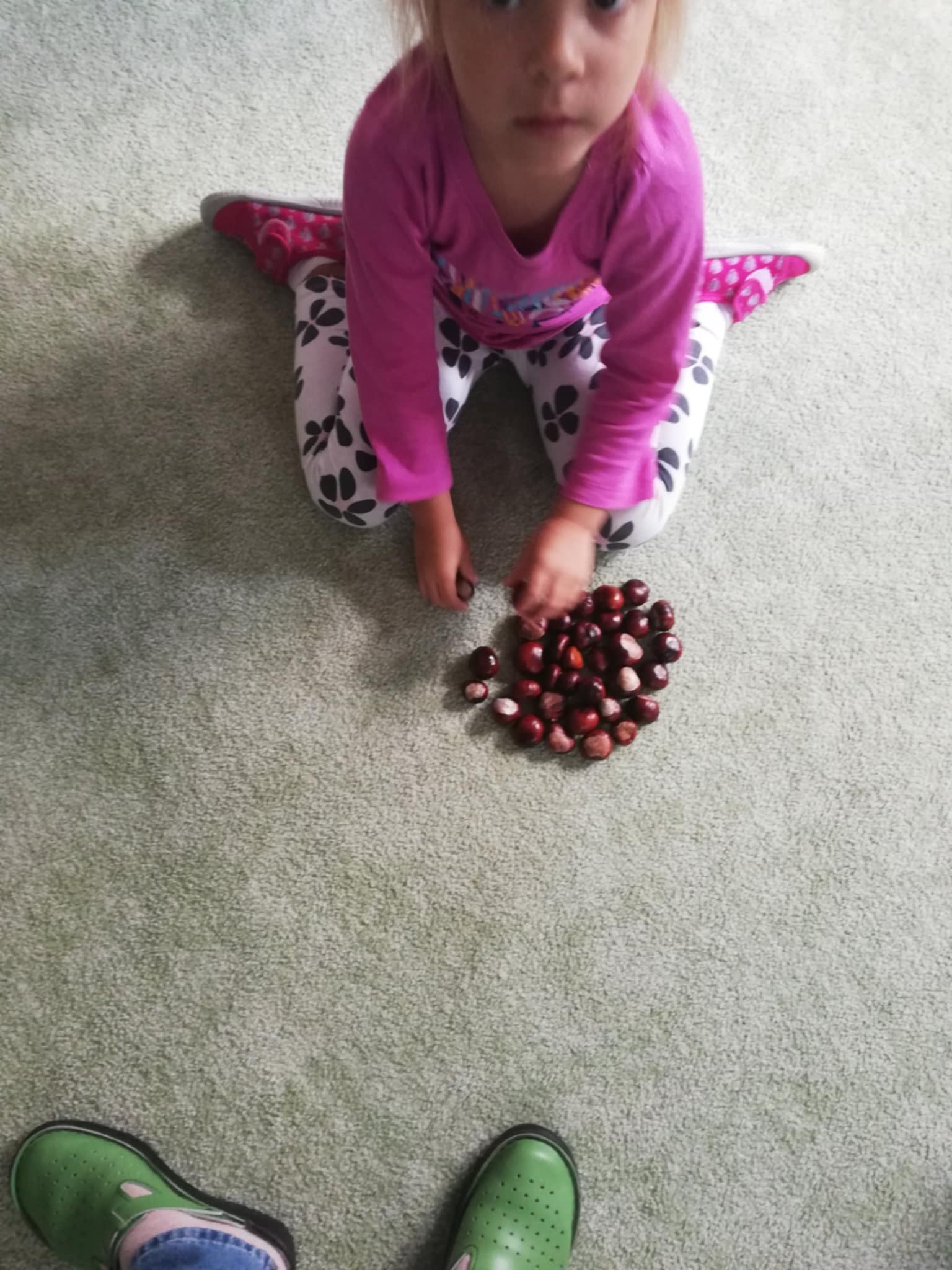 Sprzyjająca pogoda zachęca do spacerów. Dzisiaj celem wycieczki było doposażenie naszego kącika w kasztany. A więc... do dzieła. Zbieramy kasztany. Posłużyły nam również do zabawy i utrwalenia cyfry 1.