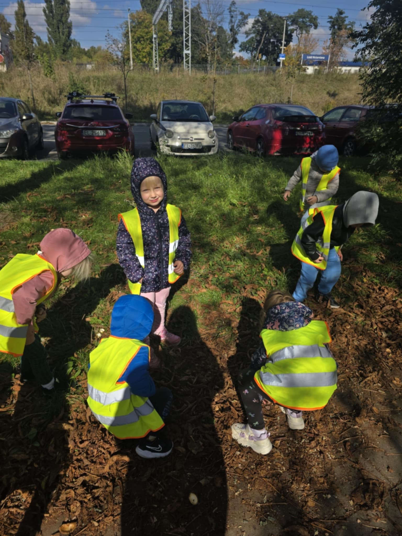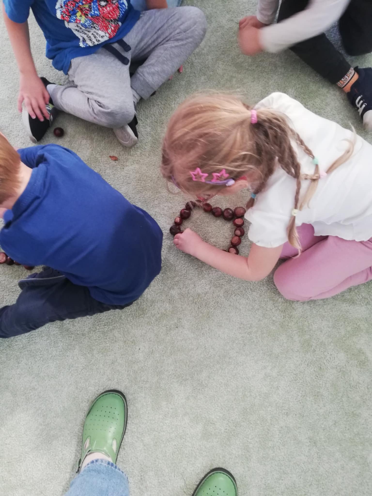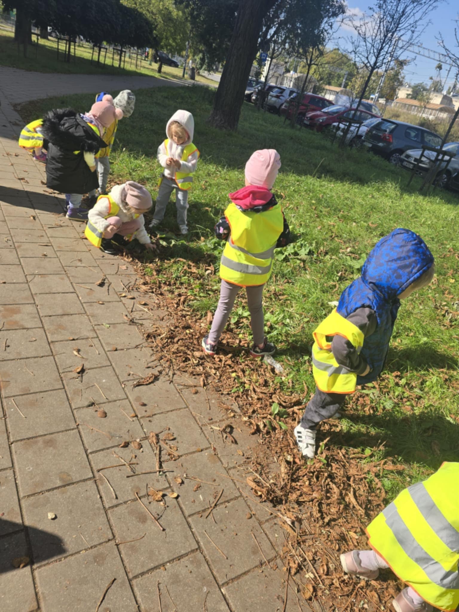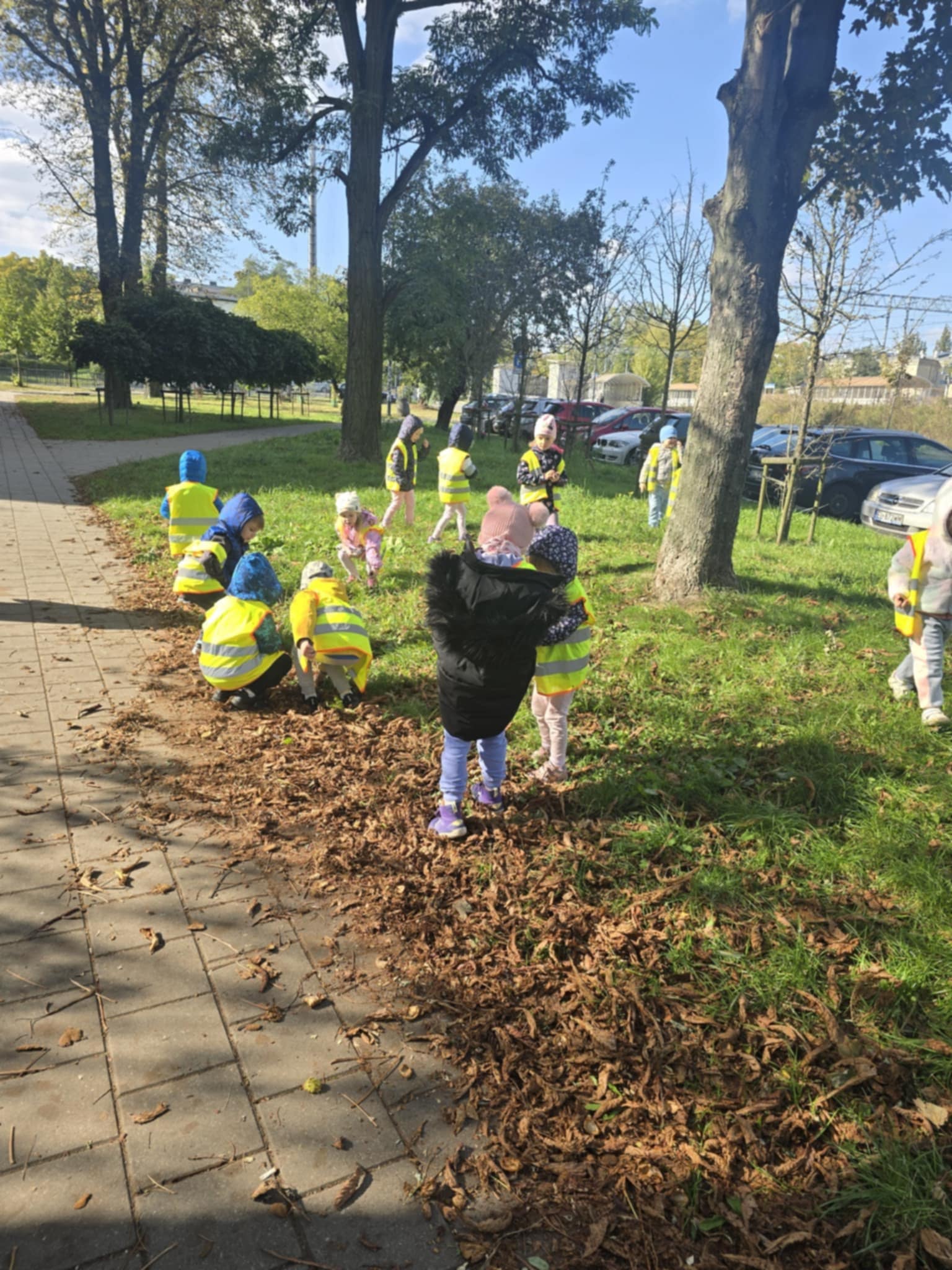 Sprzyjająca pogoda zachęca do spacerów. Dzisiaj celem wycieczki było doposażenie naszego kącika w kasztany. A więc... do dzieła. Zbieramy kasztany. Posłużyły nam również do zabawy i utrwalenia cyfry 1.