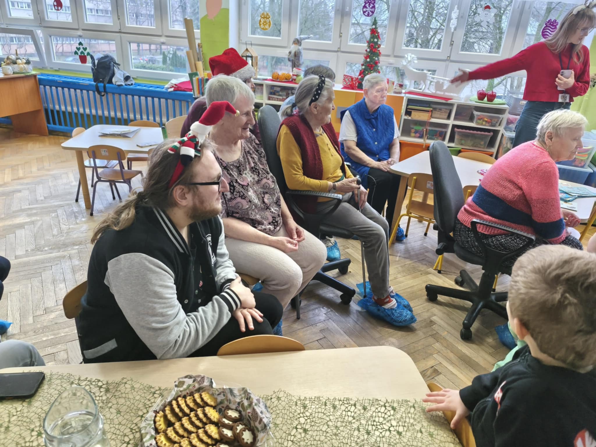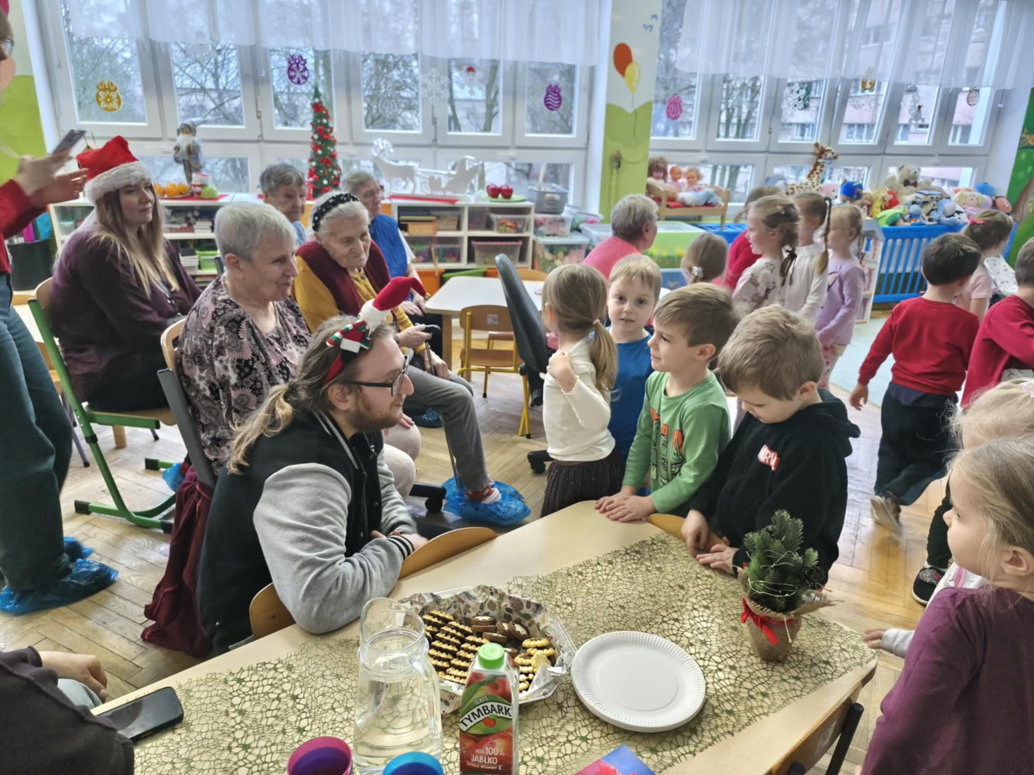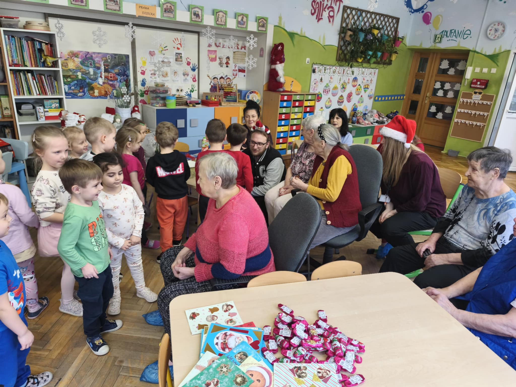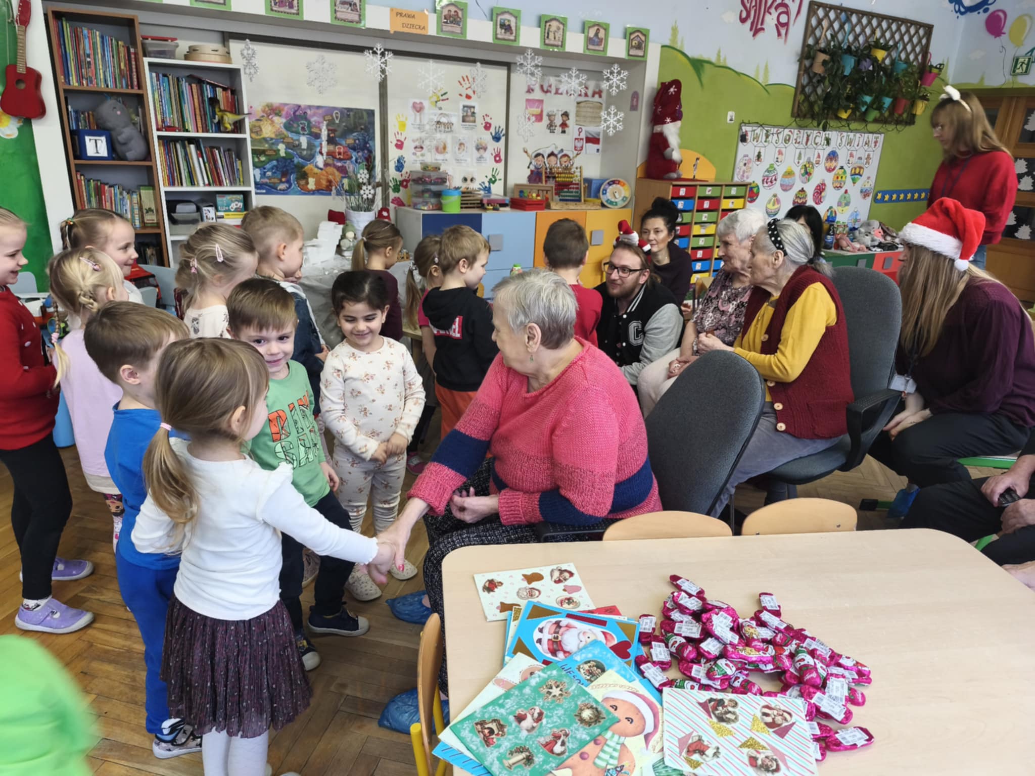 Bycie gospodarzami to bardzo odpowiedzialna funkcja. Taką rolę właśnie dzisiaj pełniliśmy. Pomimo zimna, ze swoimi opiekunami i terapeutami dotarli do nas uśmiechnięci i nie mniej niż my przejęci Podopieczni FelMedu. Przyszli i przyjechali na wózkach, aby podarować nam własnoręcznie wykonane kartki świąteczne z pięknymi życzeniami. Dostaliśmy też czekoladowe bałwanki. My zaprosiliśmy na spotkanie z piosenką i tańcem świątecznym oraz słodki poczęstunek. Są to bardzo miłe i wzruszające chwile. Dla nas piękna lekcja empatii.