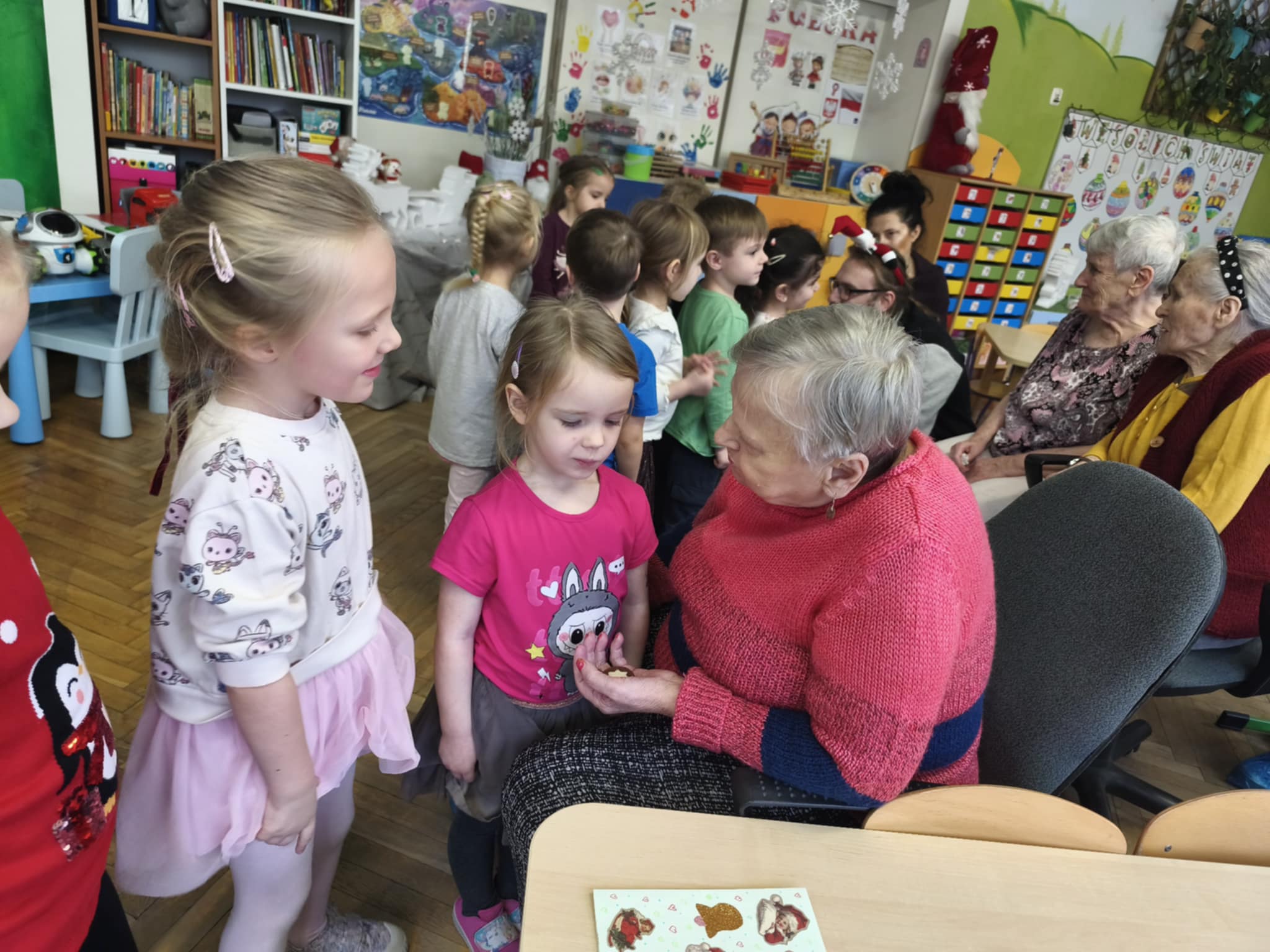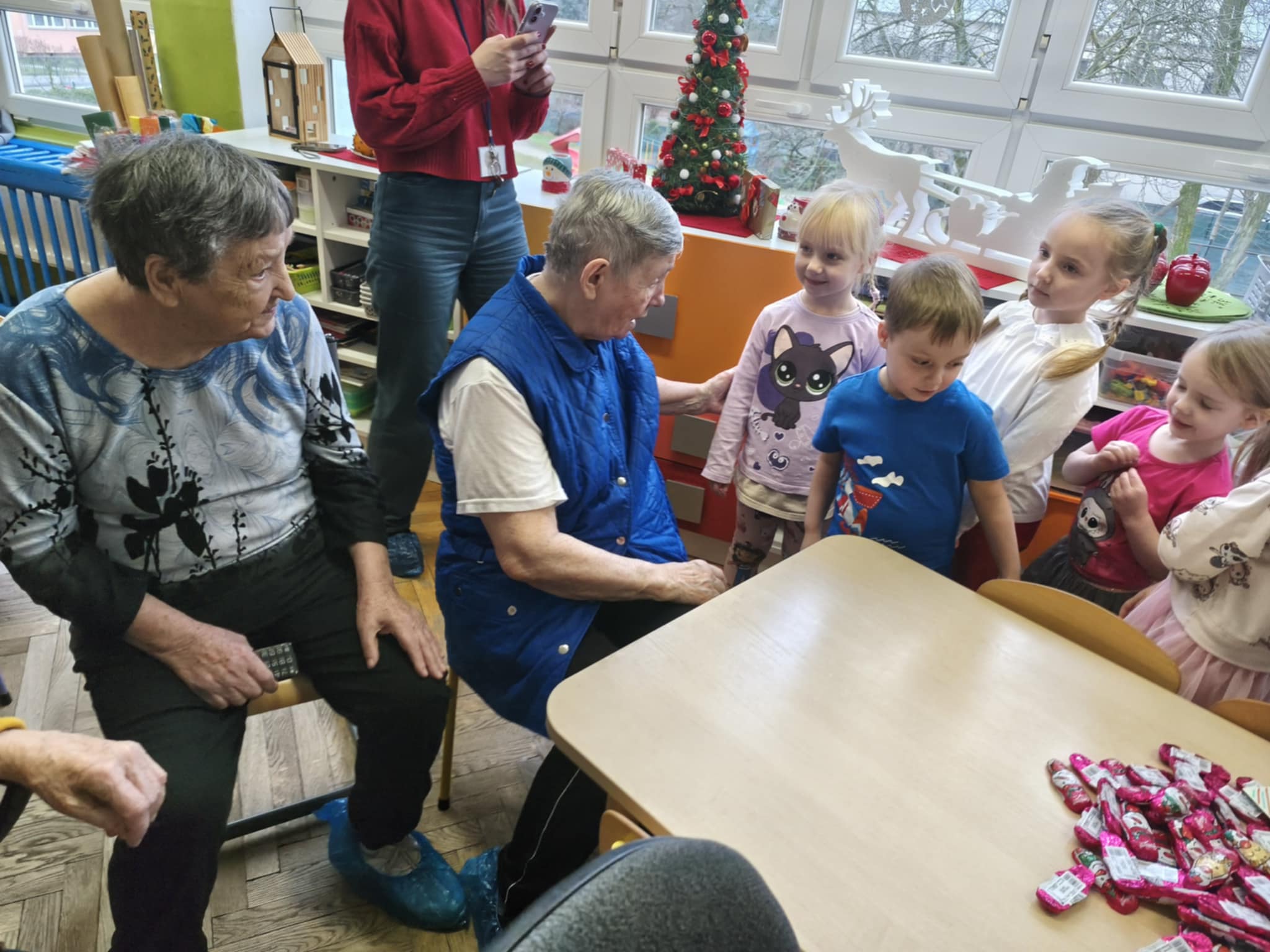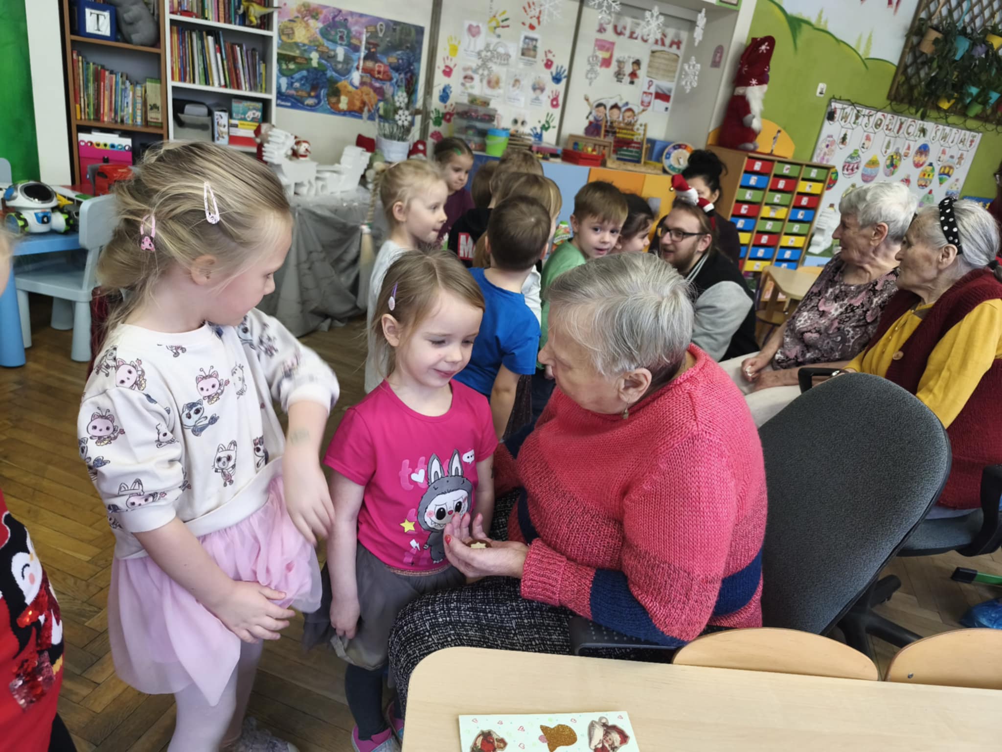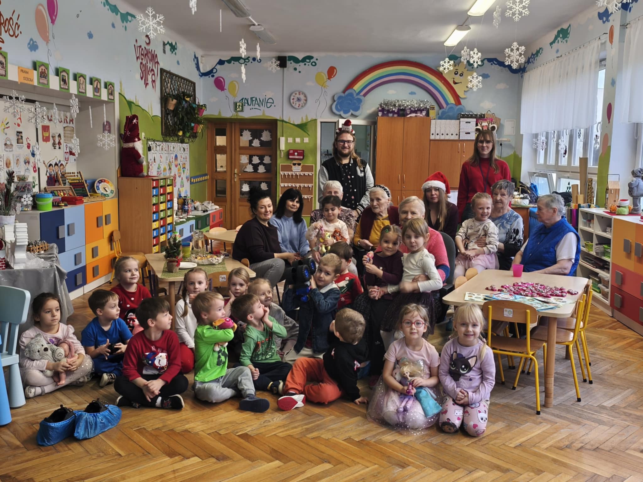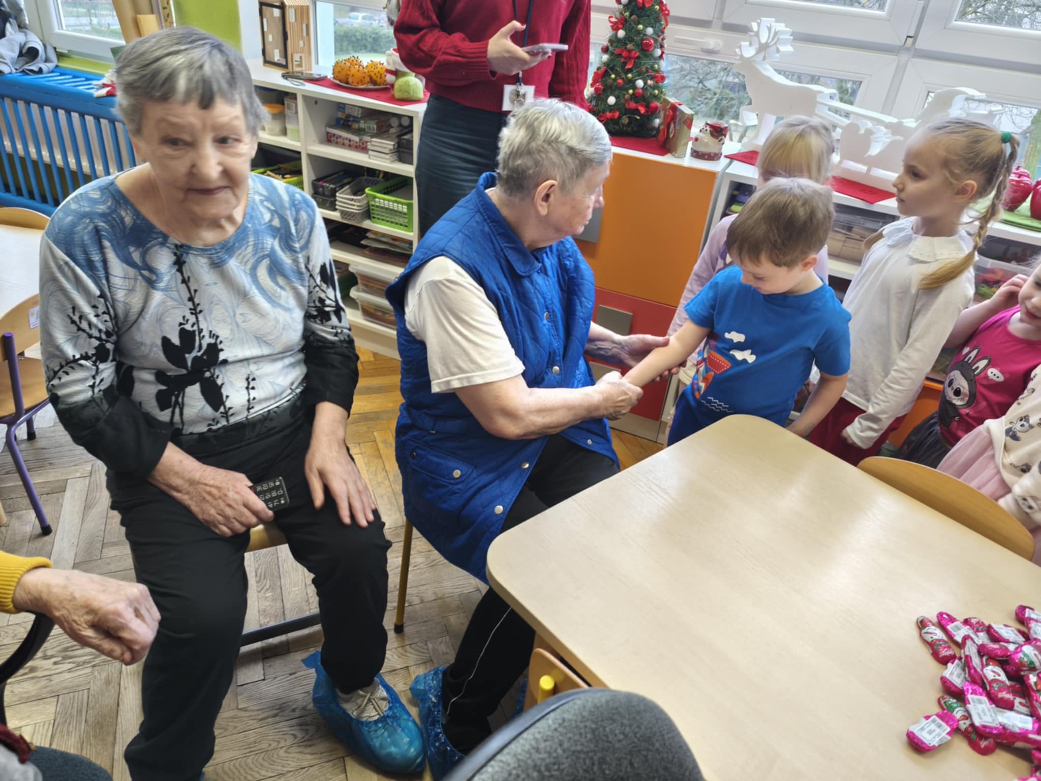 Bycie gospodarzami to bardzo odpowiedzialna funkcja. Taką rolę właśnie dzisiaj pełniliśmy. Pomimo zimna, ze swoimi opiekunami i terapeutami dotarli do nas uśmiechnięci i nie mniej niż my przejęci Podopieczni FelMedu. Przyszli i przyjechali na wózkach, aby podarować nam własnoręcznie wykonane kartki świąteczne z pięknymi życzeniami. Dostaliśmy też czekoladowe bałwanki. My zaprosiliśmy na spotkanie z piosenką i tańcem świątecznym oraz słodki poczęstunek. Są to bardzo miłe i wzruszające chwile. Dla nas piękna lekcja empatii.