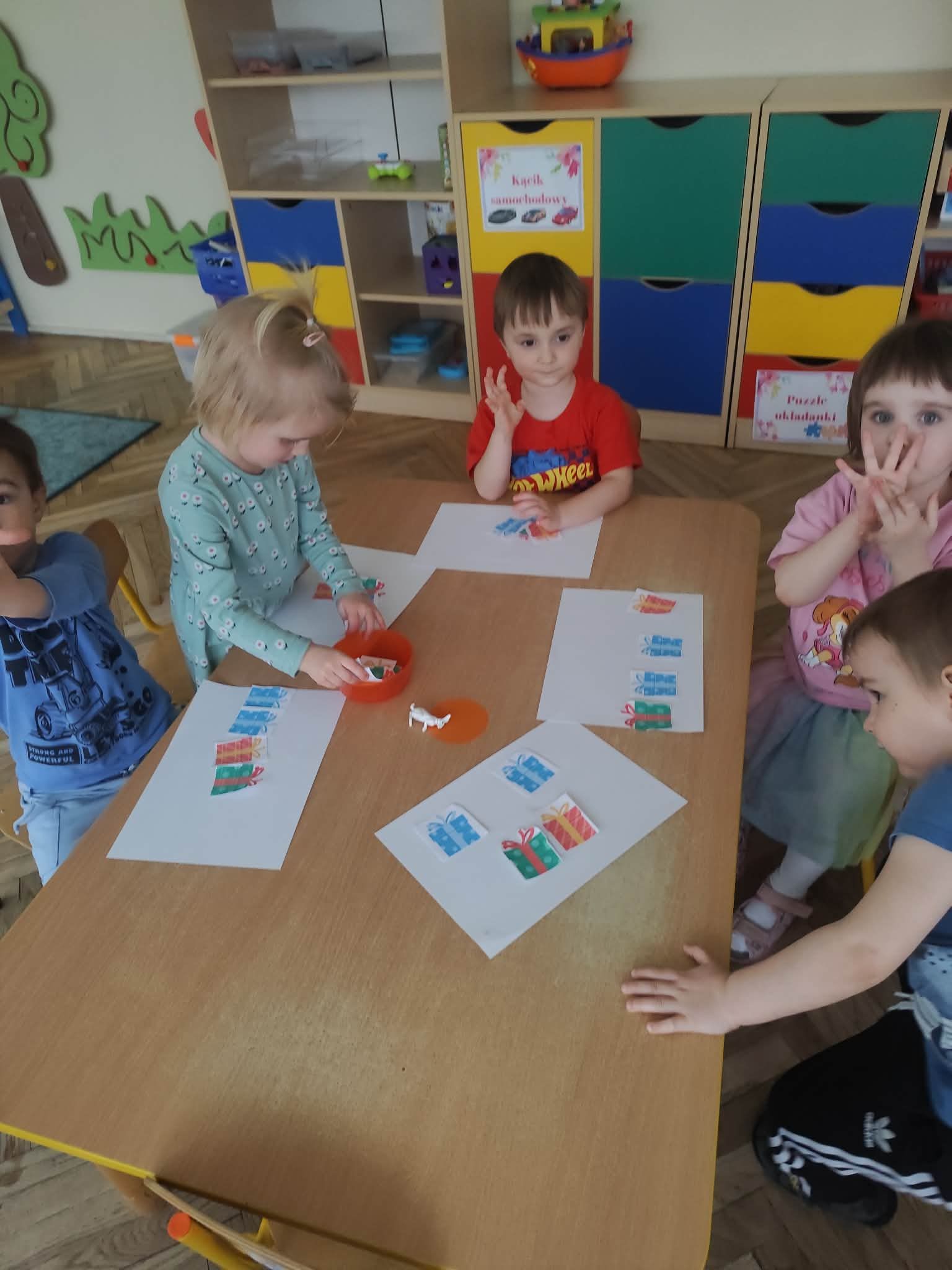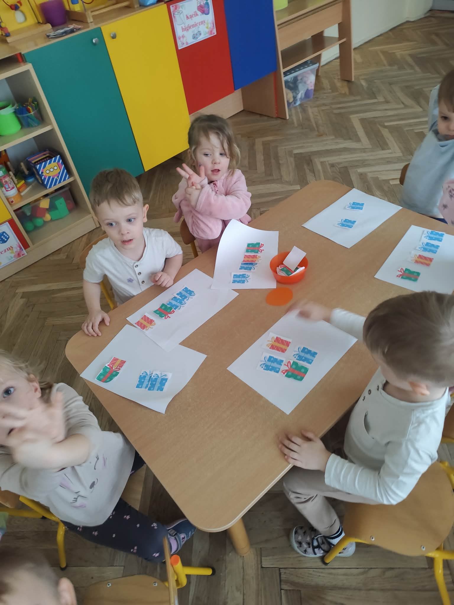 Grupa Kropelek już zaczyna uczyć się podstawowych zagadnień matematycznych: segregowanie według danej cechy, określanie "większy", "mniejszy", "najmniejszy", przeliczanie przedmiotów w zakresie dostępnym dzieciom oraz podejmowanie pierwszych prób określania prawej i lewej strony oraz góry/dołu kartki. Niebawem polecenie ułożenia bądź wskazania czegoś "od lewej do prawej" już nikomu nie sprawi kłopotu. To przygotowanie do nauki pisania i czytania.