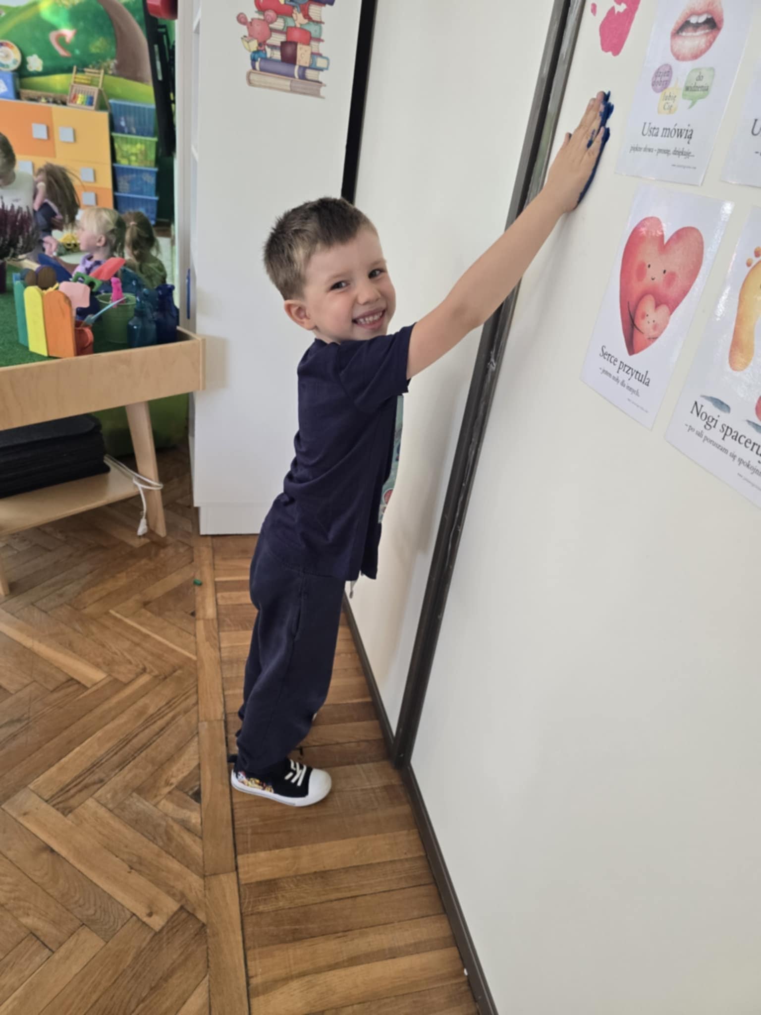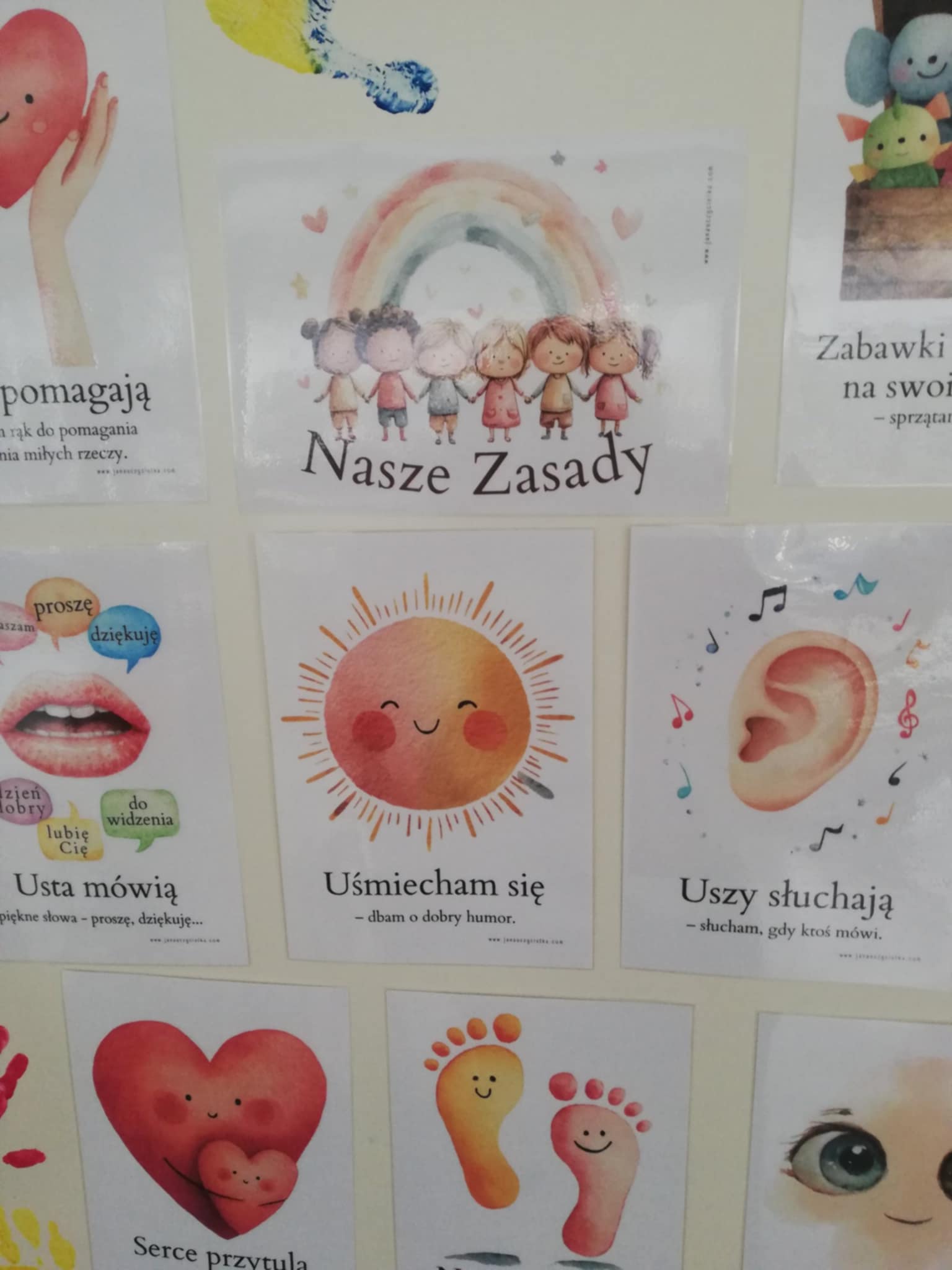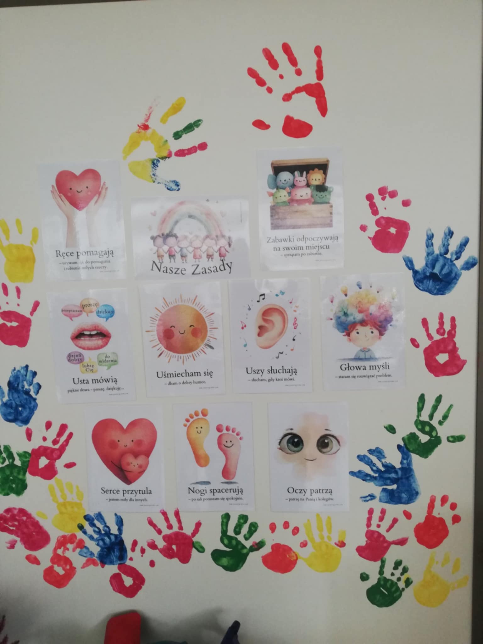 Żeby dobrze funkcjonować, potrzebne są zasady i ich respektowanie. Zaczynamy i my... W naszej grupie powstał kącik, w którym umieszczone zostały zasady. Próbowaliśmy odczytać symbole i co one oznaczają. Każde dziecko na znak zgody stosowania się do zasad odbiło swoją rączkę.