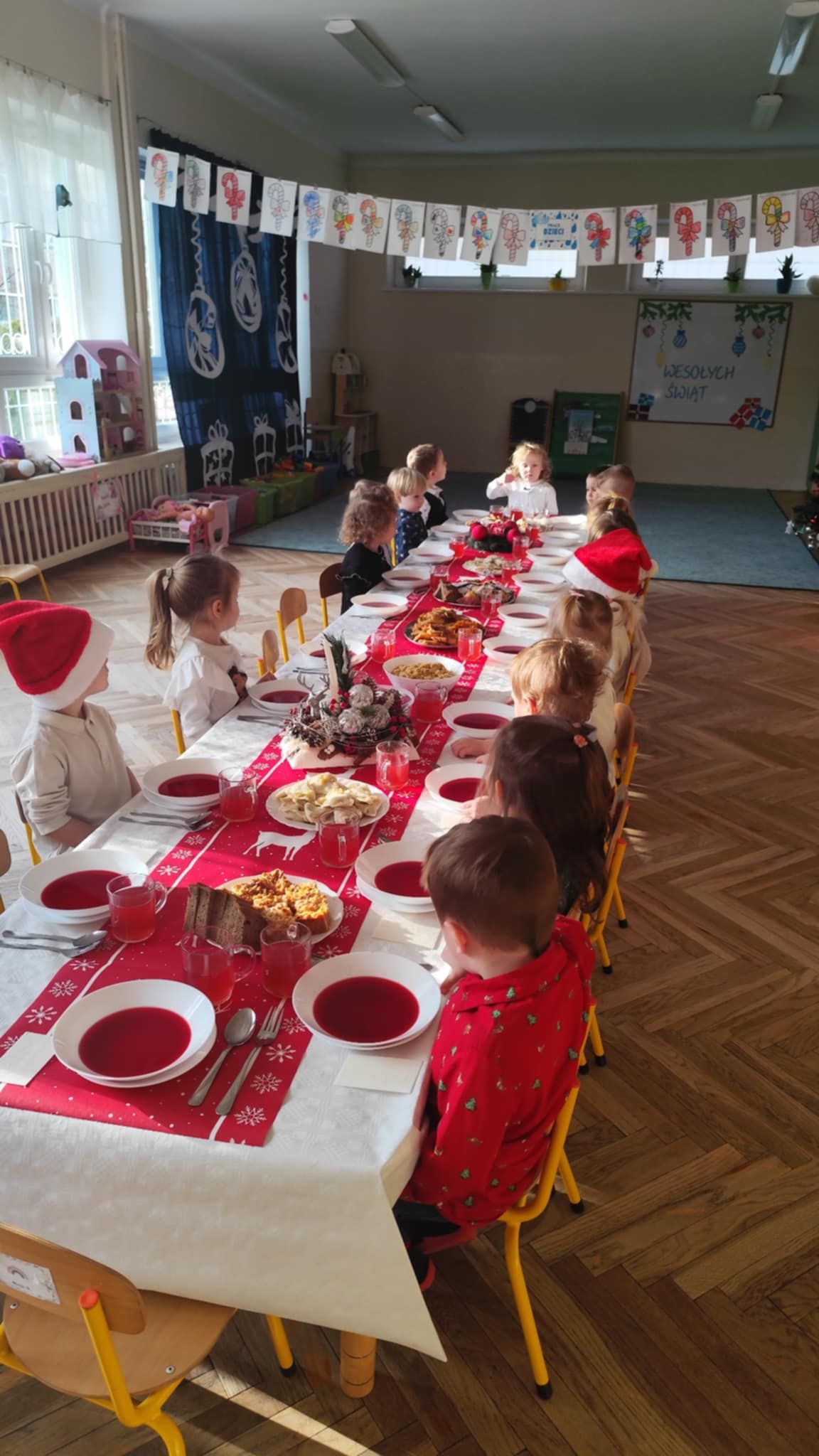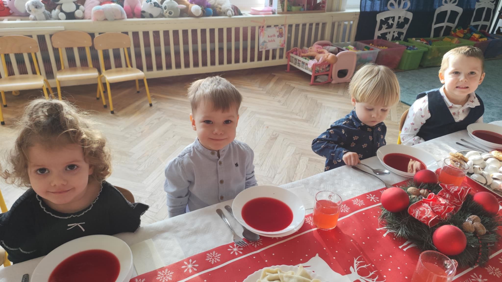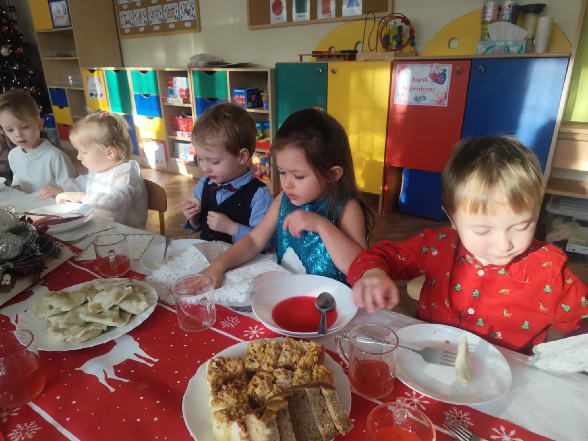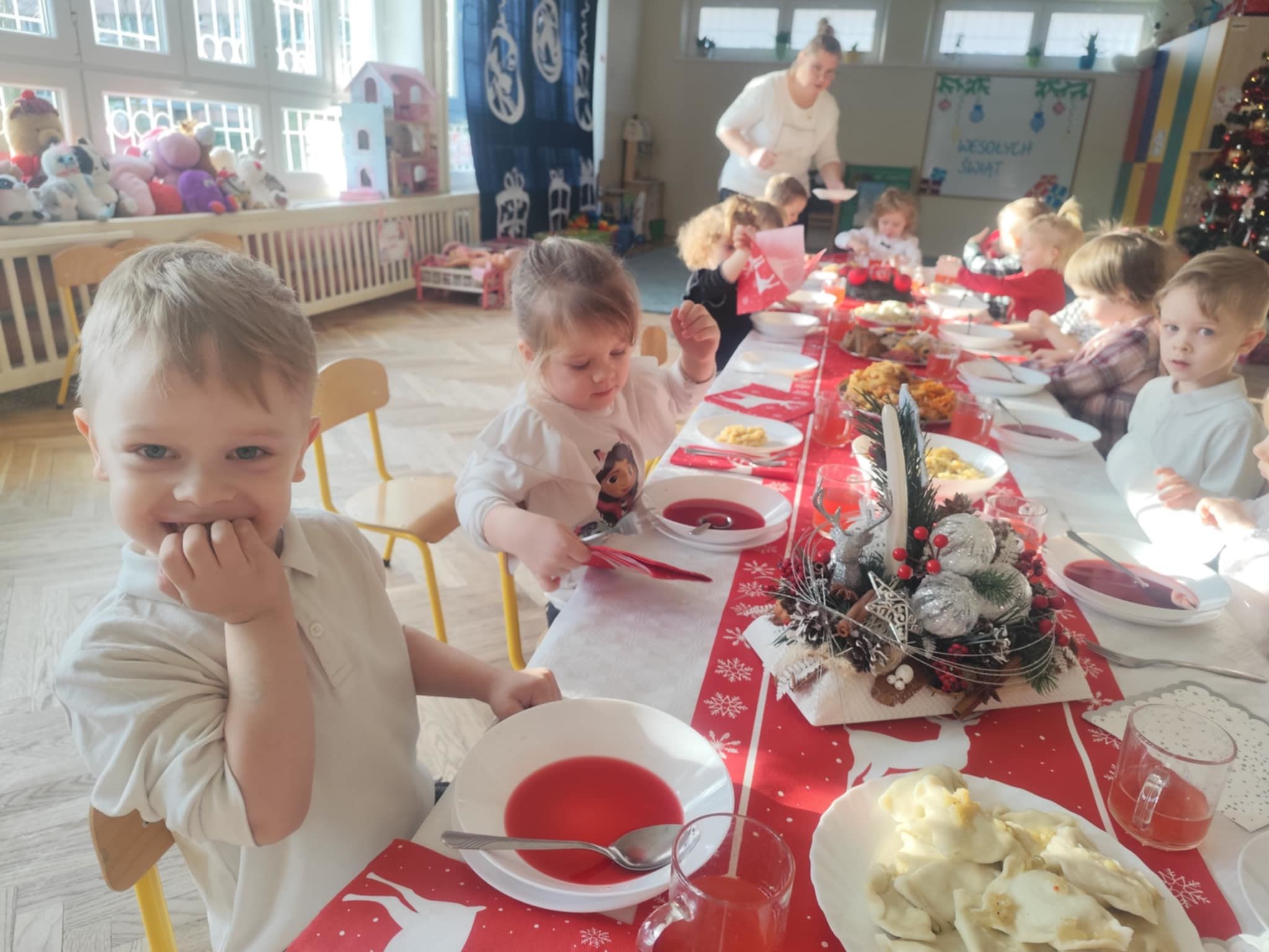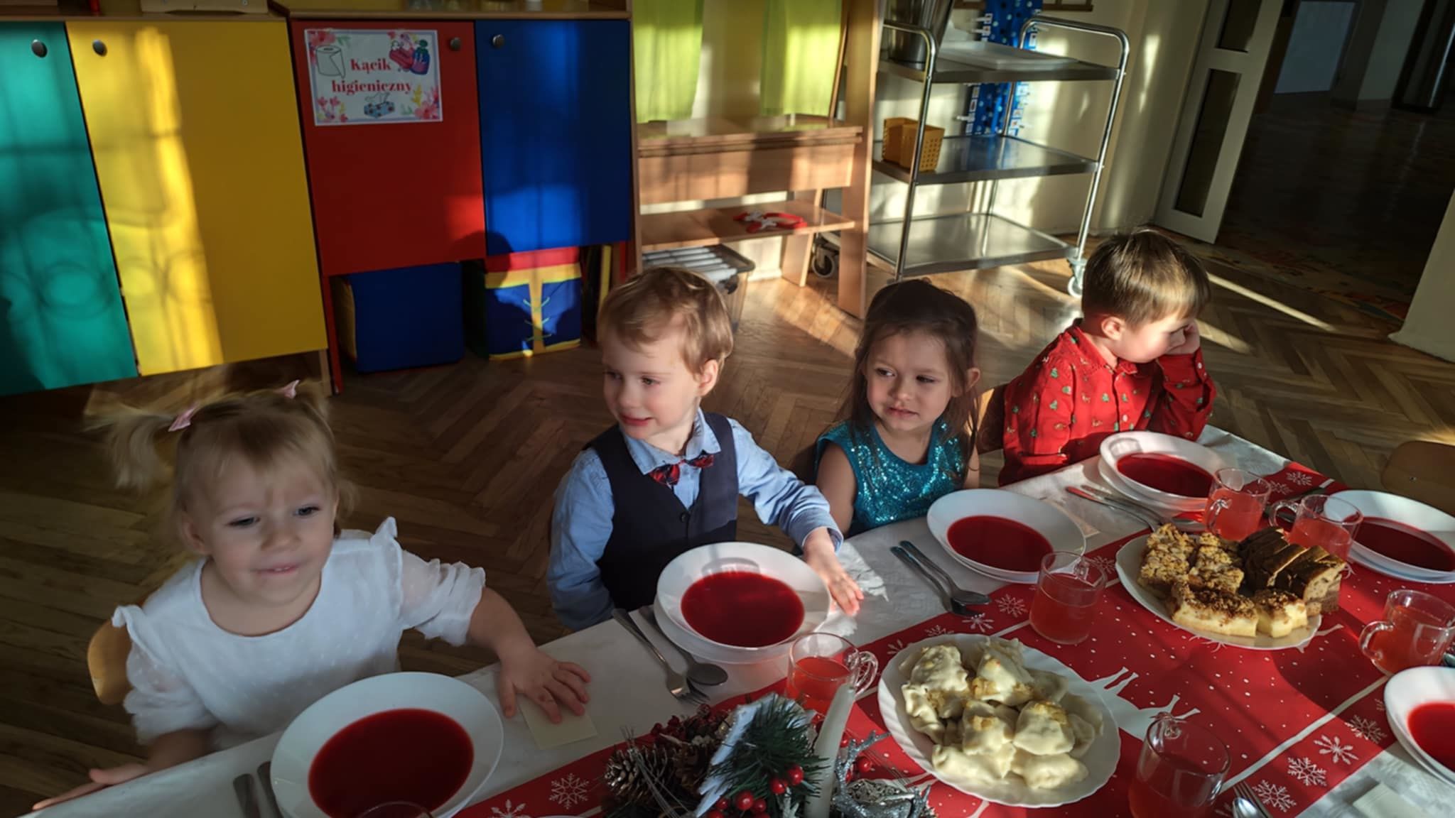 Wigilia Grupowa to już tradycja naszego Przedszkola Miejskiego nr 107. Uroczyście ubrane dzieci miały okazję uczestniczyć w Obiedzie Świątecznym. Pani Dyrektor Małgorzata Augustyniak wraz z ks. Łukaszem Tarnowskim złożyli wszystkim życzenia świąteczne i podzielili się opłatkiem. W tle słychać było instrumentalną wersję pięknych, wzruszających kolęd, dzieci kosztowały potraw wigilijnych, a święty Mikołaj niezauważony zakradł się pod choinkę i wrzucił upominek. Prezent okazał się dla wszystkich dzieci z grupy I, więc wspólnymi siłami otworzyły go i dokładnie obejrzały. Otrzymaliśmy silikonowe rzutki! Po przerwie świąteczno-noworocznej dzieci będą ćwiczył celność, cierpliwość w oczekiwaniu na swoją kolej oraz naprzemienność w zabawach. Dziękujemy za prezent Święty Mikołaju!