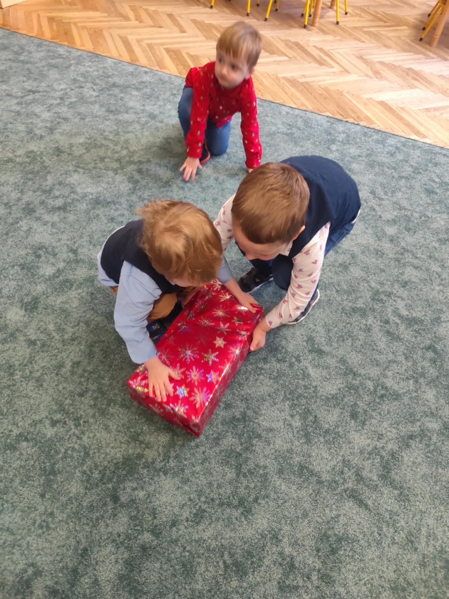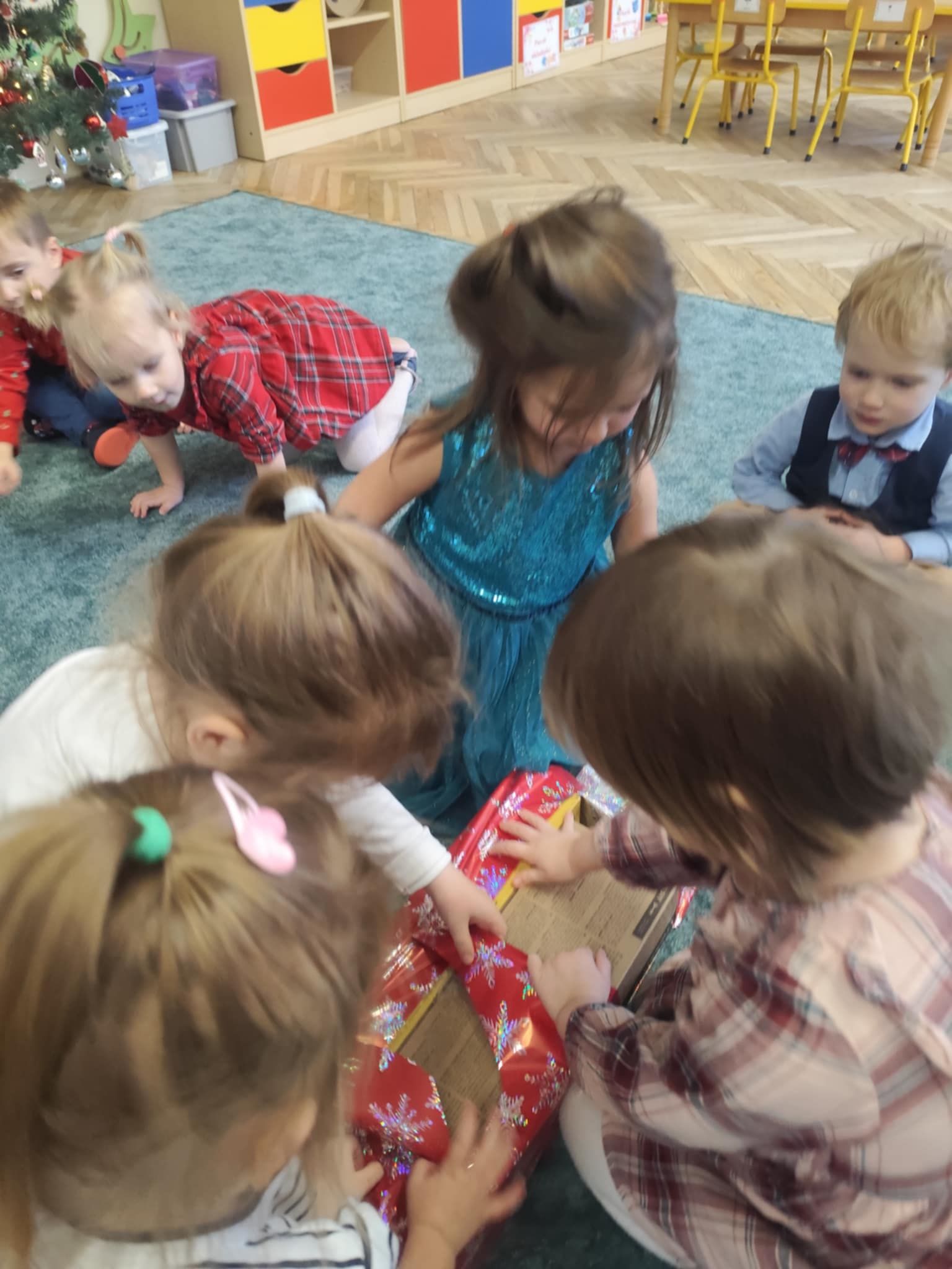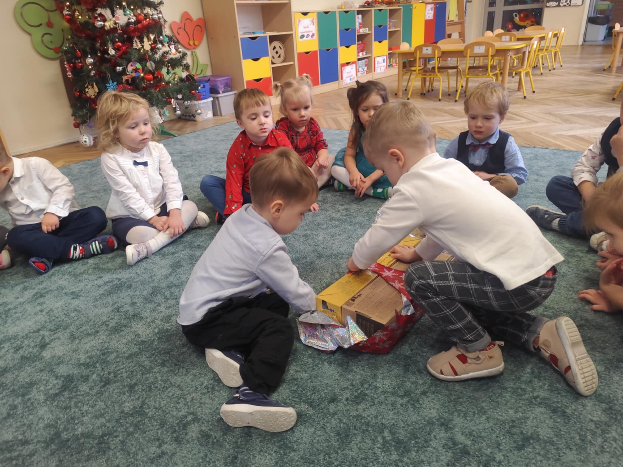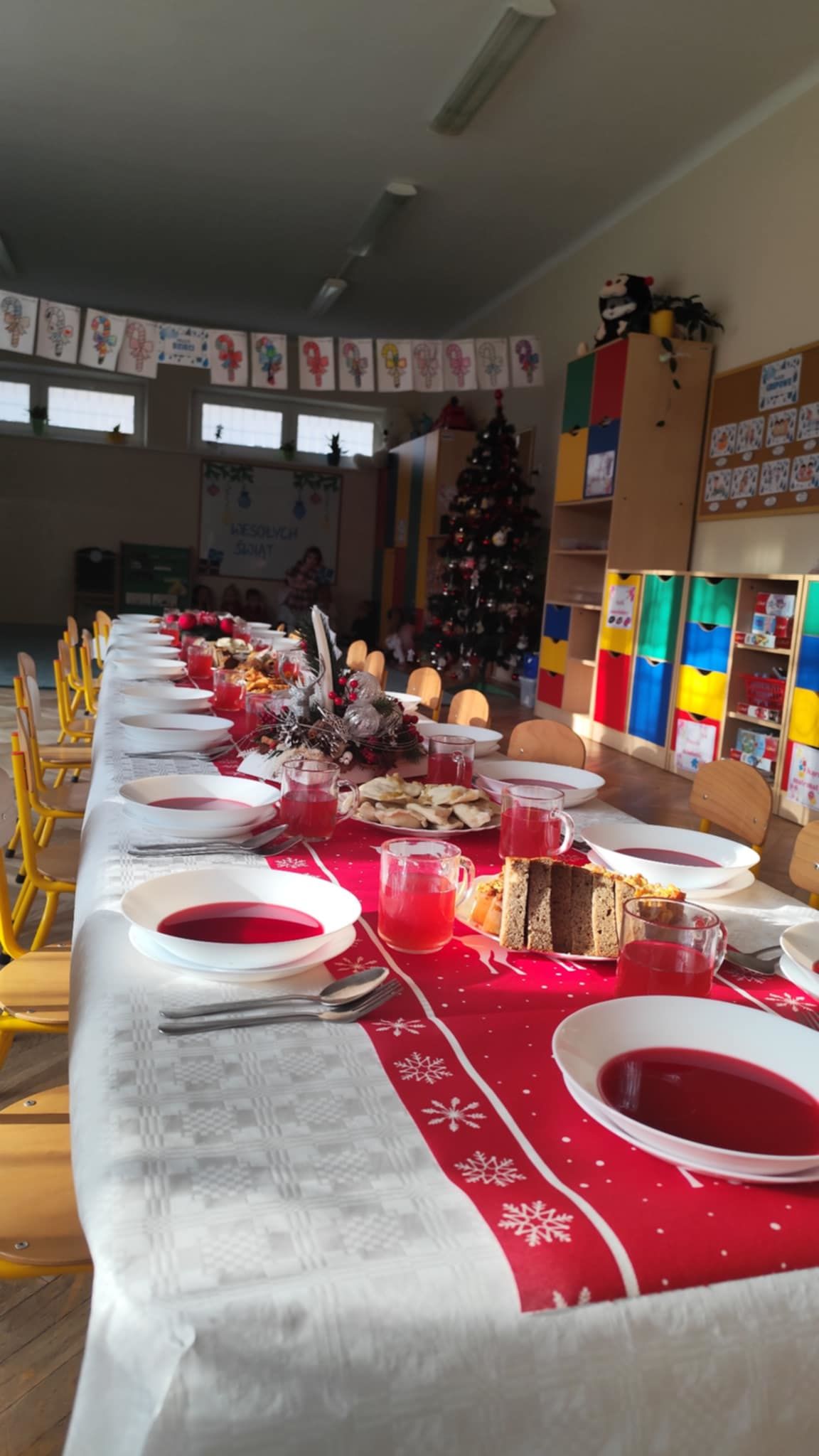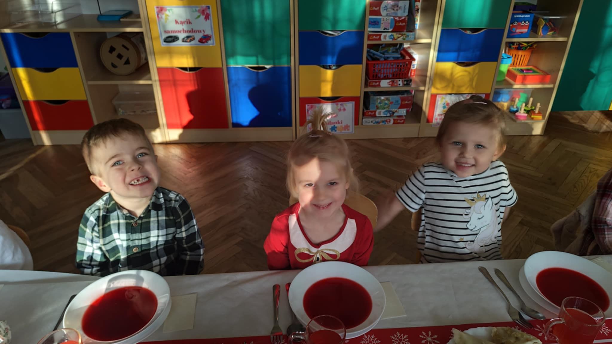 Wigilia Grupowa to już tradycja naszego Przedszkola Miejskiego nr 107. Uroczyście ubrane dzieci miały okazję uczestniczyć w Obiedzie Świątecznym. Pani Dyrektor Małgorzata Augustyniak wraz z ks. Łukaszem Tarnowskim złożyli wszystkim życzenia świąteczne i podzielili się opłatkiem. W tle słychać było instrumentalną wersję pięknych, wzruszających kolęd, dzieci kosztowały potraw wigilijnych, a święty Mikołaj niezauważony zakradł się pod choinkę i wrzucił upominek. Prezent okazał się dla wszystkich dzieci z grupy I, więc wspólnymi siłami otworzyły go i dokładnie obejrzały. Otrzymaliśmy silikonowe rzutki! Po przerwie świąteczno-noworocznej dzieci będą ćwiczył celność, cierpliwość w oczekiwaniu na swoją kolej oraz naprzemienność w zabawach. Dziękujemy za prezent Święty Mikołaju!