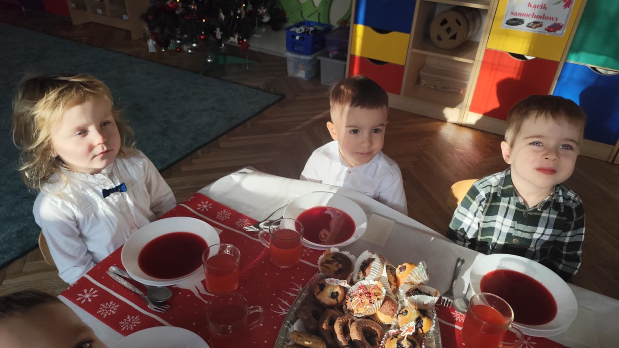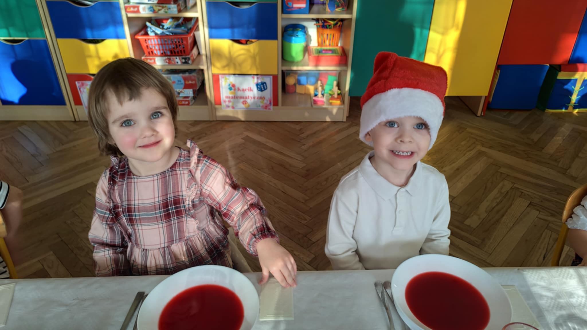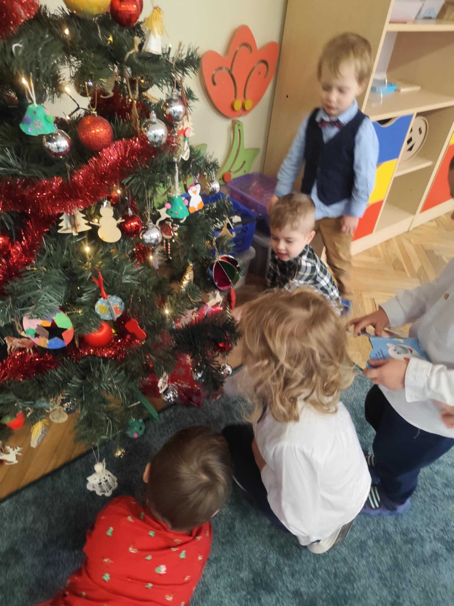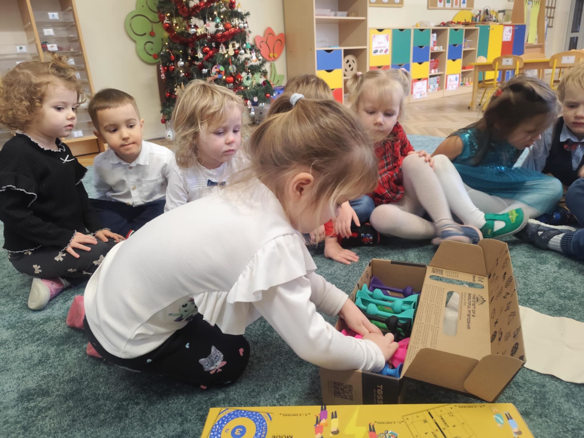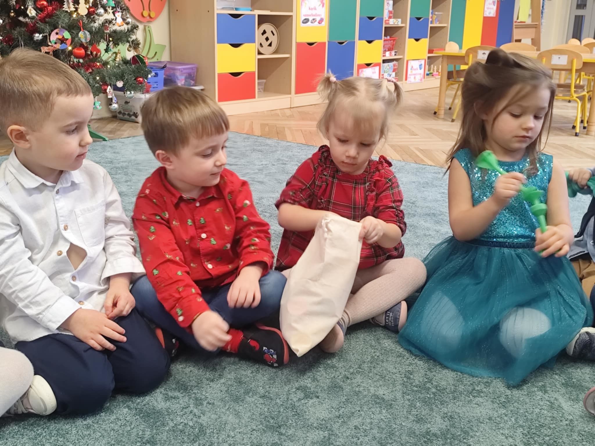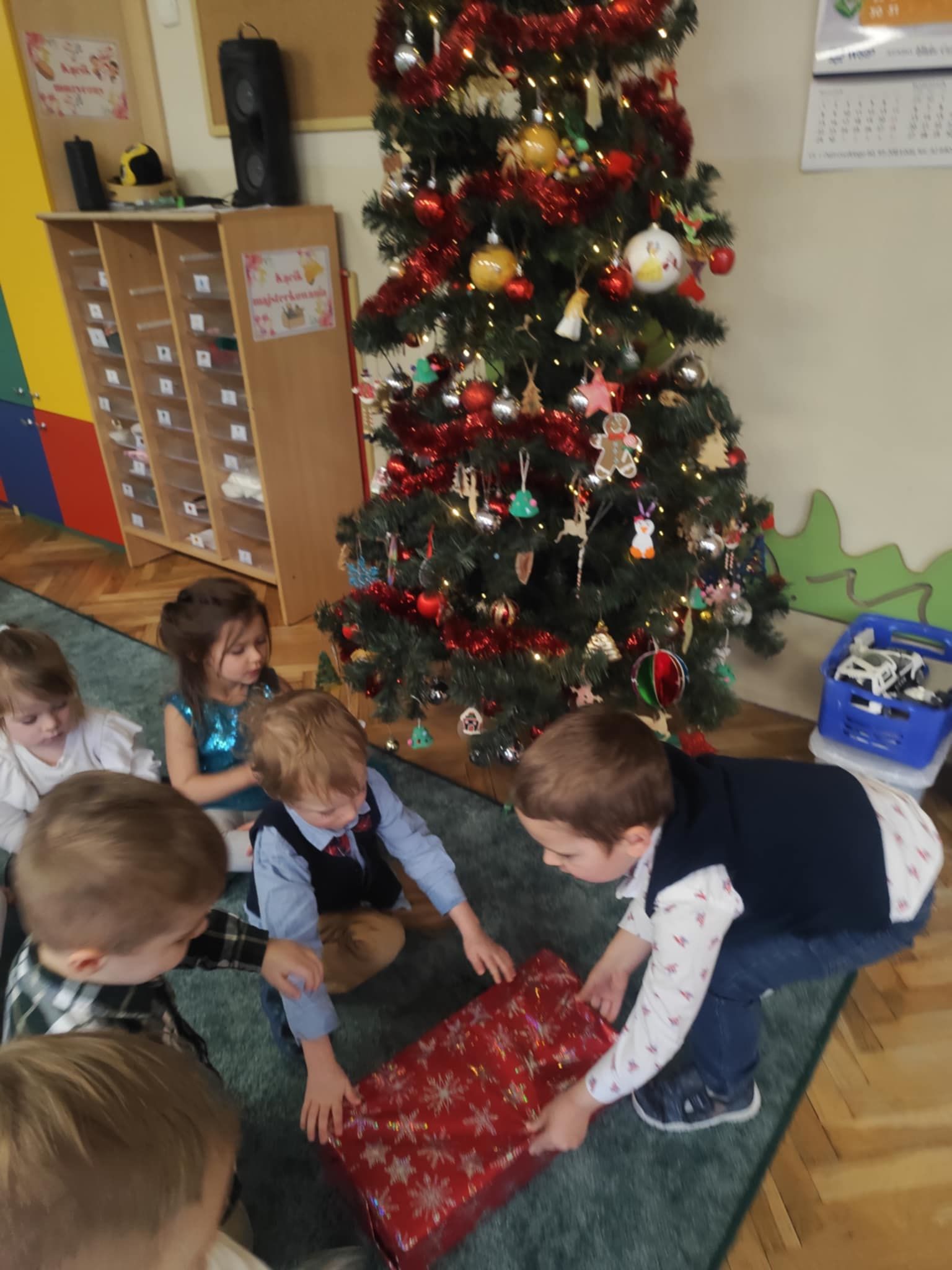 Wigilia Grupowa to już tradycja naszego Przedszkola Miejskiego nr 107. Uroczyście ubrane dzieci miały okazję uczestniczyć w Obiedzie Świątecznym. Pani Dyrektor Małgorzata Augustyniak wraz z ks. Łukaszem Tarnowskim złożyli wszystkim życzenia świąteczne i podzielili się opłatkiem. W tle słychać było instrumentalną wersję pięknych, wzruszających kolęd, dzieci kosztowały potraw wigilijnych, a święty Mikołaj niezauważony zakradł się pod choinkę i wrzucił upominek. Prezent okazał się dla wszystkich dzieci z grupy I, więc wspólnymi siłami otworzyły go i dokładnie obejrzały. Otrzymaliśmy silikonowe rzutki! Po przerwie świąteczno-noworocznej dzieci będą ćwiczył celność, cierpliwość w oczekiwaniu na swoją kolej oraz naprzemienność w zabawach. Dziękujemy za prezent Święty Mikołaju!
