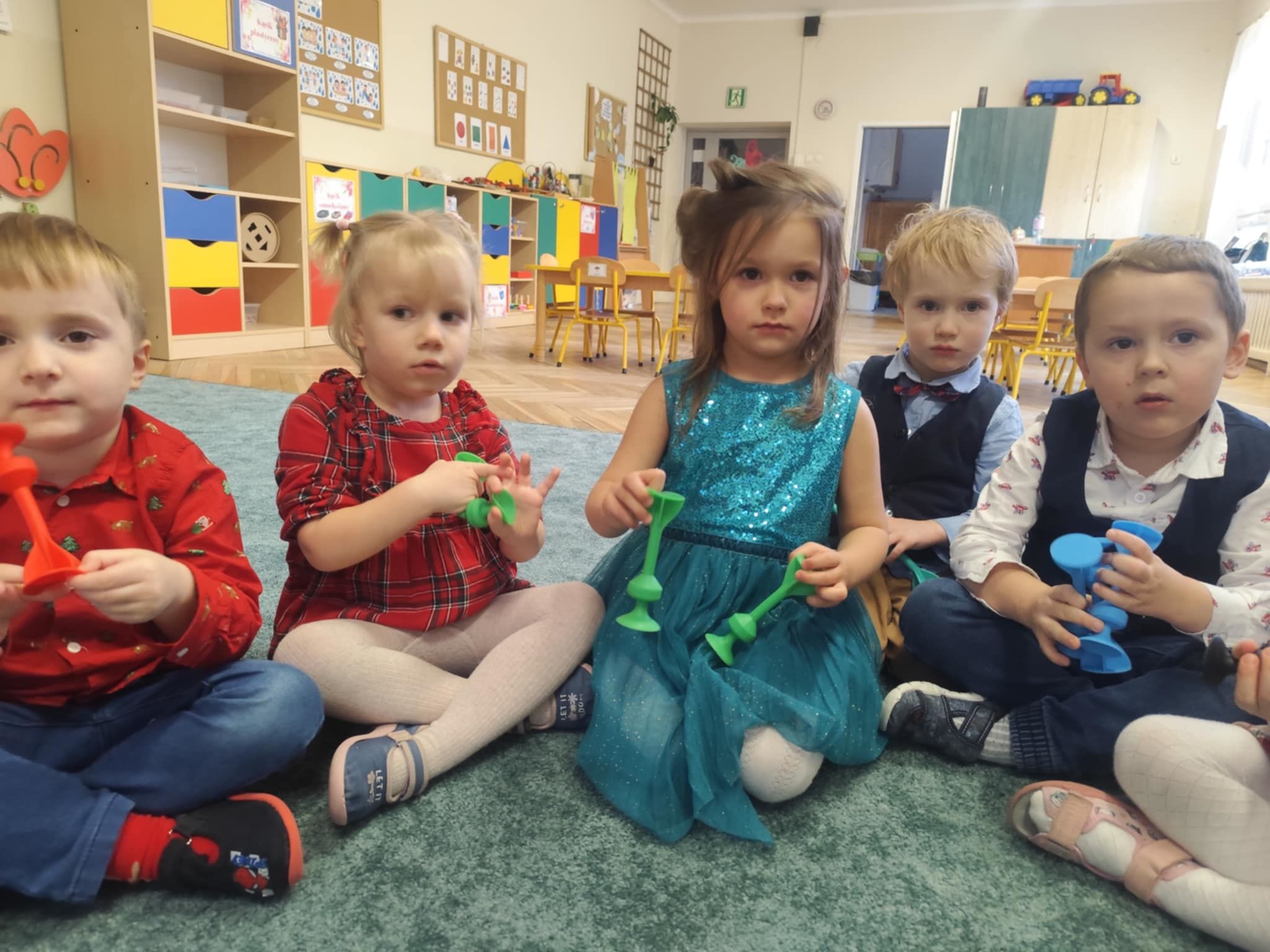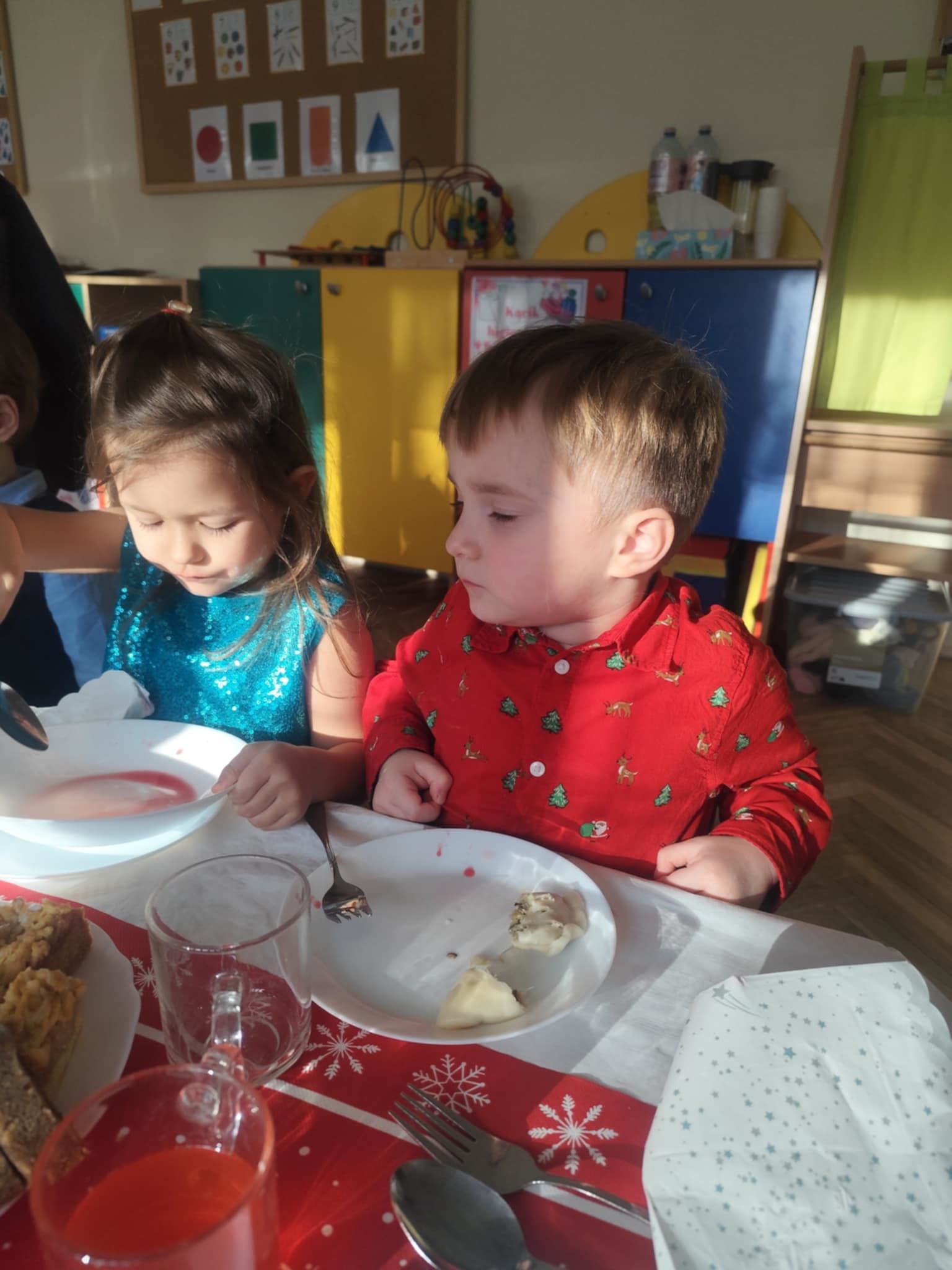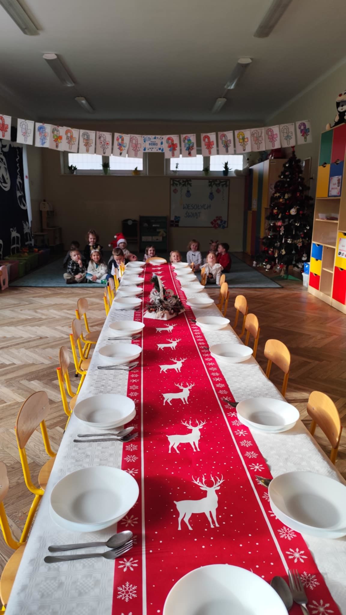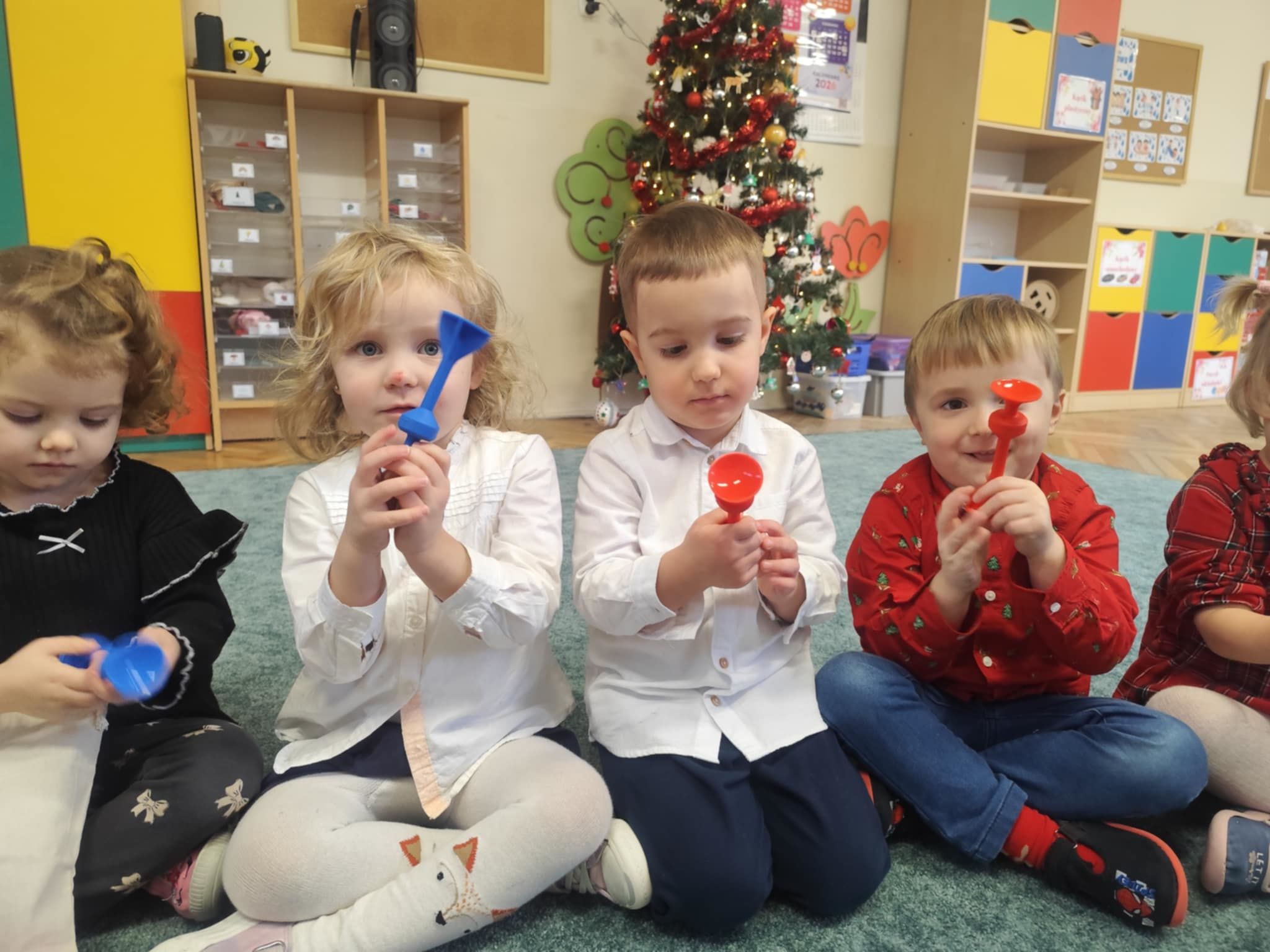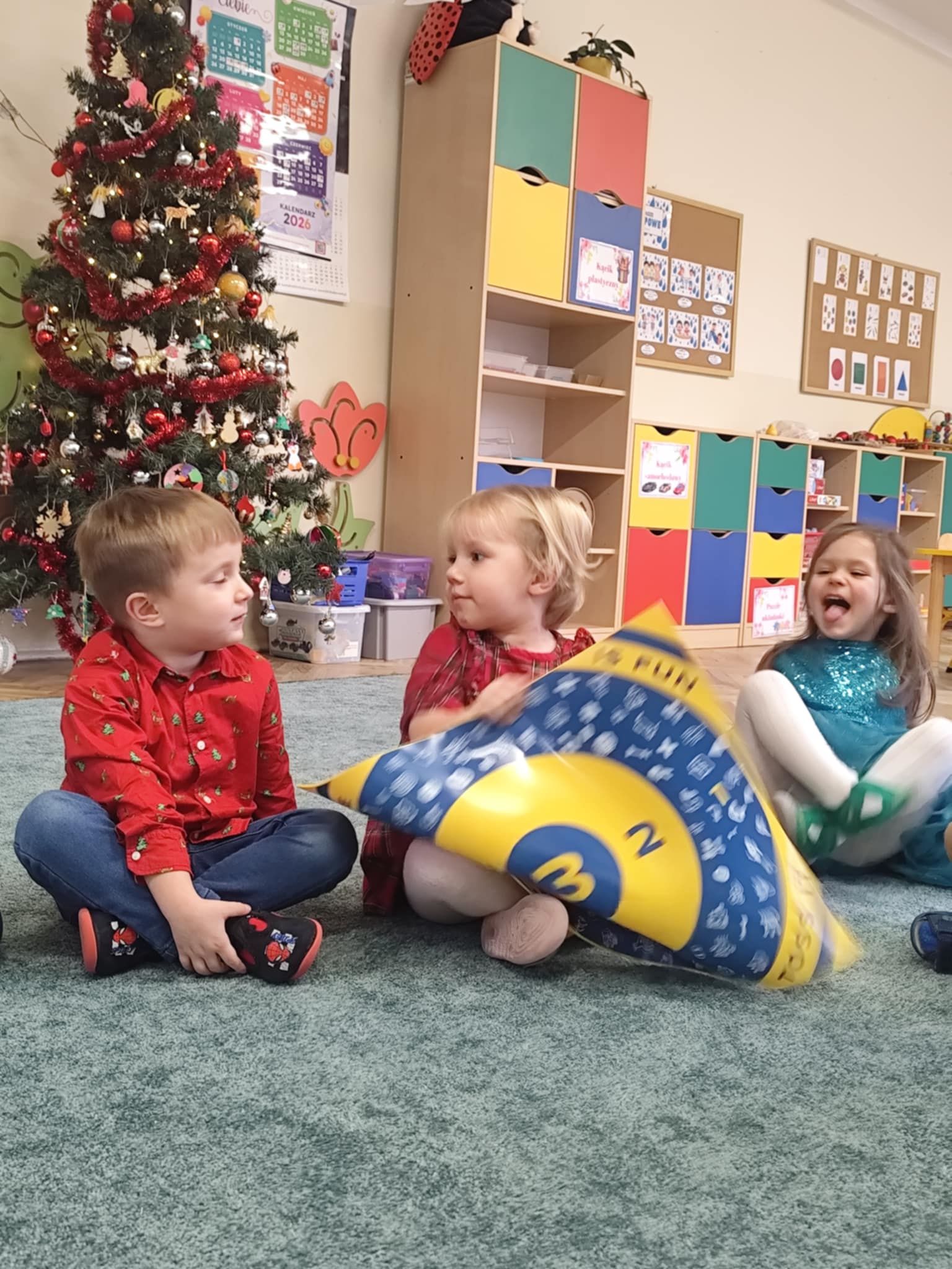 Wigilia Grupowa to już tradycja naszego Przedszkola Miejskiego nr 107. Uroczyście ubrane dzieci miały okazję uczestniczyć w Obiedzie Świątecznym. Pani Dyrektor Małgorzata Augustyniak wraz z ks. Łukaszem Tarnowskim złożyli wszystkim życzenia świąteczne i podzielili się opłatkiem. W tle słychać było instrumentalną wersję pięknych, wzruszających kolęd, dzieci kosztowały potraw wigilijnych, a święty Mikołaj niezauważony zakradł się pod choinkę i wrzucił upominek. Prezent okazał się dla wszystkich dzieci z grupy I, więc wspólnymi siłami otworzyły go i dokładnie obejrzały. Otrzymaliśmy silikonowe rzutki! Po przerwie świąteczno-noworocznej dzieci będą ćwiczył celność, cierpliwość w oczekiwaniu na swoją kolej oraz naprzemienność w zabawach. Dziękujemy za prezent Święty Mikołaju!