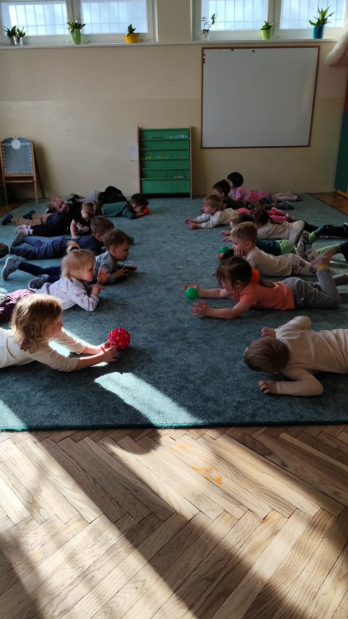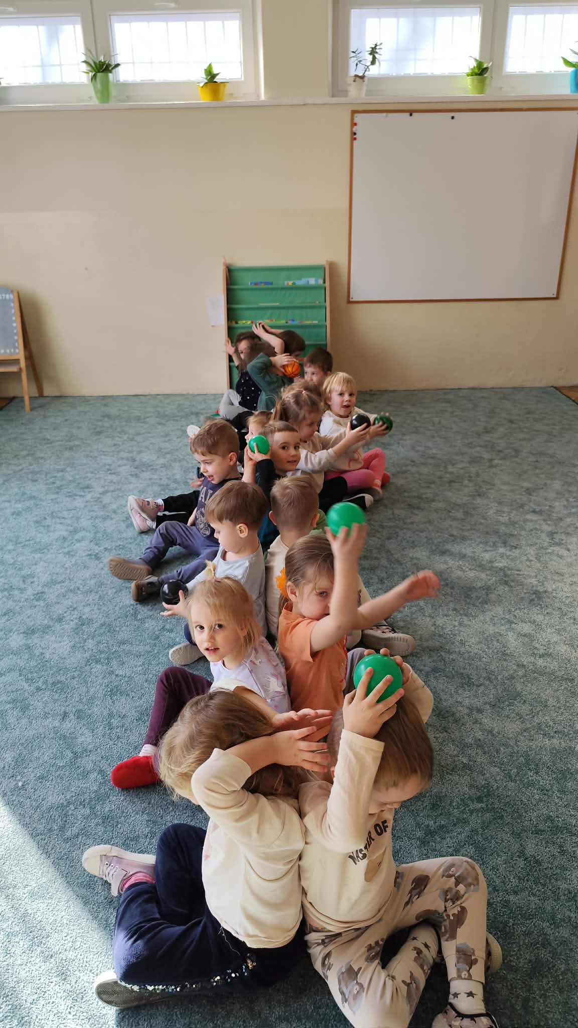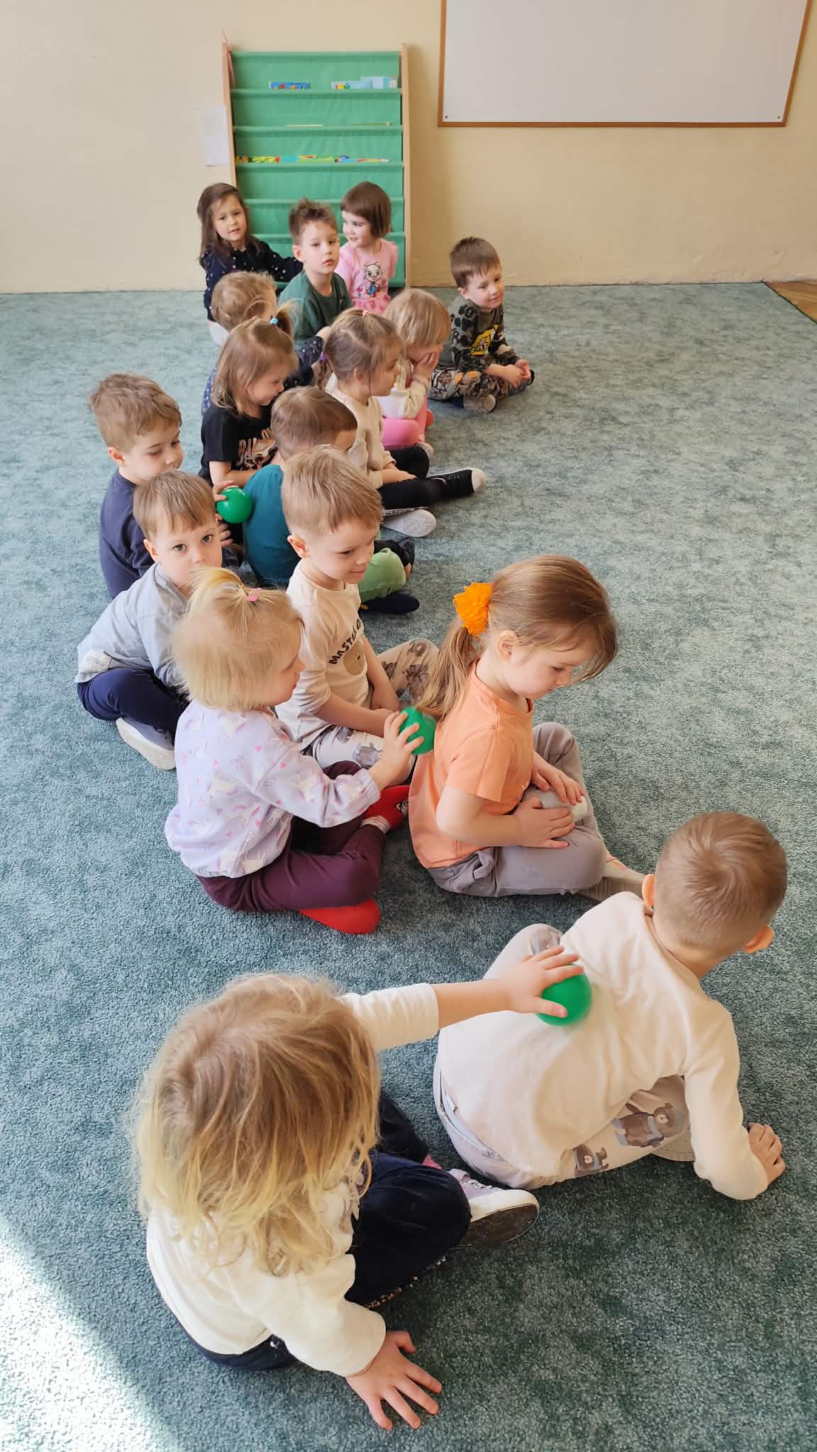 Grupa Kropelek popołudnia spędza równie aktywnie co poranki. Tym razem ćwiczyliśmy koordynację ruchową oraz współpracę w parach, wykorzystując piłeczki. Zabawy z piłką w parach to świetny sposób na aktywne spędzenie czasu oraz przemycenie ćwiczeń gimnastycznych w formie zabawy. W atmosferze pełnej radości i śmiechu wykonaliśmy ćwiczenia rozciągające mięśnie brzucha, ćwiczyliśmy utrzymanie poprawnej postawy ciała w siadzie skrzyżnym, a na zakończenie wykonaliśmy relaksujące masaże pleców. Wszystkie obecne Kropelki były zachwycone i świetnie się bawiły.