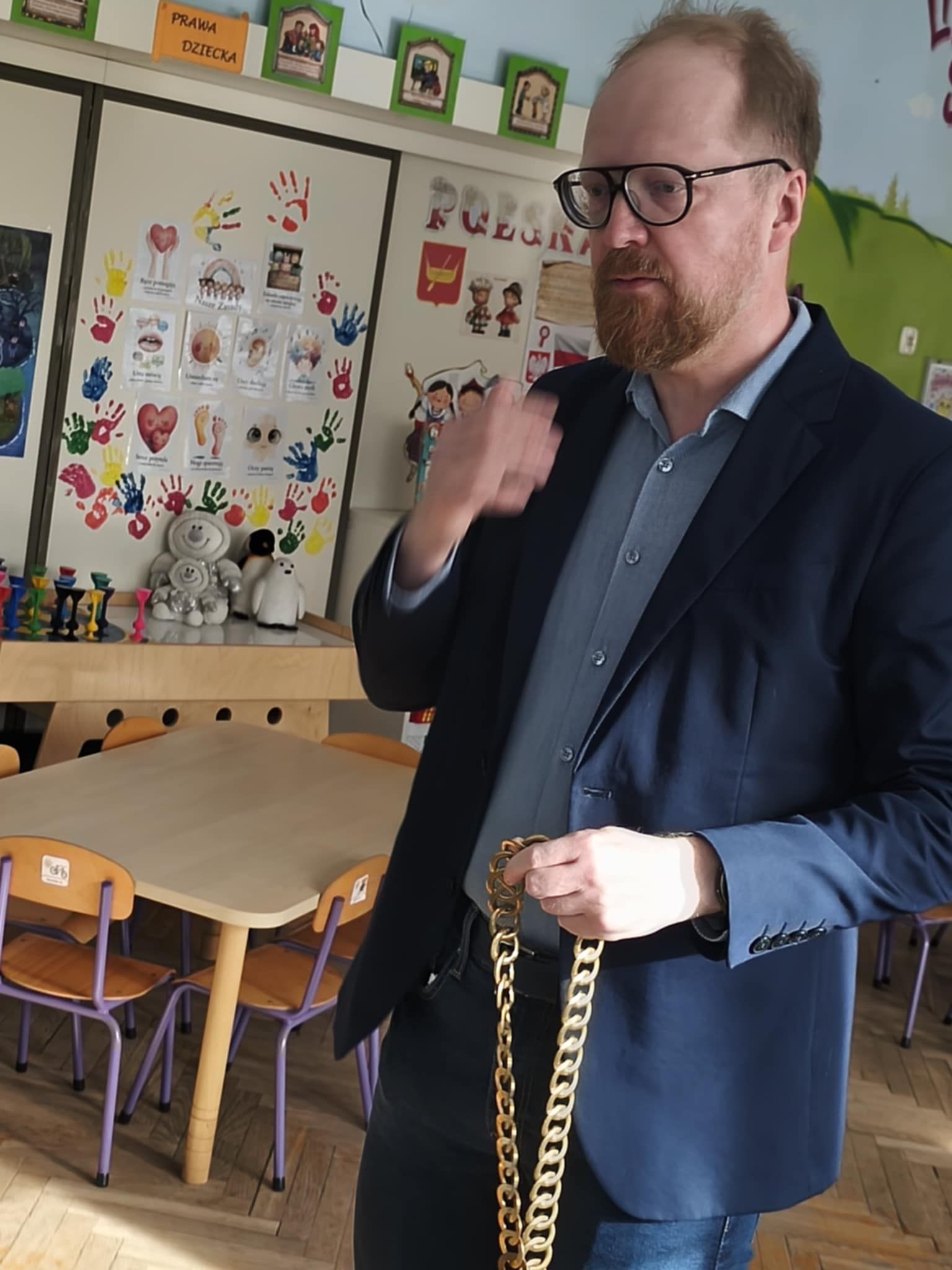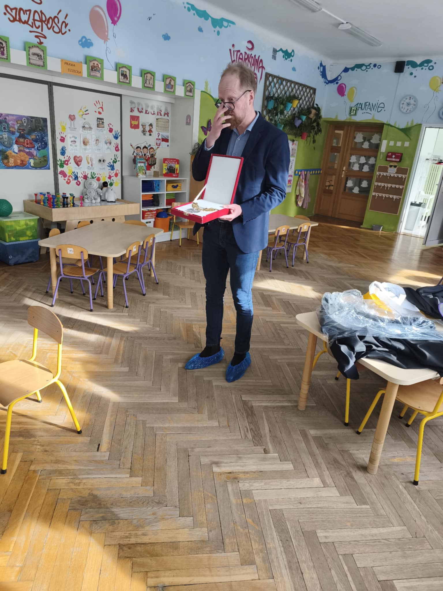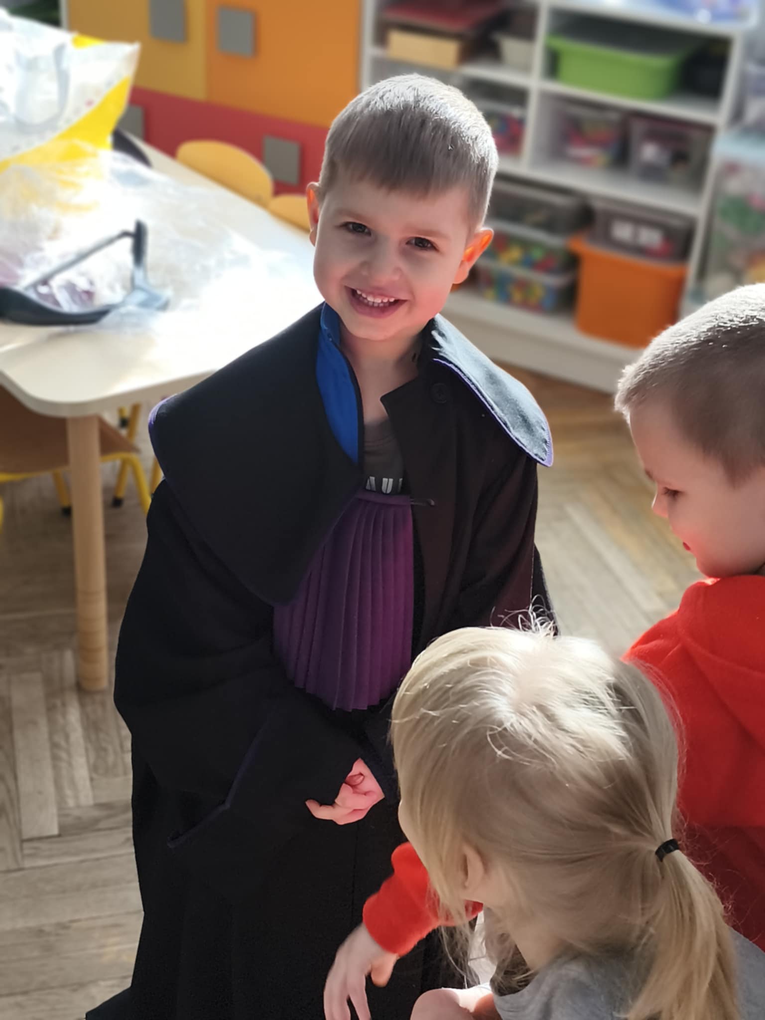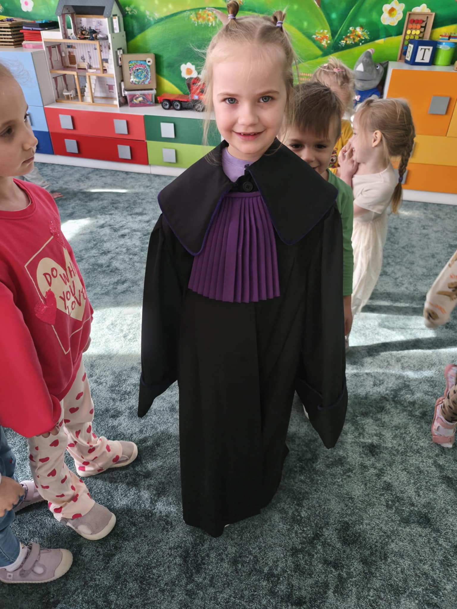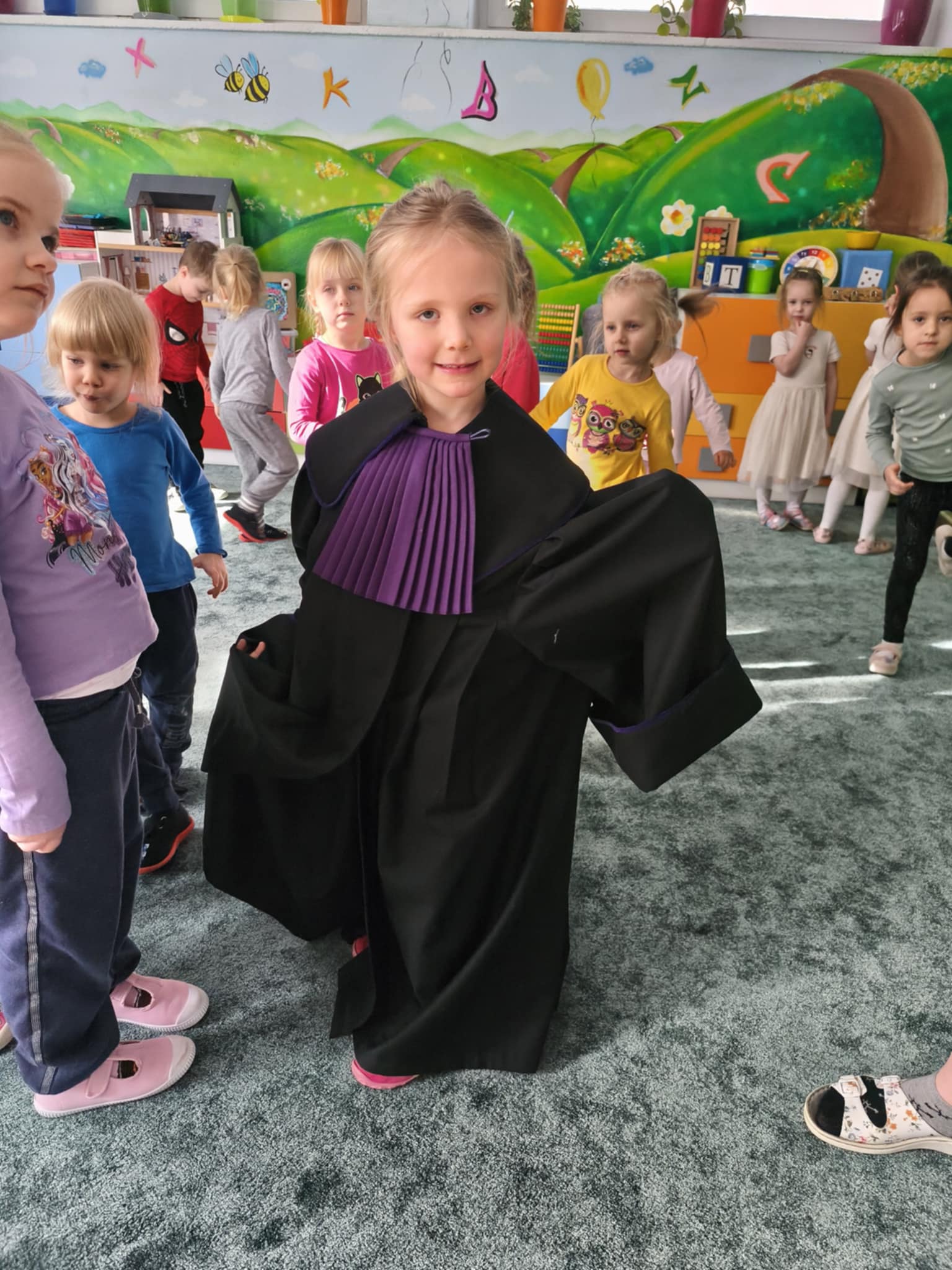 Z cyklu "Poznajemy zawody"-dzisiaj gościł u nas tata Julii. Poznaliśmy zawód sędziego. Tata Julii opowiedział nam o swojej bardzo odpowiedzialnej pracy. O tym, że należy respektować przyjęte zasady i normy oraz konsekwencjach ich nieprzestrzegania. Rozmawialiśmy o tym z poziomu dziecka i osoby dorosłej. Mieliśmy możliwość porównania togi adwokackiej i togi sędziego. Obie są czarne ale mają inny kolor żabotu i lamówek. Aha i bardzo ważna rzecz- sędzia ma łańcuch z orłem w koronie, który nakłada na togę. Symbolizuje on powagę, godność i sprawiedliwość . To było bardzo pouczające spotkanie. Dziękujemy za poświęcony czas.