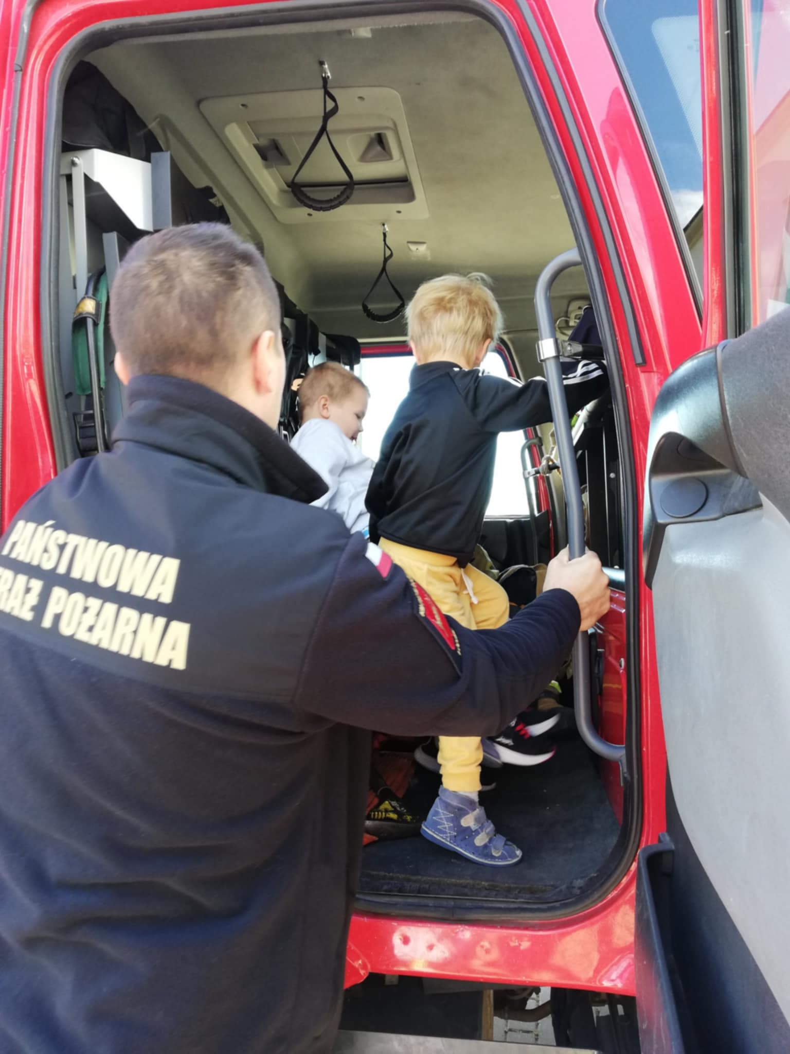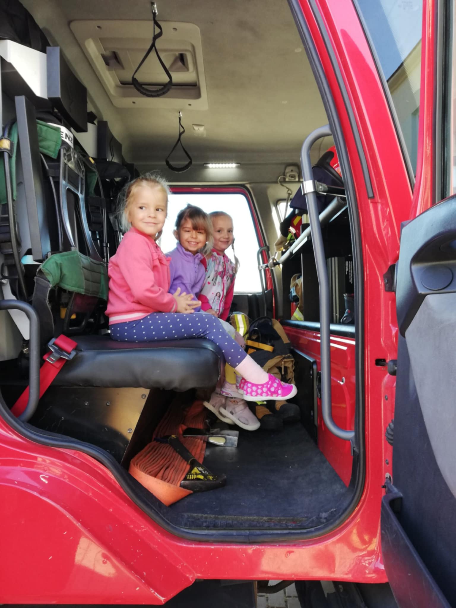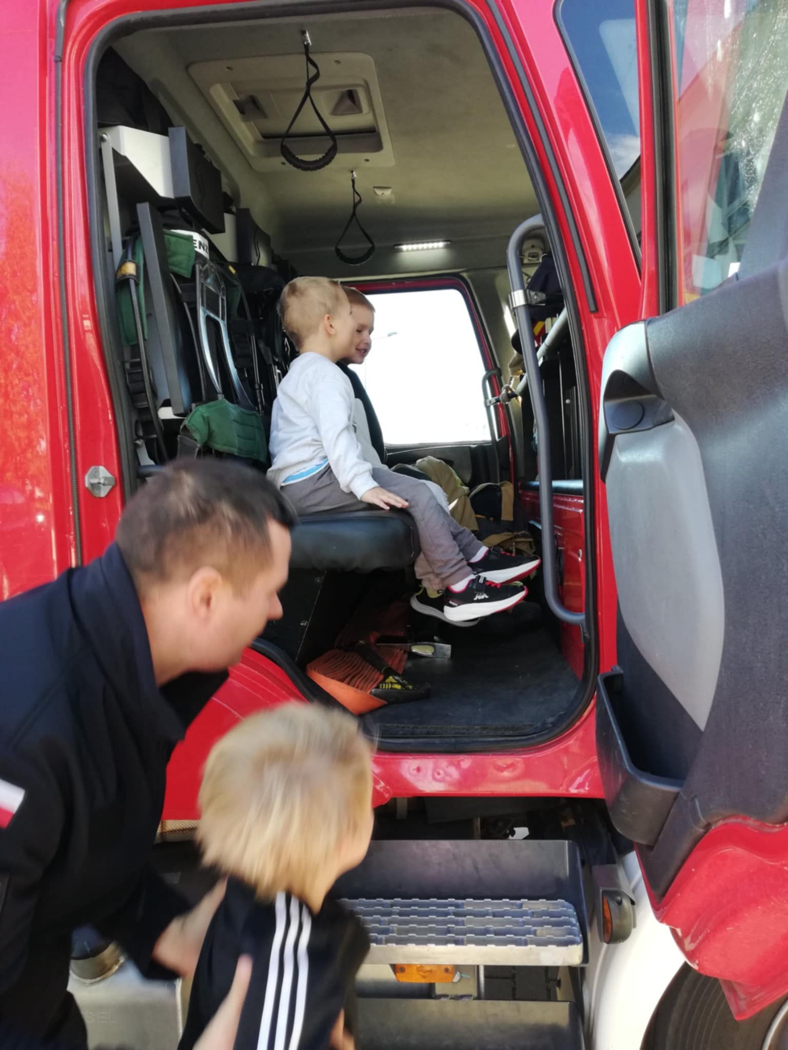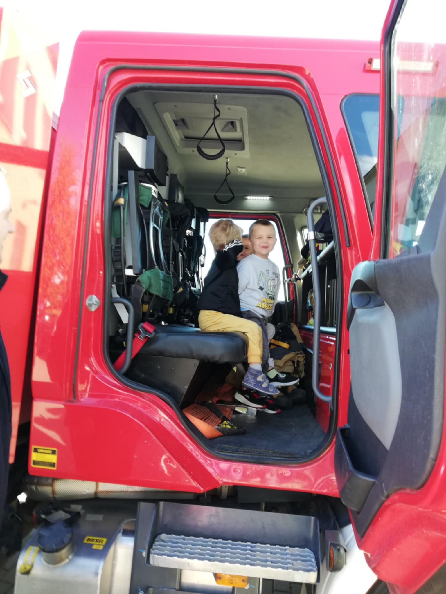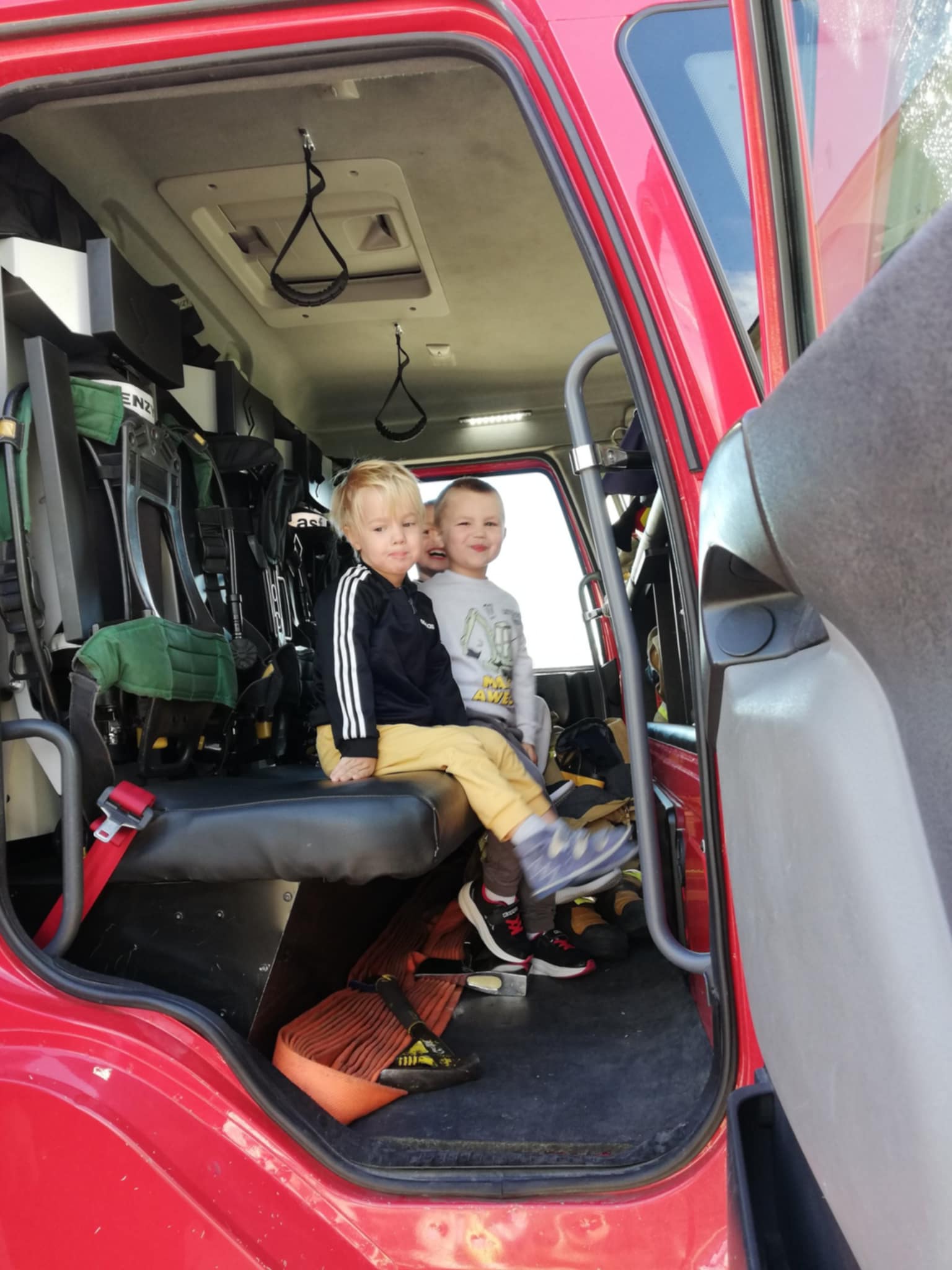 Szybka reakcja na sygnał, słuchanie pani, sprawne ustawienie się i zejście do bezpiecznego miejsca zbiórki to niezbędne elementy w przypadku pożaru. Ufff... dzisiaj się udało, pod czujnym wzrokiem Panów strażaków. Po zakończonej akcji próbnego alarmu przeciwpożarowego czas na obejrzenie wozu strażackiego.