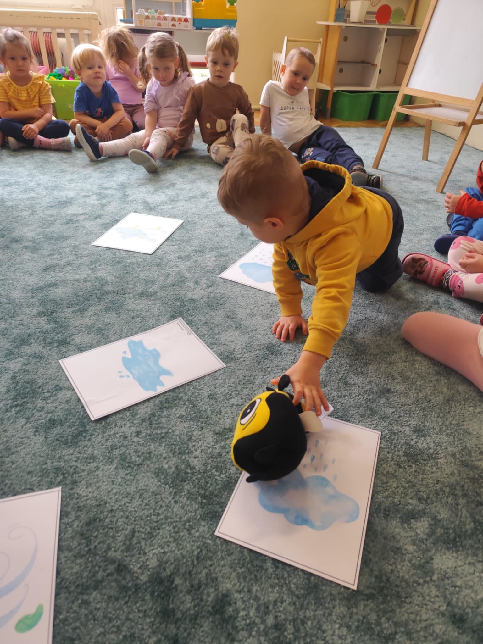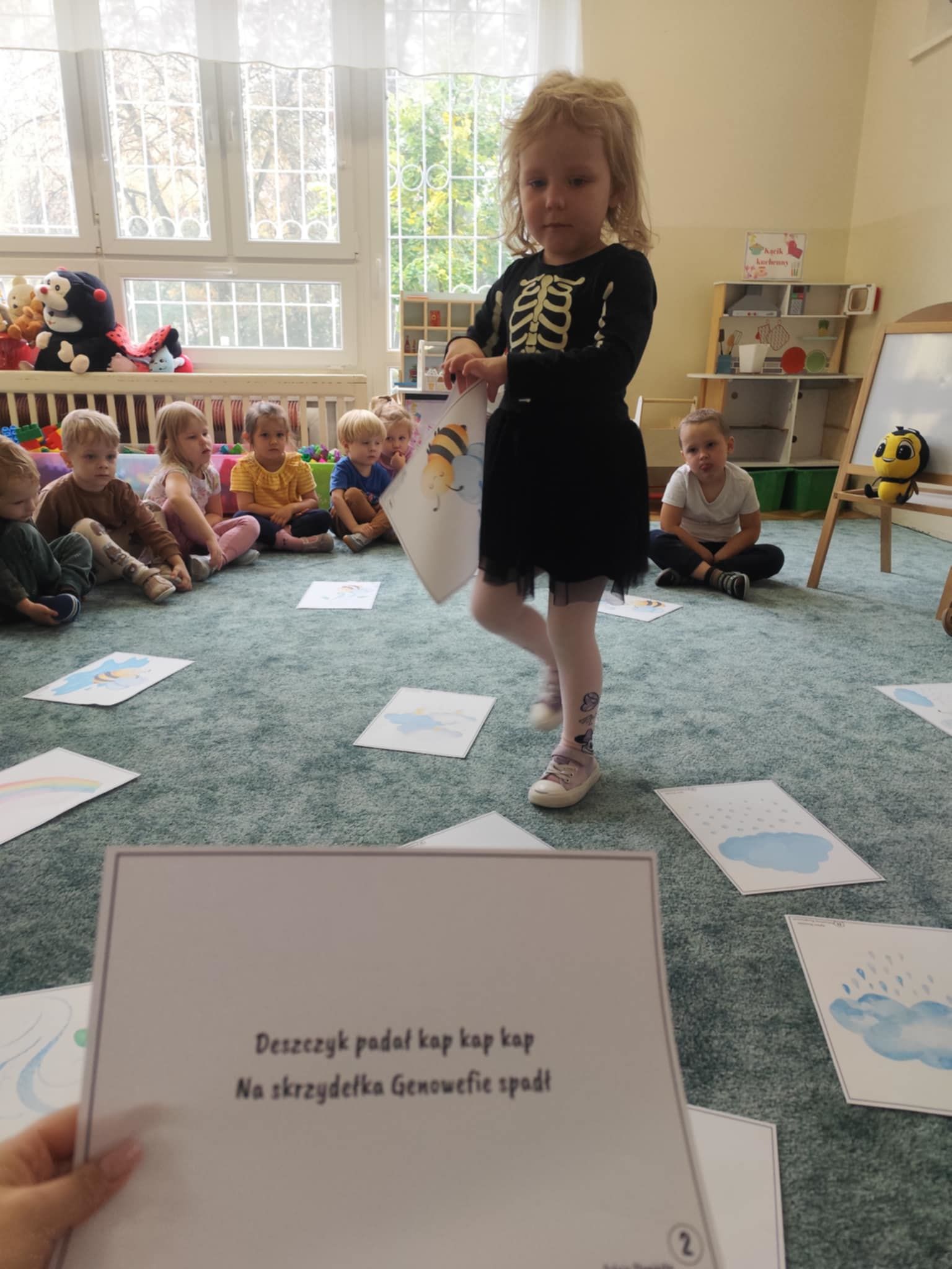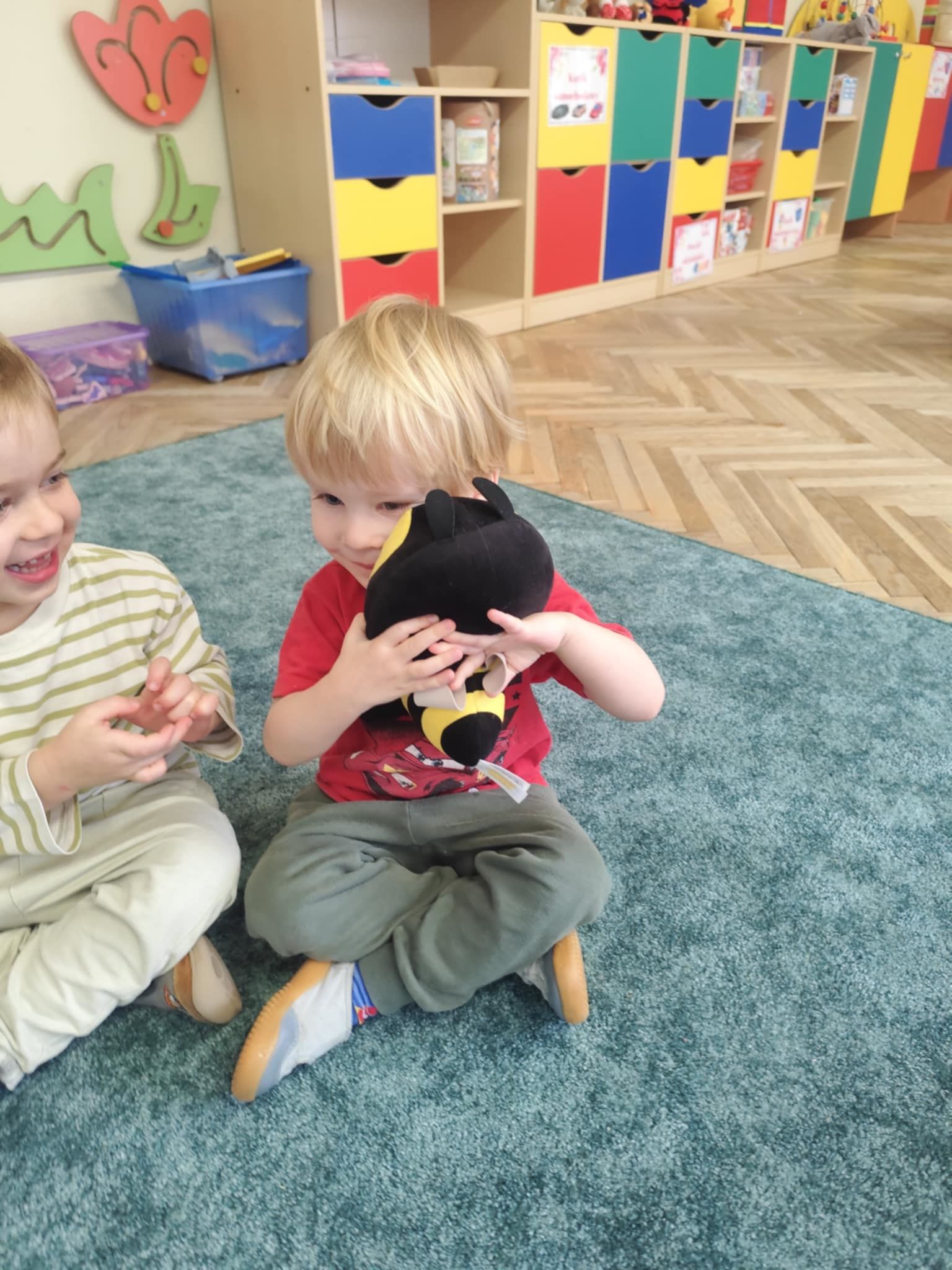 Witaj, Pszczoło Genowefo, miło Cię poznać! Grupa Kropelek zaczyna swoją przygodę z projektem edukacyjnym, którego zadaniami są ćwiczenia nad koordynacją wzrokowo-ruchową, motoryką małą i nad rytmem. Razem z Pszczołą Genowefą wszyscy usiedli w kole, poznali jej plany na wspólną zabawę i wymienili z nią powitalne buziaki i uściski. Zajęcia dydaktyczne, jakie do tej pory już się odbyły to: "Genowefa gotuje zupę" z ćwiczeniem nad uważnym słuchaniem i uzupełnianiem garnka odpowiednimi produktami oraz "Pszczoła Genowefa i pogoda", jako powtórzenie wiadomości o pogodzie z poprzedniego tygodnia. Nazwy wszystkich zjawisk atmosferycznych dzieliliśmy na sylaby, wskazywaliśmy na obrazki i dopasowywaliśmy je do fragmentów opowiadania. Kolejne zadania na jakie czekają Kropelki będą typowo muzyczno-paluszkowe, a następnie zapoznają się z tematyką "Spiżarnia Pszczoły Genowefy" oraz "Savoir-vivre Pszczoły Genowefy".