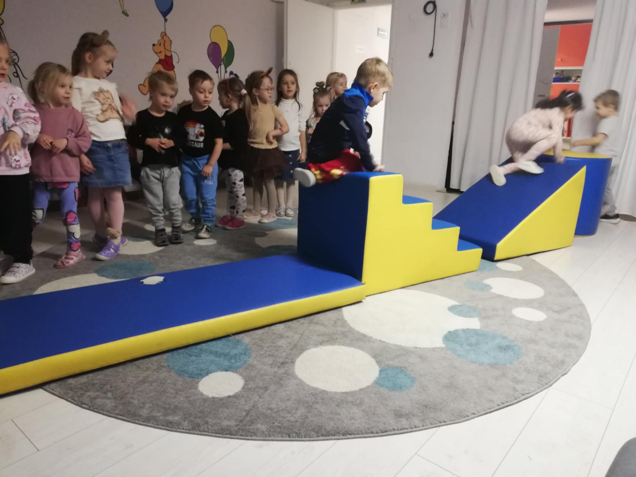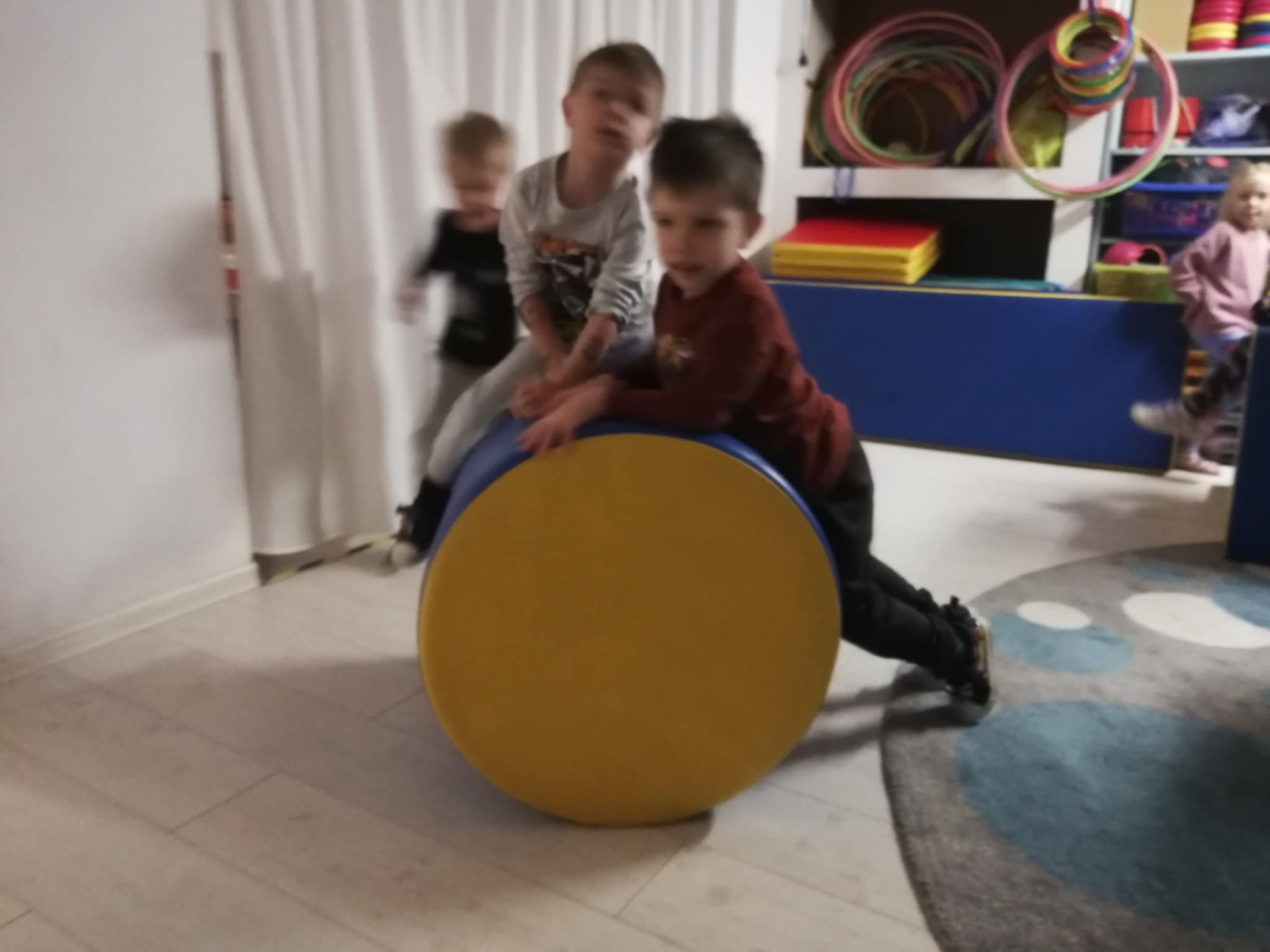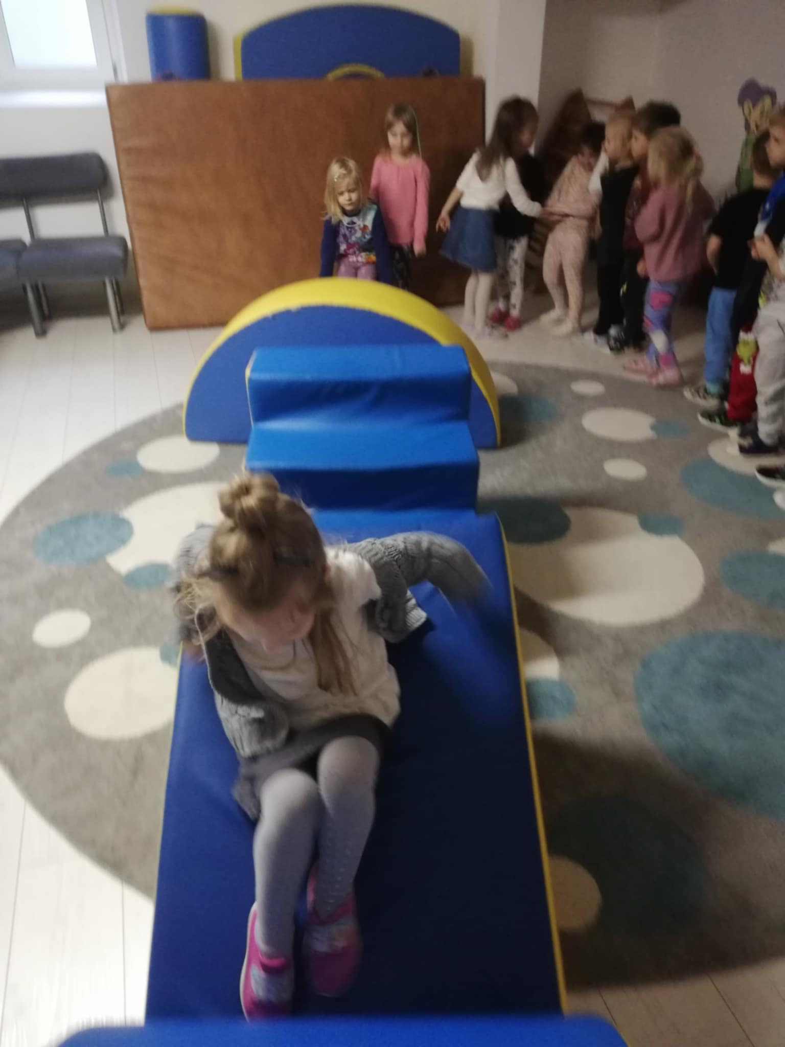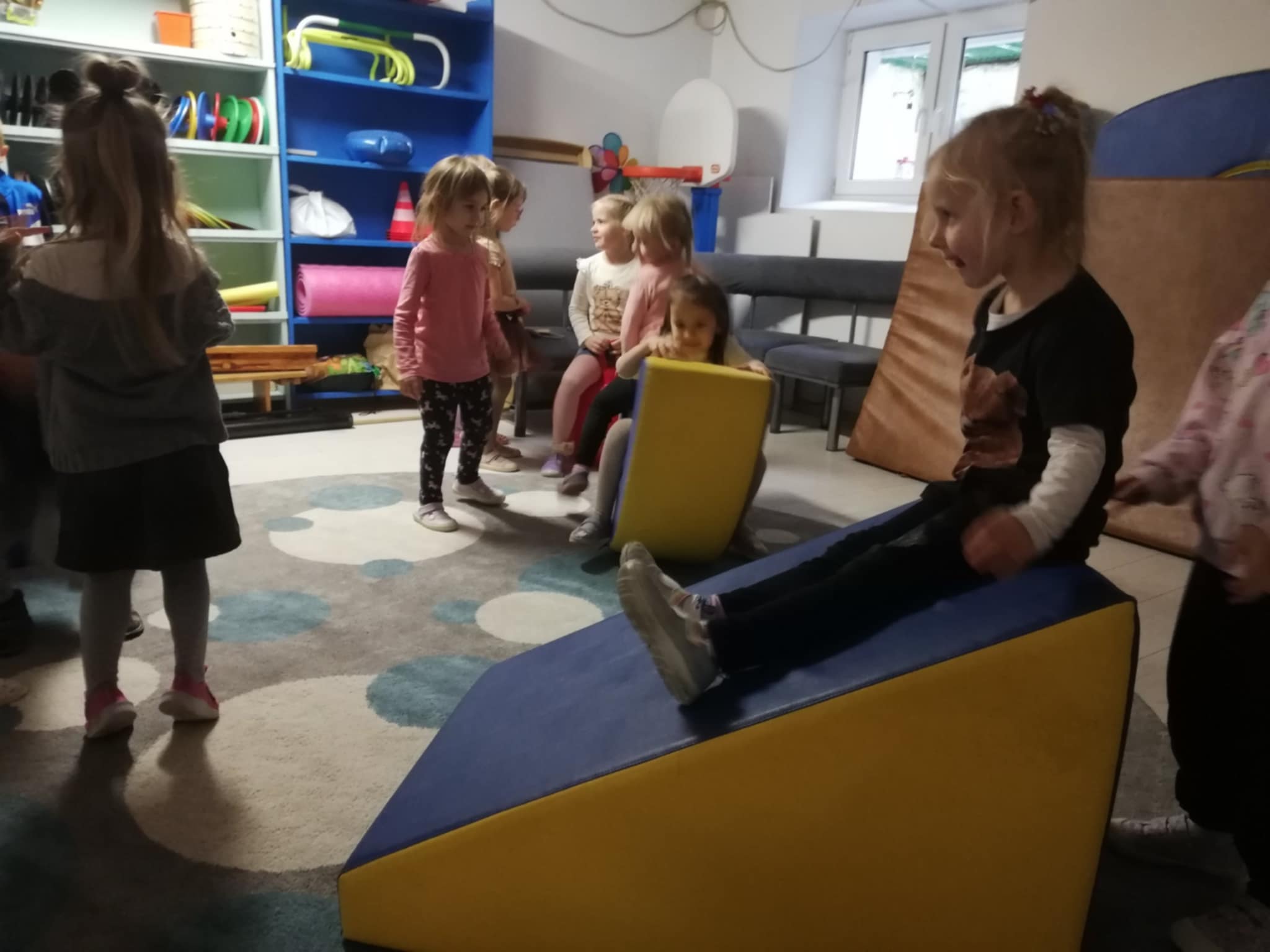Deszczowa pogoda... to nic. Świetnie bawiliśmy się w sali gimnastycznej na piankowym sprzęcie. Oczywiście zachowując bezpieczeństwo i respektując zasady. Po zabawie-odpoczynek.