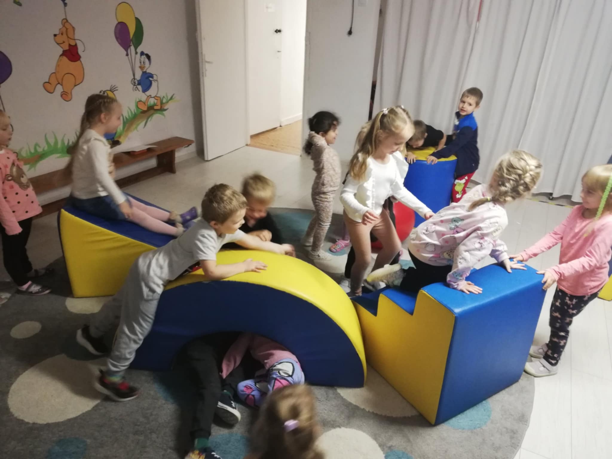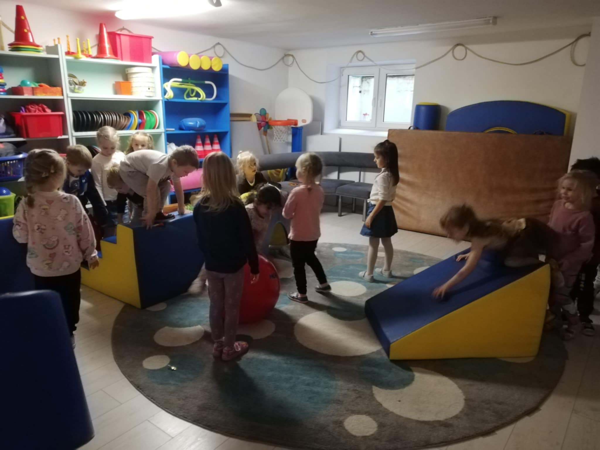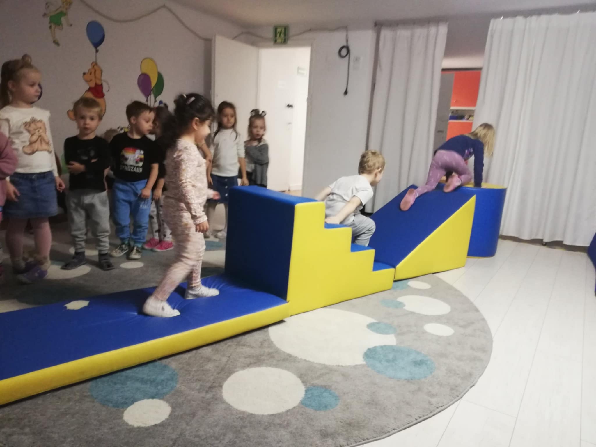 Deszczowa pogoda... to nic. Świetnie bawiliśmy się w sali gimnastycznej na piankowym sprzęcie. Oczywiście zachowując bezpieczeństwo i respektując zasady. Po zabawie-odpoczynek.