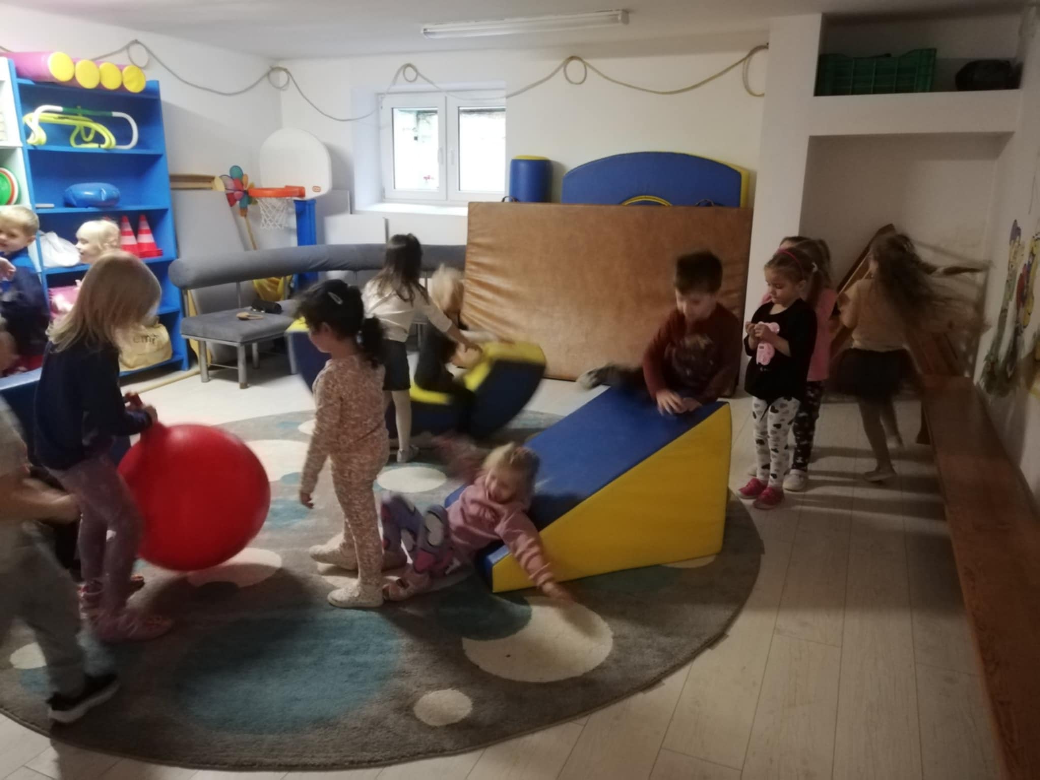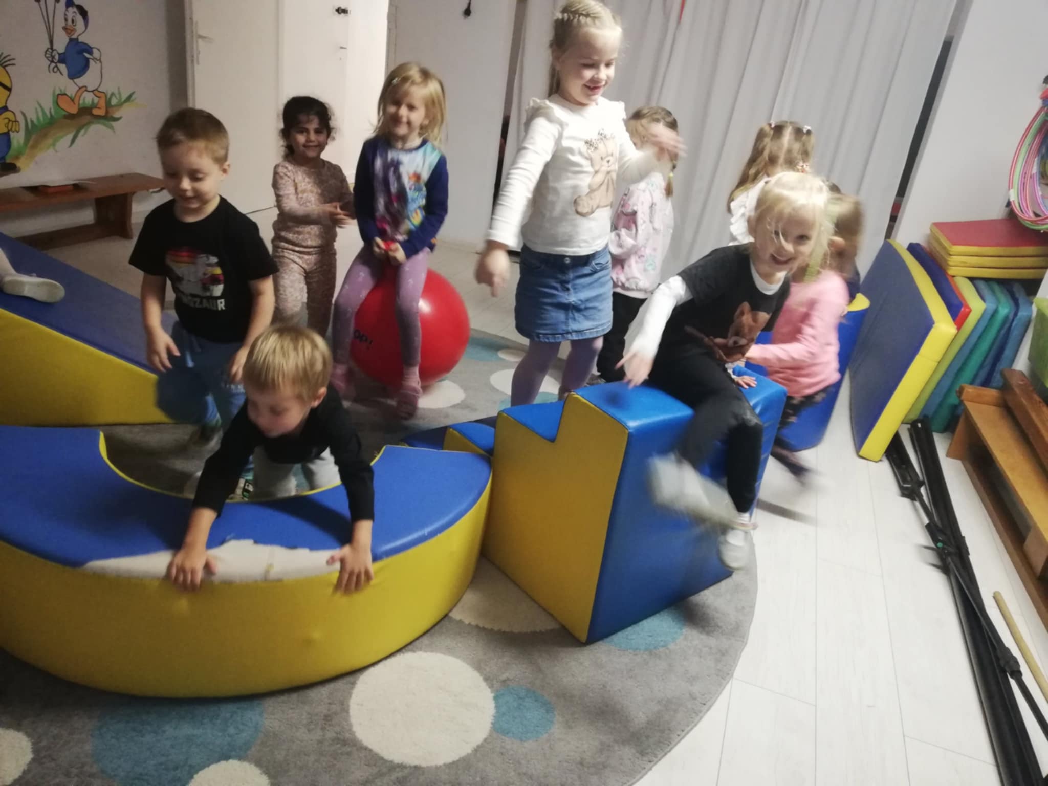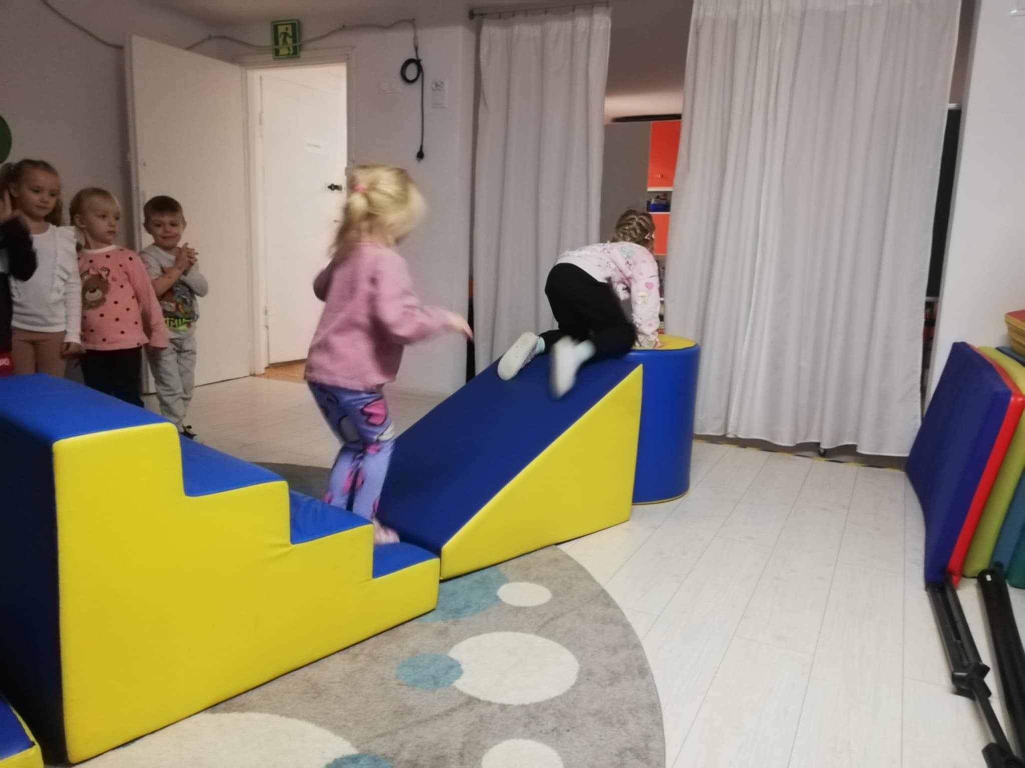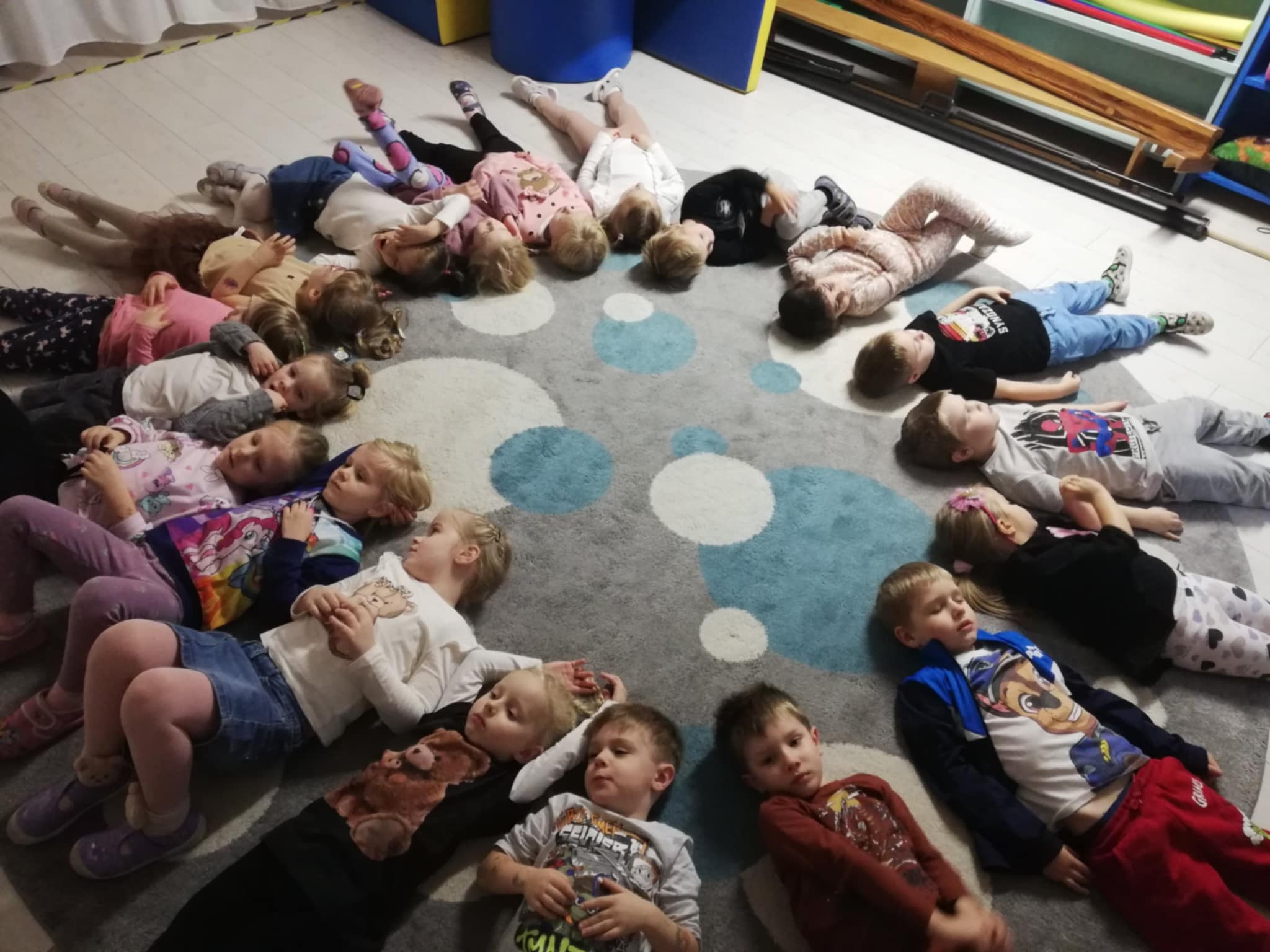 Deszczowa pogoda... to nic. Świetnie bawiliśmy się w sali gimnastycznej na piankowym sprzęcie. Oczywiście zachowując bezpieczeństwo i respektując zasady. Po zabawie-odpoczynek.