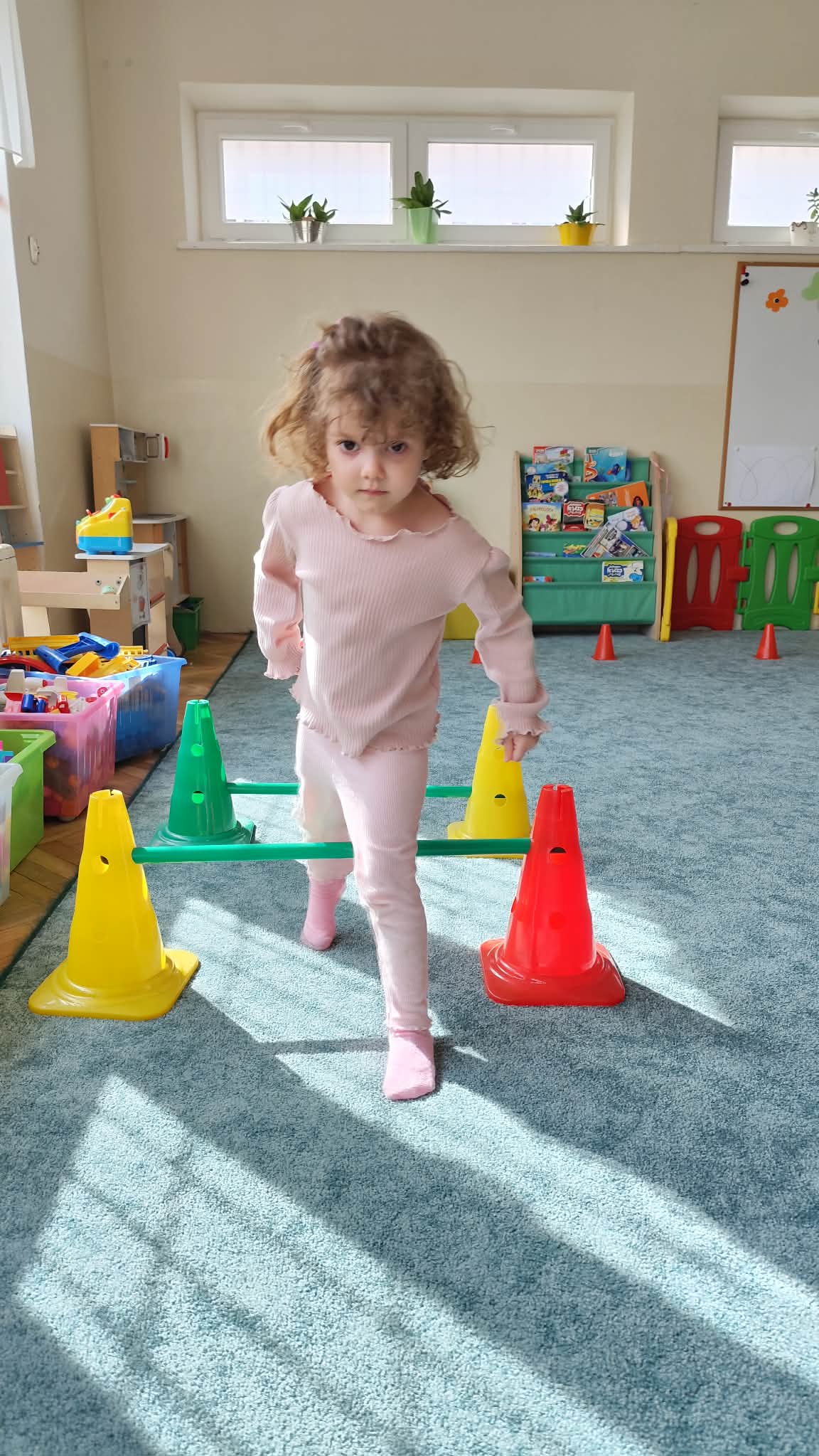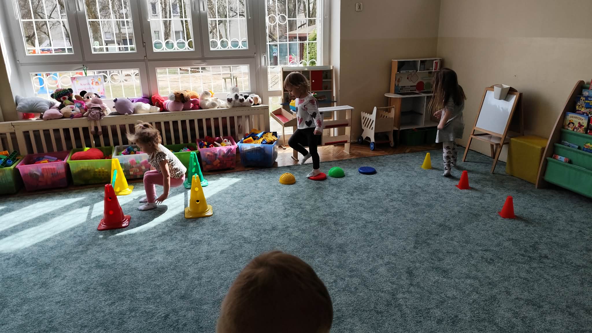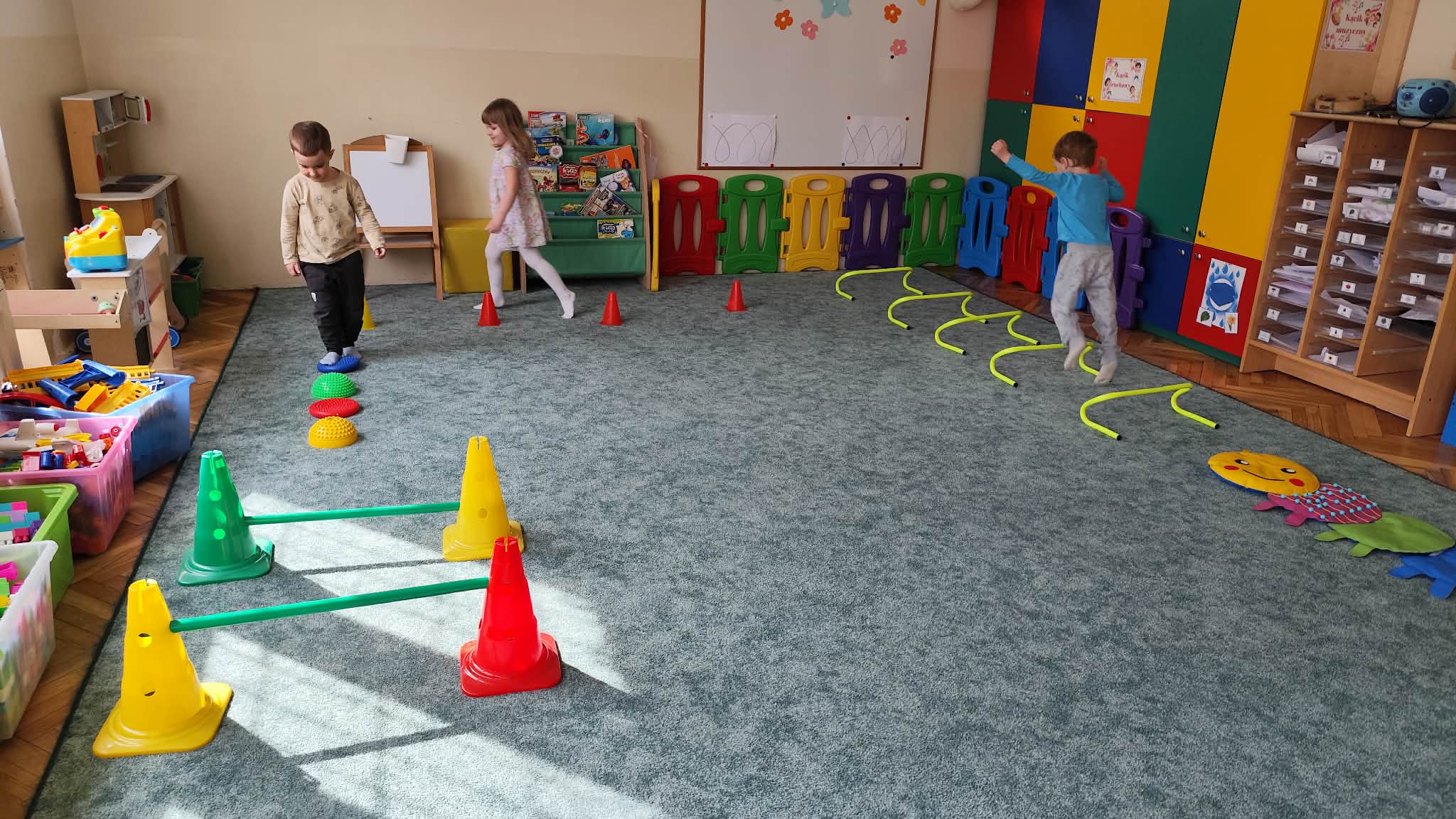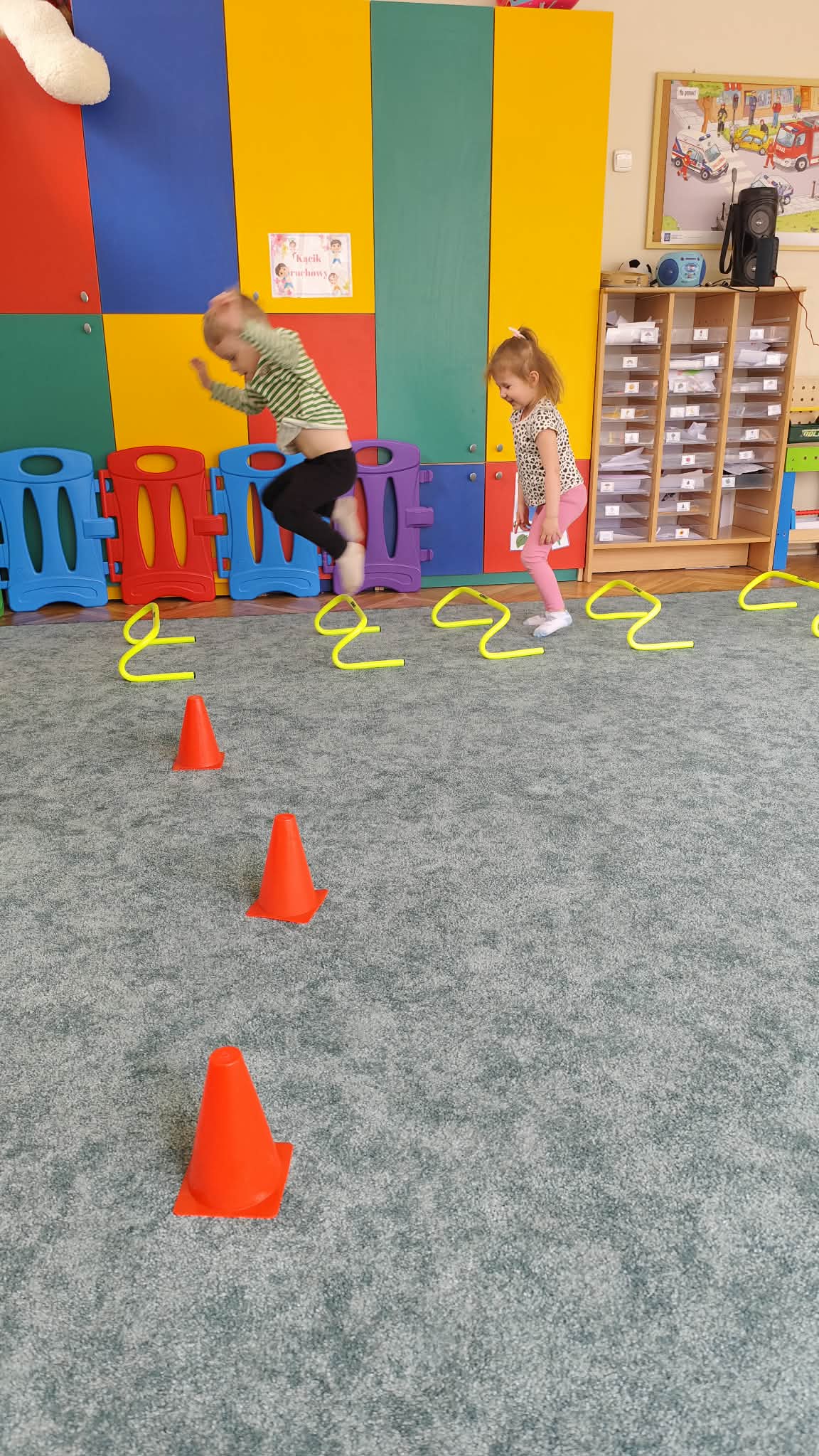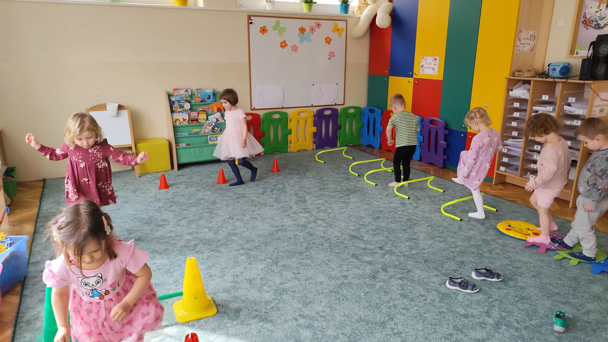 Ruch czyli aktywna forma edukacji zdrowotnej, która ma na celu kształtowanie nawyku codziennej aktywności fizycznej. Poprzez zabawy ruchowe i ćwiczenia wzmacniamy mięśnie, dbamy o poprawną postawę ciała oraz dotleniamy organizm. Kropelki pokonywały tor przeszkód ćwicząc przeskoki przez przeszkody oraz równowagę, jednocześnie stymulując mięśnie stóp poprzez przechodzenie po jeżykach i sensoryczną gąsienicę. Jak zawsze przy tego typu ćwiczeniach było mnóstwo zabawy i śmiechu.