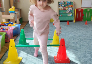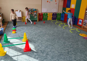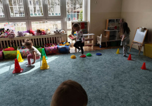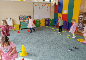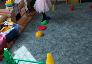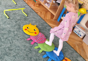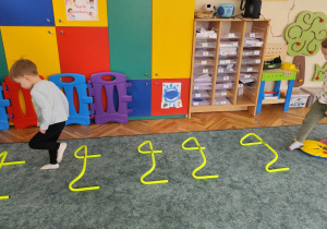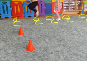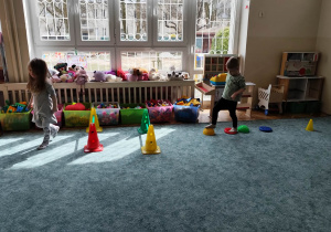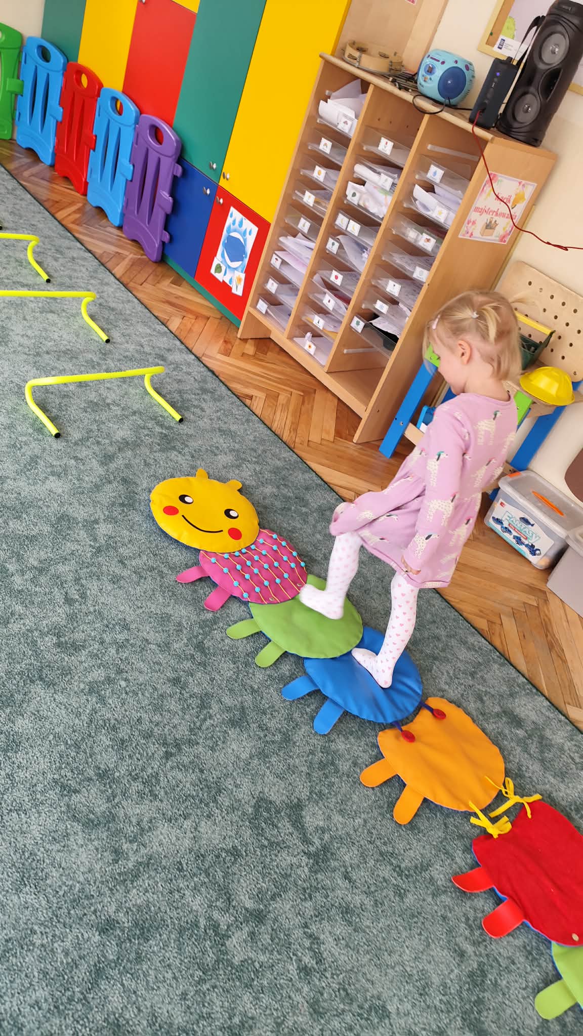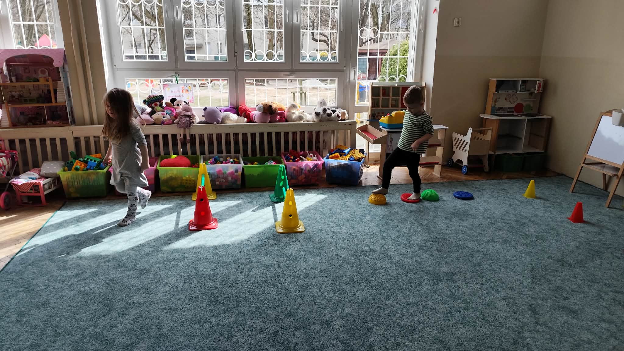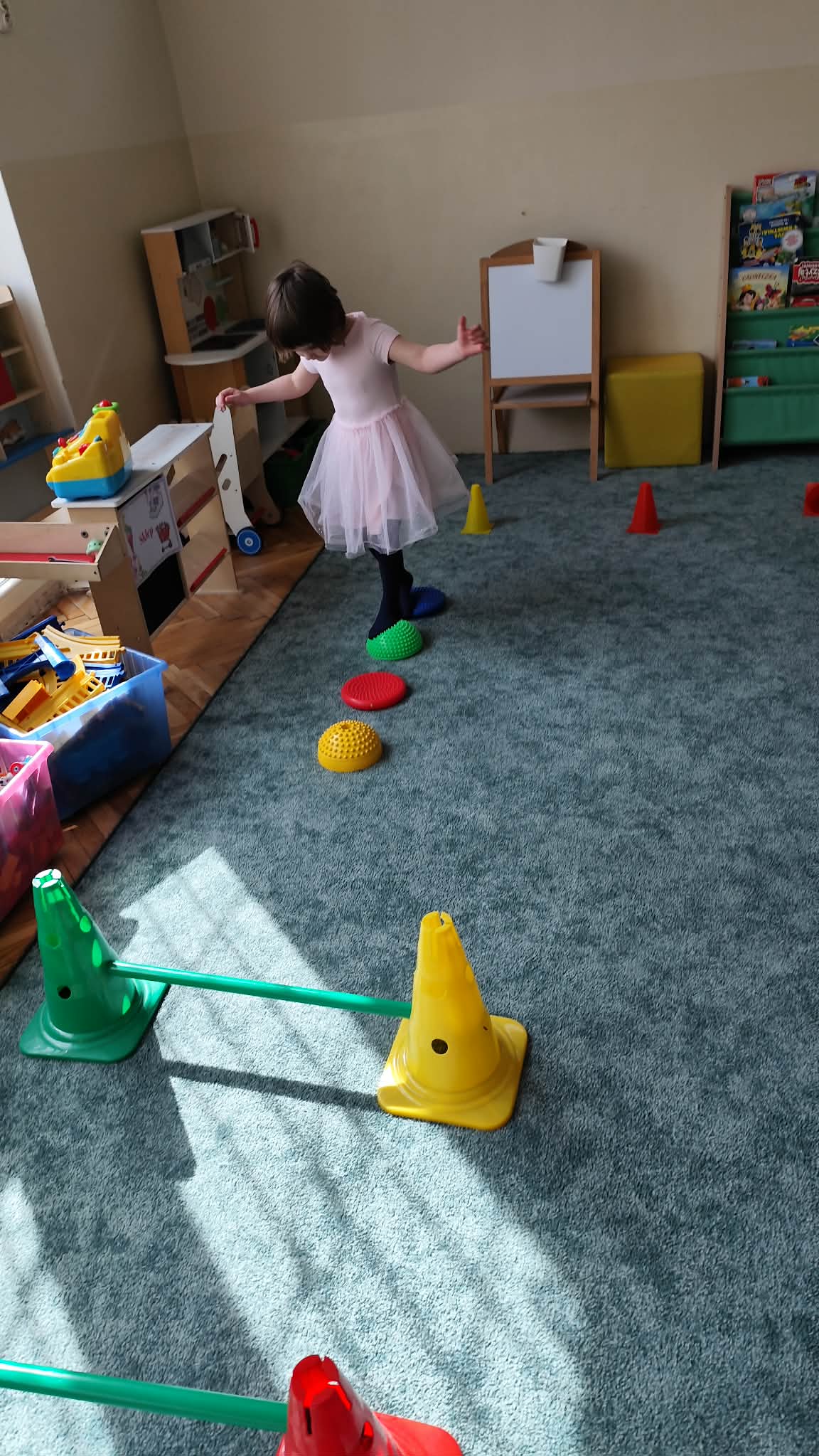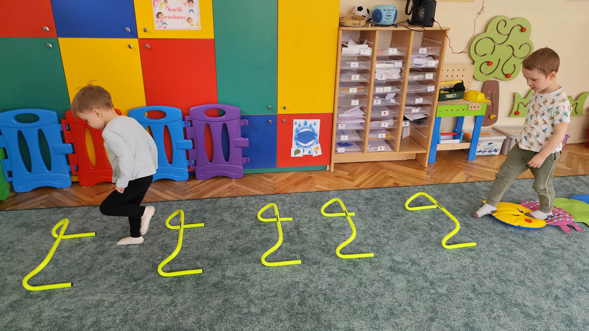Ruch czyli aktywna forma edukacji zdrowotnej, która ma na celu kształtowanie nawyku codziennej aktywności fizycznej. Poprzez zabawy ruchowe i ćwiczenia wzmacniamy mięśnie, dbamy o poprawną postawę ciała oraz dotleniamy organizm. Kropelki pokonywały tor przeszkód ćwicząc przeskoki przez przeszkody oraz równowagę, jednocześnie stymulując mięśnie stóp poprzez przechodzenie po jeżykach i sensoryczną gąsienicę. Jak zawsze przy tego typu ćwiczeniach było mnóstwo zabawy i śmiechu.