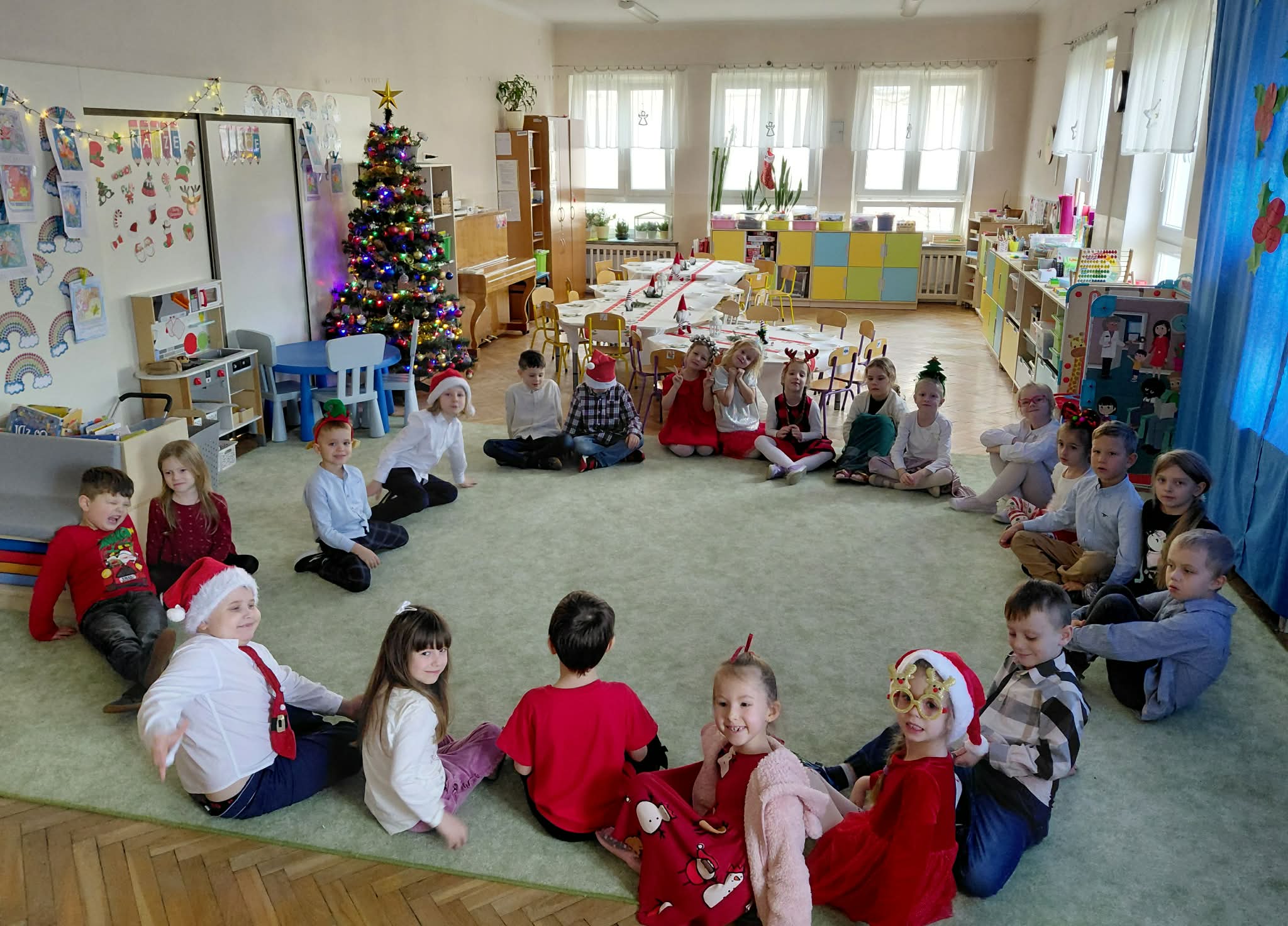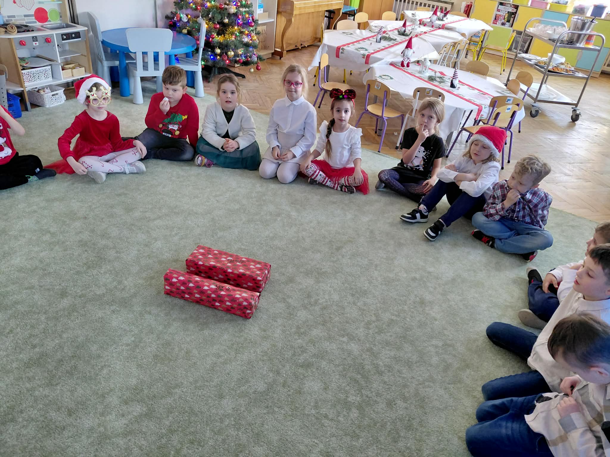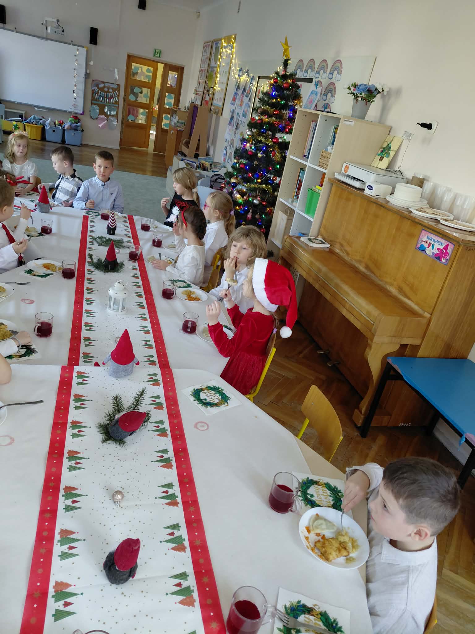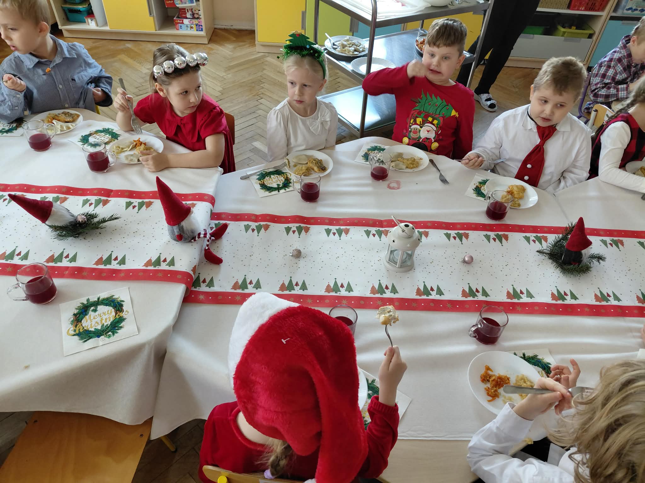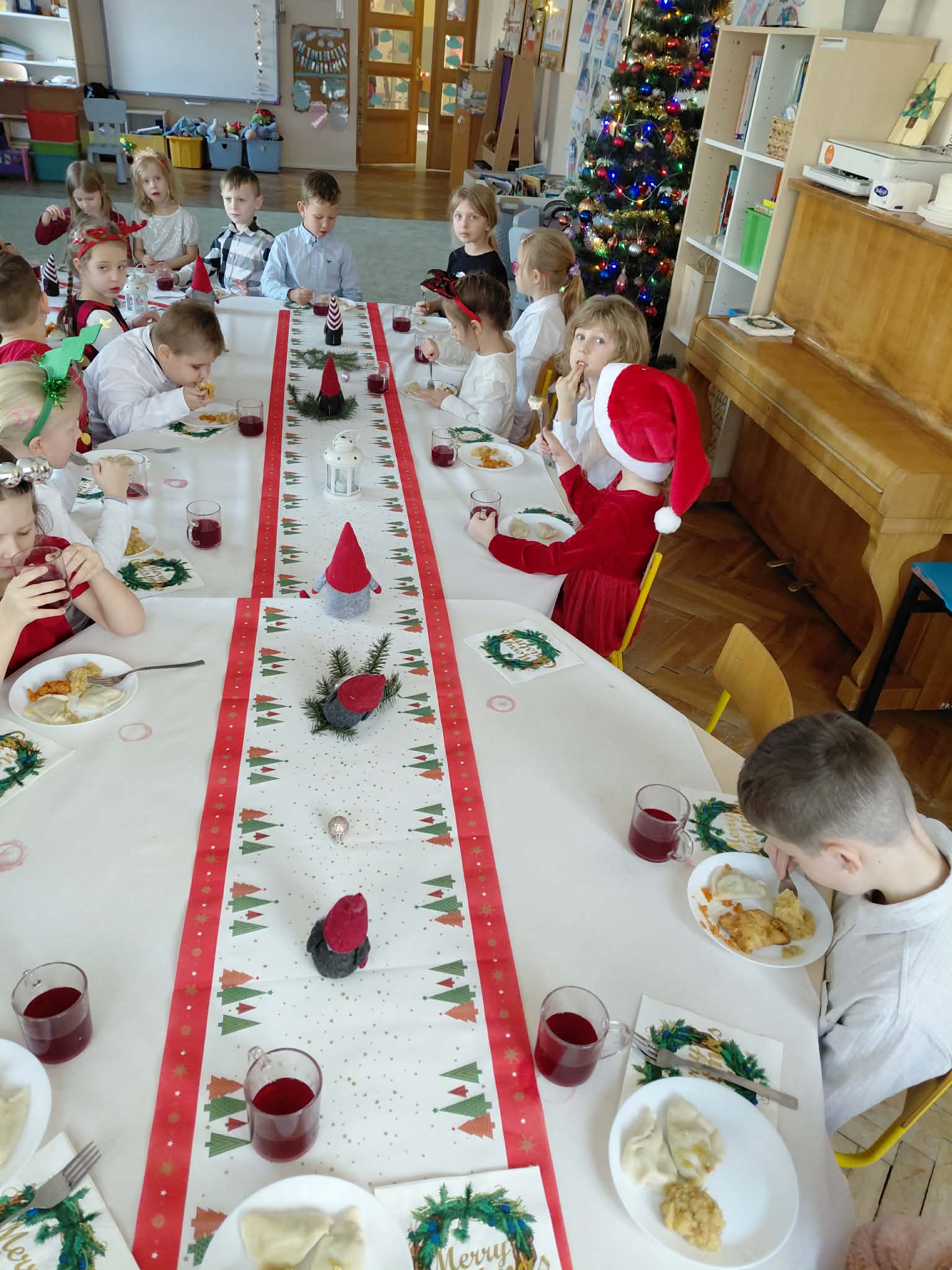 17 grudnia odbył się w naszym przedszkolu świąteczny obiad, wszyscy przyszli odświętnie ubrani. Każda grupa zaprezentowała jedną świąteczną piosenkę. Wspólnie porozmawialiśmy o świątecznych tradycjach i usiedliśmy do świątecznego obiadu. Dzieci otrzymały również wspólny prezent dla całej grupy z którego będą mogły korzystać przez cały rok. Wszyscy bardzo lubimy ten magiczny świąteczny czas.