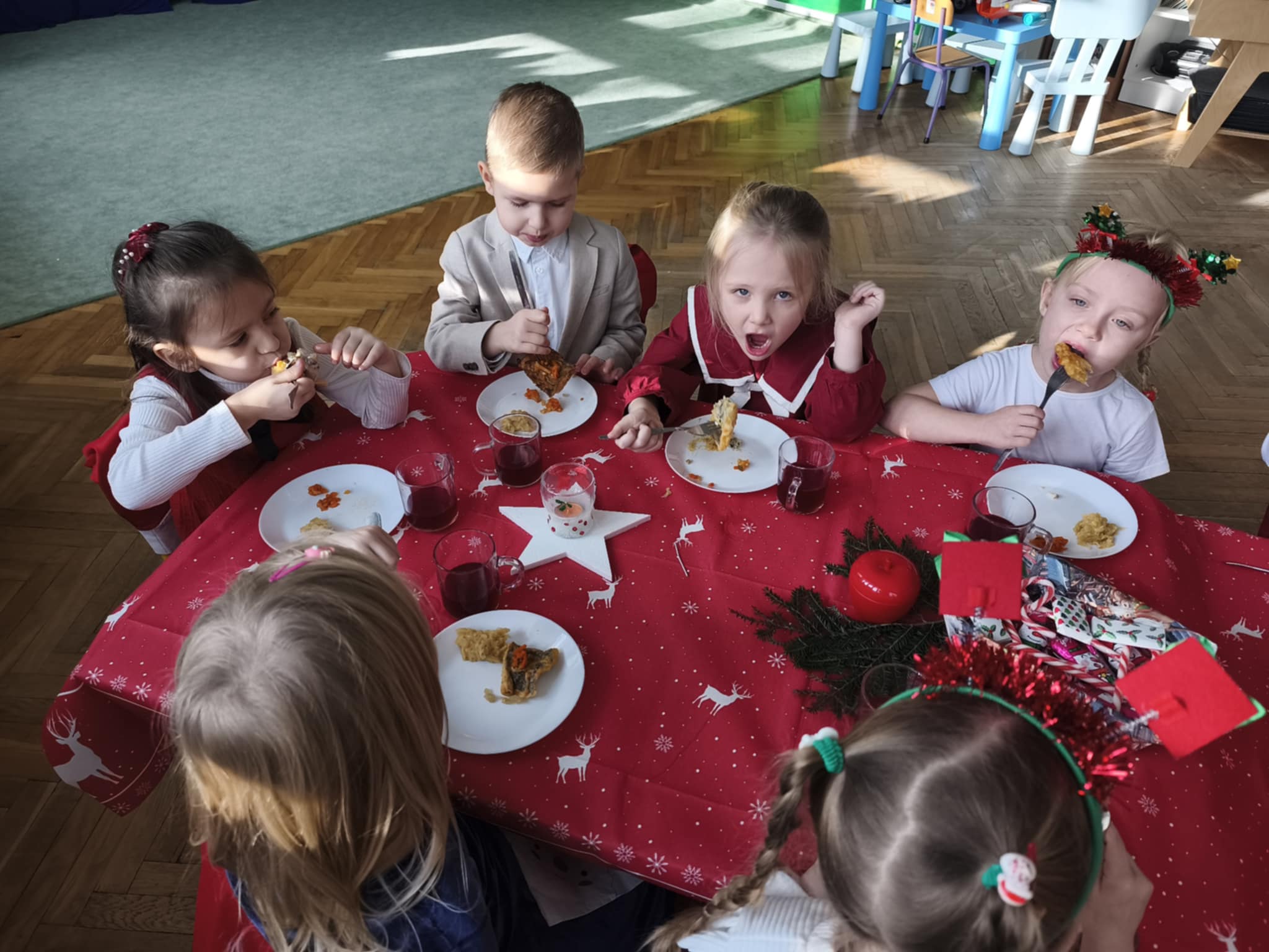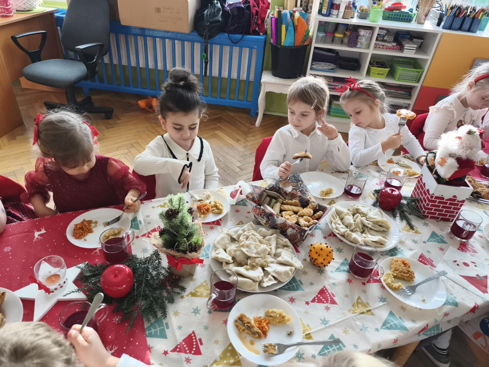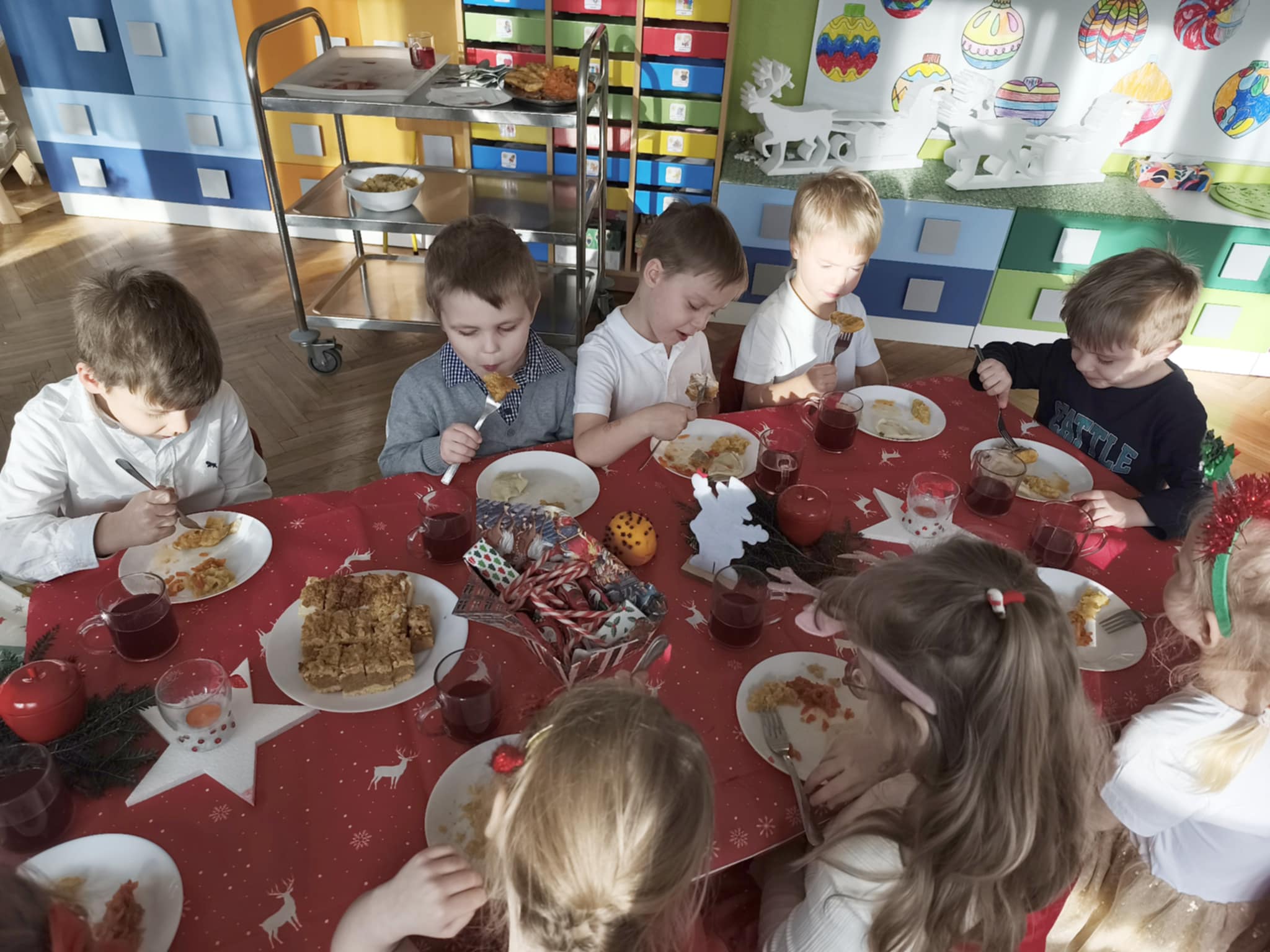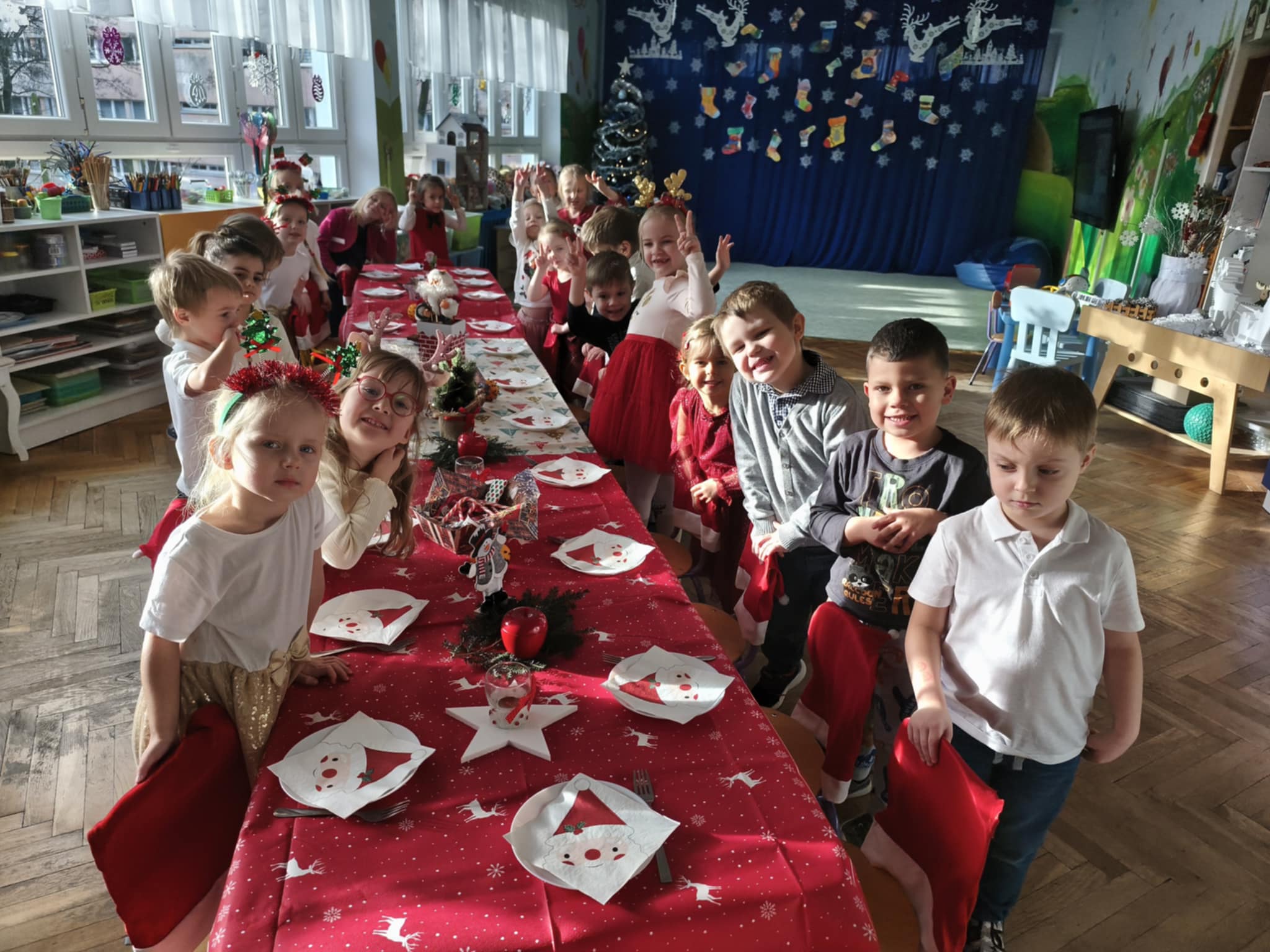 Obiad świąteczny, to już tradycja w naszym przedszkolu. Wszyscy odświętnie ubrani, spotykamy się w jednej z grup, gdzie prezentujemy jedną wybraną świąteczną piosenkę. Przed posiłkiem rozmawiamy o świątecznych tradycjach, składamy sobie z opłatkiem w ręku życzenia i siadamy do świątecznie przygotowanego wspólnego stołu. To nie wszystko. Dostaliśmy od Mikołaja wspólny prezent dla całej grupy zasponsorowany przez Radę Rodziców, z którego będziemy mogli korzystać przez cały rok. To był wyjątkowy, pełen wrażeń i pozytywnych emocji magiczny dzień.