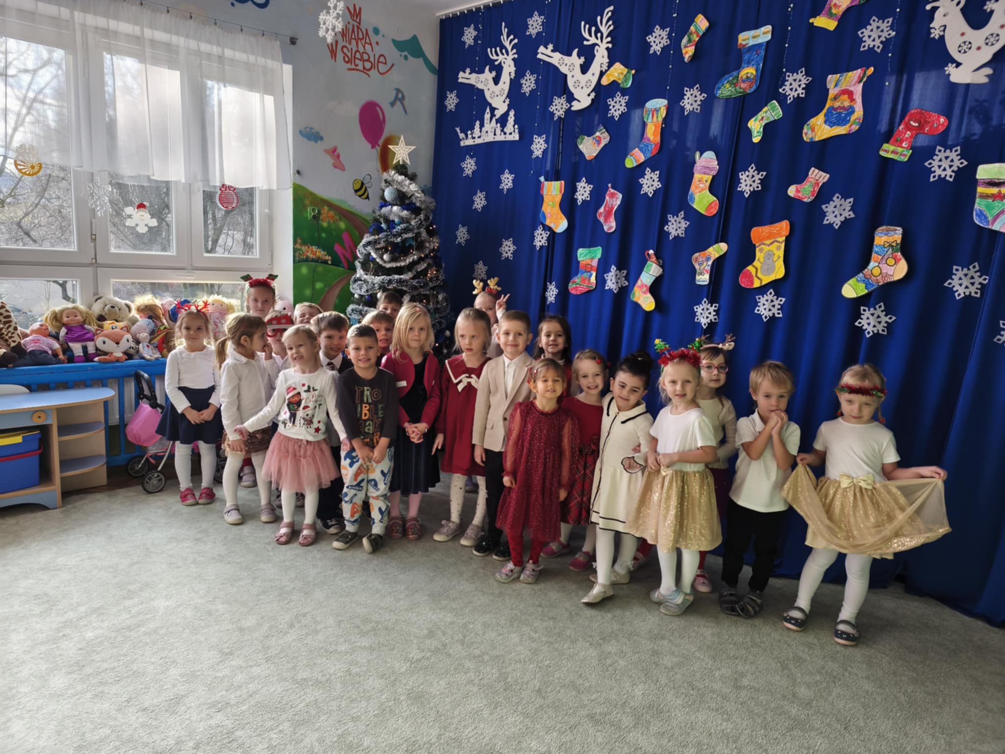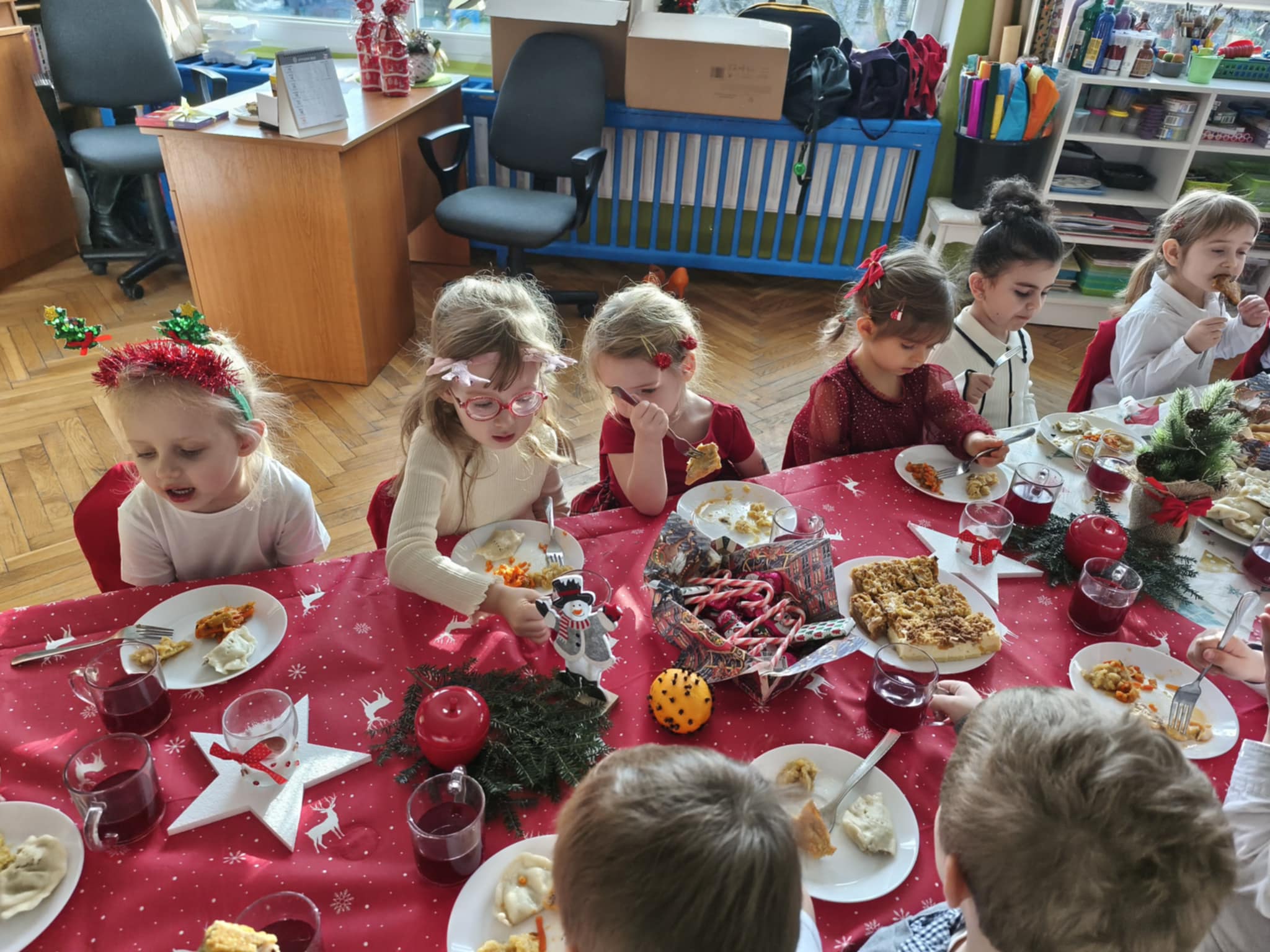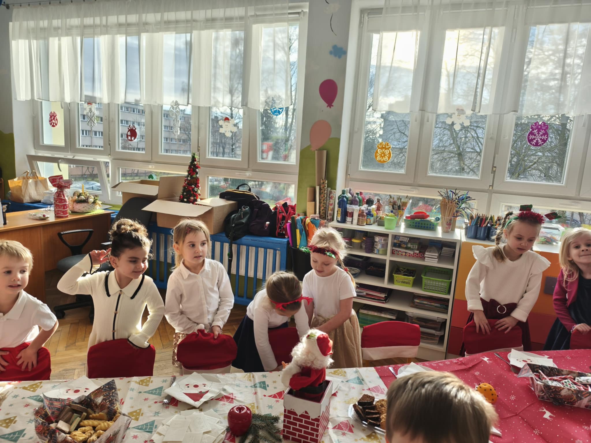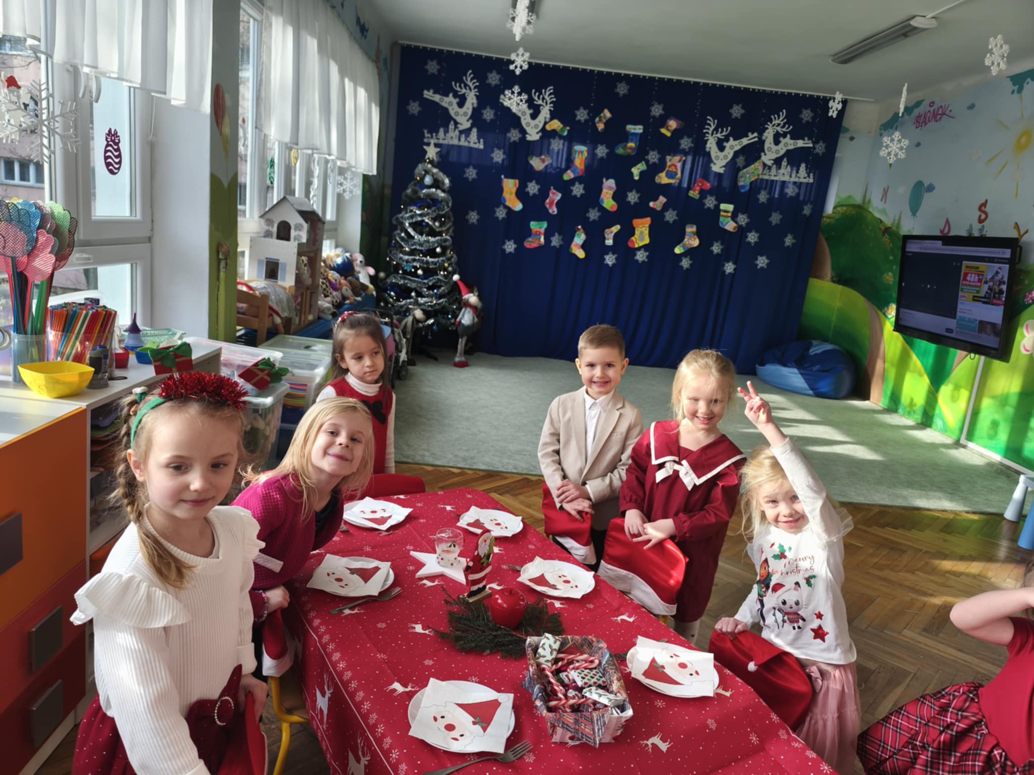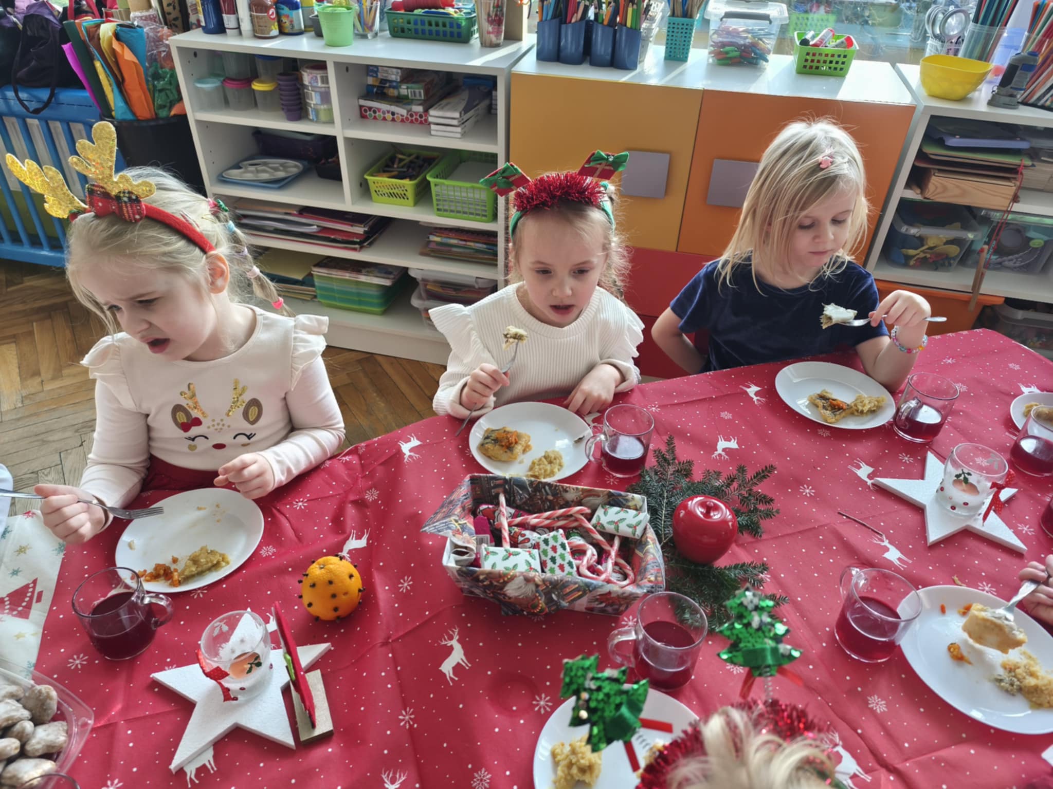 Obiad świąteczny, to już tradycja w naszym przedszkolu. Wszyscy odświętnie ubrani, spotykamy się w jednej z grup, gdzie prezentujemy jedną wybraną świąteczną piosenkę. Przed posiłkiem rozmawiamy o świątecznych tradycjach, składamy sobie z opłatkiem w ręku życzenia i siadamy do świątecznie przygotowanego wspólnego stołu. To nie wszystko. Dostaliśmy od Mikołaja wspólny prezent dla całej grupy zasponsorowany przez Radę Rodziców, z którego będziemy mogli korzystać przez cały rok. To był wyjątkowy, pełen wrażeń i pozytywnych emocji magiczny dzień.
