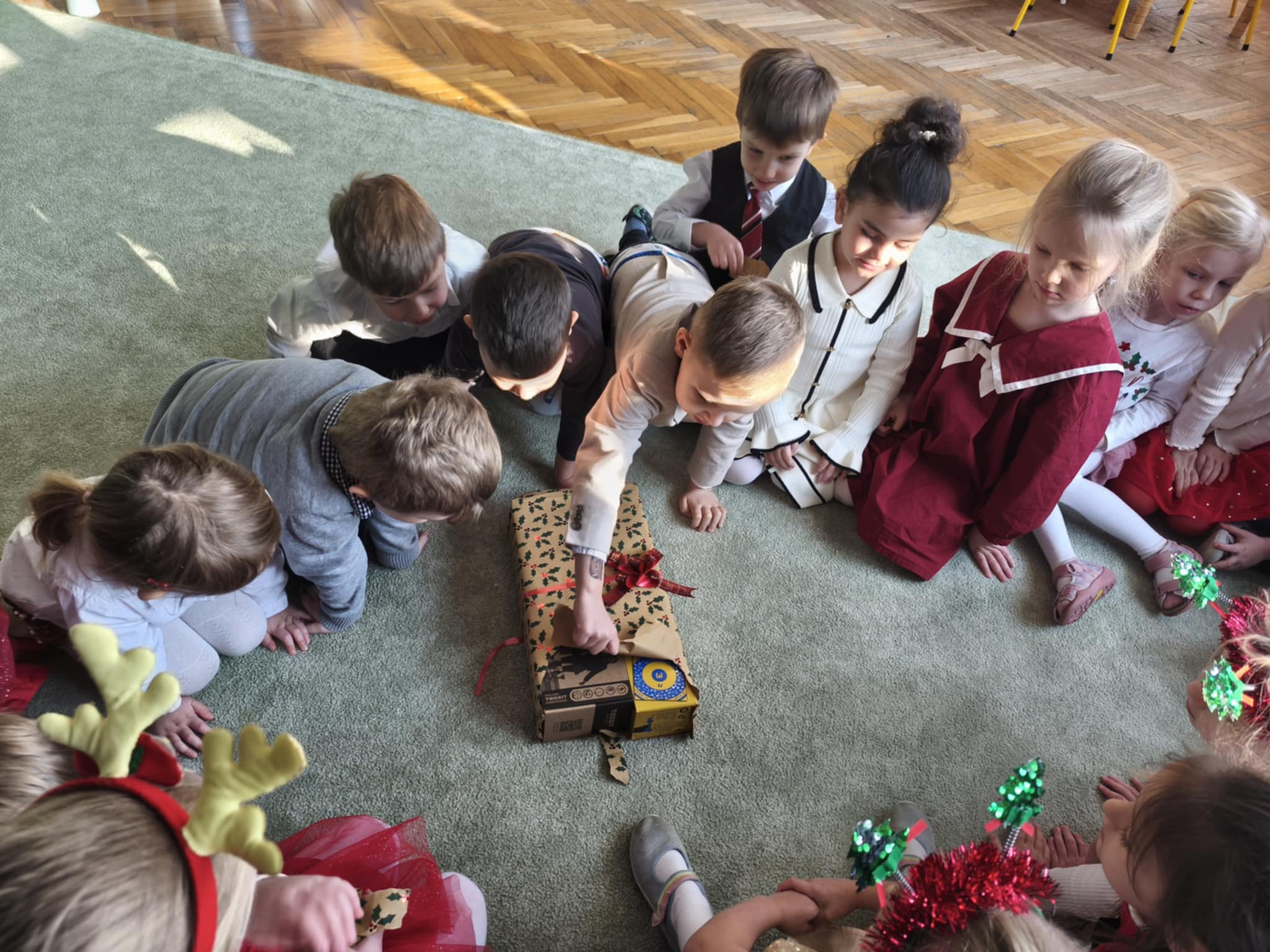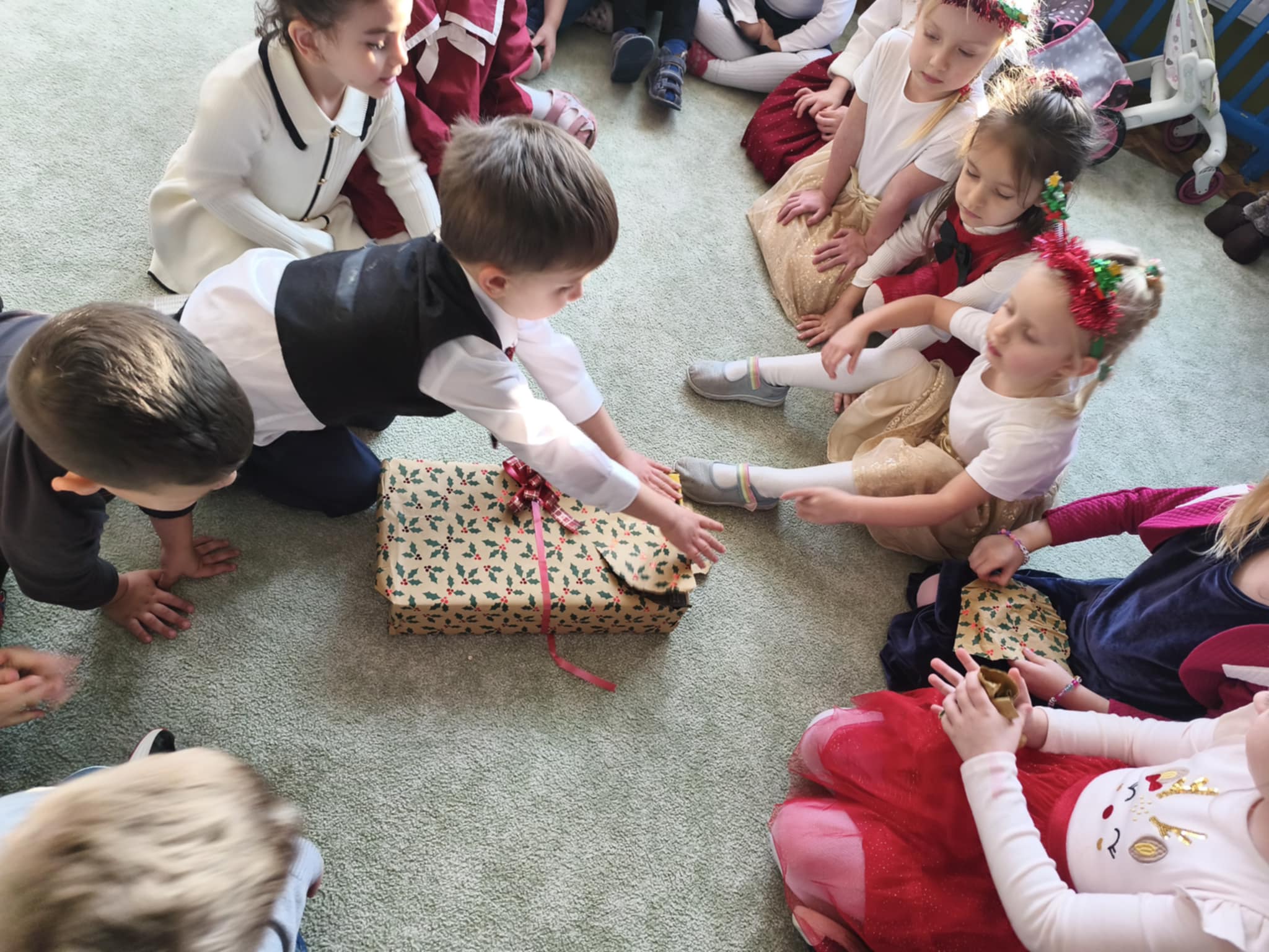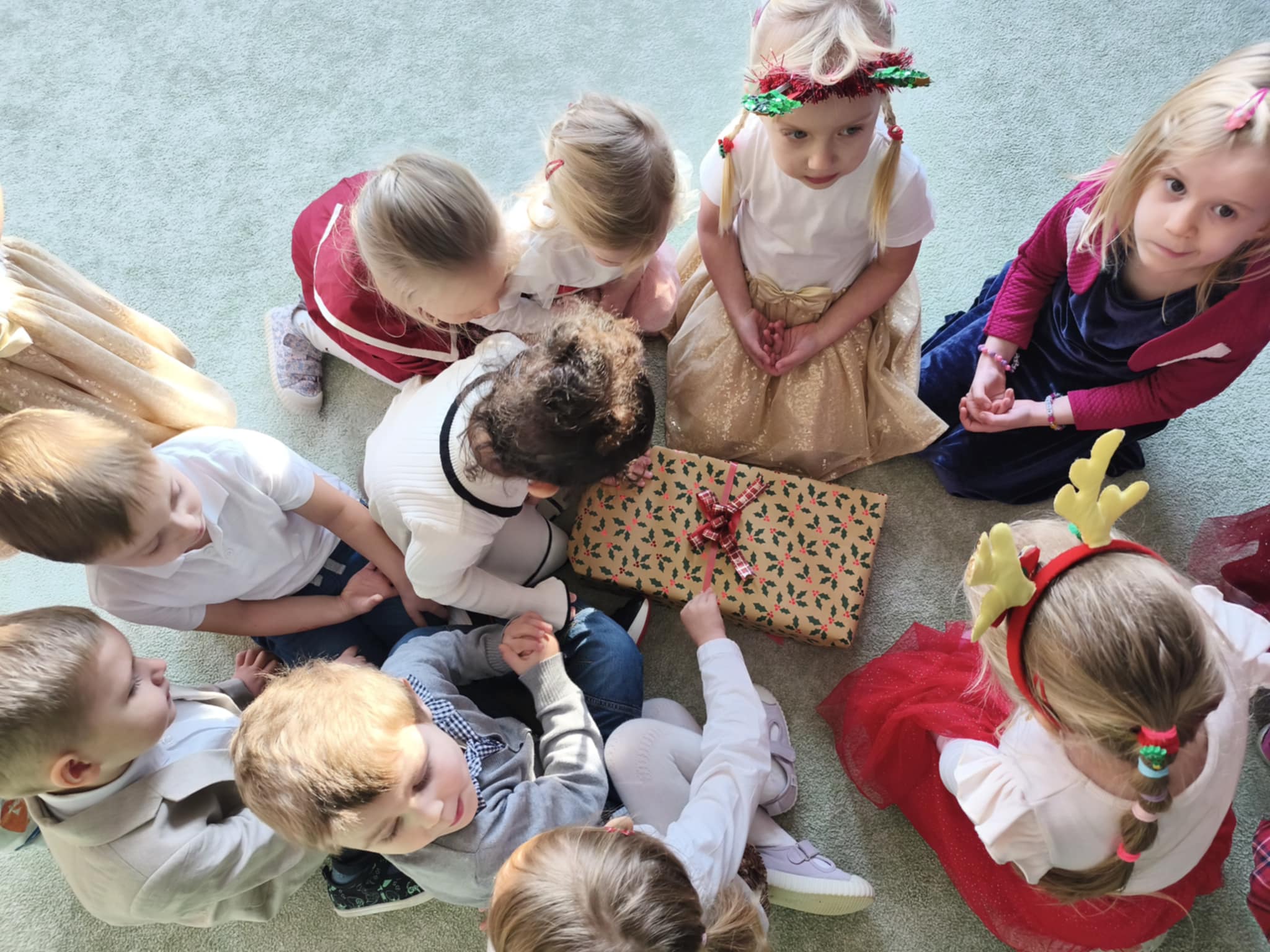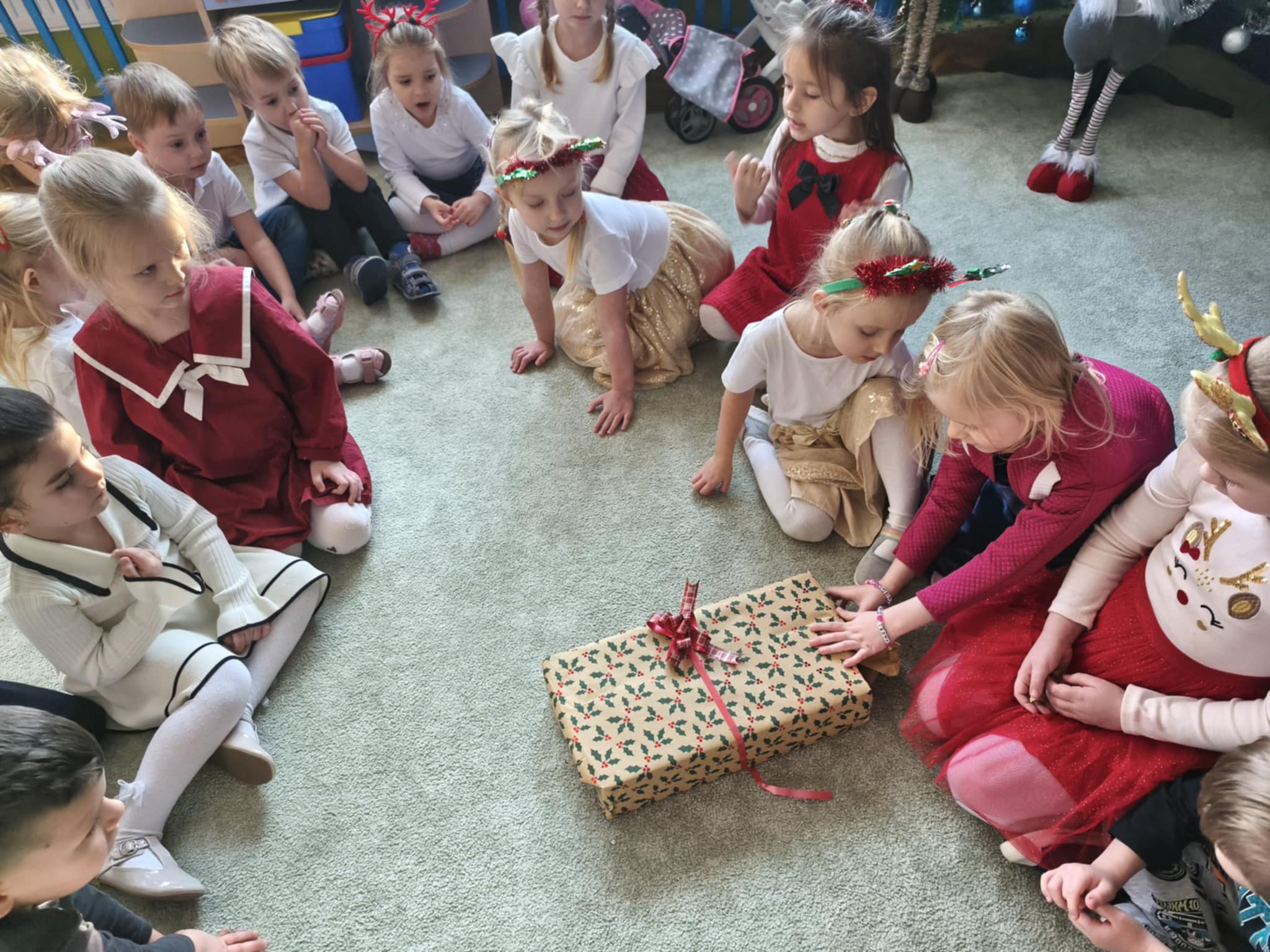 Obiad świąteczny, to już tradycja w naszym przedszkolu. Wszyscy odświętnie ubrani, spotykamy się w jednej z grup, gdzie prezentujemy jedną wybraną świąteczną piosenkę. Przed posiłkiem rozmawiamy o świątecznych tradycjach, składamy sobie z opłatkiem w ręku życzenia i siadamy do świątecznie przygotowanego wspólnego stołu. To nie wszystko. Dostaliśmy od Mikołaja wspólny prezent dla całej grupy zasponsorowany przez Radę Rodziców, z którego będziemy mogli korzystać przez cały rok. To był wyjątkowy, pełen wrażeń i pozytywnych emocji magiczny dzień.