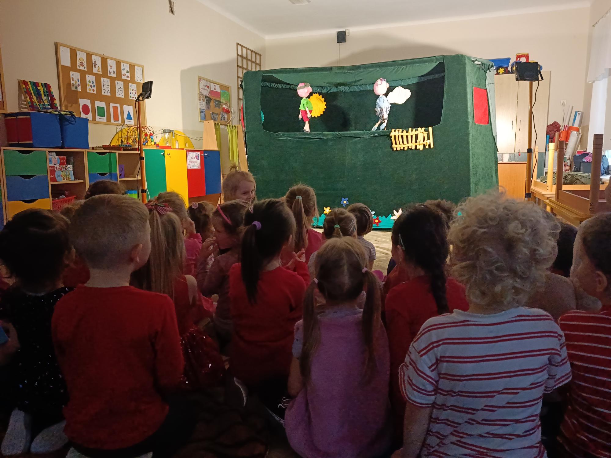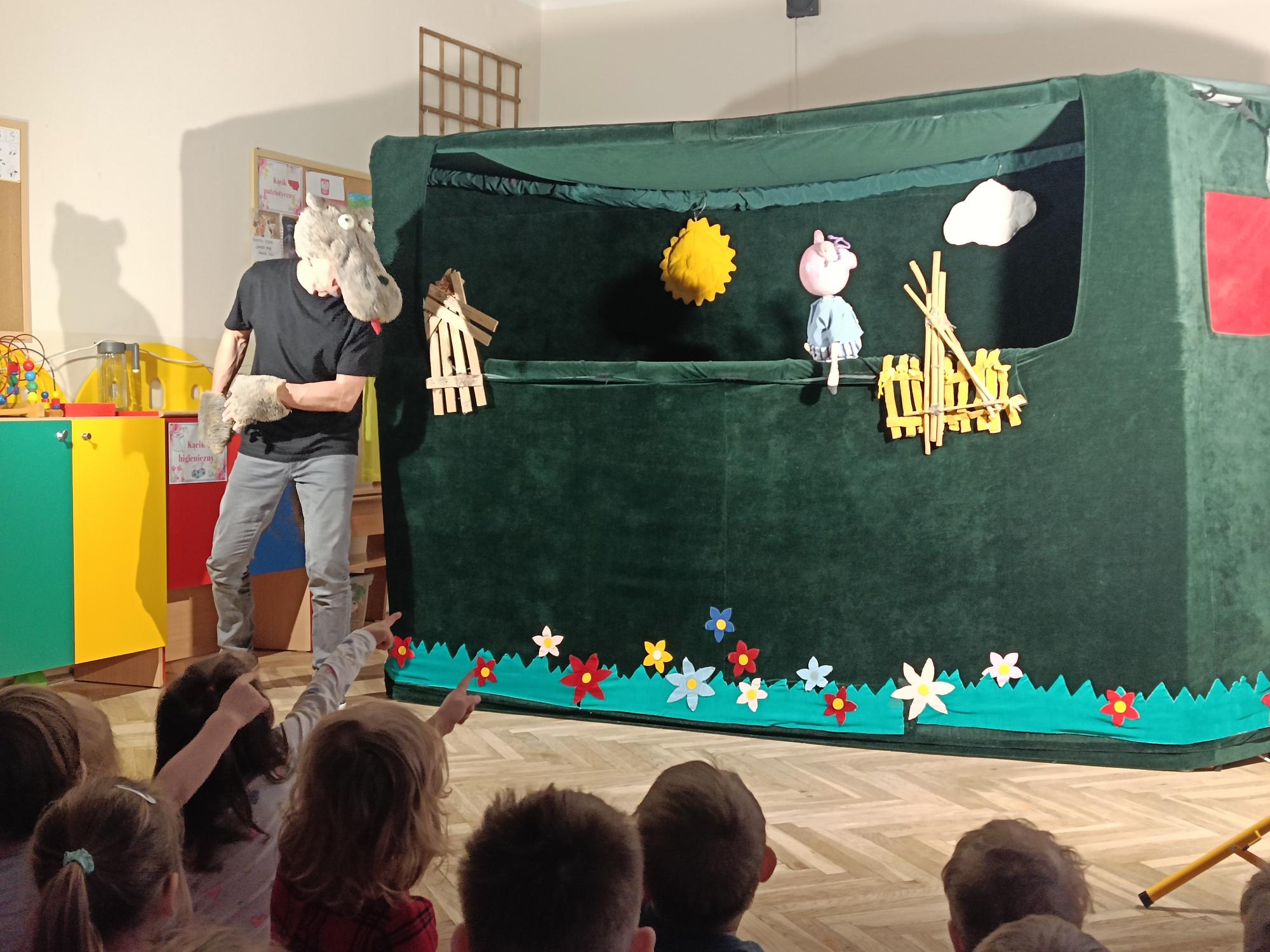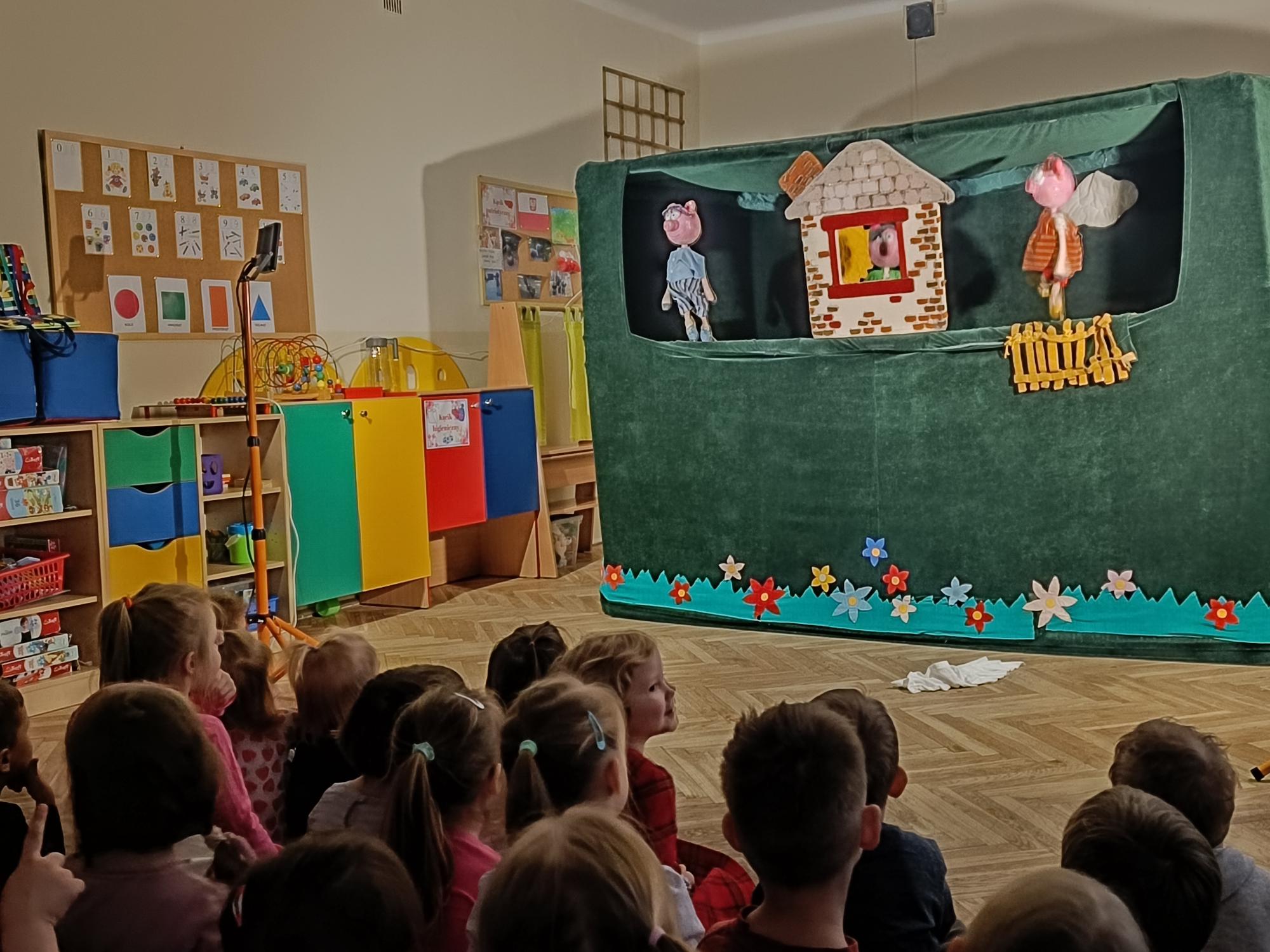 Dzisiaj mieliśmy okazję oglądać bajkę wystawioną przez teatr Widzimisię pt; "Trzy świnki". Nauczyła nas ona,że pilna, solidna praca i zapobiegliwość popłacają, zapewniając bezpieczeństwo, podczas gdy lenistwo prowadzi do porażki. Solidny dom z cegieł - dom trzeciej świnki wytrzymał nadejście wilka, w przeciwieństwie do słomianej konstrukcji.