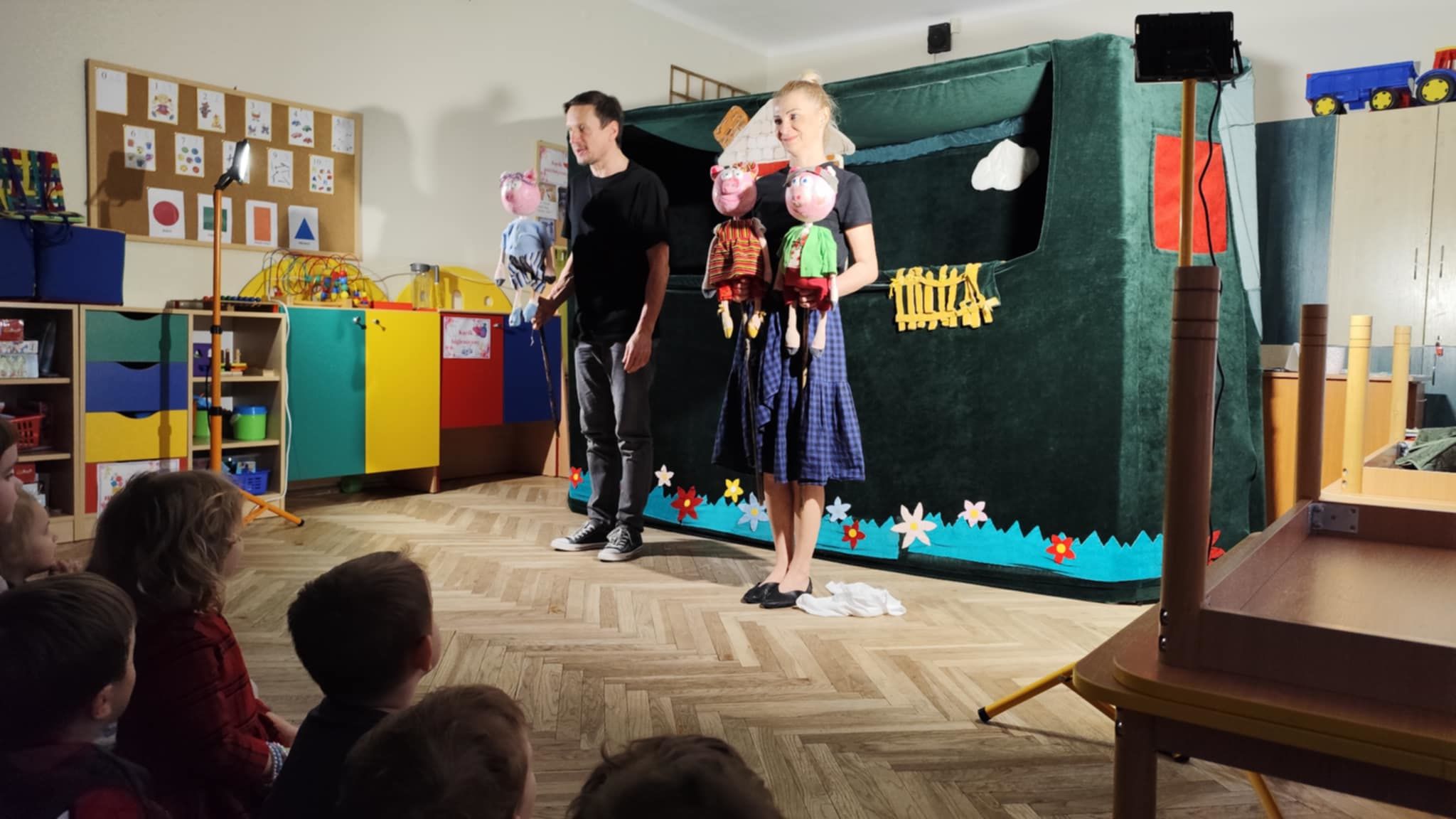 Teatrzyk "Widzimisię" kolejny raz zawitał w nasze progi. Tym razem zaprezentował spektakl "Trzy Świnki" dobrze znany dzieciom z literatury. Przedstawienie było niezwykłe, gdyż łączyło w sobie zabawę z kukiełkami oraz interakcję z prawdziwymi aktorami. Dzieci miały okazję zapoznać się z różnymi emocjami: radością, strachem, smutkiem. Poznały też, co to znaczy przyjacielska pomoc. Wspólny śpiew piosenek, oklaski i śmiech zapewniły dzieciom miłe wspomnienia z dzisiejszego dnia.