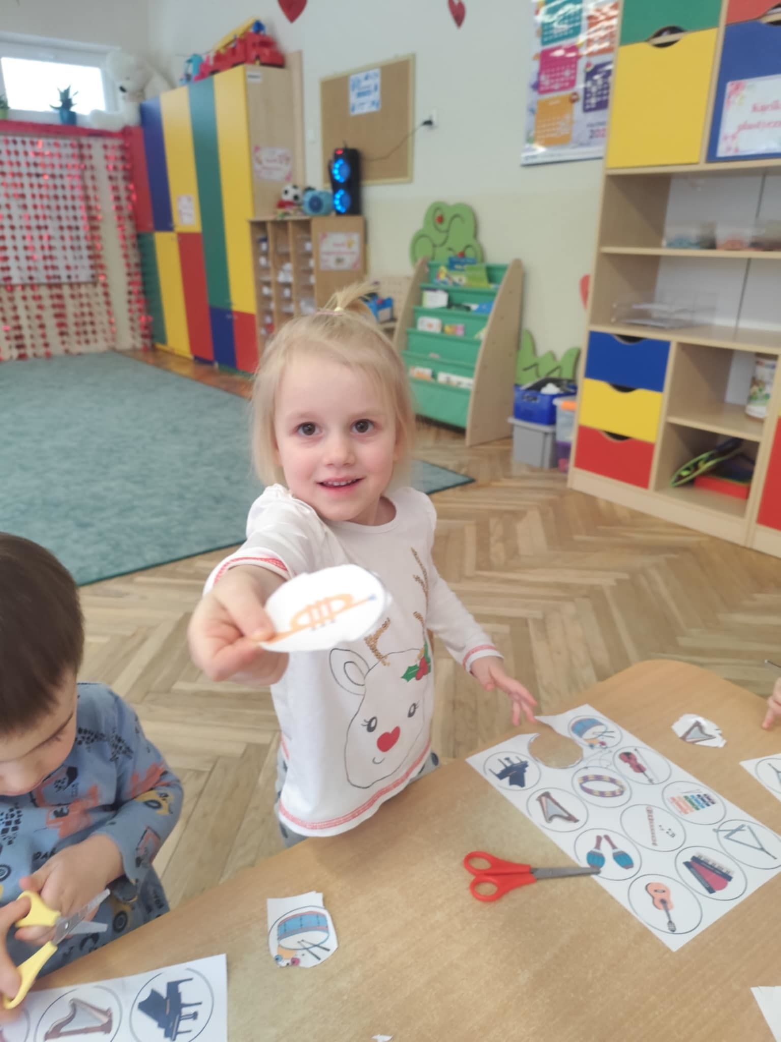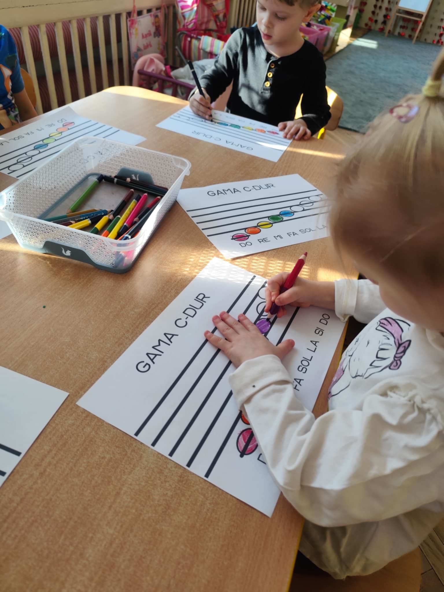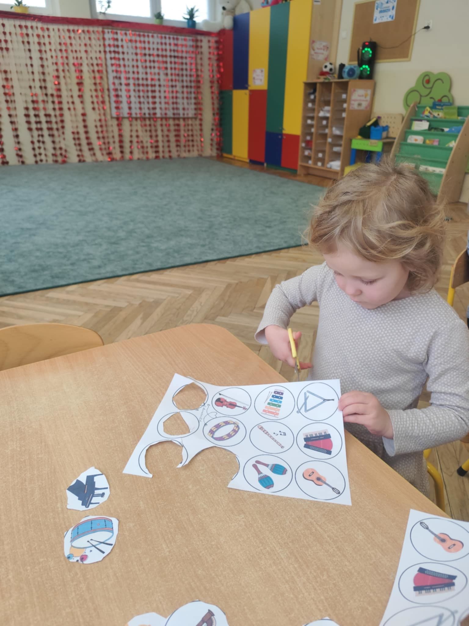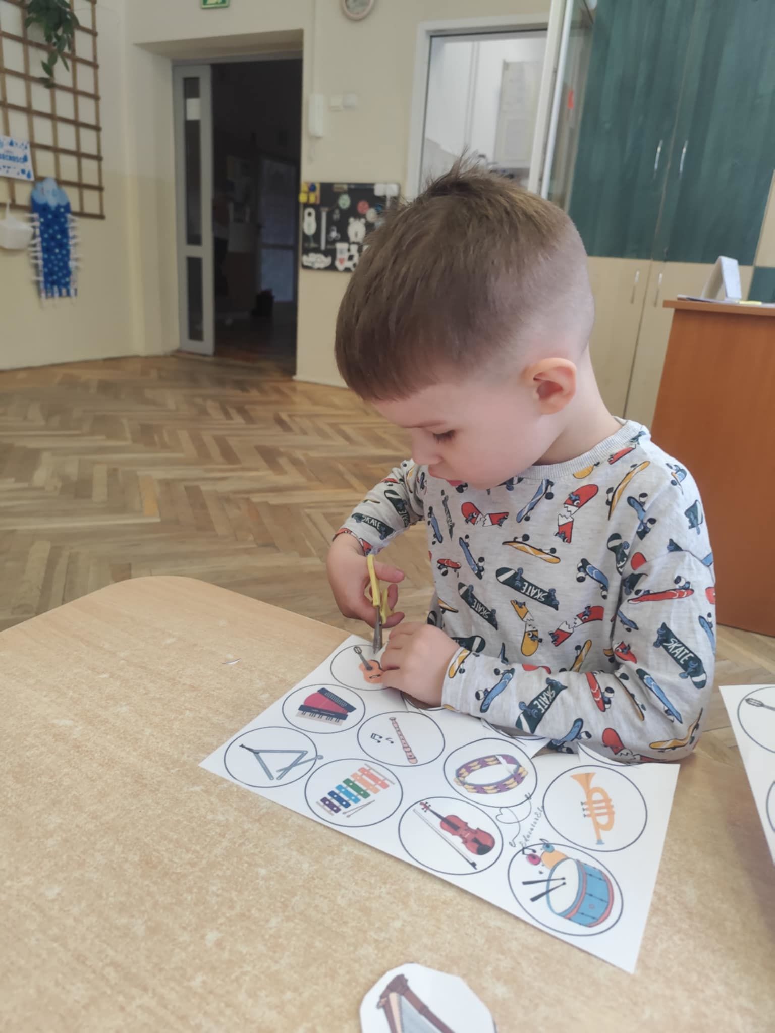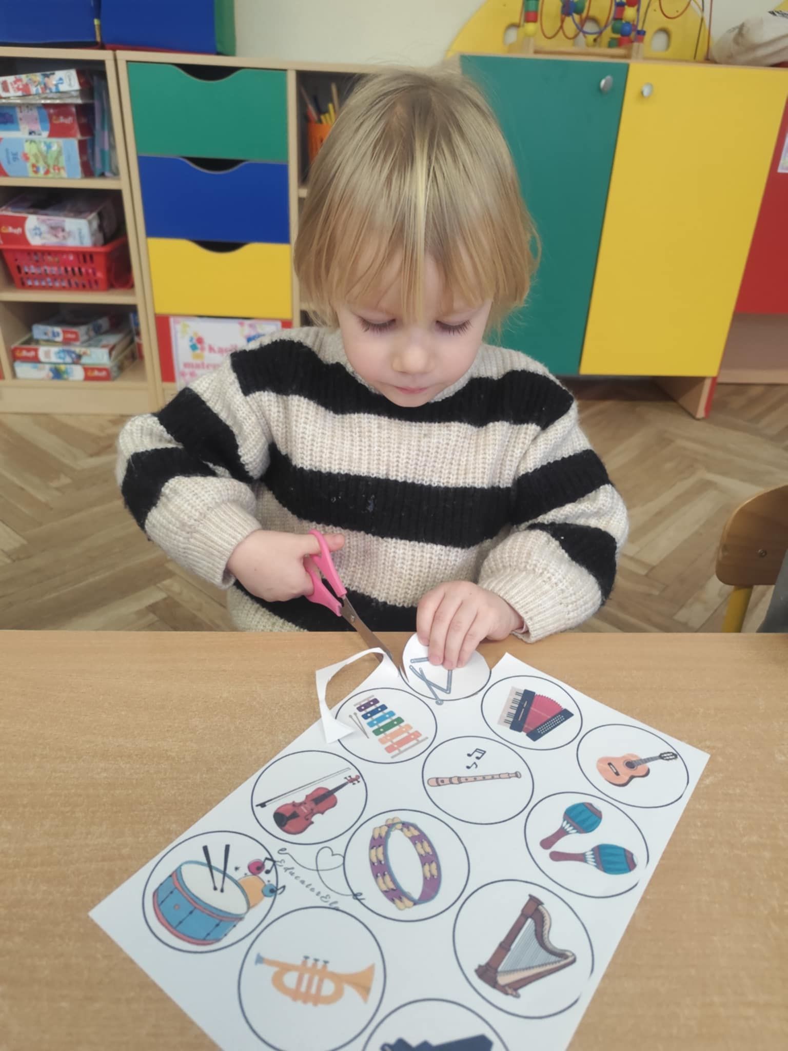 Ostatnie dni w naszej grupie upłynęły pod znakiem dźwięków i rytmu. W naszej grupie pojawił się Tydzień z Muzyką, który pozwolił dzieciom nie tylko usłyszeć, ale dosłownie dotknąć świata instrumentów. Nasze sale wypełniły się śpiewem, a maluchy z ogromnym zaangażowaniem poznawały tajniki muzycznego rzemiosła. Muzyka towarzyszyła również podczas pracy stolikowej. Dzieci trenowały prawidłowy chwyt nożyczek, wycinając małe sylwety instrumentów. Precyzyjne wycinanie tak małych elementów to dla 3-latka doskonałe ćwiczenie motoryki małej. Przygotowuje ono dłoń do nauki pisania, uczy cierpliwości oraz koordynacji ręka-oko. Nasze przedszkolaki dzielnie ćwiczyły swoje głosy, ucząc się śpiewać gamę. To nie tylko zabawa w „do-re-mi”, ale przede wszystkim: ćwiczenie słuchu wysokościowego, trening aparatu mowy i prawidłowego oddechu.