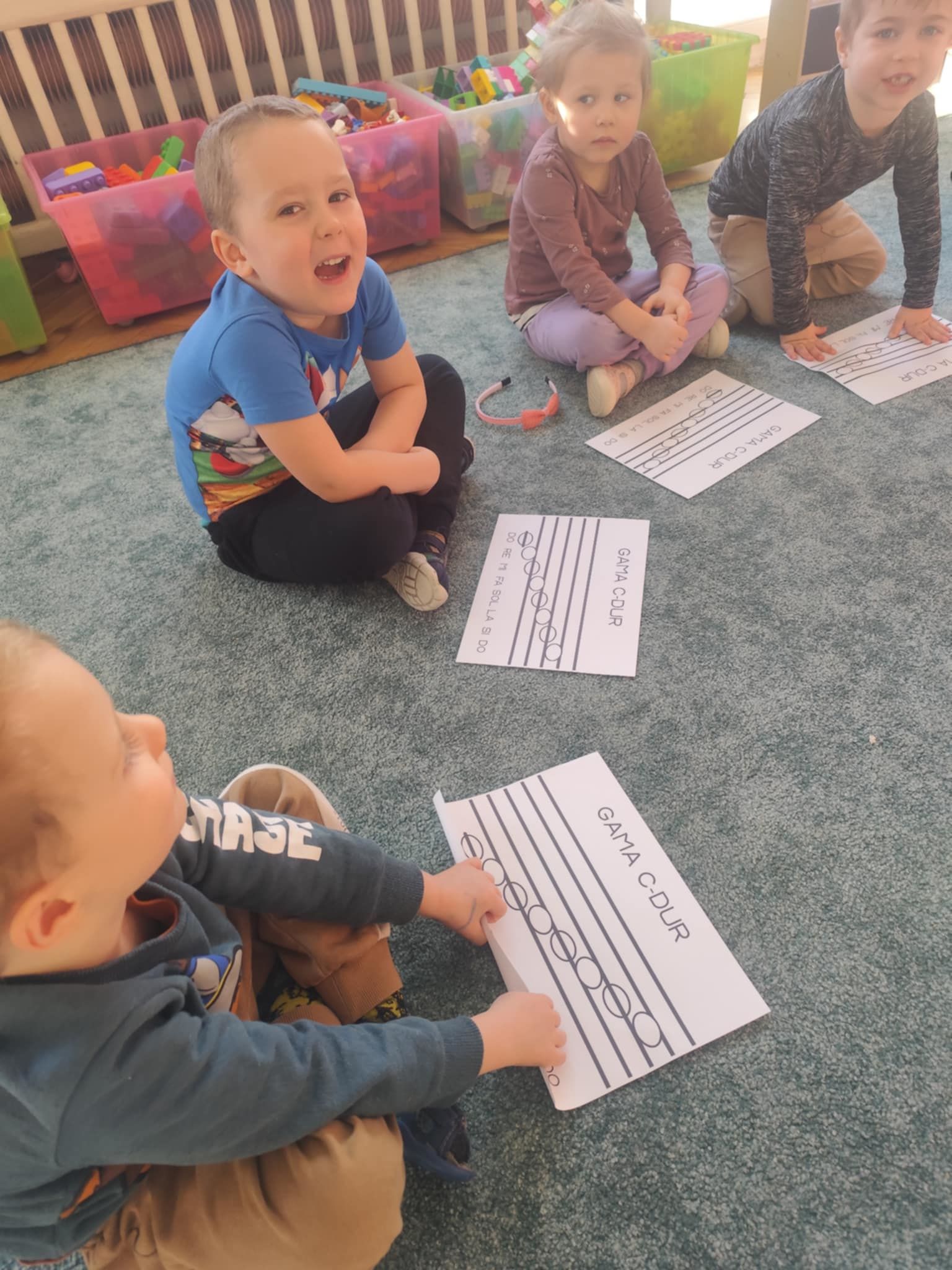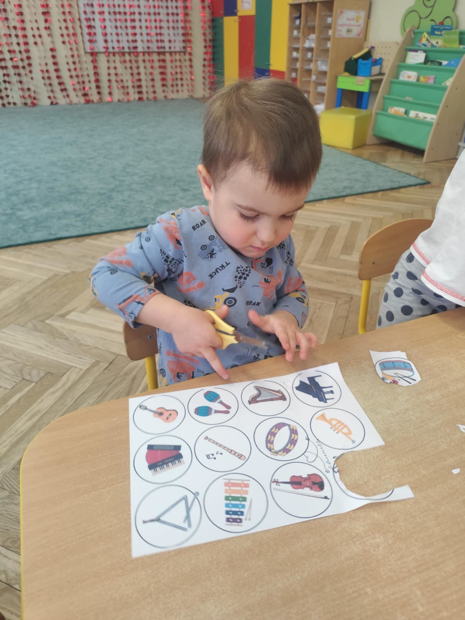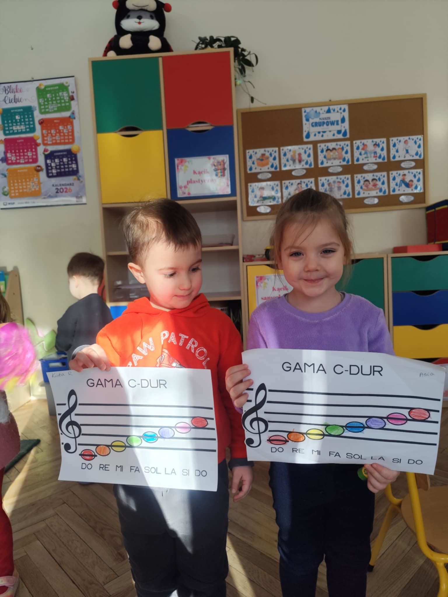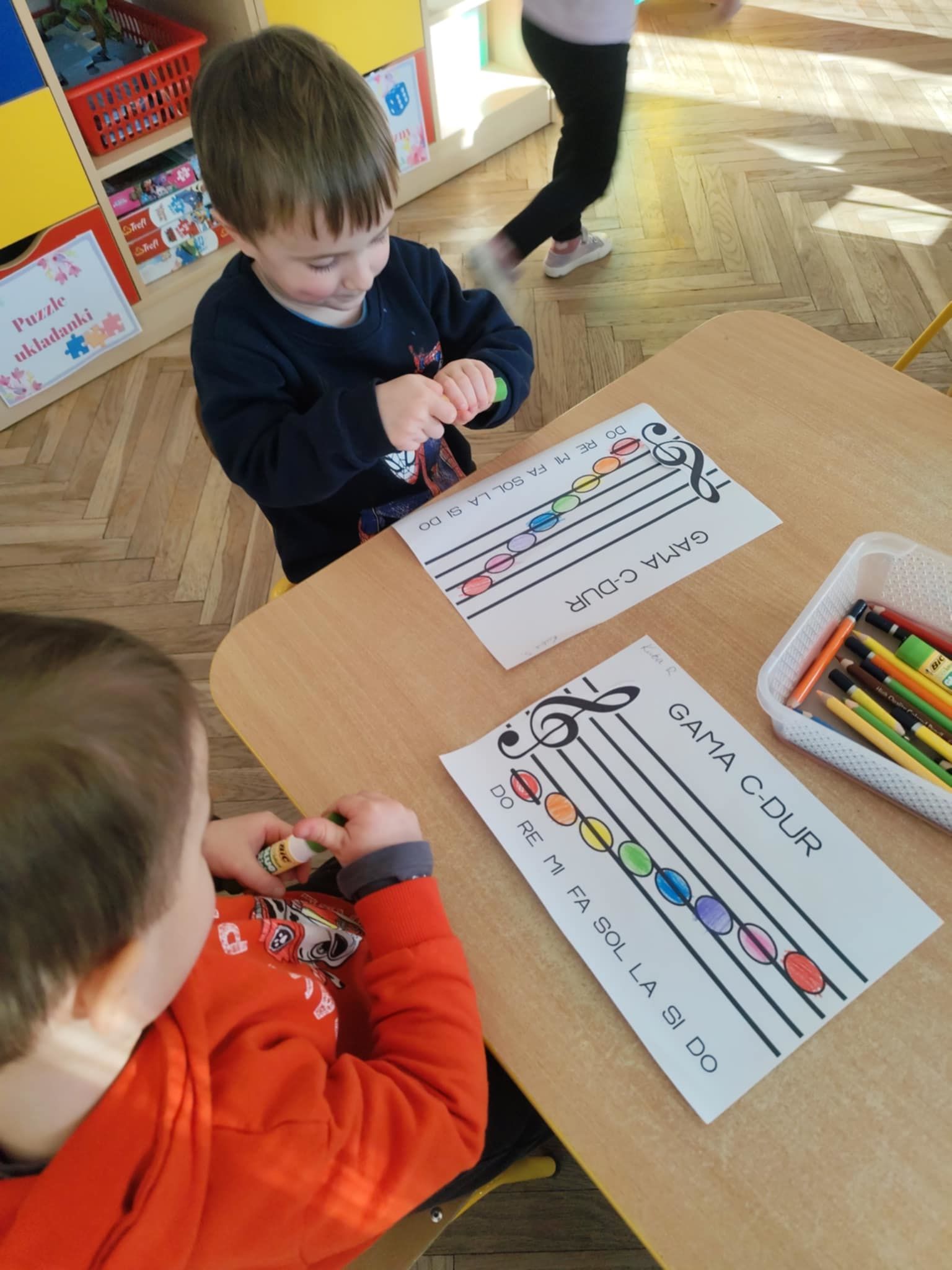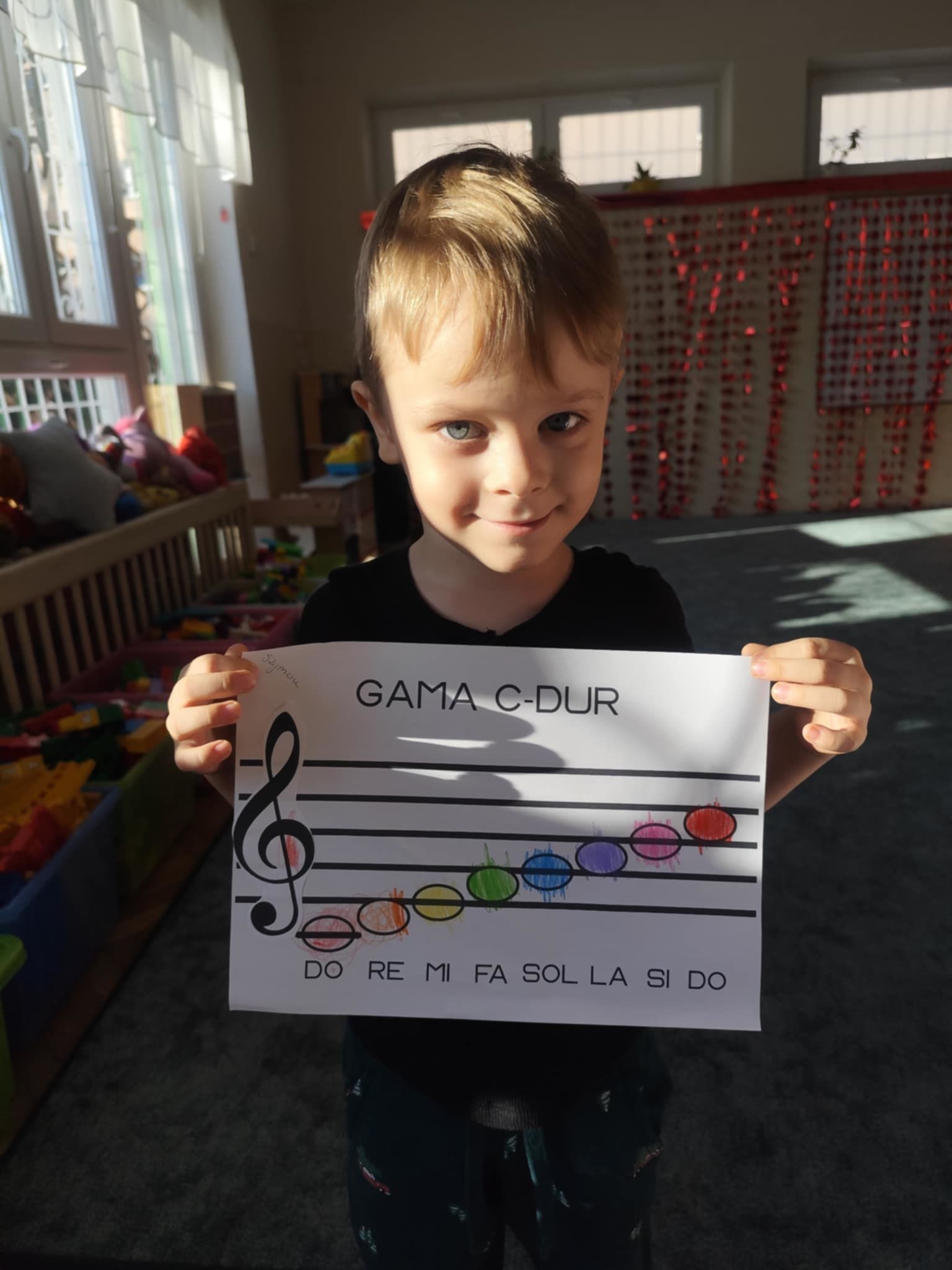 Ostatnie dni w naszej grupie upłynęły pod znakiem dźwięków i rytmu. W naszej grupie pojawił się Tydzień z Muzyką, który pozwolił dzieciom nie tylko usłyszeć, ale dosłownie dotknąć świata instrumentów. Nasze sale wypełniły się śpiewem, a maluchy z ogromnym zaangażowaniem poznawały tajniki muzycznego rzemiosła. Muzyka towarzyszyła również podczas pracy stolikowej. Dzieci trenowały prawidłowy chwyt nożyczek, wycinając małe sylwety instrumentów. Precyzyjne wycinanie tak małych elementów to dla 3-latka doskonałe ćwiczenie motoryki małej. Przygotowuje ono dłoń do nauki pisania, uczy cierpliwości oraz koordynacji ręka-oko. Nasze przedszkolaki dzielnie ćwiczyły swoje głosy, ucząc się śpiewać gamę. To nie tylko zabawa w „do-re-mi”, ale przede wszystkim: ćwiczenie słuchu wysokościowego, trening aparatu mowy i prawidłowego oddechu.