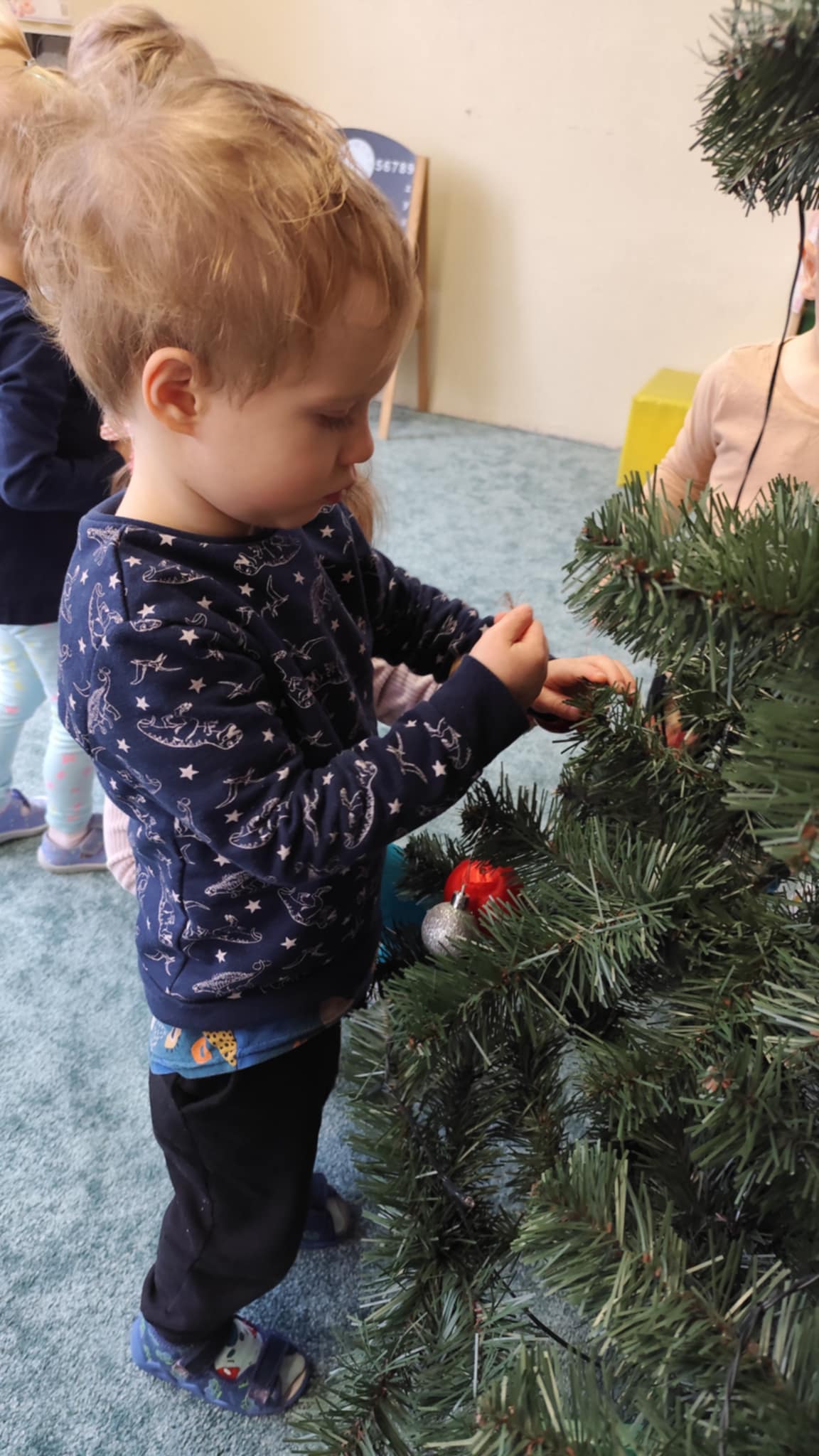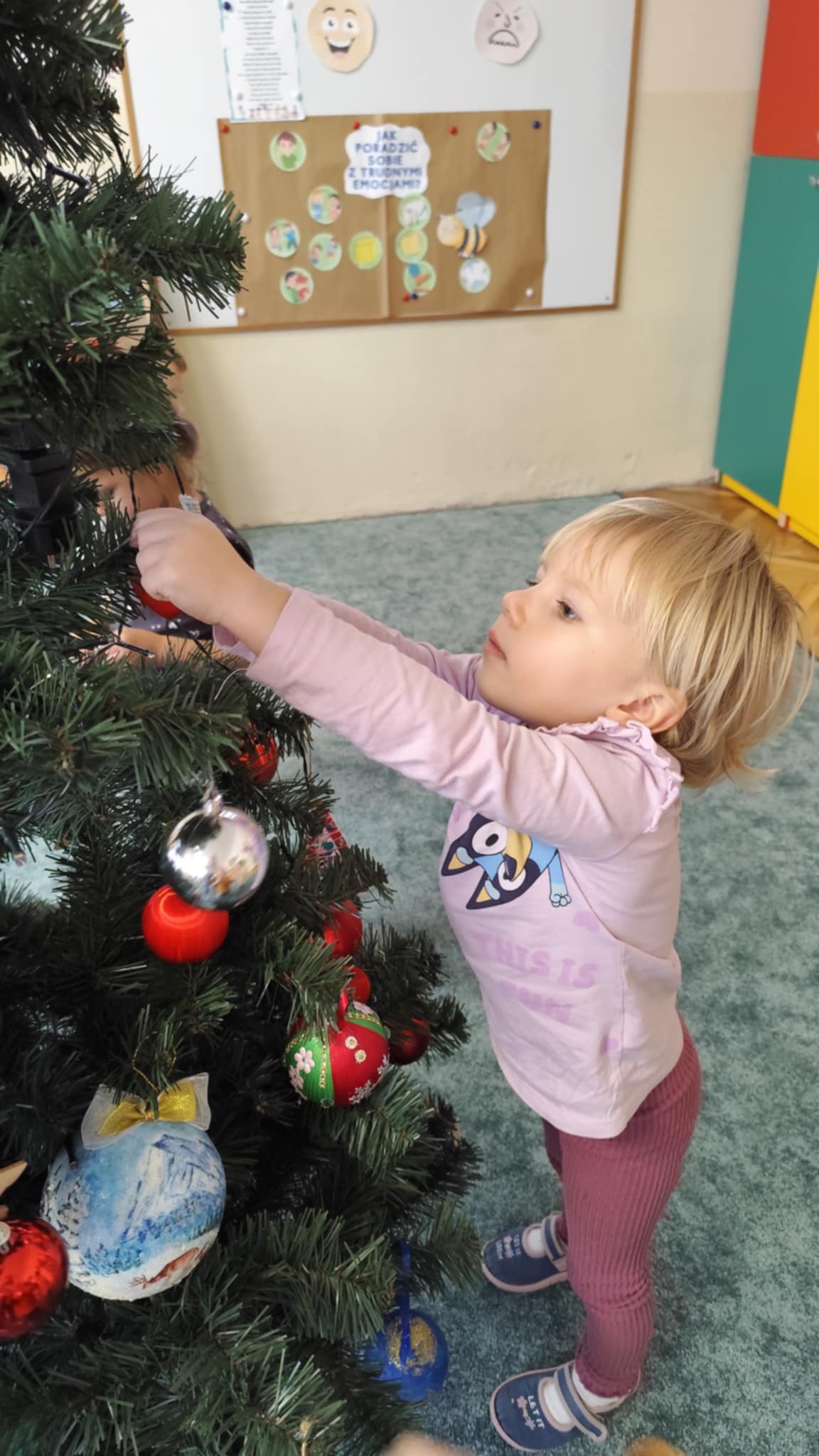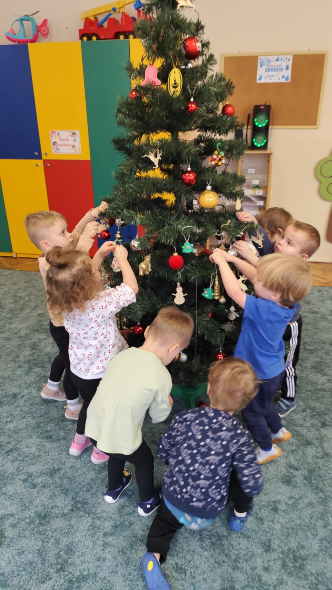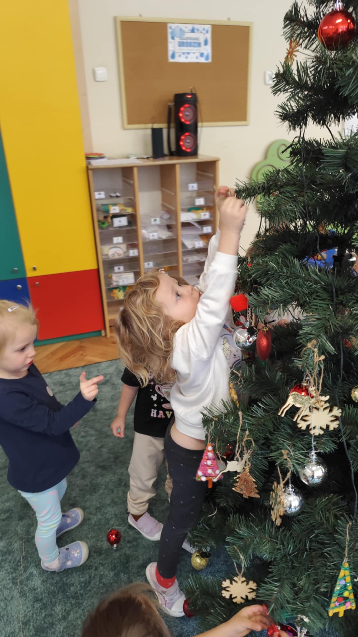 Poczuliśmy magię Świąt! Dziś wszystkie obecne Kropelki z wielką radością oraz zaangażowaniem wzięły udział w ubieraniu świątecznej choinki. Z uśmiechem na twarzach zawiesiliśmy kolorowe lampki, błyszczące łańcuchy i piękne ozdoby. Każdy maluch miał za zadanie powiesić chociaż jedną bombkę na drzewku. Wspólnymi siłami stworzyliśmy prawdziwe, świąteczne dzieło sztuki. Choinka została przystrojona bardzo szybko, wygląda wyjątkowo i przypomina nam, że Święta Bożego Narodzenia już tuż, tuż… i Mikołaj jest bardzo blisko.