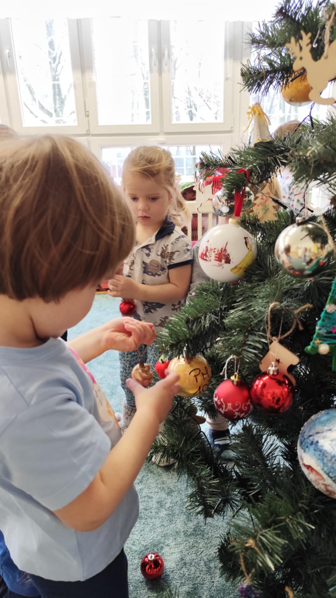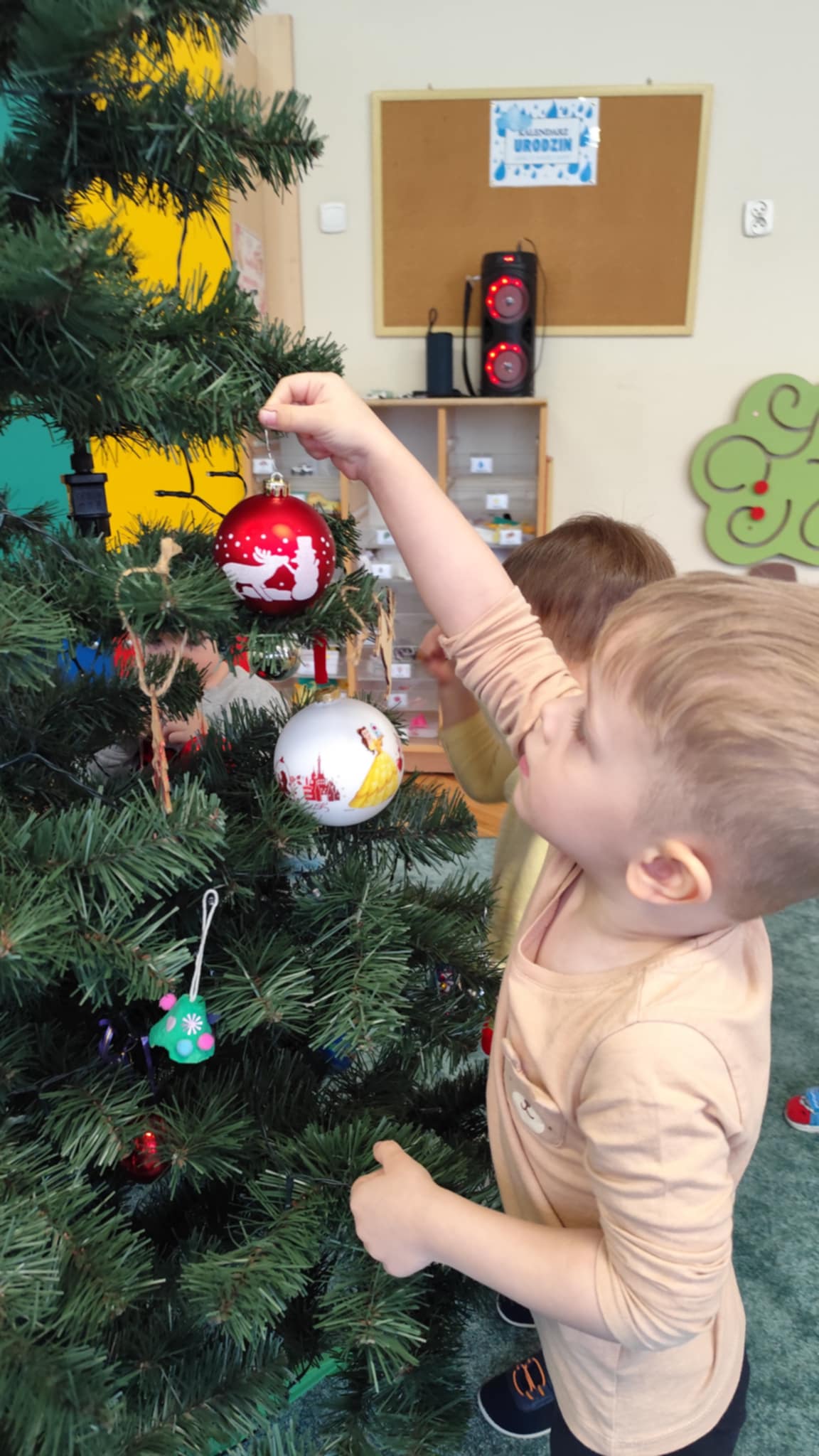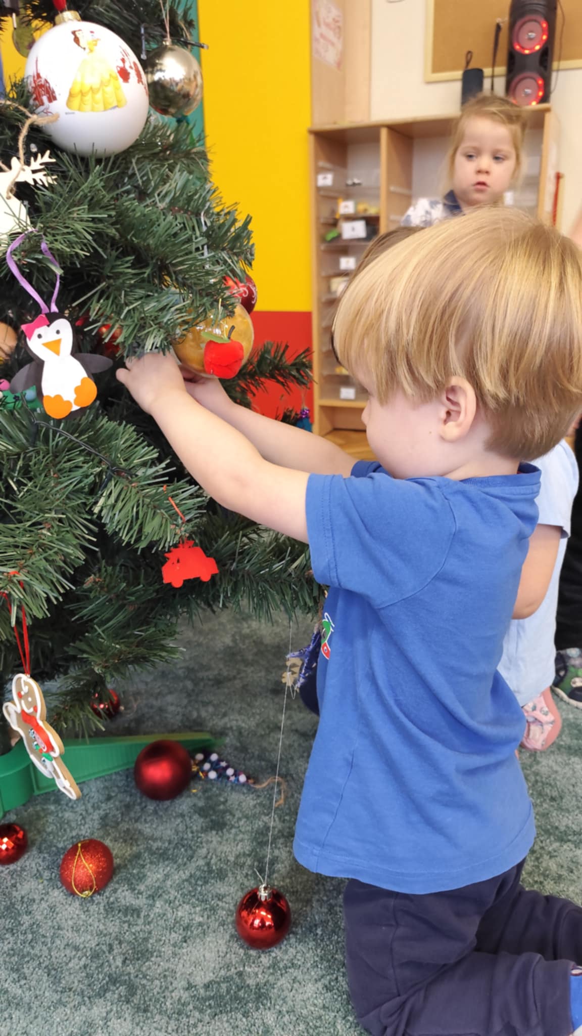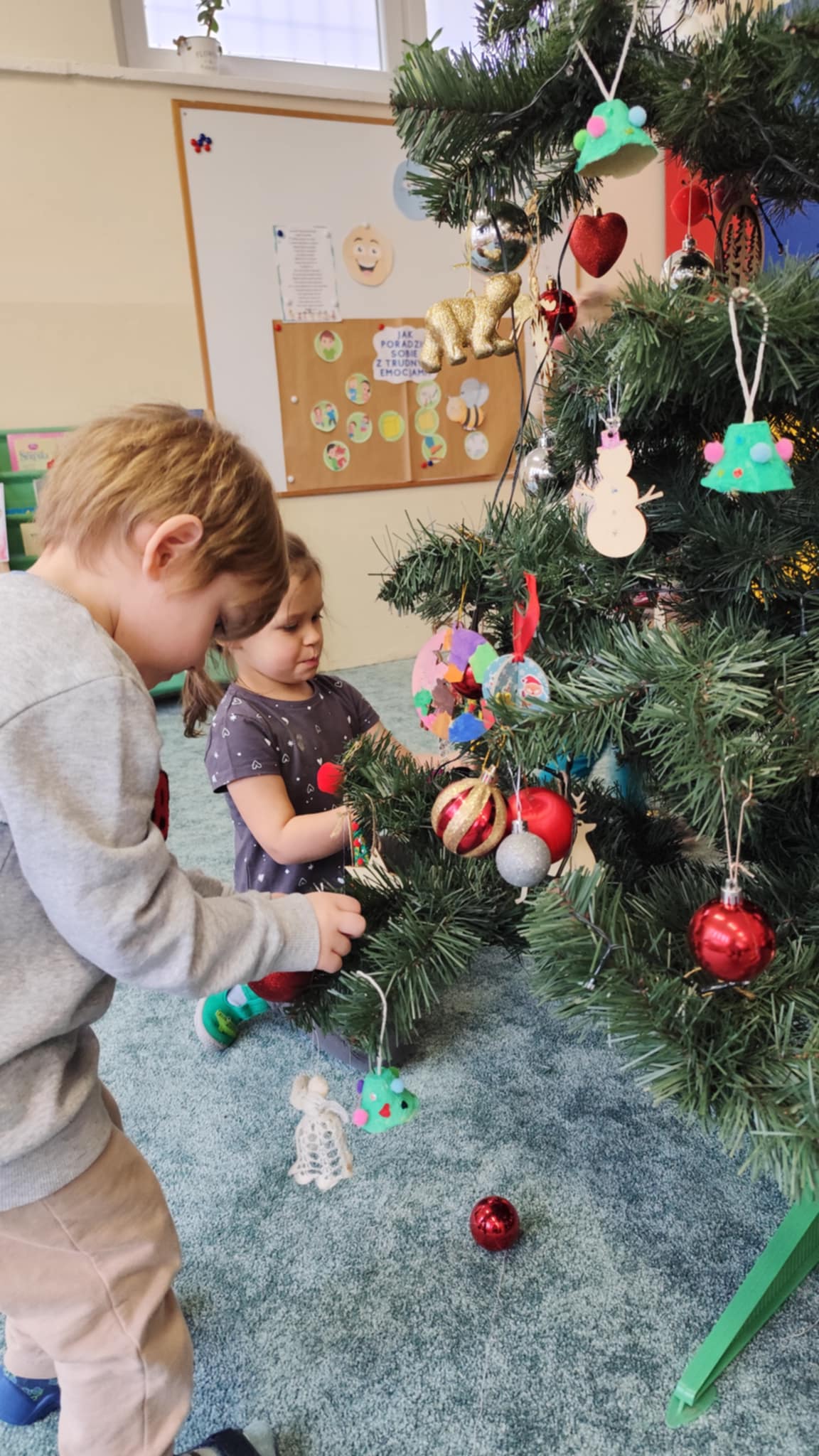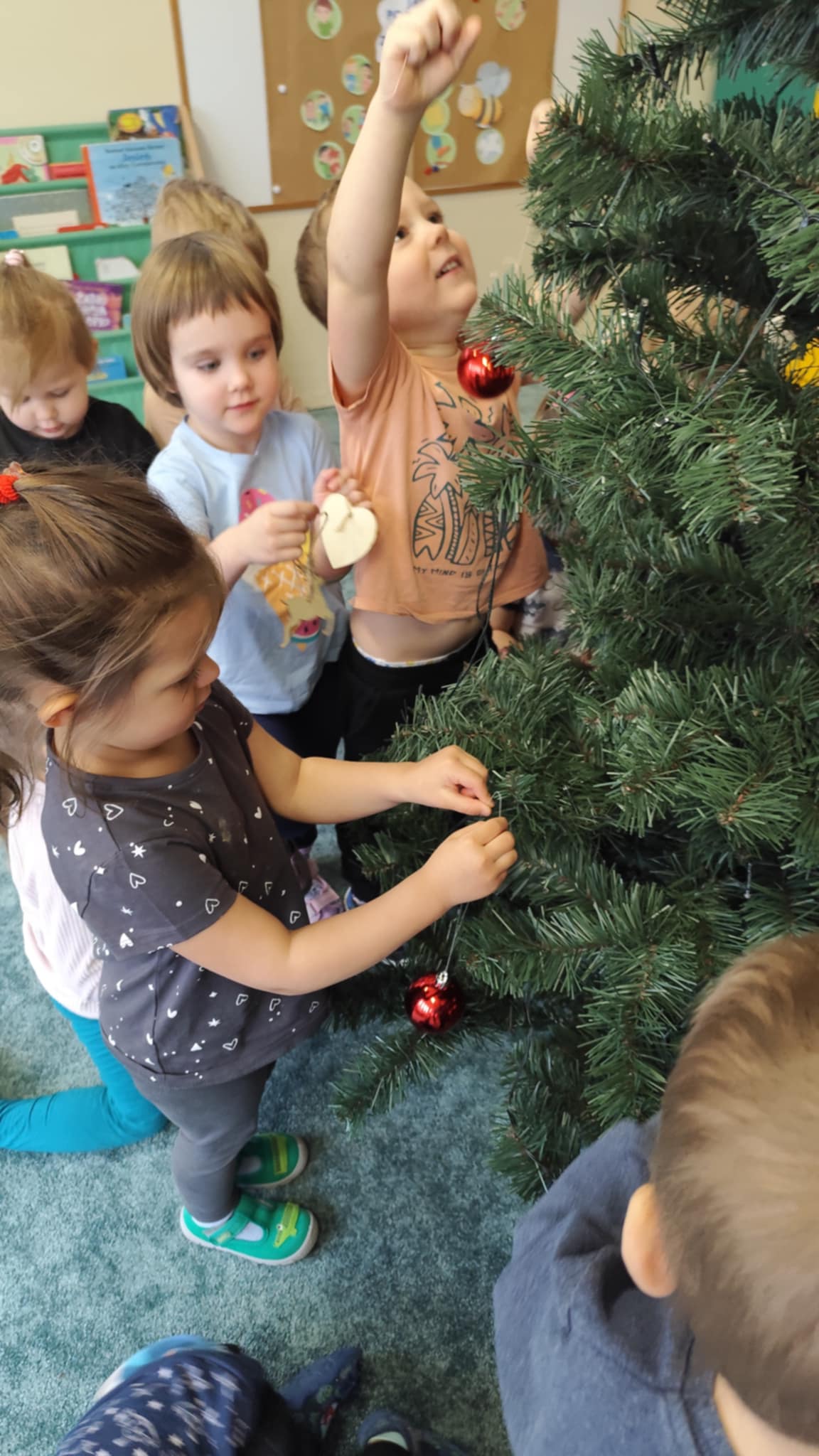 Poczuliśmy magię Świąt! Dziś wszystkie obecne Kropelki z wielką radością oraz zaangażowaniem wzięły udział w ubieraniu świątecznej choinki. Z uśmiechem na twarzach zawiesiliśmy kolorowe lampki, błyszczące łańcuchy i piękne ozdoby. Każdy maluch miał za zadanie powiesić chociaż jedną bombkę na drzewku. Wspólnymi siłami stworzyliśmy prawdziwe, świąteczne dzieło sztuki. Choinka została przystrojona bardzo szybko, wygląda wyjątkowo i przypomina nam, że Święta Bożego Narodzenia już tuż, tuż… i Mikołaj jest bardzo blisko.