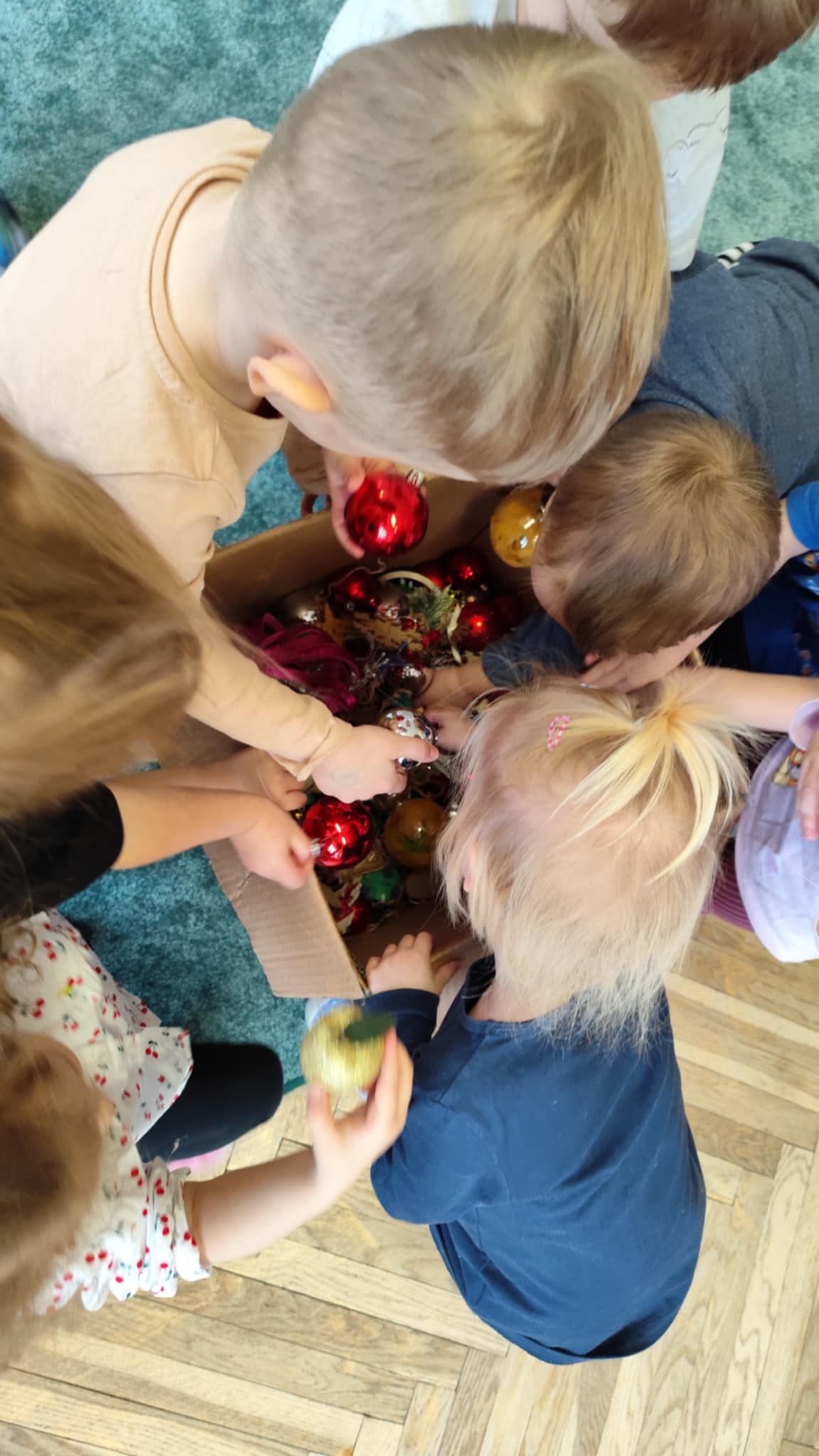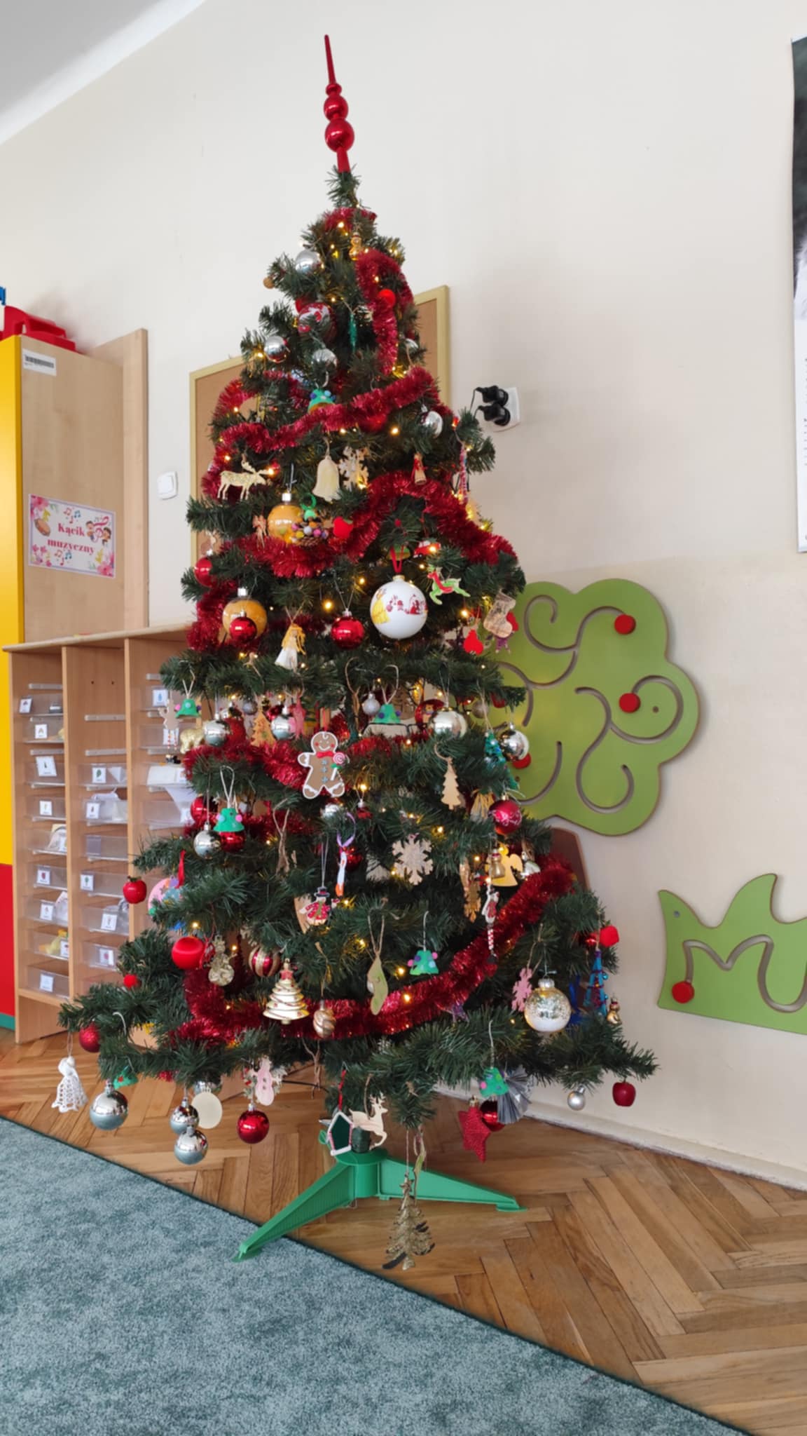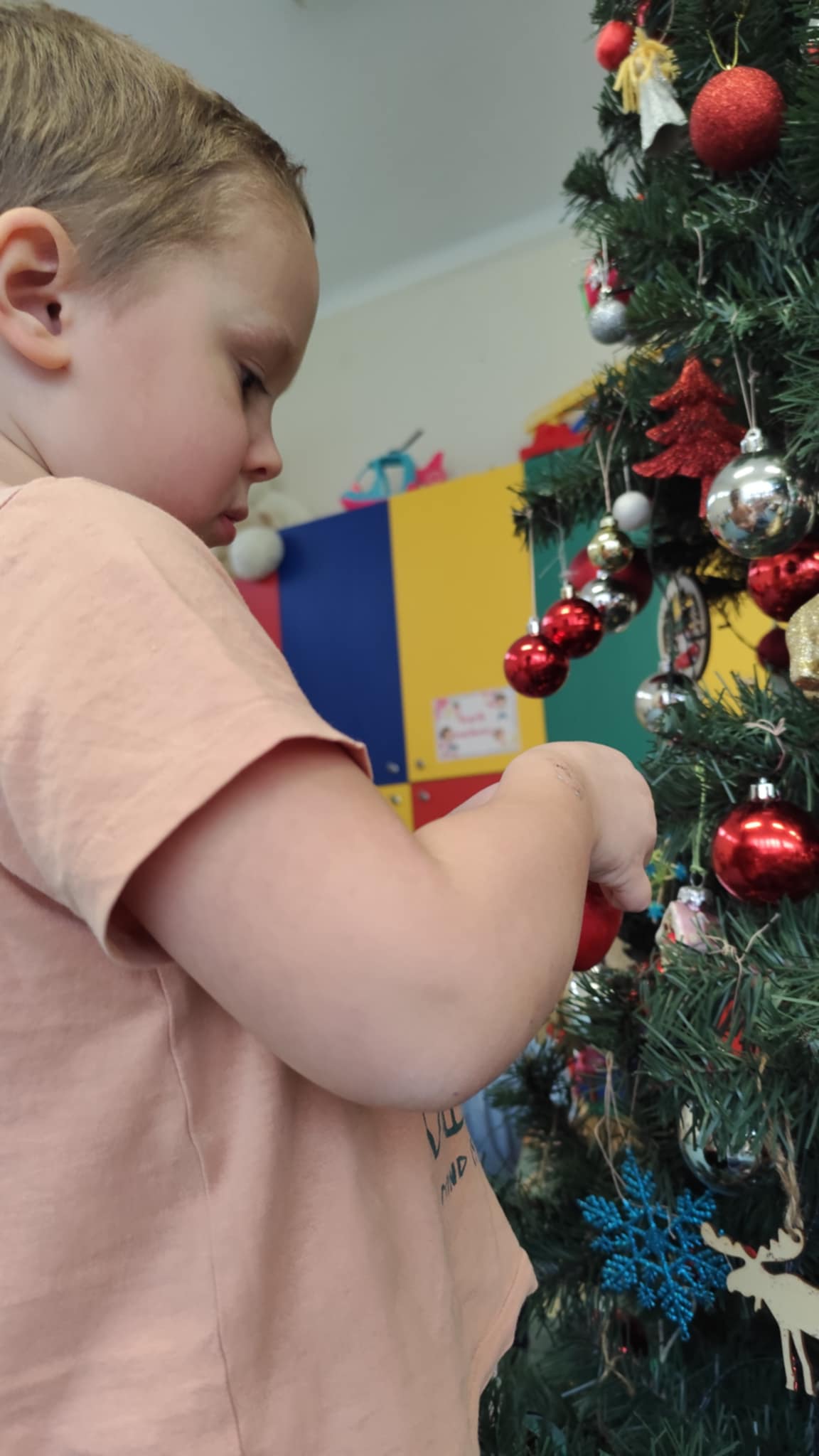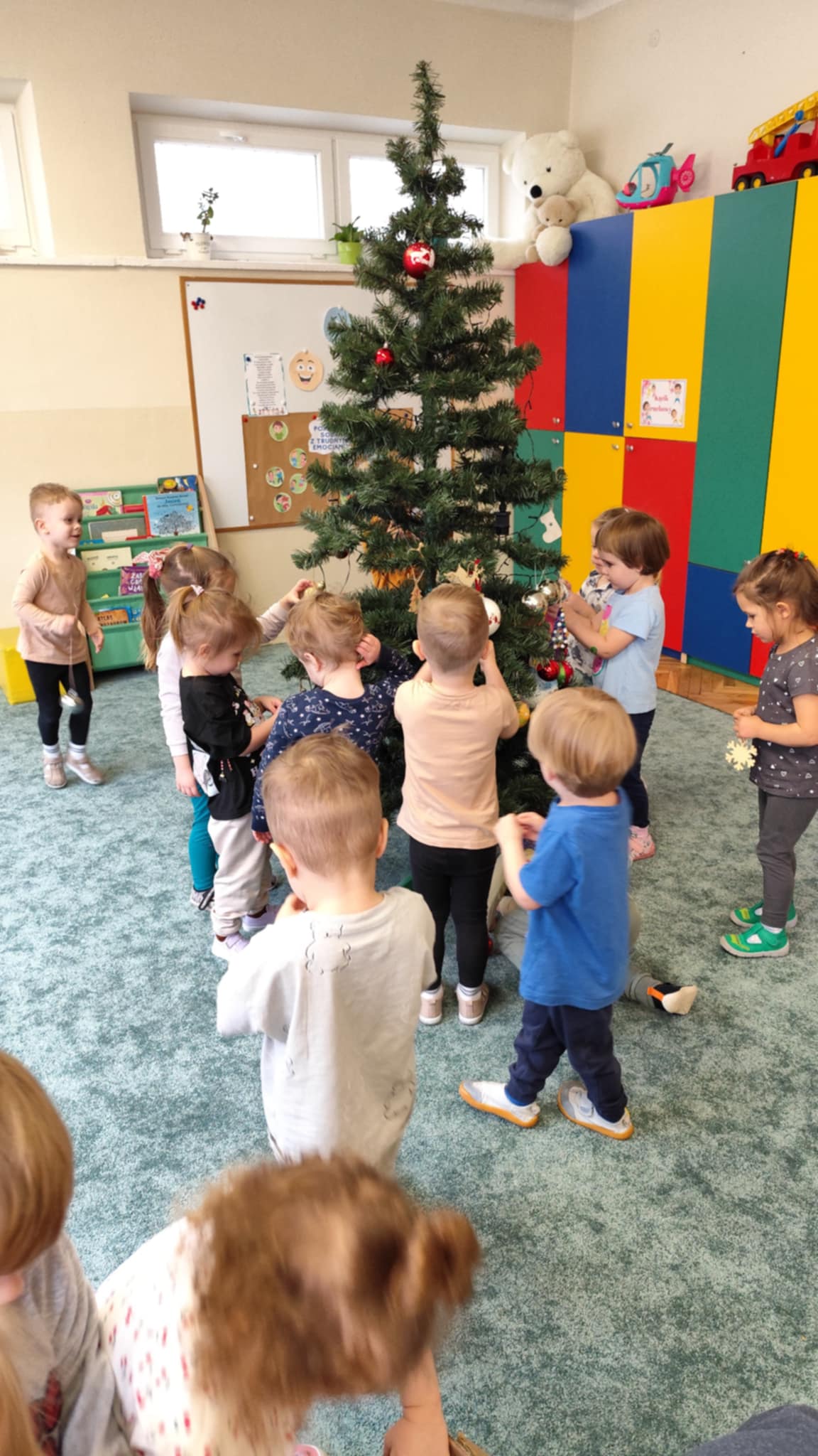 Poczuliśmy magię Świąt! Dziś wszystkie obecne Kropelki z wielką radością oraz zaangażowaniem wzięły udział w ubieraniu świątecznej choinki. Z uśmiechem na twarzach zawiesiliśmy kolorowe lampki, błyszczące łańcuchy i piękne ozdoby. Każdy maluch miał za zadanie powiesić chociaż jedną bombkę na drzewku. Wspólnymi siłami stworzyliśmy prawdziwe, świąteczne dzieło sztuki. Choinka została przystrojona bardzo szybko, wygląda wyjątkowo i przypomina nam, że Święta Bożego Narodzenia już tuż, tuż… i Mikołaj jest bardzo blisko.
