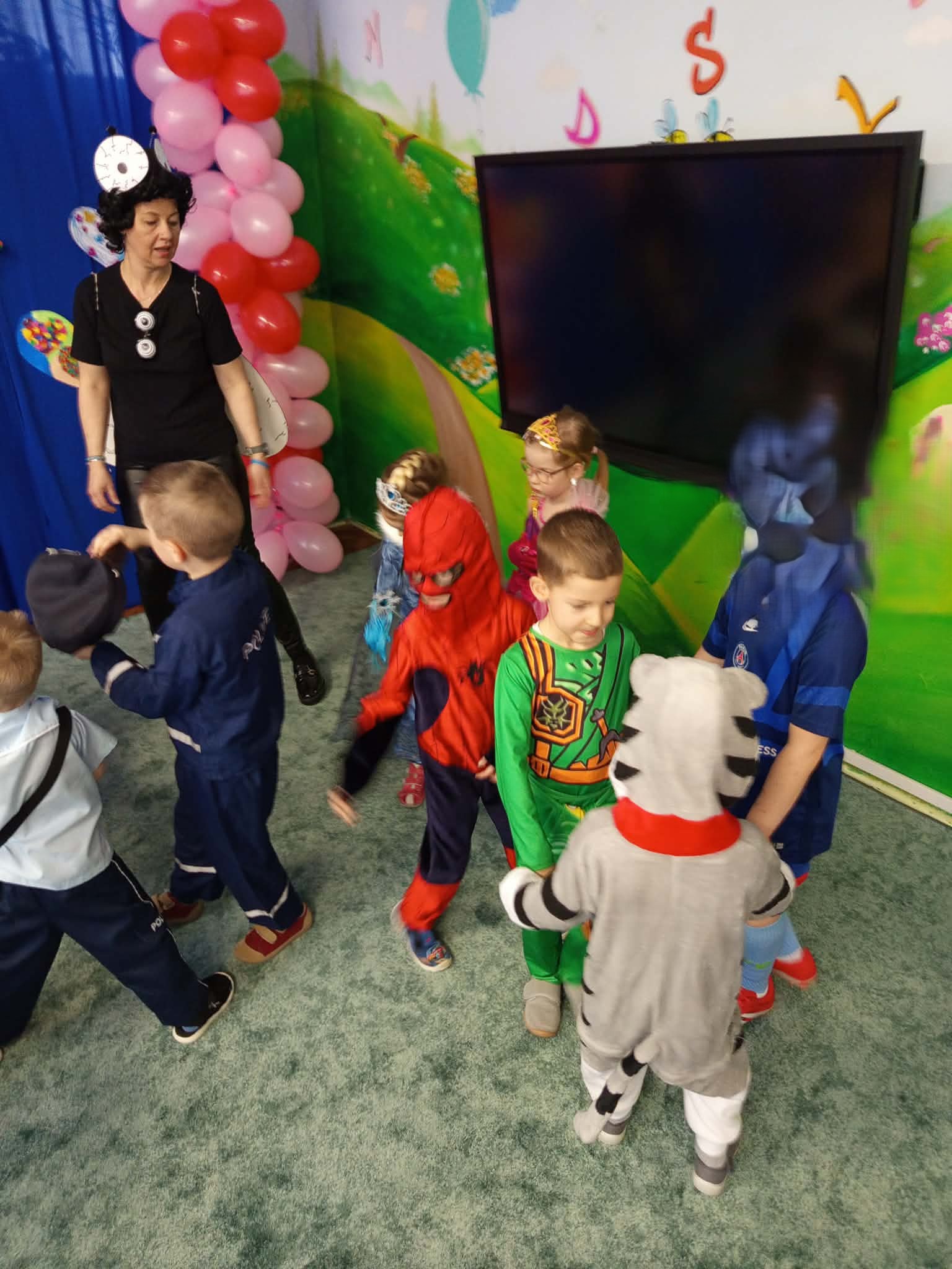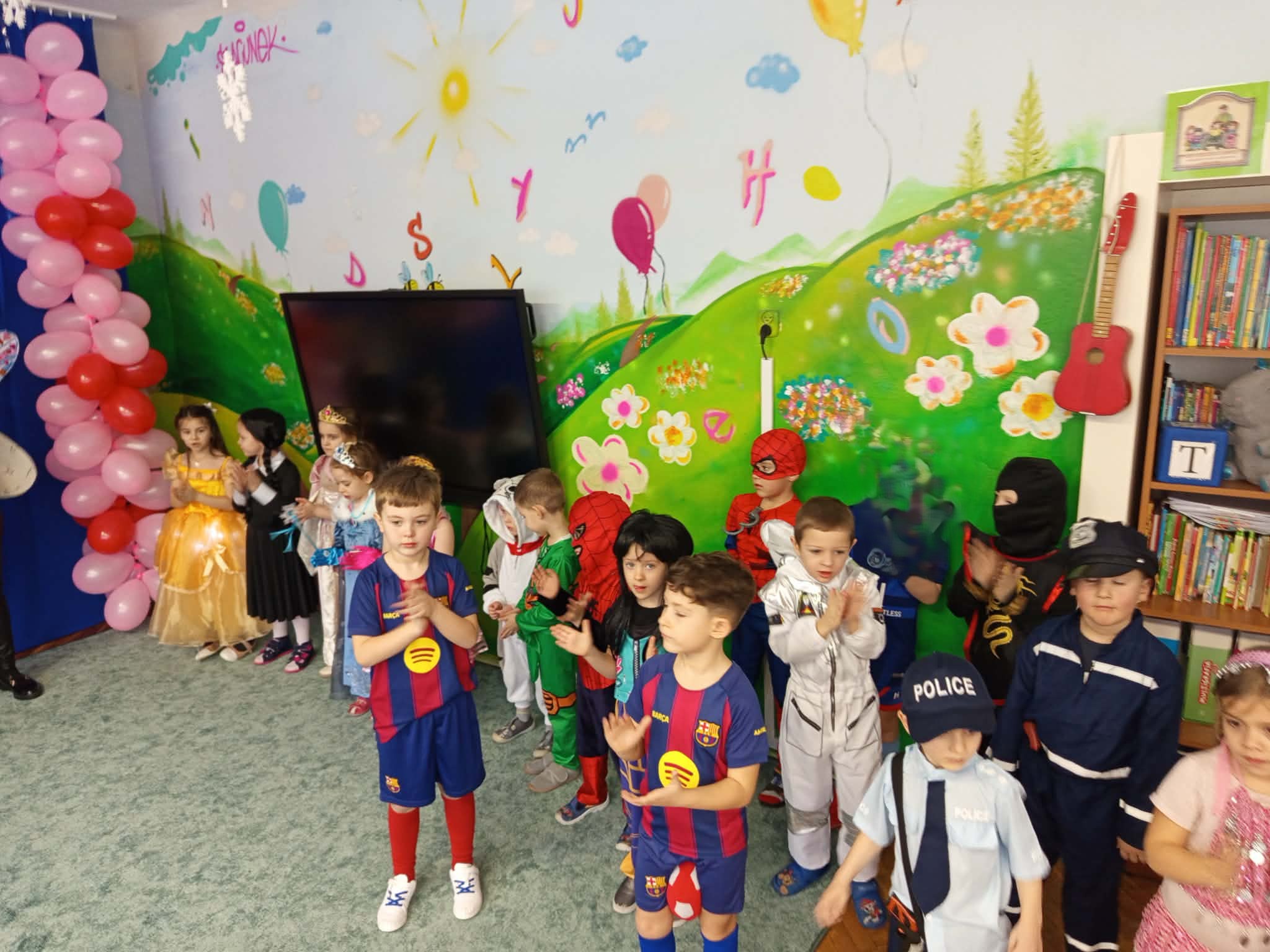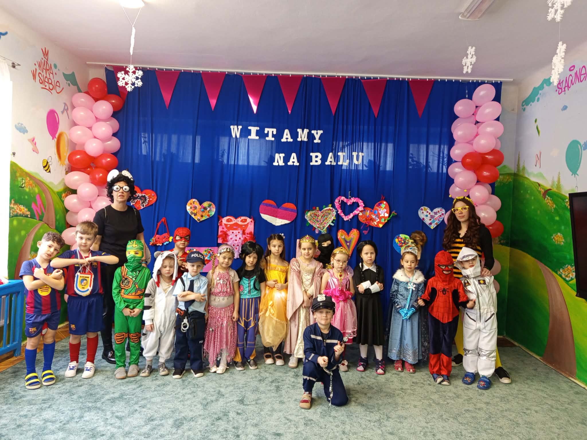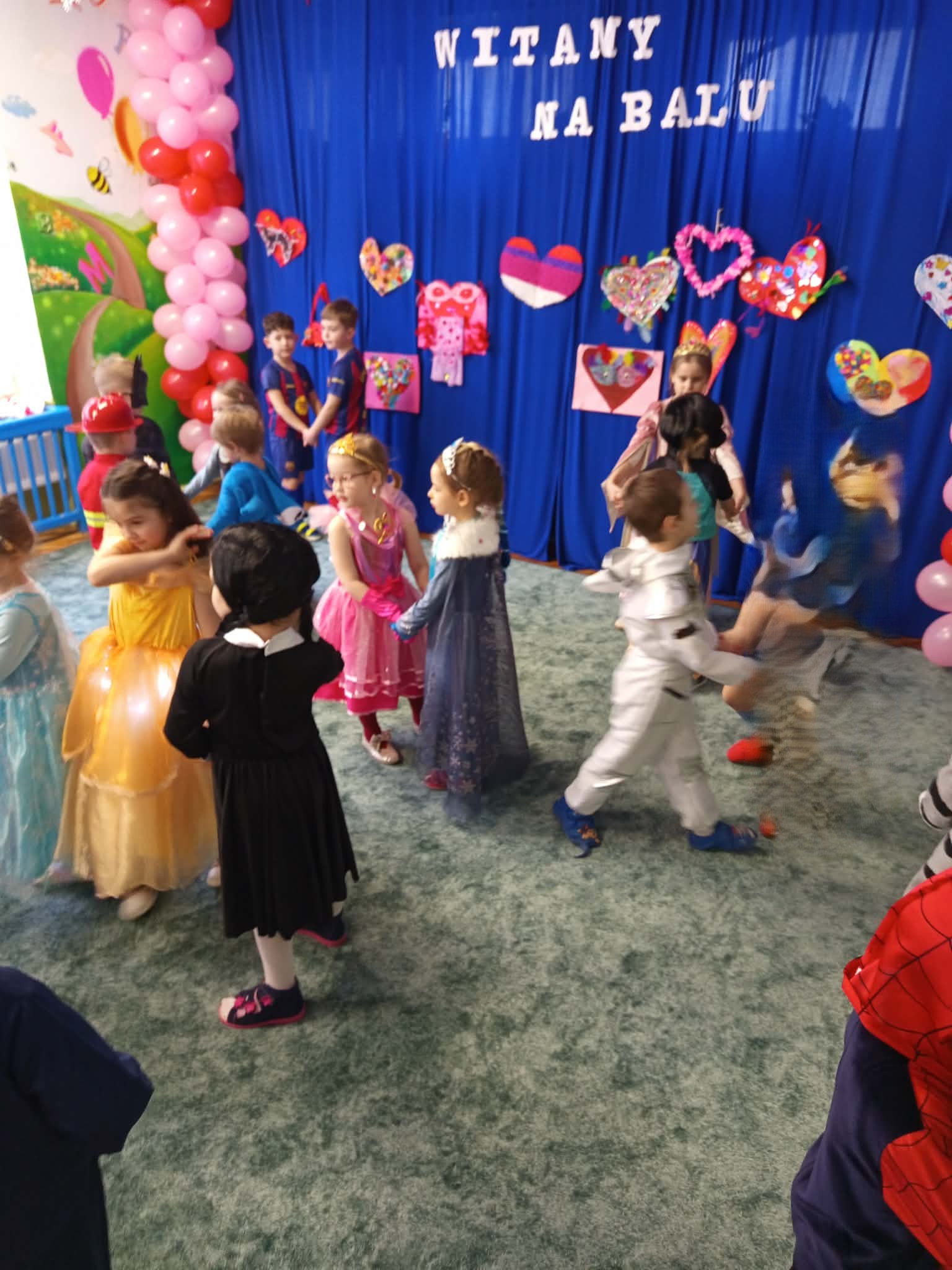 WSZYSCY BAWIĄ SIĘ WSPANIALE – JAK CO ROKU W KARNAWALE, bo karnawał to miła tradycja przepełniona muzyką i zabawą, gdzie ważnym elementem tego okresu są bale karnawałowe. Bal karnawałowy dla przedszkolaków to dzień niezwykły, często wyczekiwany przez wiele tygodni. Tego dnia już od rana w przedszkolu pojawiały się kolorowe postacie. Dzieci przebrane były za bohaterów znanych bajek . Wystrój sali balowej nawiązywał do Walentynek i wprowadził radosny nastrój oraz zachęcał wszystkich do wesołej zabawy. Dzieci świetnie się bawiły uczestnicząc wspólnie w zabawach , konkursach i tańcząc przy swoich ulubionych utworach. Wspólna zabawa przyniosła wiele radości naszym wychowankom, a to było głównym celem tego balu. Dziękujemy Dzieciom i Rodzicom za zaangażowanie w przygotowanie pięknych balowych strojów.