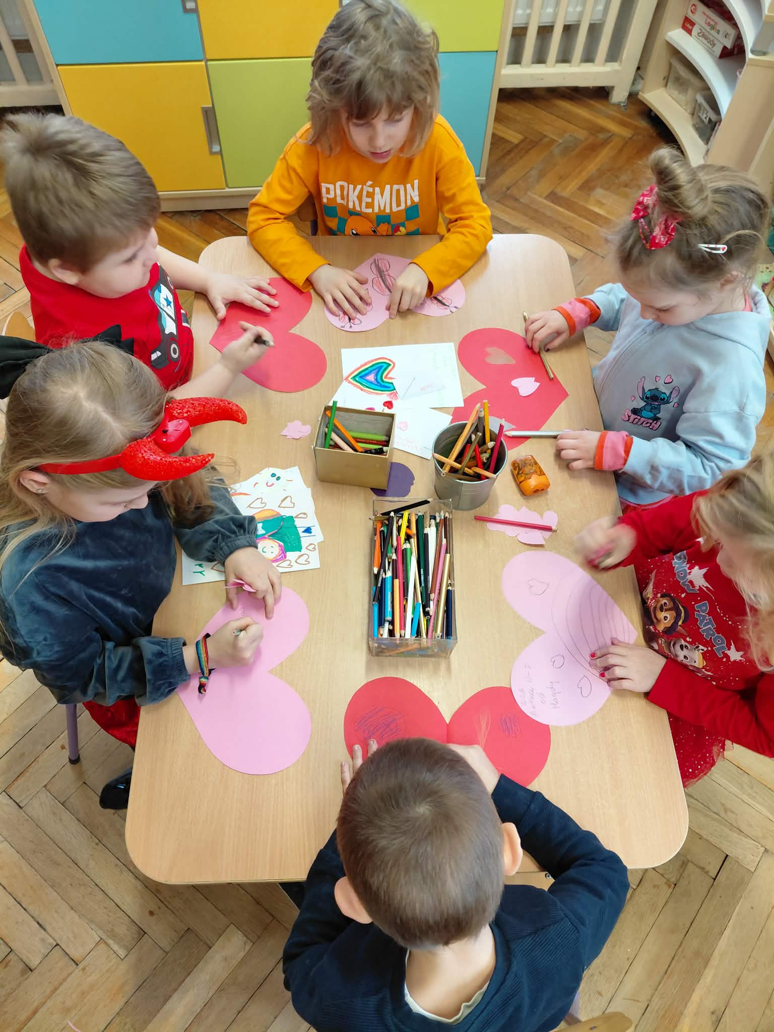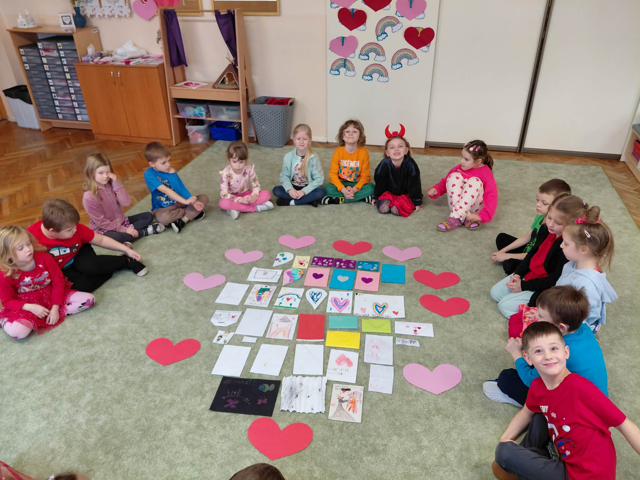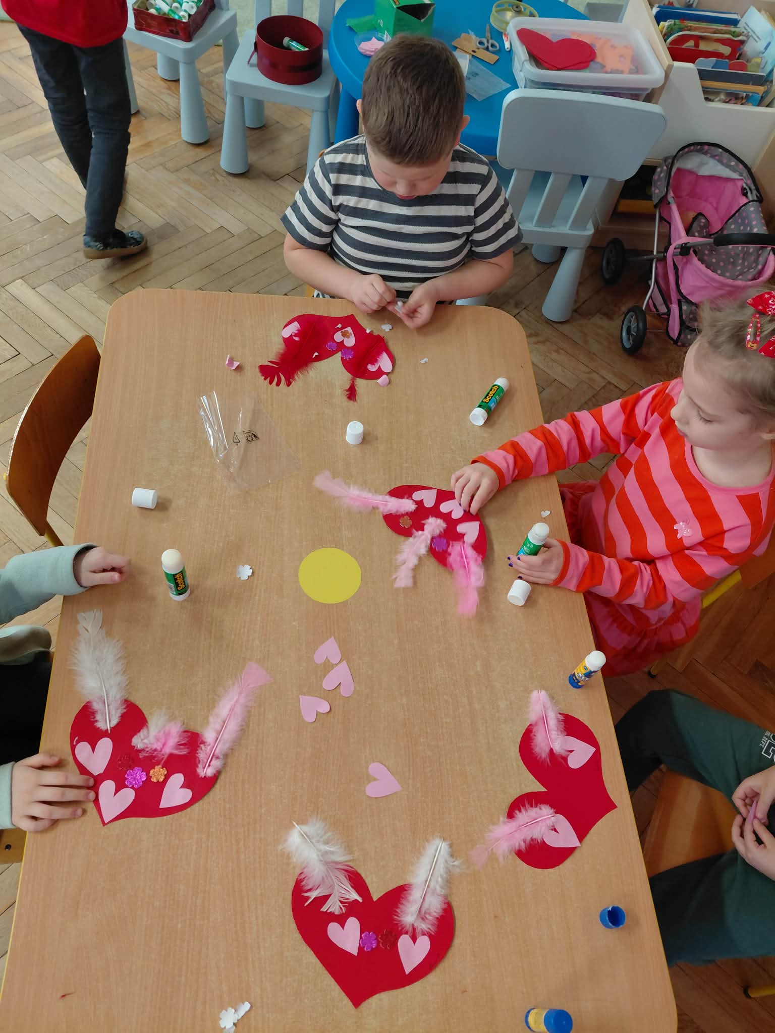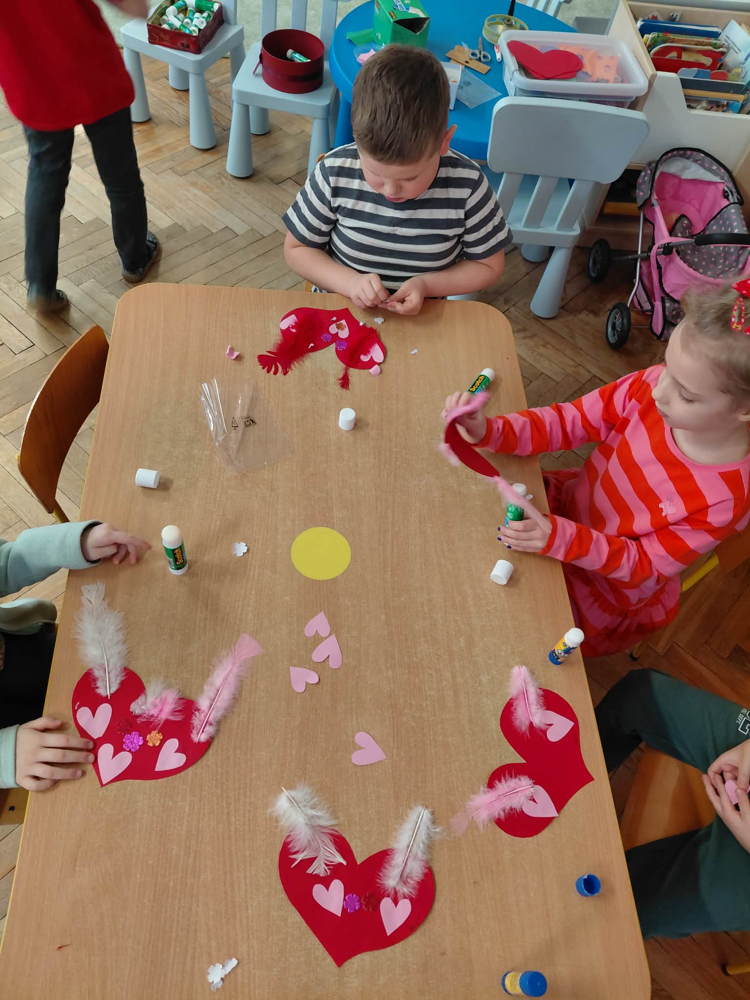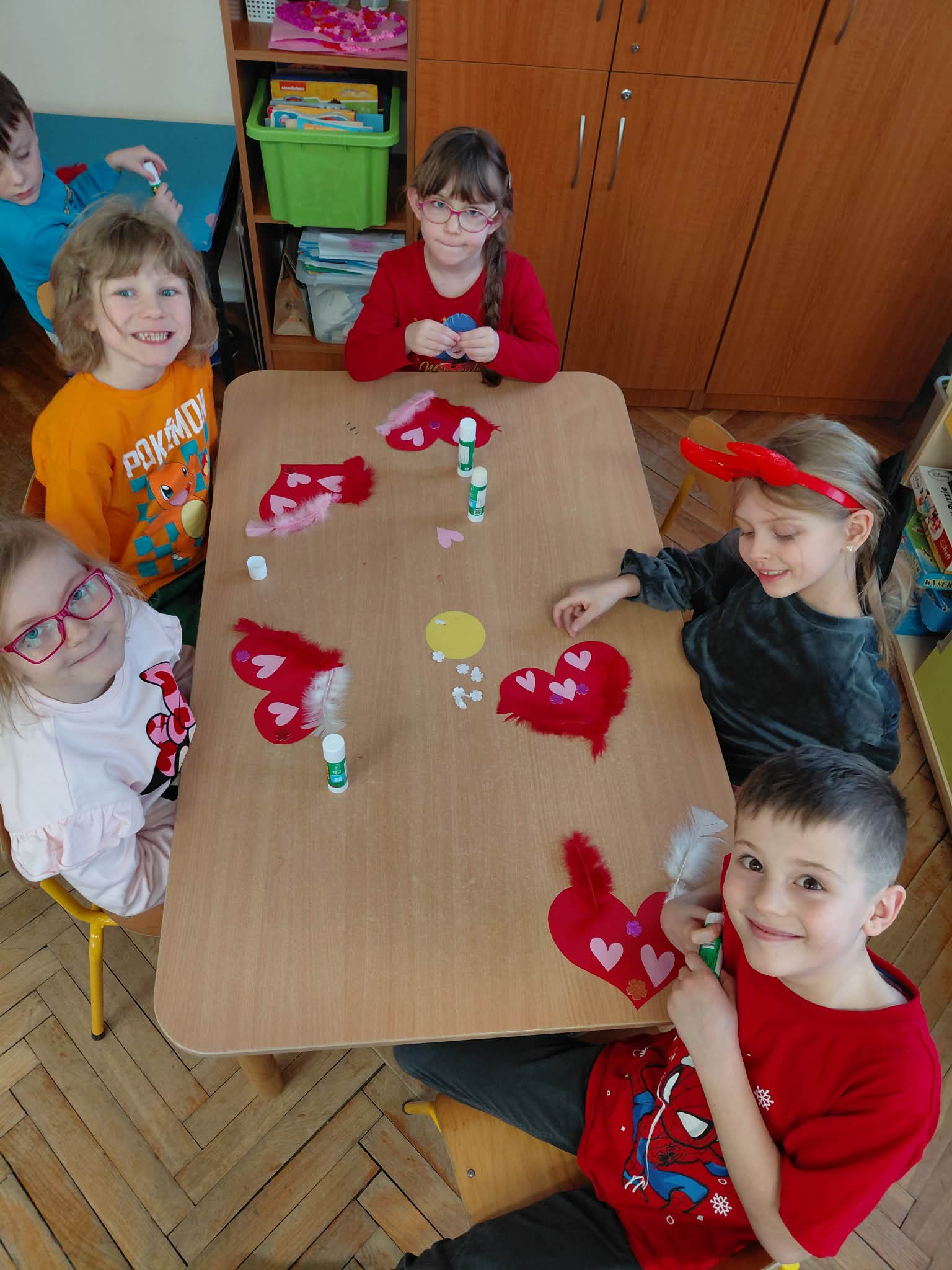 W lutym świętowaliśmy w naszej grupie WALENTYNKI. W piątek rozdaliśmy sobie wszyscy wykonane przez dzieci walentynki z naszej poczty walentynkowej. Wykonaliśmy również walentynkową pracę plastyczną, składaliśmy sobie życzenia i rozmawialiśmy o tym święcie. Chętne dzieci przyszły ubrane na czerwono.