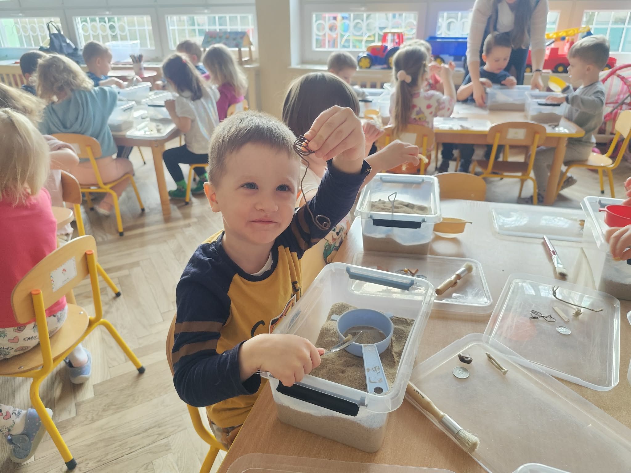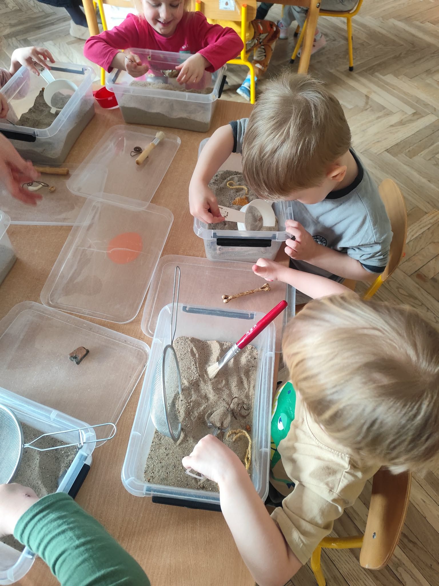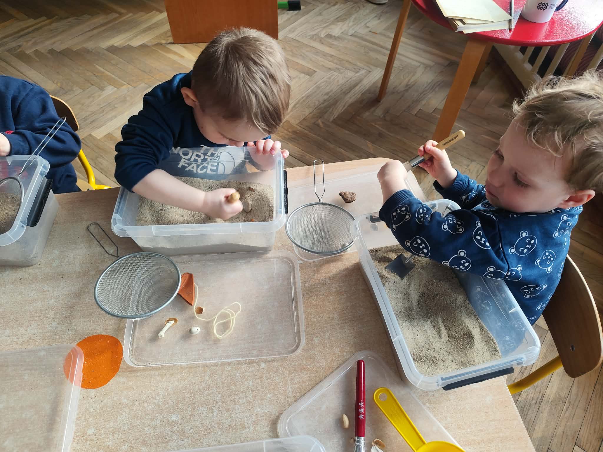Wielkie wykopaliska: Wyposażone w pędzelki i szpachelki, dzieci z ogromnym skupieniem przeszukiwały przygotowane „wykopaliska”. Każdy ruch musiał być precyzyjny, aby nie uszkodzić cennych znalezisk ukrytych w piasku!