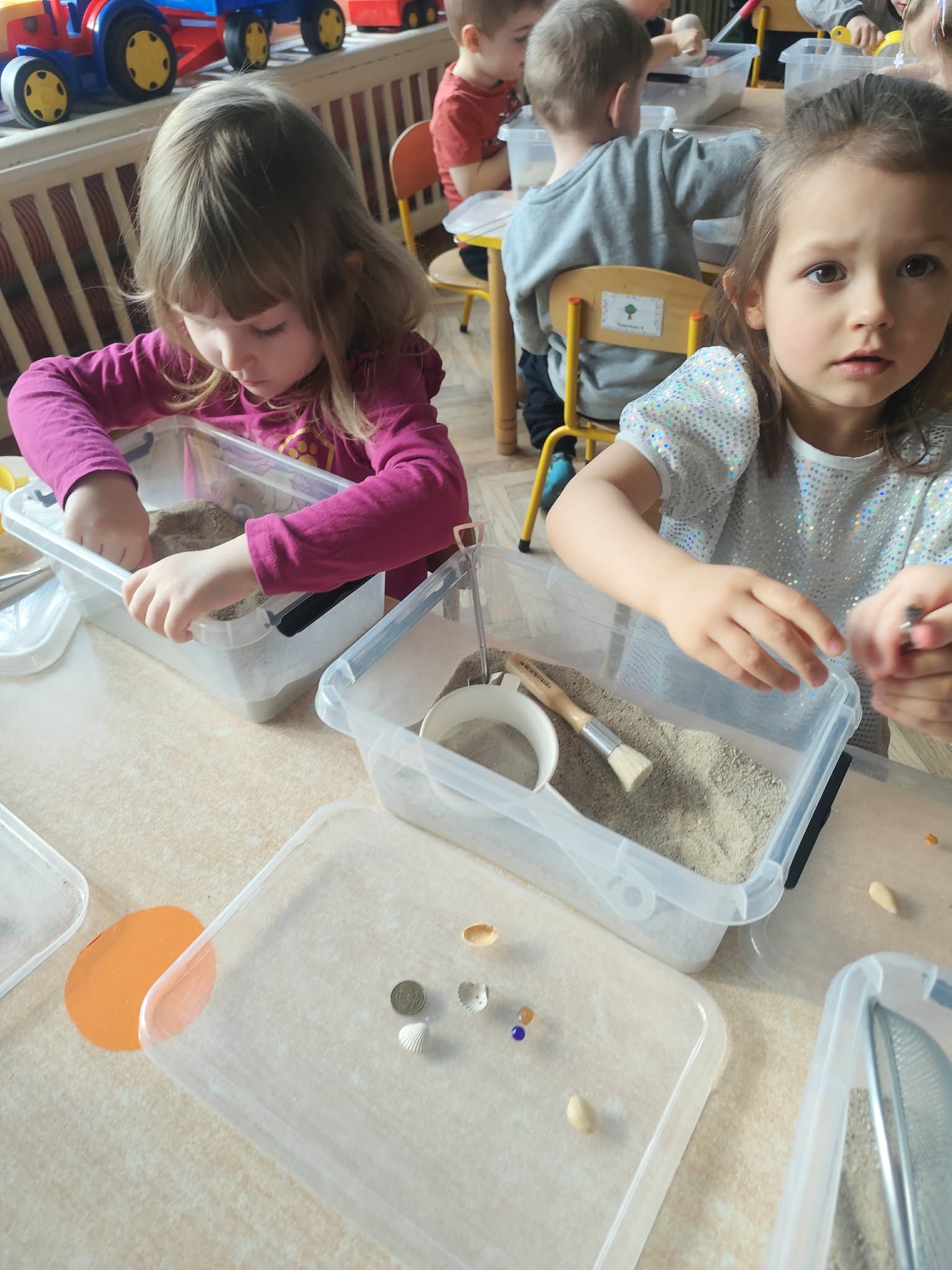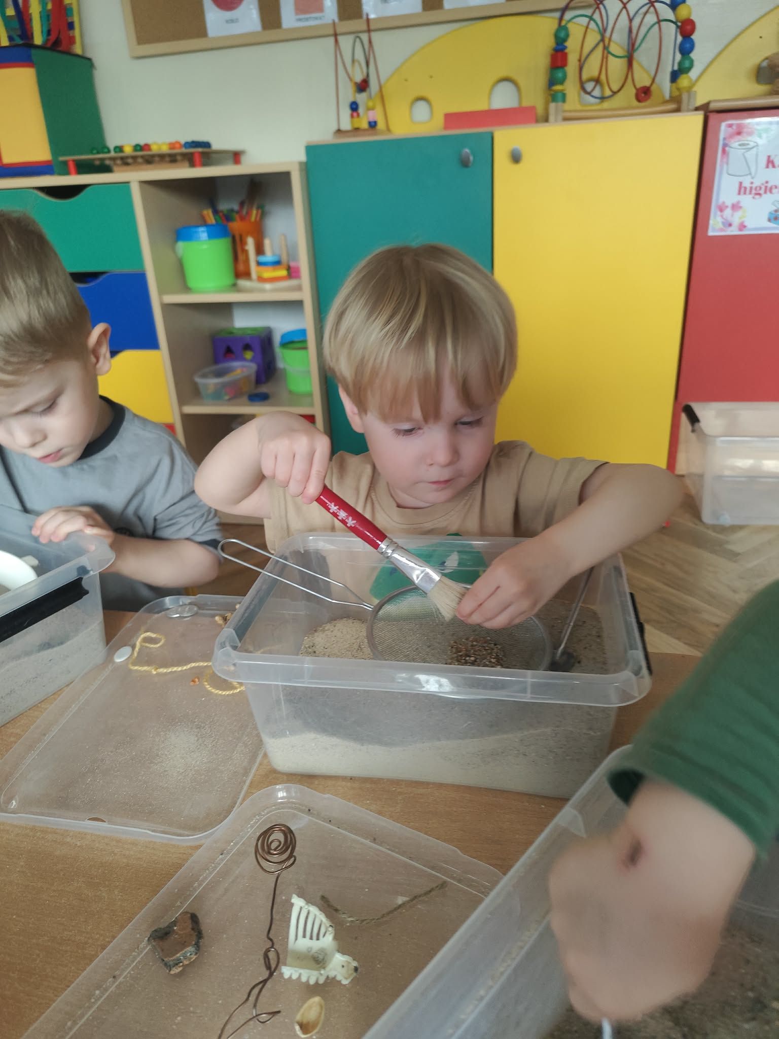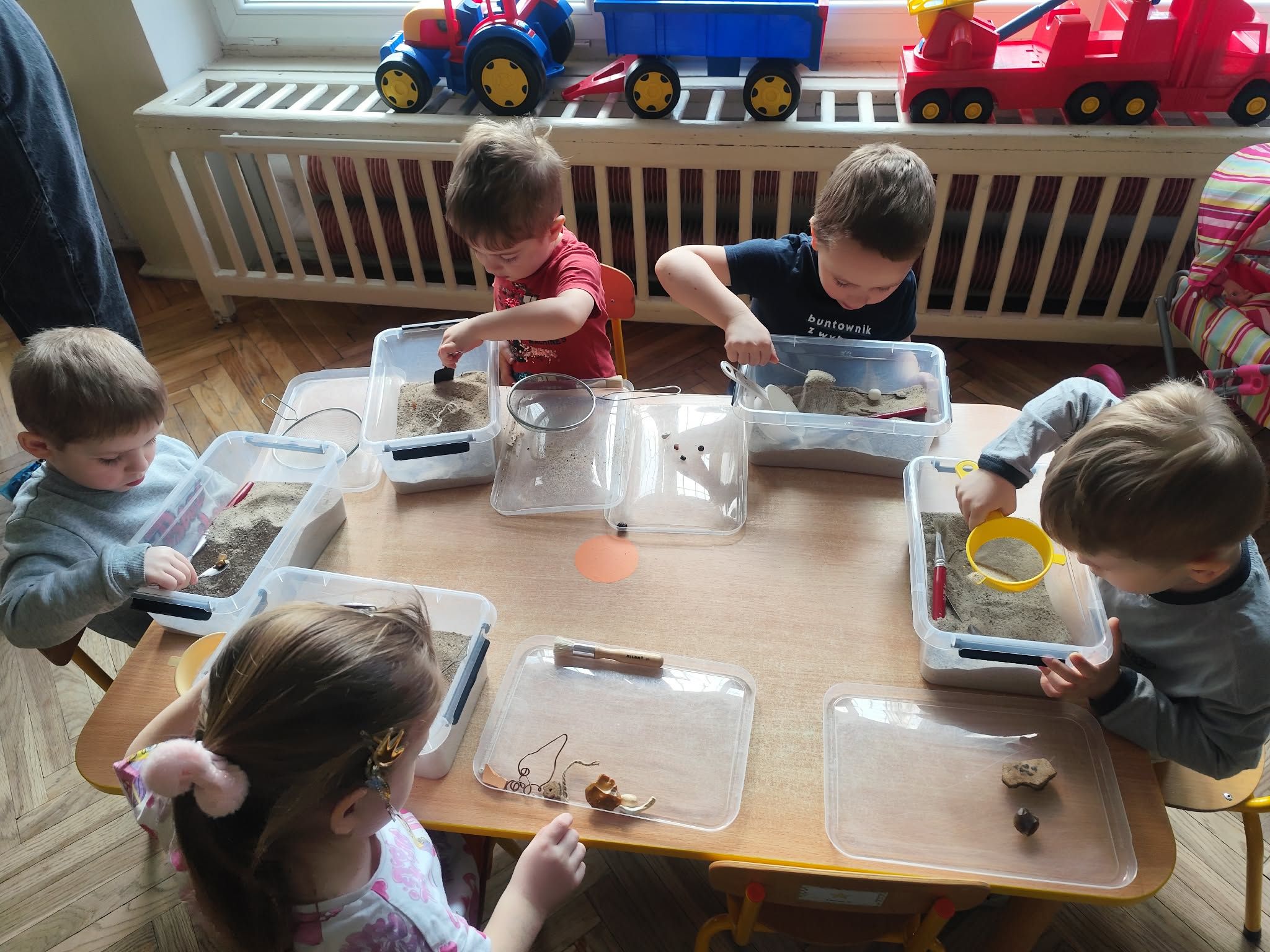 Wielkie wykopaliska: Wyposażone w pędzelki i szpachelki, dzieci z ogromnym skupieniem przeszukiwały przygotowane „wykopaliska”. Każdy ruch musiał być precyzyjny, aby nie uszkodzić cennych znalezisk ukrytych w piasku!