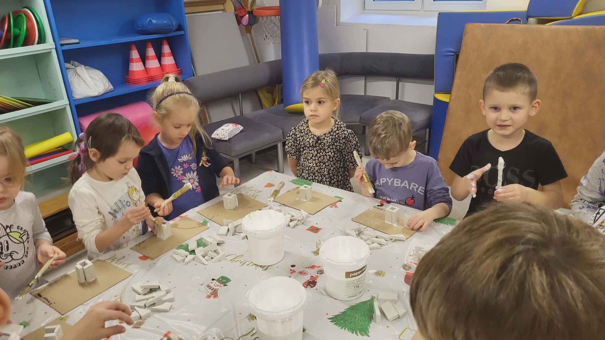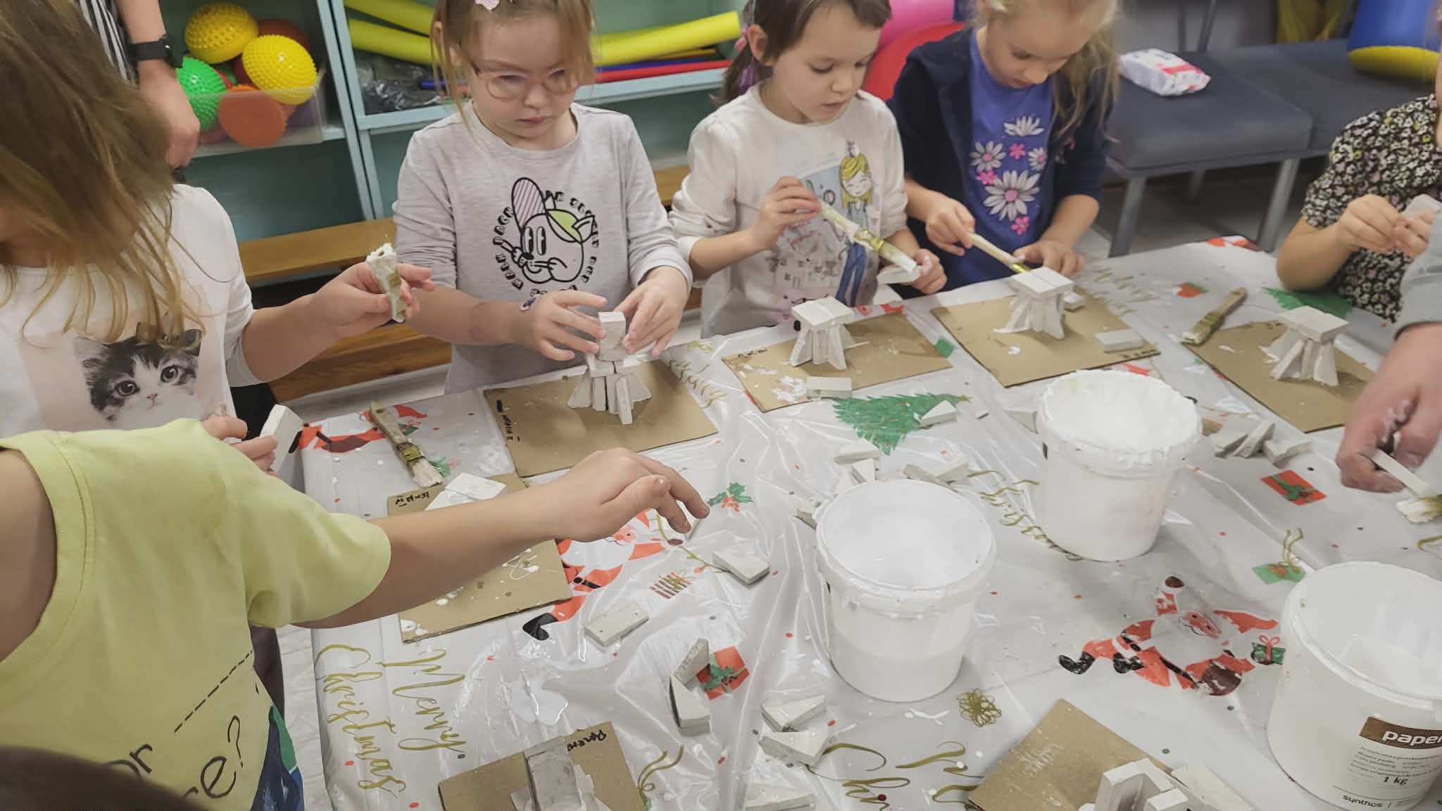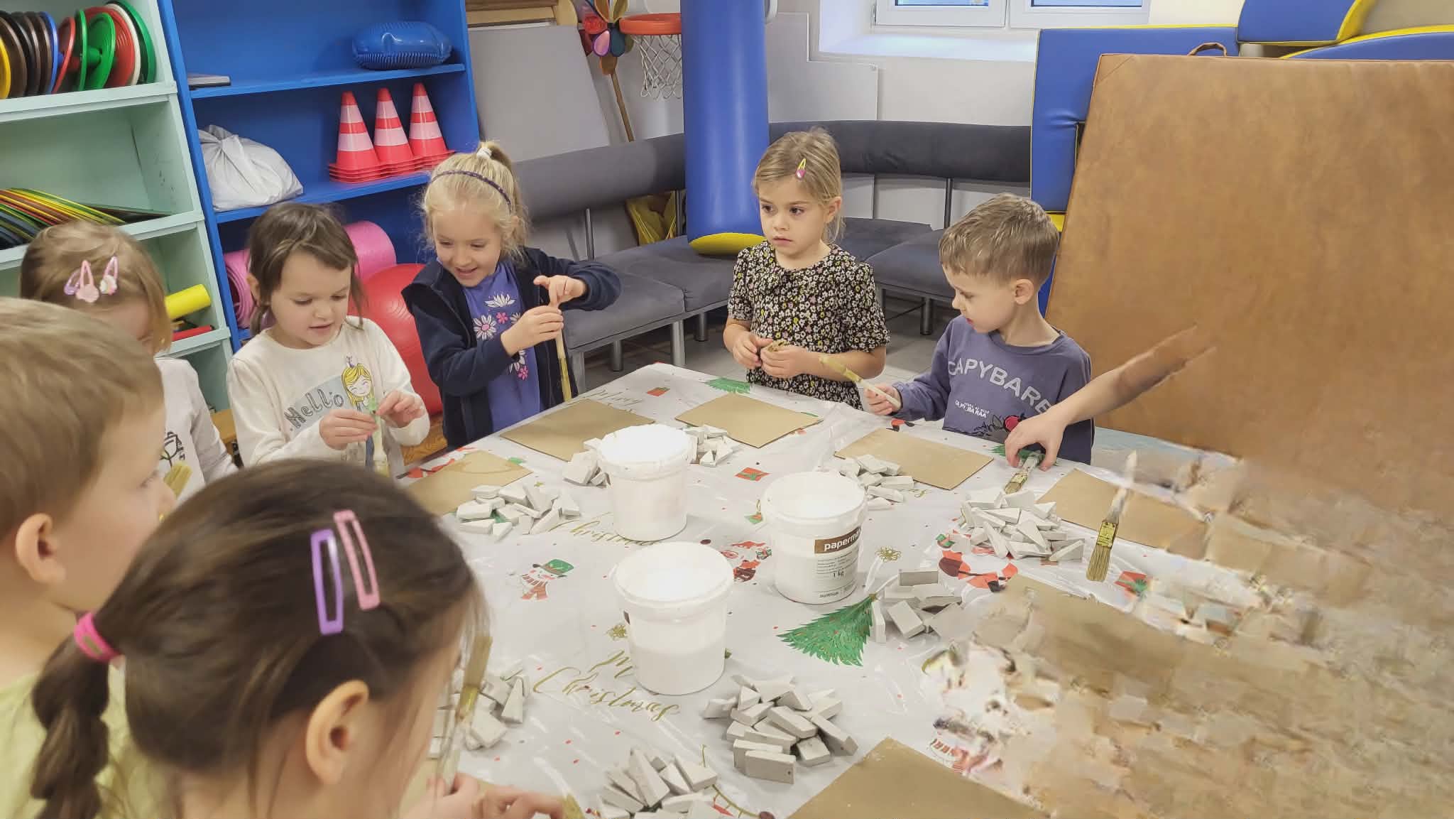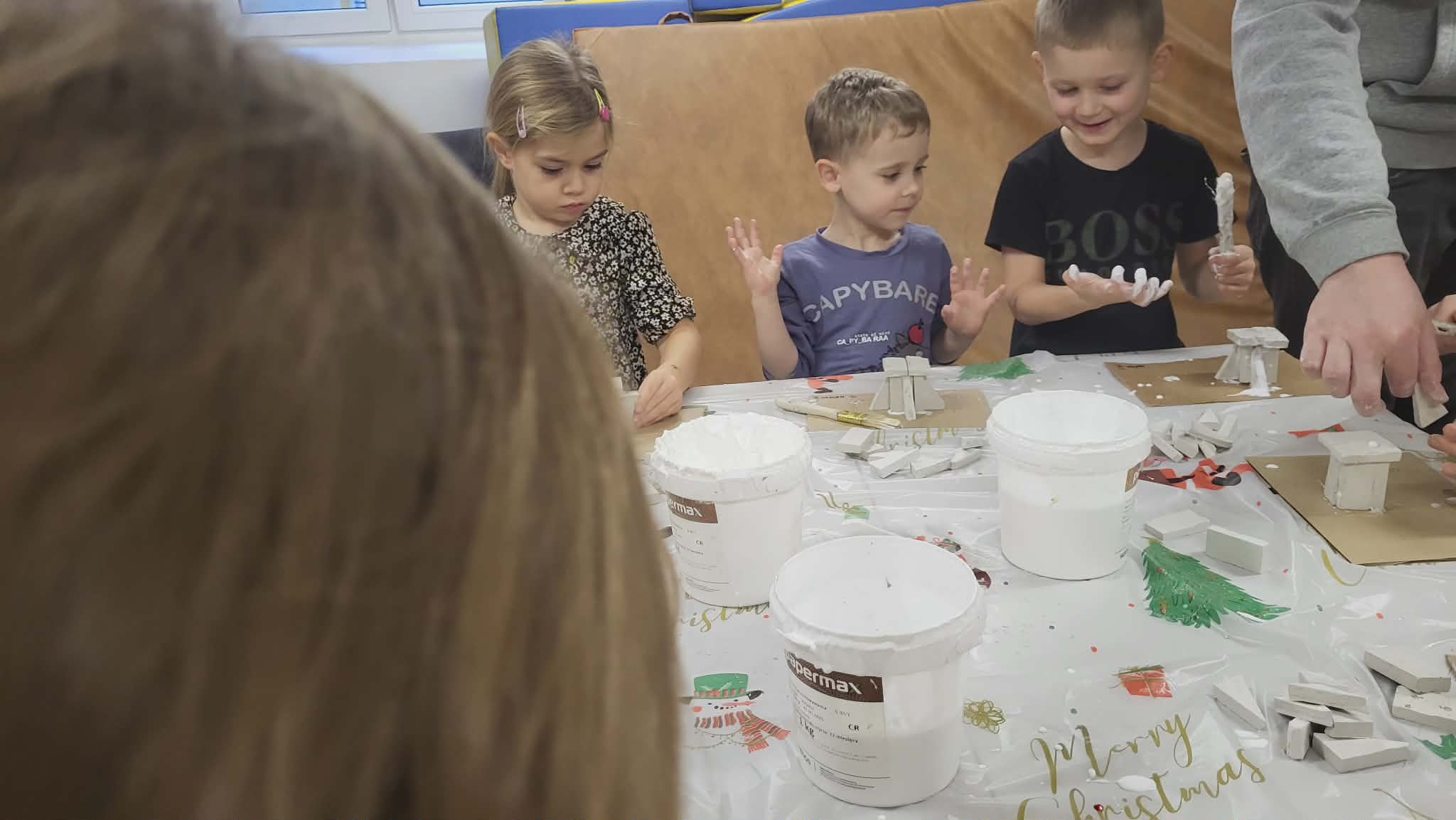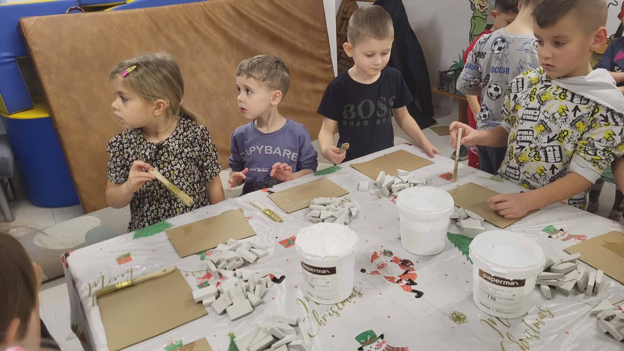 W ramach świątecznej niespodzianki dla Dzieci Rada Rodziców postanowiła sfinansować warsztaty z majsterkowania. Dzieci przygotowywały murowane choinki . Podczas zajęć zamieniły się w małych budowniczych i za pomocą prawdziwych miniaturowych cegiełek, kleju i zaprawy murarskiej stworzyły swoje dzieła.