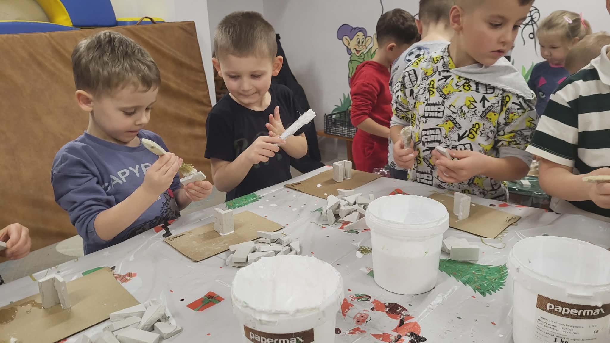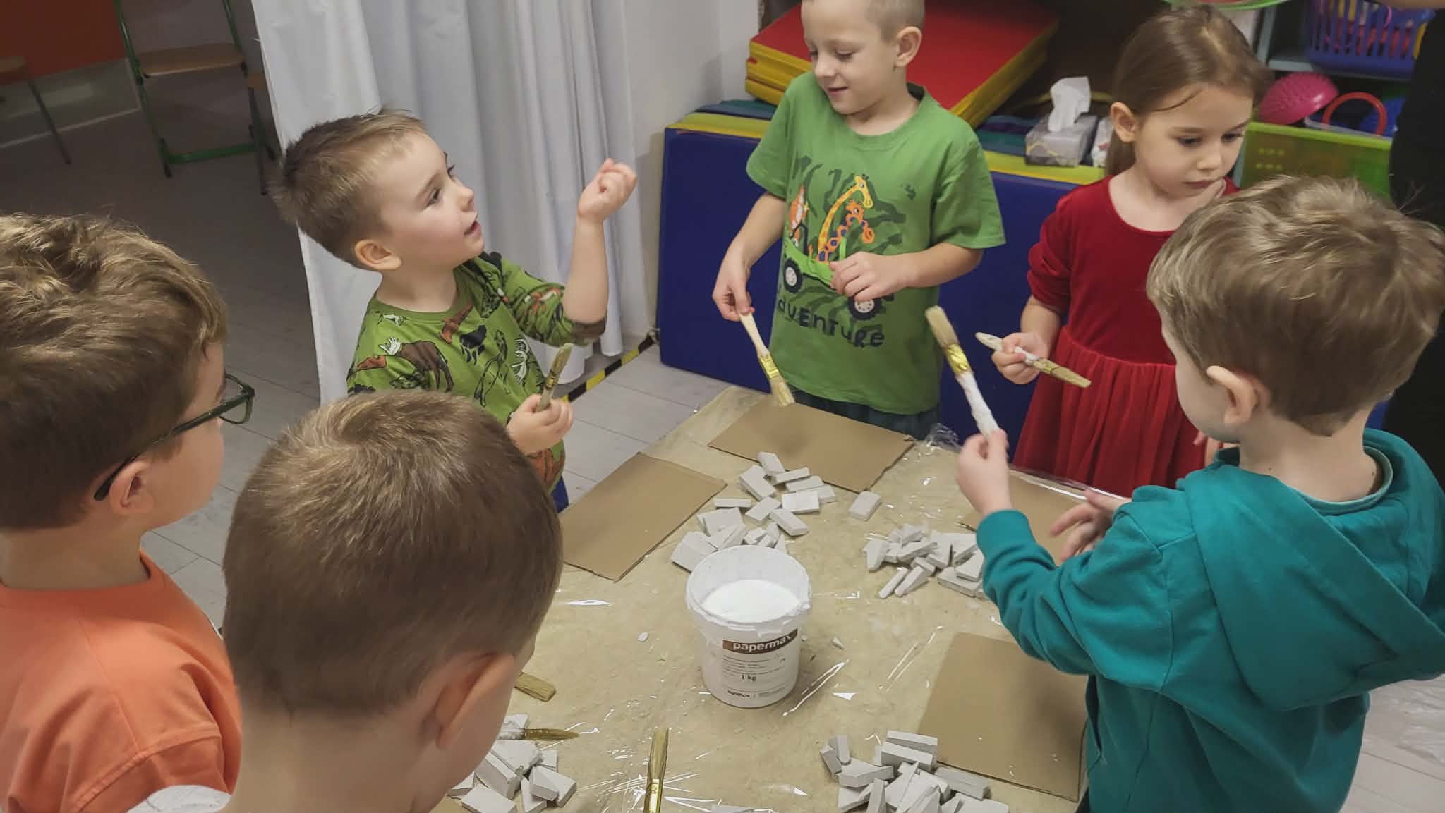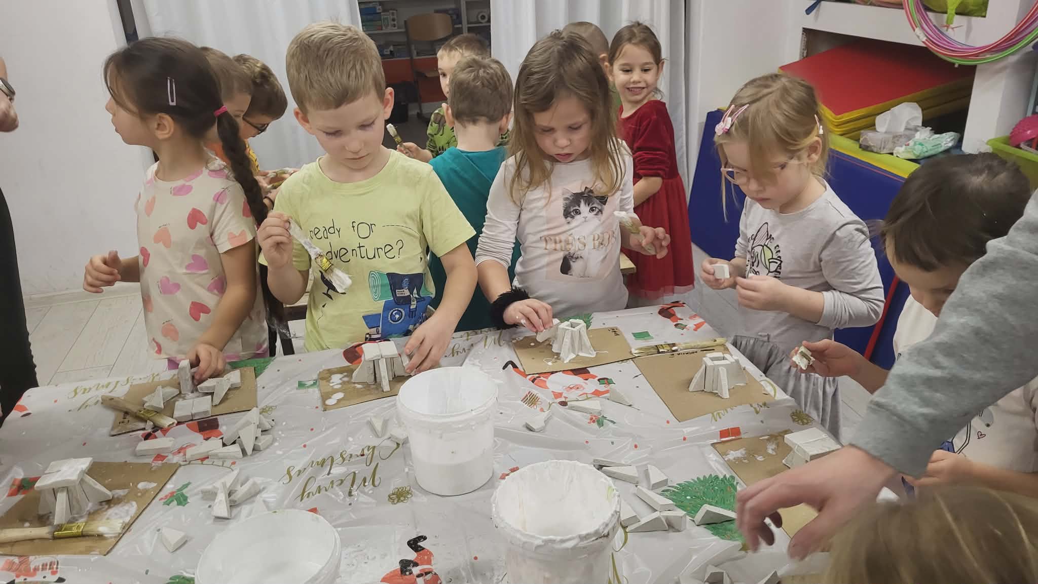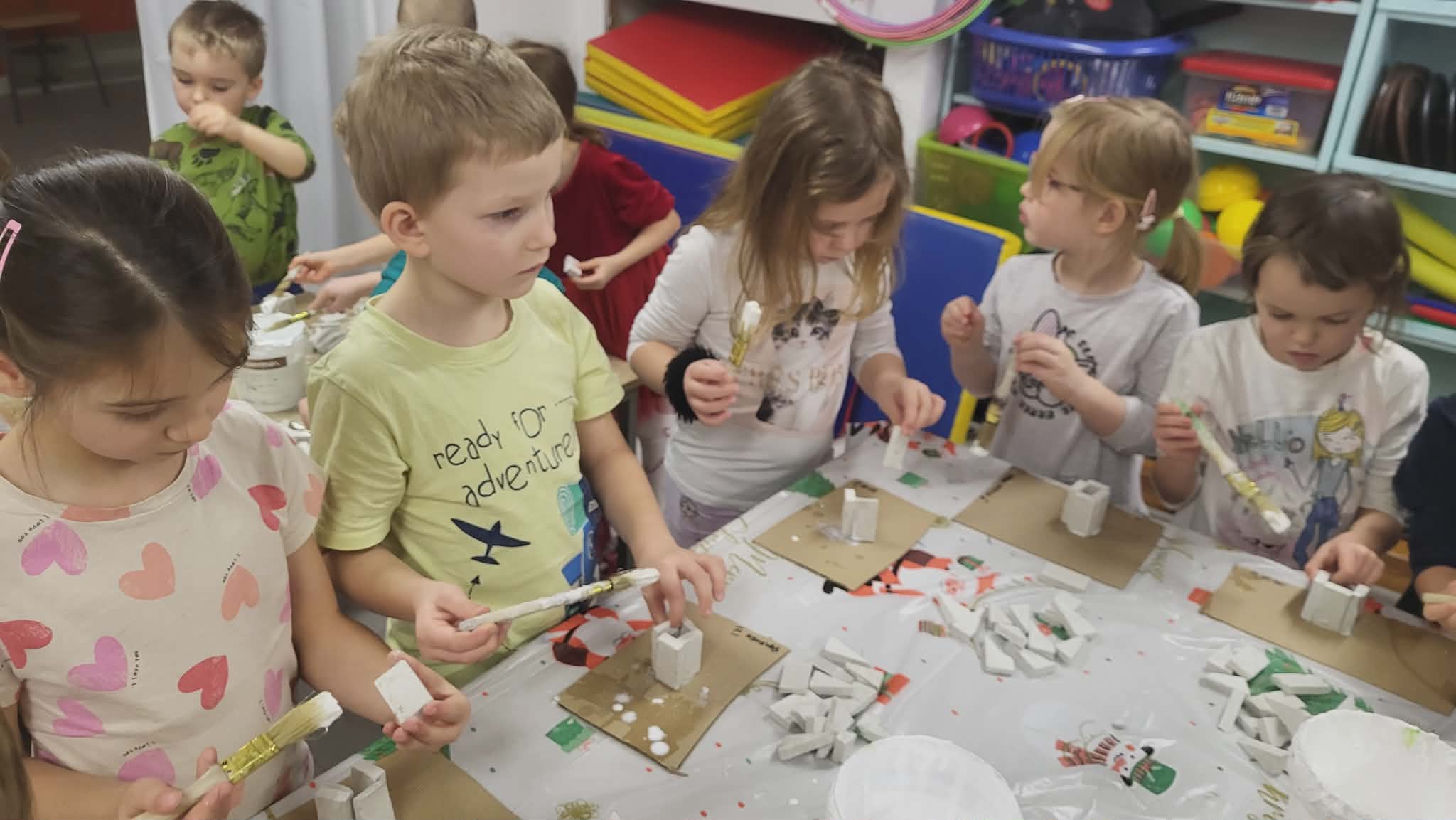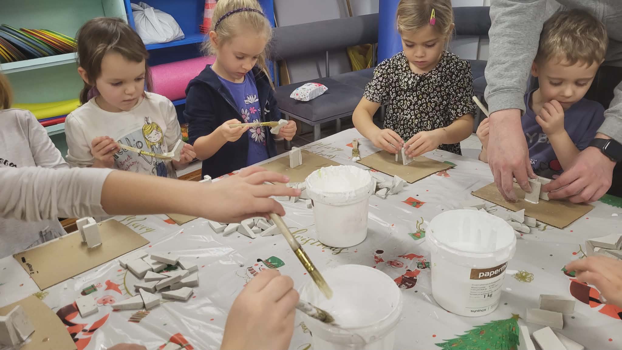 W ramach świątecznej niespodzianki dla Dzieci Rada Rodziców postanowiła sfinansować warsztaty z majsterkowania. Dzieci przygotowywały murowane choinki . Podczas zajęć zamieniły się w małych budowniczych i za pomocą prawdziwych miniaturowych cegiełek, kleju i zaprawy murarskiej stworzyły swoje dzieła.