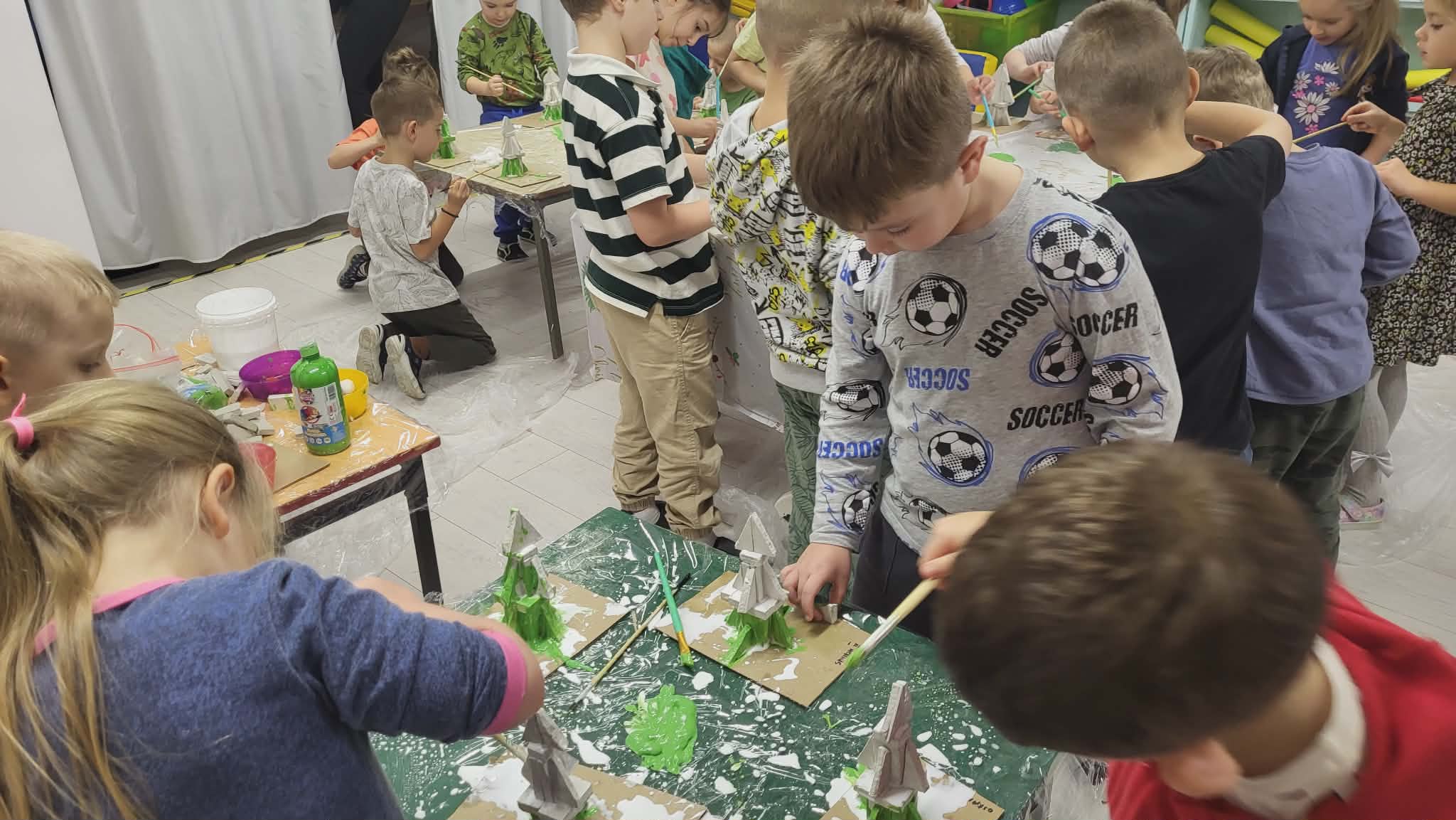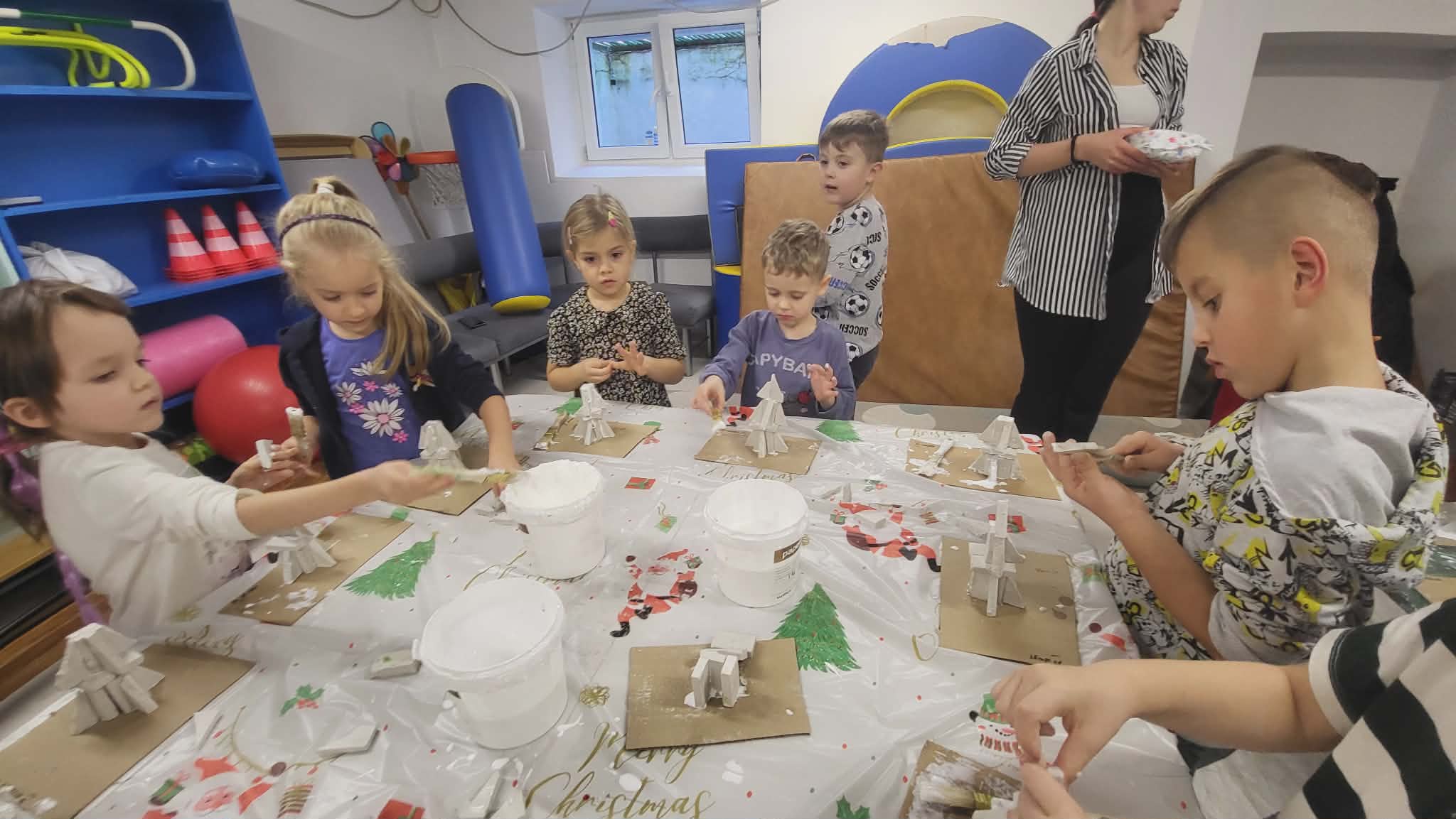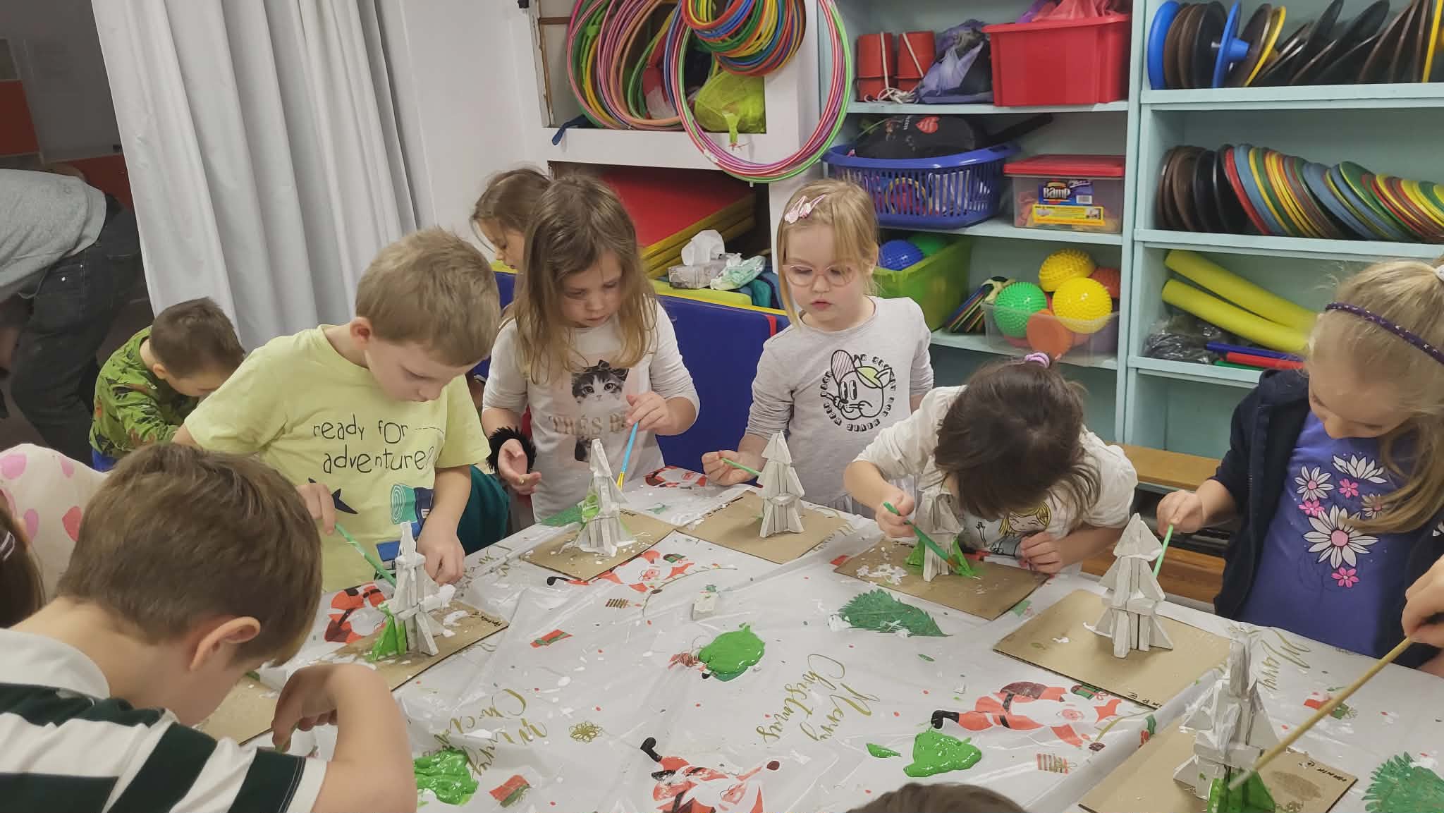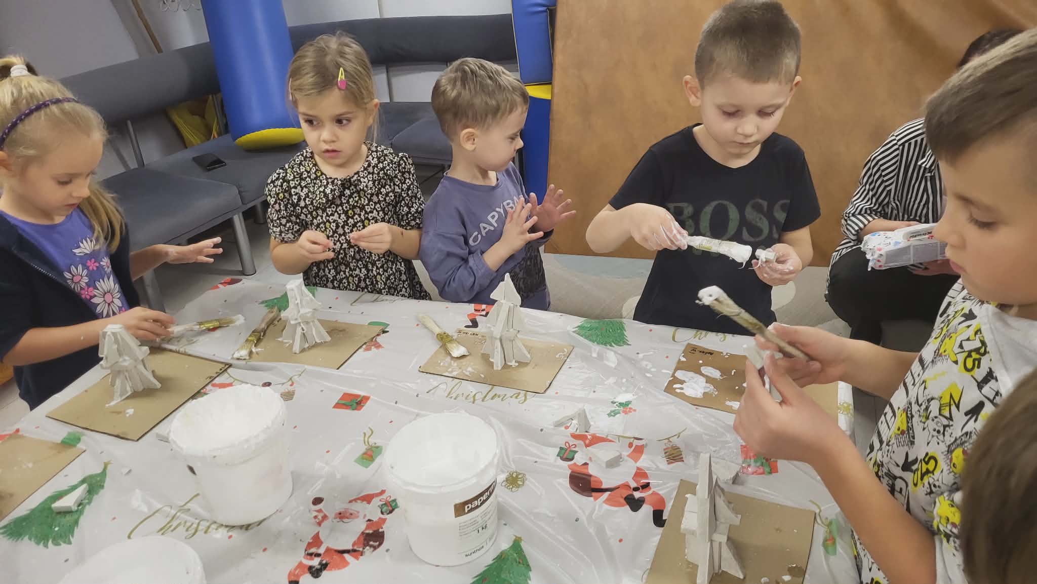 W ramach świątecznej niespodzianki dla Dzieci Rada Rodziców postanowiła sfinansować warsztaty z majsterkowania. Dzieci przygotowywały murowane choinki . Podczas zajęć zamieniły się w małych budowniczych i za pomocą prawdziwych miniaturowych cegiełek, kleju i zaprawy murarskiej stworzyły swoje dzieła.